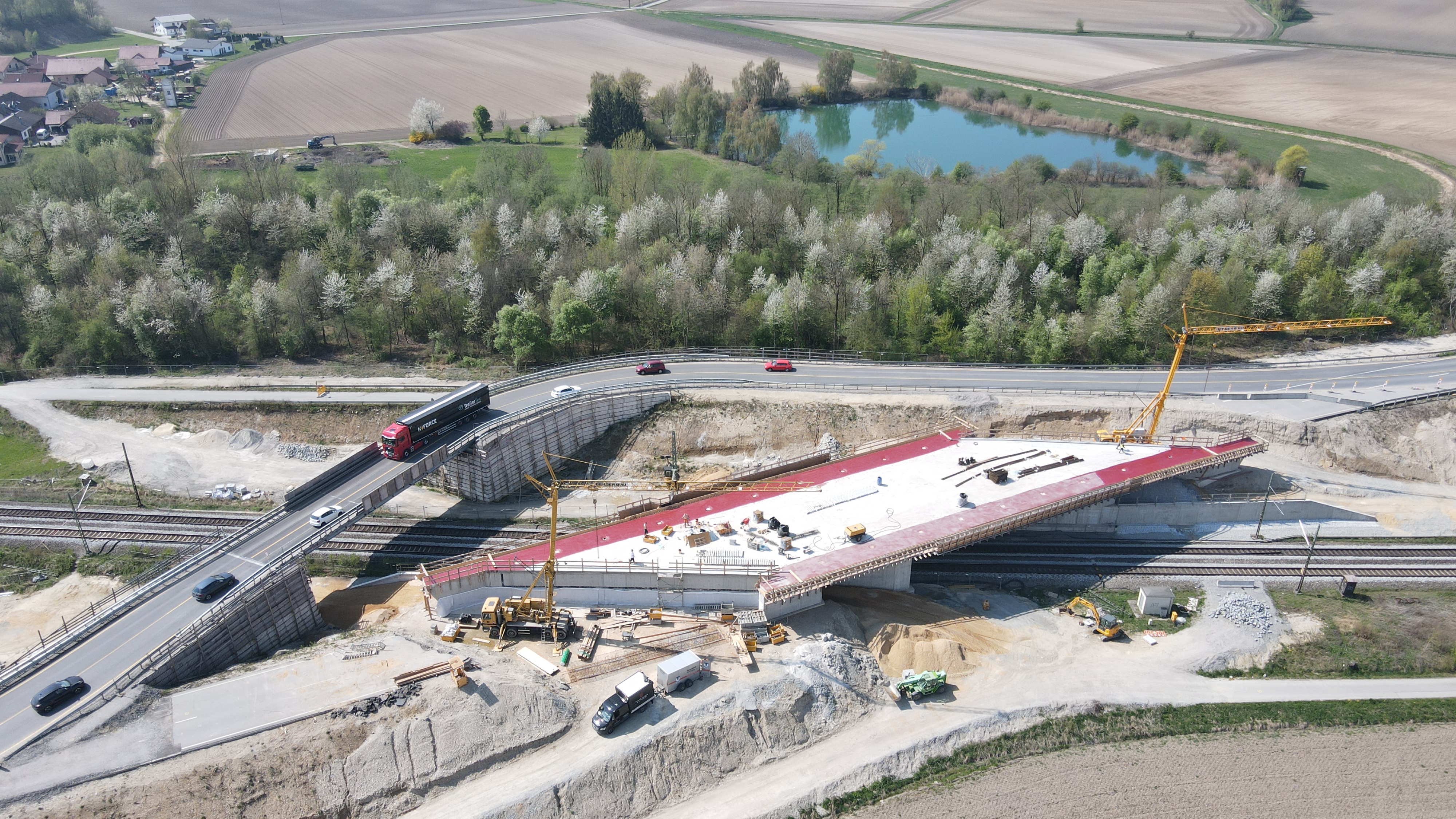 20.04.2026 Die neue B 8-Brücke über die Bahnlinie bei Aholming ist fast fertig. In den nächsten vier Wochen werden die Abdichtung der Brückenplatte und die Brückenkappen hergestellt. Parallel dazu beginnen ab 4. Mai die Bauarbeiten für den Straßenanschluss. Dafür wird die B 8 im Bereich Aholming bis voraussichtlich Mitte Oktober für den Verkehr gesperrt.