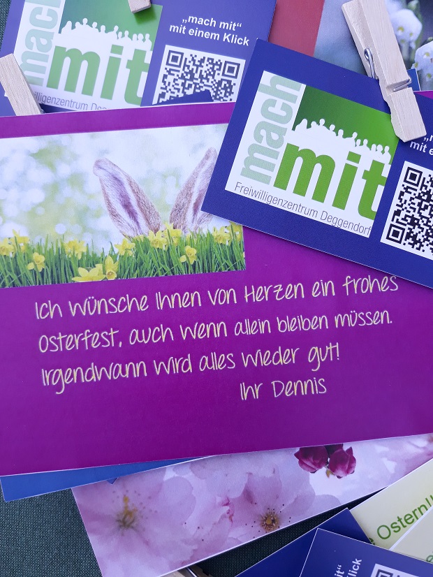 Etliche Mitmacher haben sich an der Umsetzung der Idee beteiligt. Dazu gehört die WhatsApp Gruppe des Freiwilligenzentrumrund um die ehrenamtlichen Koordinatorin Gertraud Schwankl, der hauptamtlichen Mitarbeiterin Petra Schwankl und ganz besonders die Klasse 6 a des Robert-Koch-Gymnasiums Deggendorf mit Klassenleiter Christian Bauer. Der Klassenleiter ging als gutes Beispiel voran und war am aktivsten. In Zeiten von Home Schooling schuf er zusammen mit seinen Schülerinnen und Schülern über 30 Grußkarten. So wurde das Ergebnis bunt, blumig und auch tiefsinnig. Sogar echte Blumen wurde gepresst und geklebt und äußerst kreativ auf der Postkarte angebracht.
