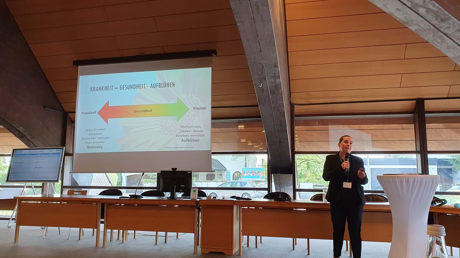 In einem Vortrag zum Thema „Führungskraft, die Gesundheit schafft“ sprach Referentin Antonie Höldrich über verschiedene Aspekte der Psychologie, die zu einem gesunden Arbeitsplatz beitragen sollen. „Gesundheit ist mehr als die Abwesenheit von Krankheit“, sagte die Referentin. Ein gesunder Mitarbeiter sei deshalb auch nicht unbedingt leistungsstark. Die Sinnhaftigkeit der eigenen Aufgabe und Wertschätzung durch die Führungskraft seien essentiell für das „Aufblühen“ der Mitarbeiter. Es liege an den Führungskräften, mit positivem Vorbild voranzuschreiten. „Unterschätzen Sie Ihre Vorbildfunktion nicht“, sagte Höldrich. Zentral sei deshalb, sich der eigenen Schwächen bewusst zu sein und diese offen zu kommunizieren.