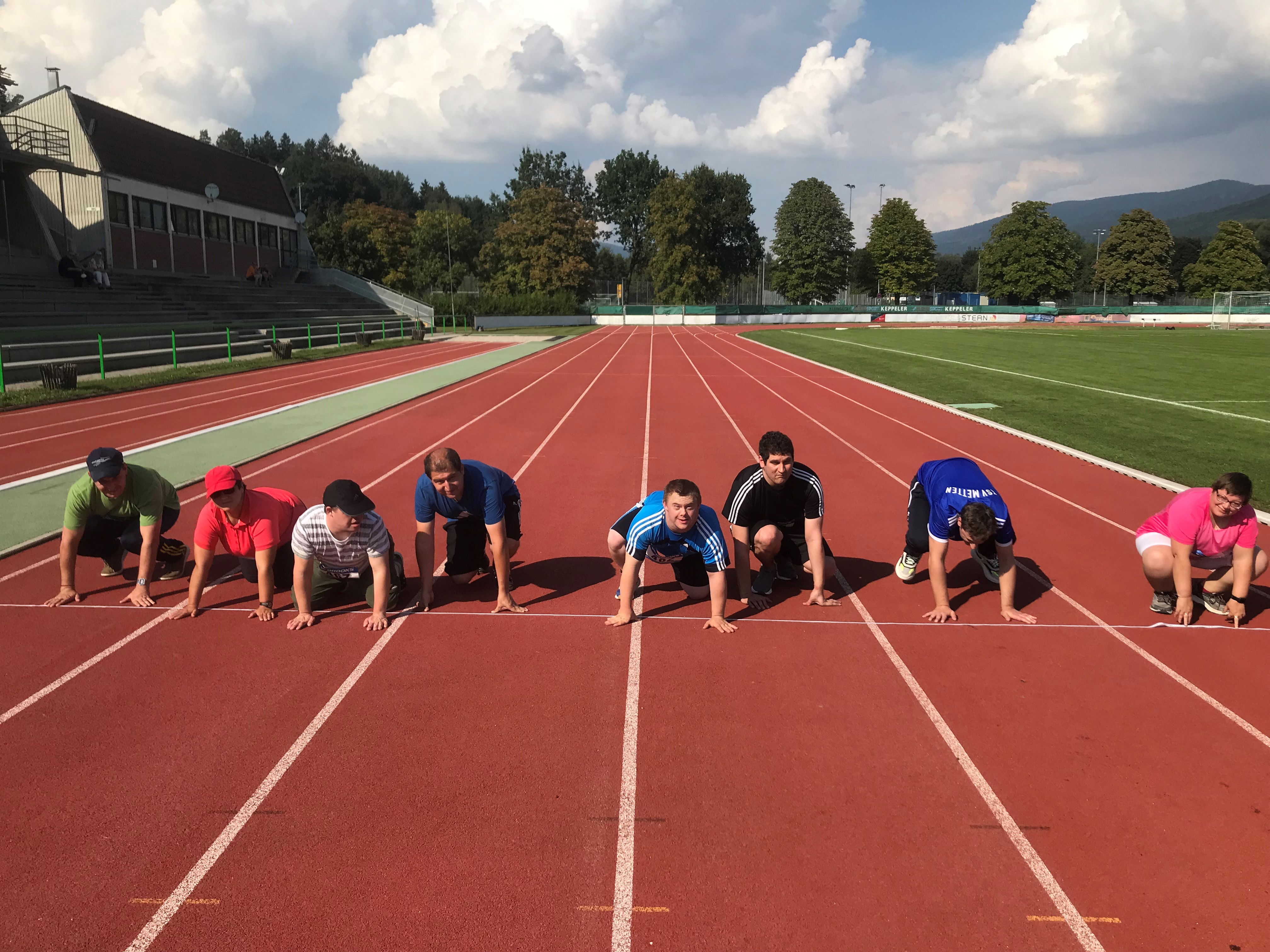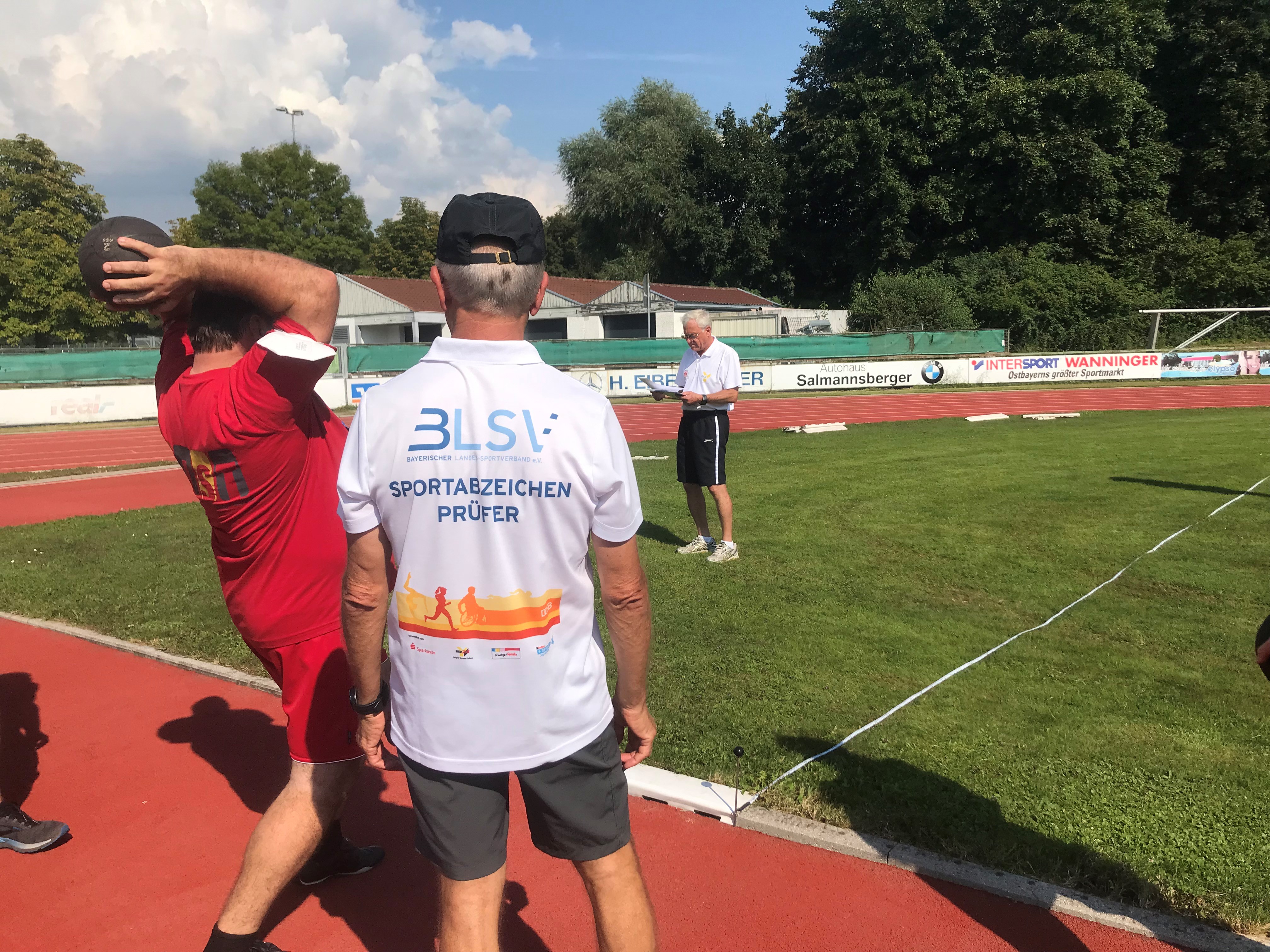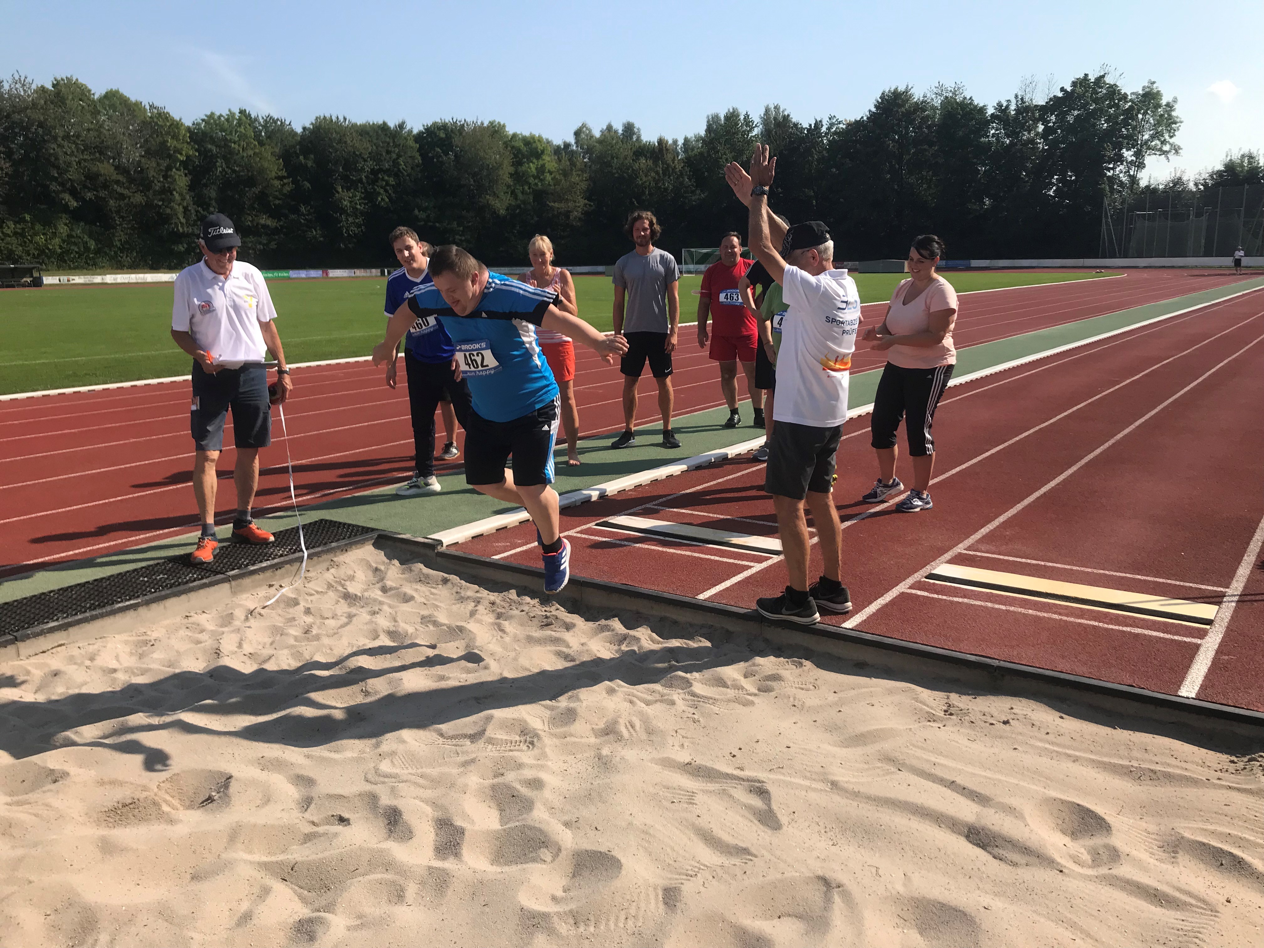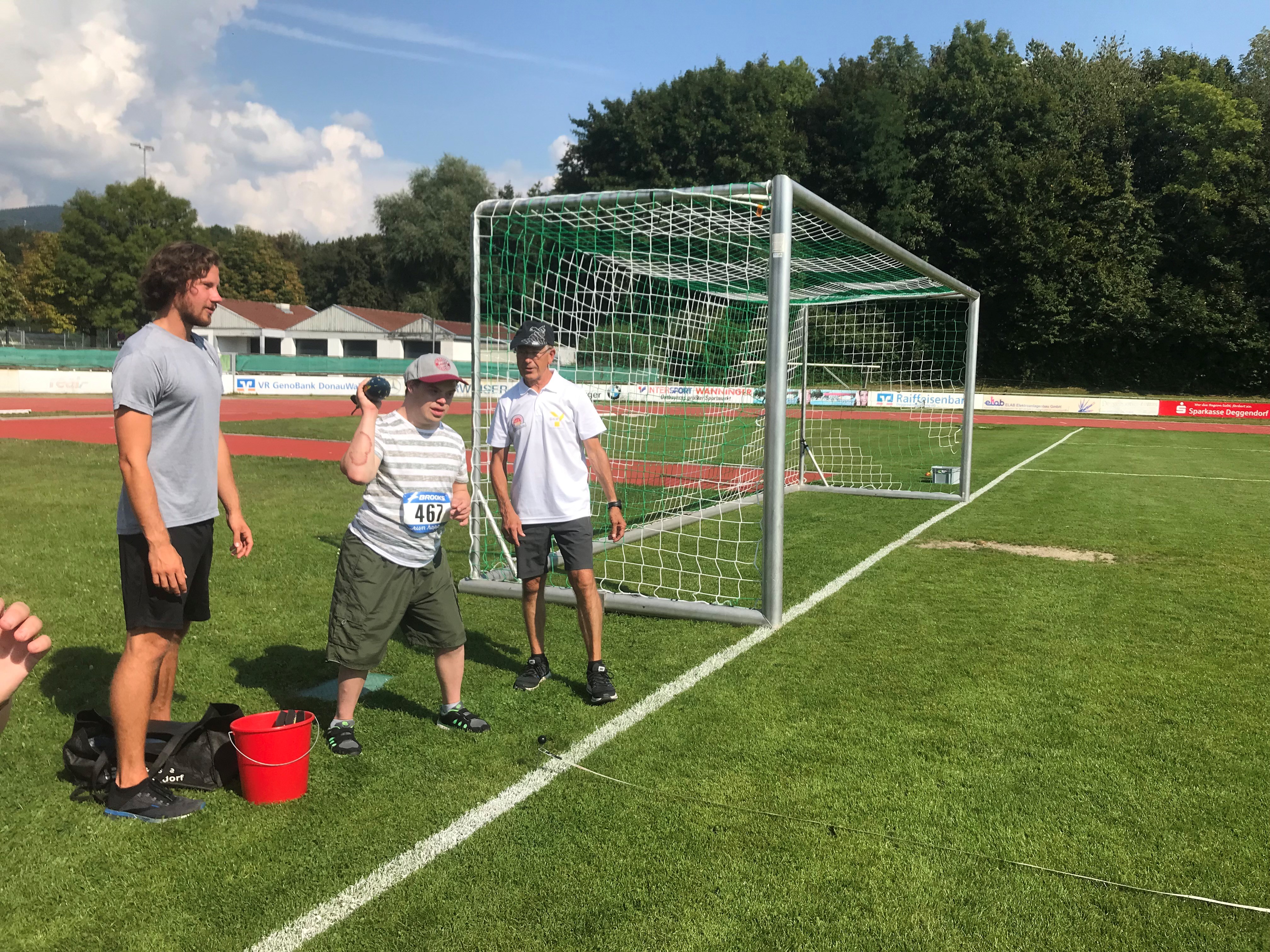 Insgesamt wurde neun Teilnehmern der Offenen Behindertenarbeit ein Sportabzeichen abgenommen. Nach einem gemeinsamen Aufwärmprogramm mit Sportwissenschaftsstudent Felix Huber ging es auch schon los mit den verschiedenen Disziplinen. Dabei wurden Fähigkeiten auf vier verschiedenen Stationen geprüft, angepasst an die einzelnen Leistungsgrade der Sportler: Sprinten über 30 Meter, zwei Mal Weitwurf (mit Heuler und Medizinball) und Standweitsprung. Die Prüfer Walter Körner, Josef Wurm und Karl Sagerer vom Laufverein Deggendorf begleiteten die Teilnehmer mit Tipps zur Ausführung und notierten die Ergebnisse. Auch Felix Huber nahm sich für jeden einzelnen Prüfling Zeit, die6 Disziplinen anschaulich zu erklären, vorzuzeigen und die Prüflinge zu motivieren. Getränke und Snacks wurden von der AOK Bayerwald-Deggendorf zur Verfügung gestellt. Somit konnten sich die Teilnehmer zwischen den einzelnen Disziplinen stärken und Energie für die nächste Disziplin auftanken.