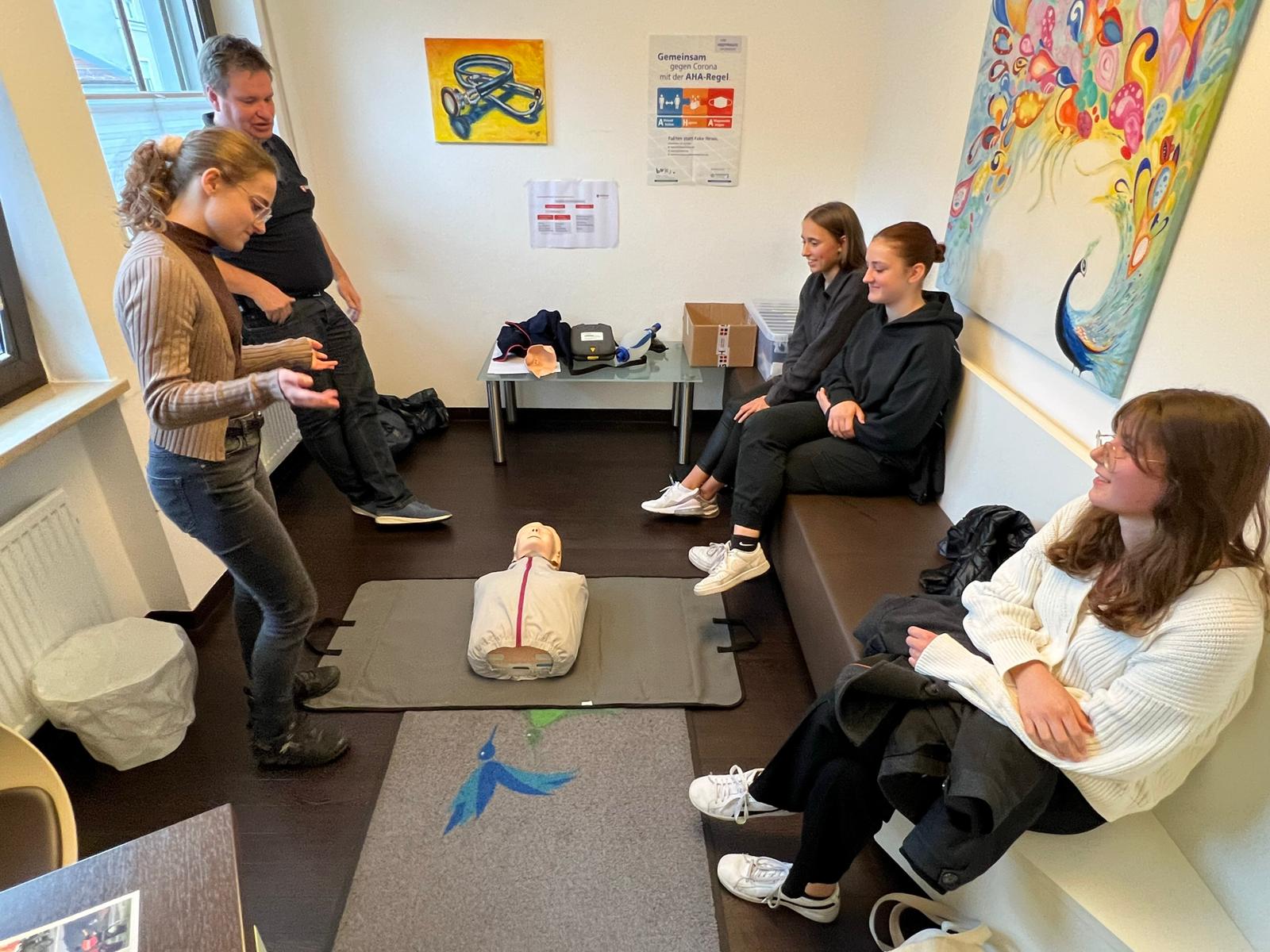 Anschließend wurden die Schülerinnen und Schüler in vier Gruppen eingeteilt: In Gruppe eins berichtete Medizinstudent Julian Schnabel über die Inhalte und den Ablauf des Medizinstudiums. Dabei zeigten sich die Teilnehmer diskussionsfreudig und konnten viele Fragen stellen. In Gruppe zwei durften die Schülerinnen und Schüler ein Ultraschall-Gerät testen. Angeleitet wurde die Gruppe von Dr. Stephan Schnabel, der sich als Versuchsperson zur Verfügung stellte. In Gruppe drei konnten die Teilnehmer unter Aufsicht von Dr. Ila Schnabel eine Impfung – in diesem Falle ohne Impfstoff – simulieren. Und in Gruppe vier konnten die Schülerinnen und Schüler unter dem Titel „Auffinden eines Notfallpatienten“ ihr bereits erworbenes Wissen aus ihrem Erste-Hilfe-Kurs bei Josef Kandler, Kreisgeschäftsführer der Deggendorfer Malteser, vertiefen. Die mitgebrachte Übungspuppe stand dabei für ein Reanimationstraining zur Verfügung.