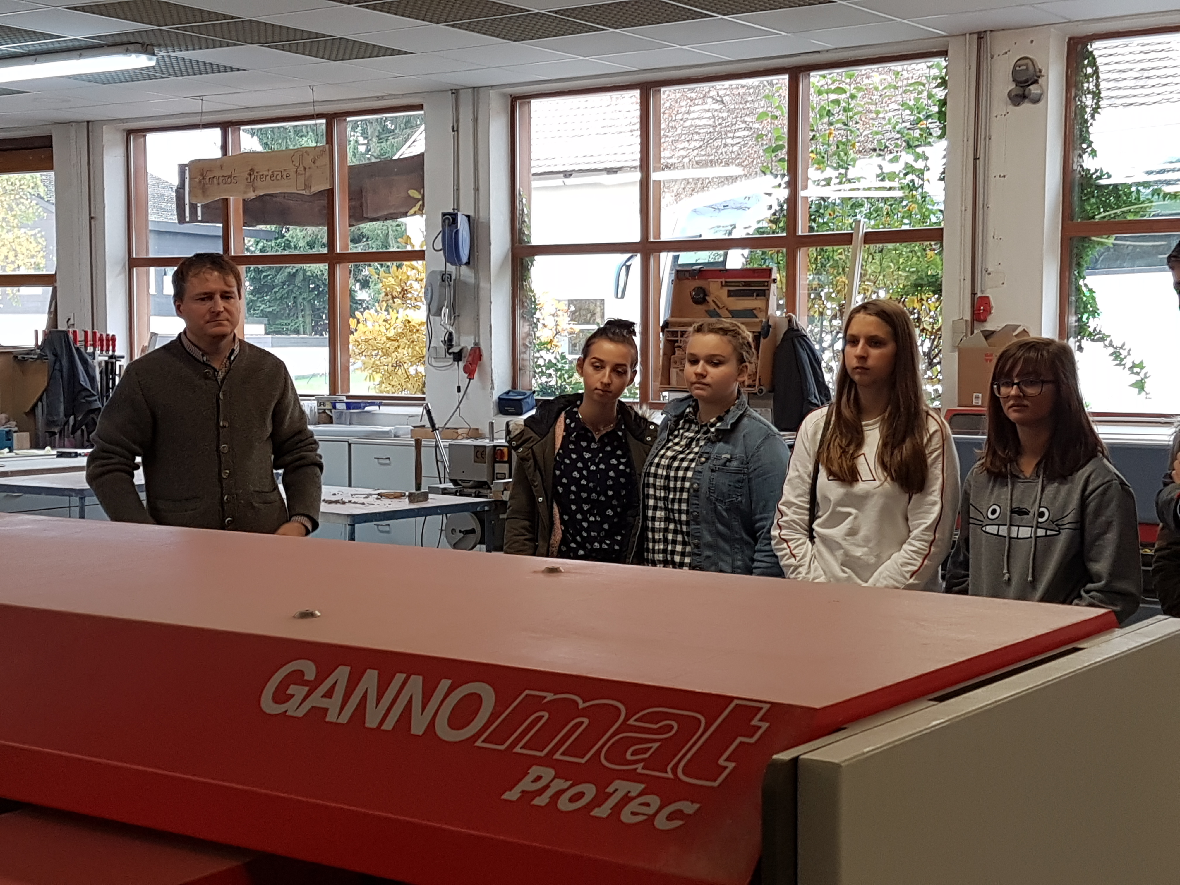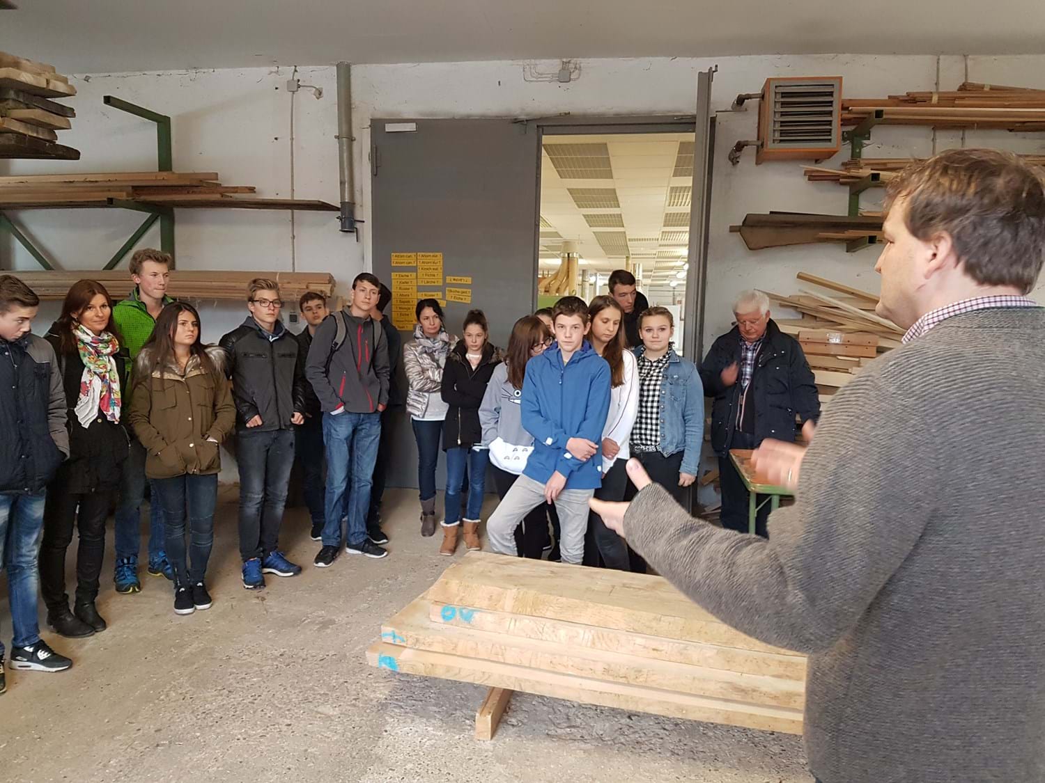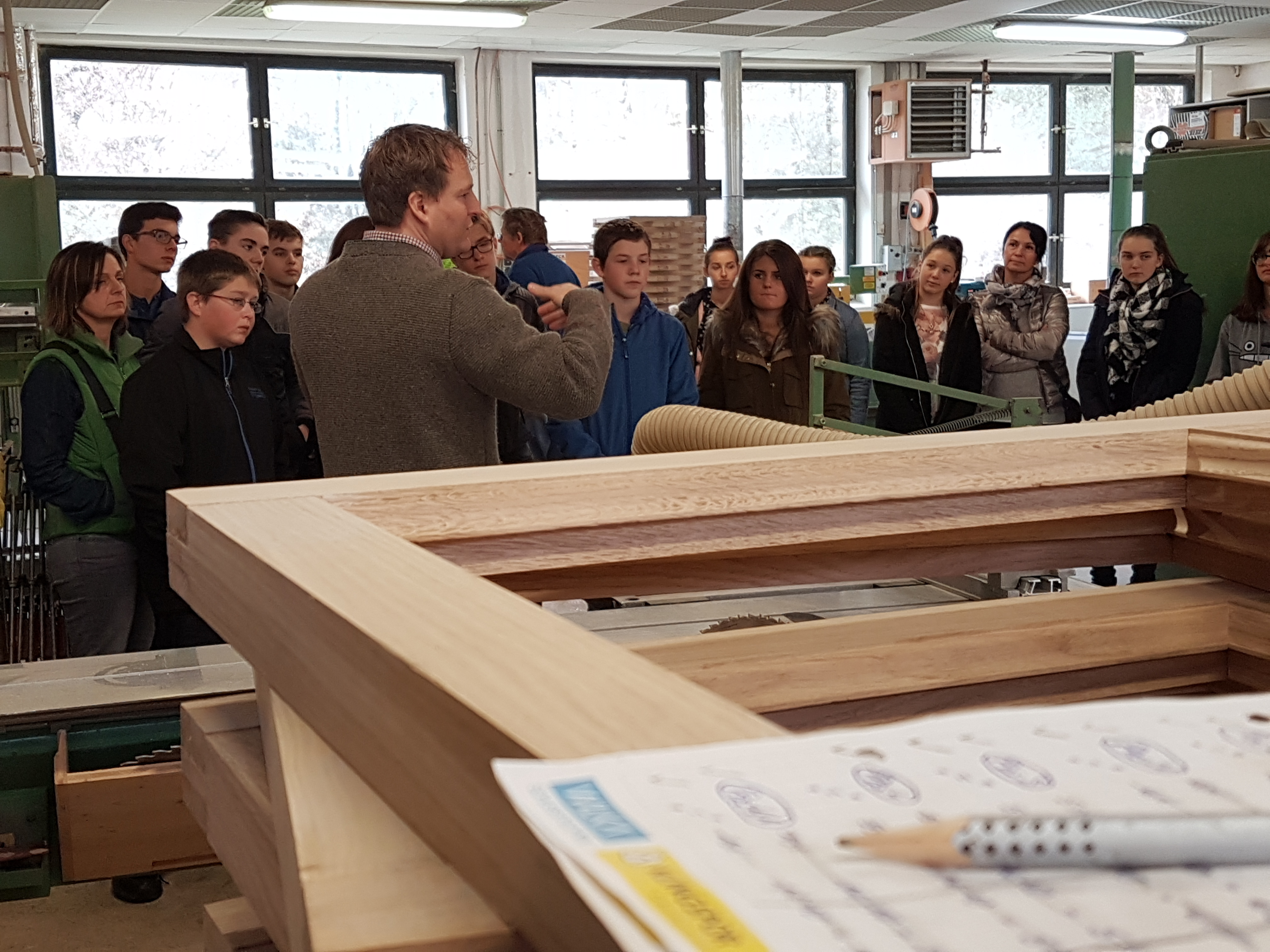 Von der Metallbranche zur Holzbranche: der dritte Halt wurde in Schöllnach bei der Schreinerei Hierbeck eingelegt. Thomas Hierbeck stellte sein Unternehmen vor und zeigte den Teilnehmern wie abwechslungsreich, vielfältig, interessant und innovativ der Beruf des Schreiners immer noch ist. In erster Linie beschäftigt er sich wie schon immer mit Holz- daneben finden aber immer mehr andere Werkstoffe Einzug beim Schreiner: er beschäftigt sich mit Glas, mit Beschlägen, mit Oberflächenbeschichtungen, mit Beleuchtung oder auch mit elektrischen Geräten. Die Zusammenführung von verschiedenen Materialien versprüht einen ganz besonderen Reiz beim Schreinerhandwerk. Hierbeck hat sich hier eine ganz besondere Nische erschlossen: er bleibt vielfältig und leistet auch aufwändigere Arbeiten wie die Restauration von historischen Fenstern und Türen. Zudem arbeitet er sehr oft mit Architekten zusammen, wodurch viele Einzelstücke entstehen.