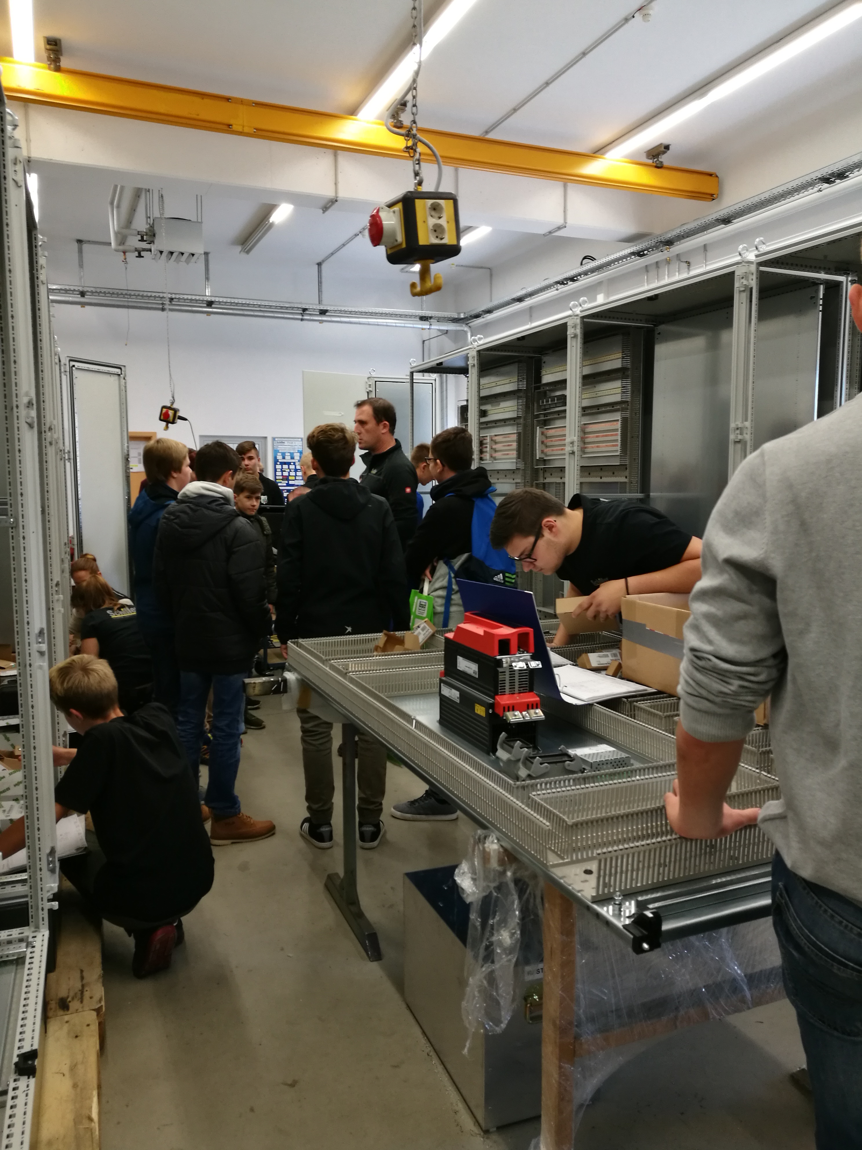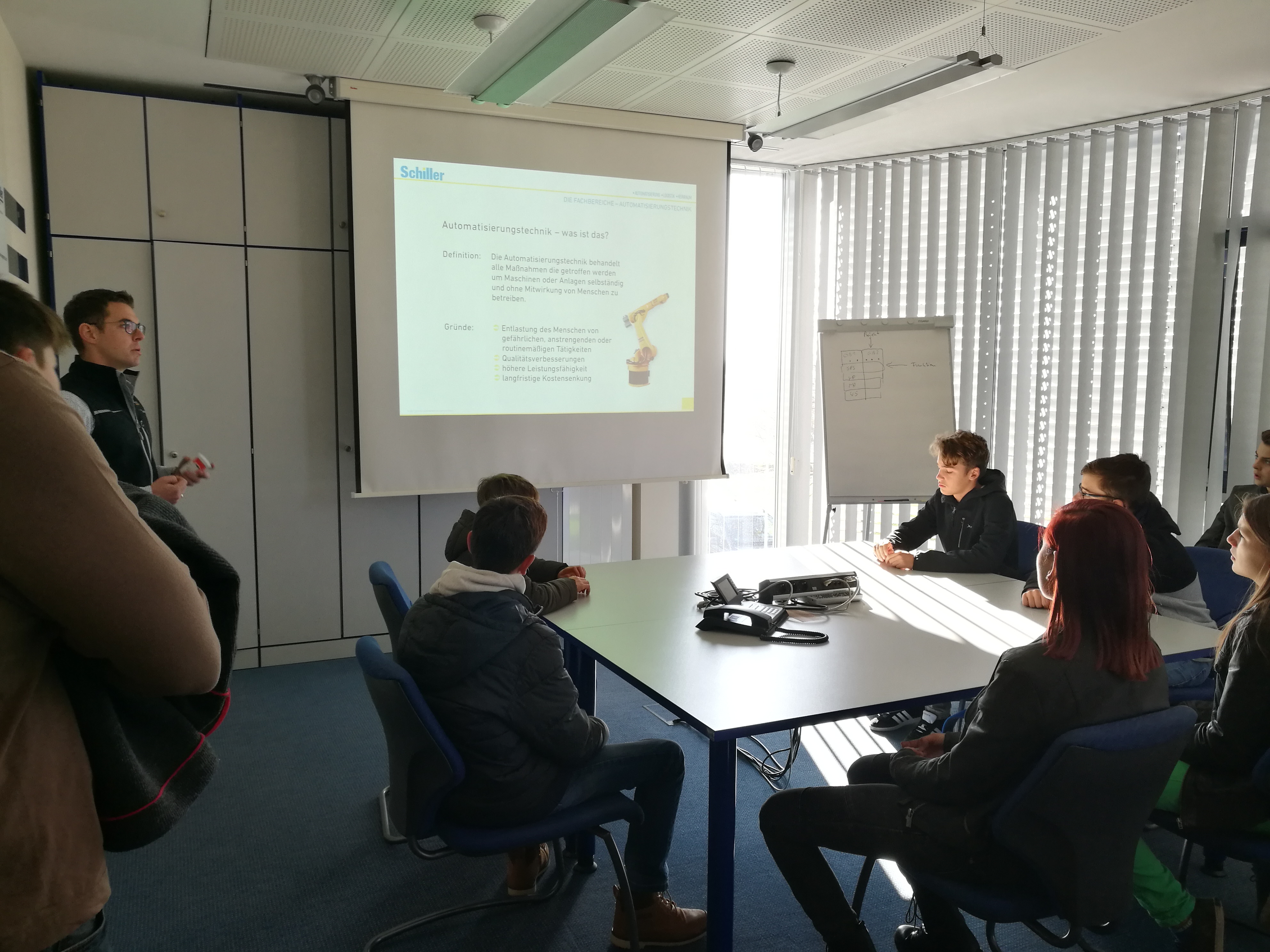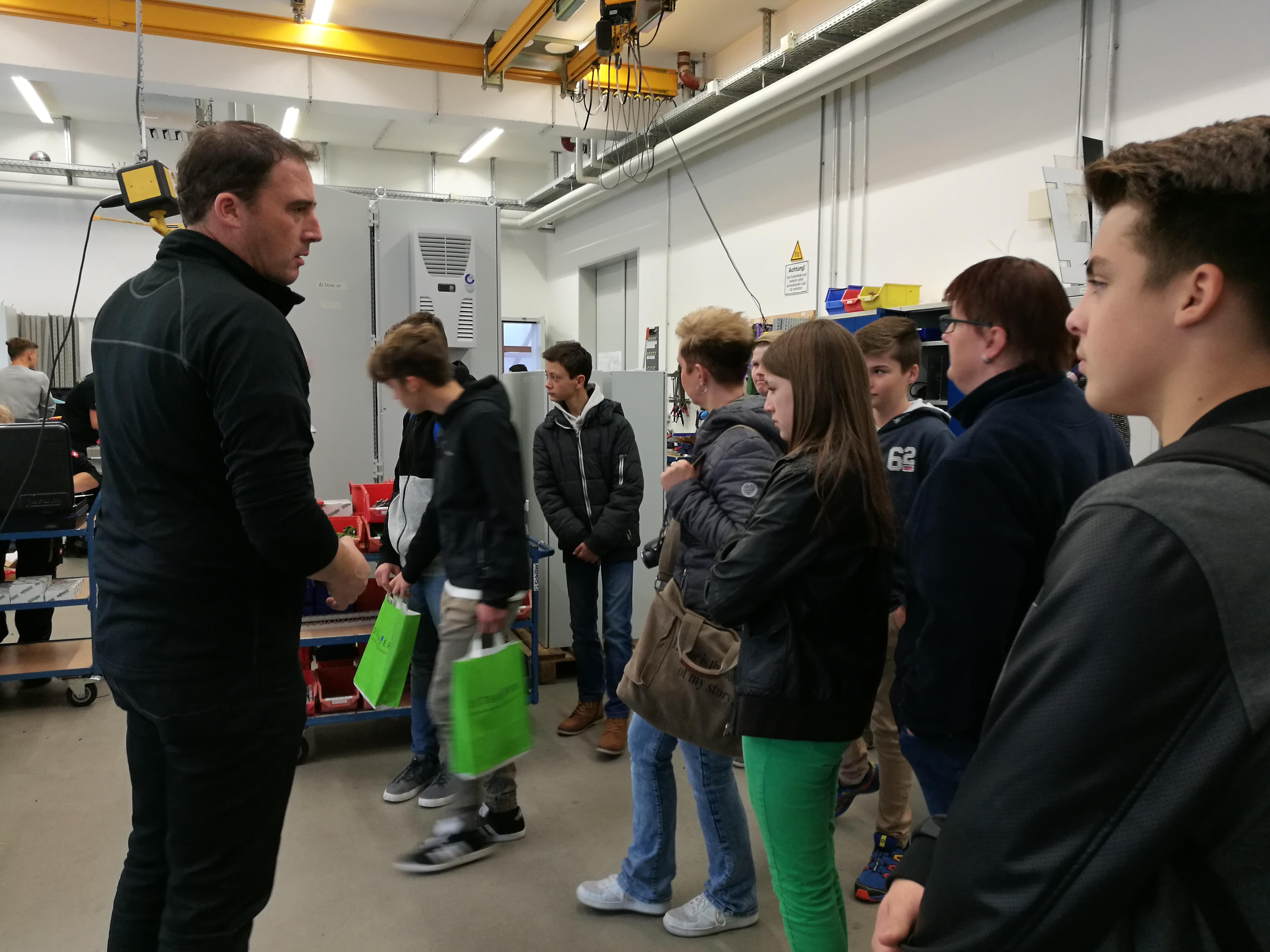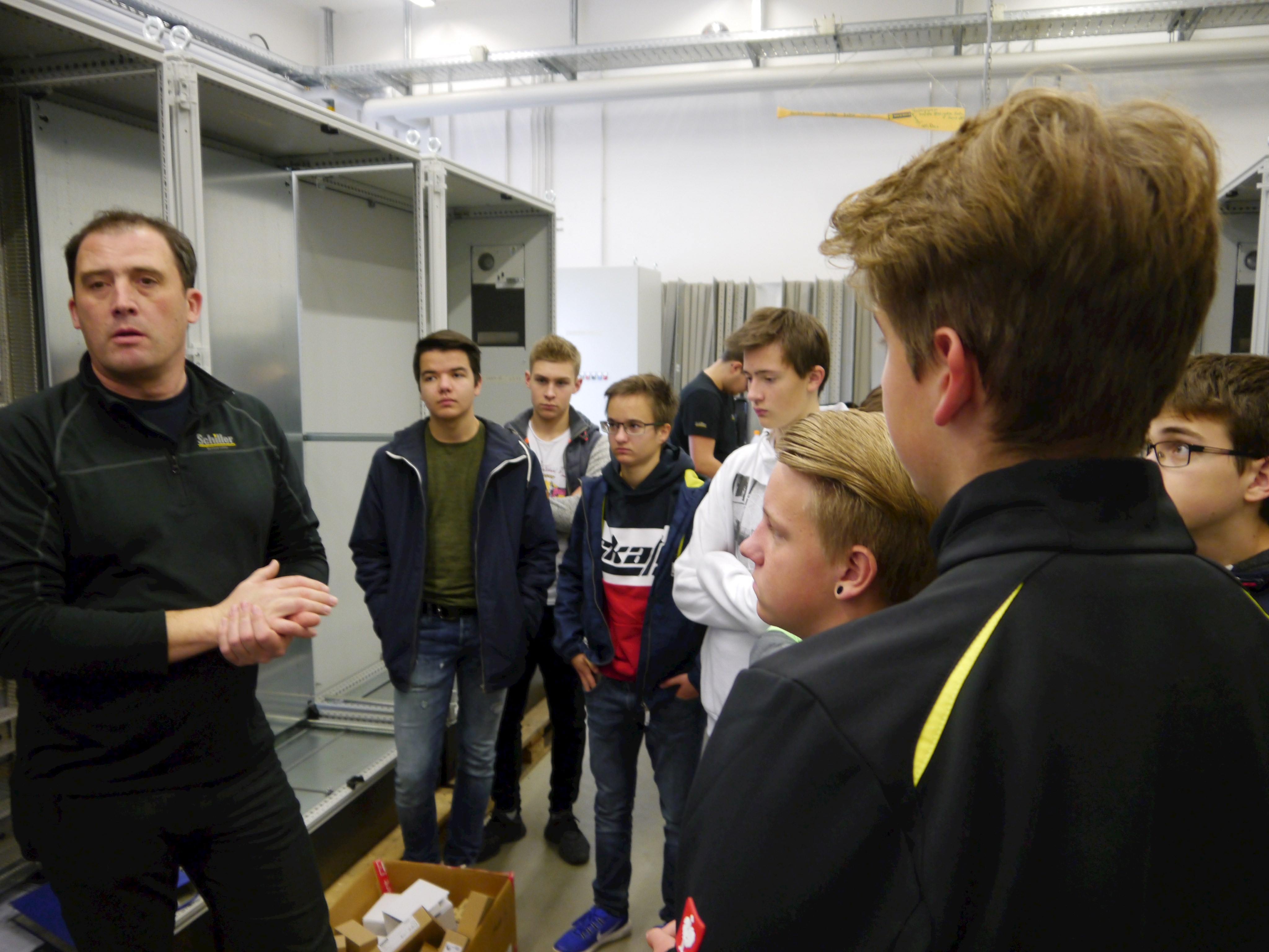 Anschließend machte sich die Gruppe auf, die Firma Schiller Automatisierungstechnik im Gewerbepark Ruckasing zu erkunden. Dort erklärte Ausbilder Manfred Schneider, was die Firma eigentlich macht und welche Rahmenbedingungen in den letzten Jahren für eine fundierte Ausbildung geschaffen wurden. Allen voran die neue Lehrwerkstatt, wo Azubis auch mal ohne Zeitdruck die wichtigsten Fertigkeiten für den Beruf lernen.