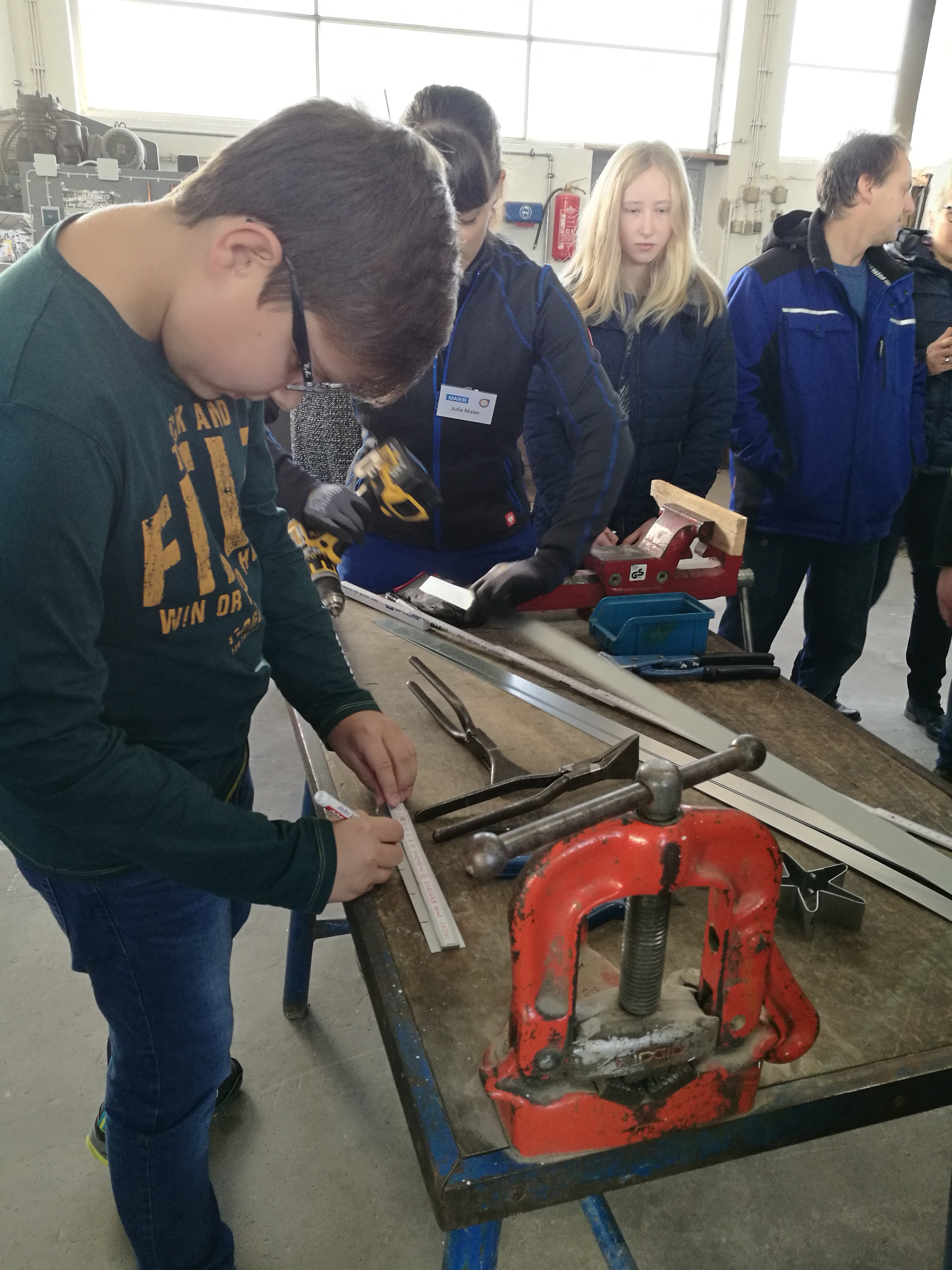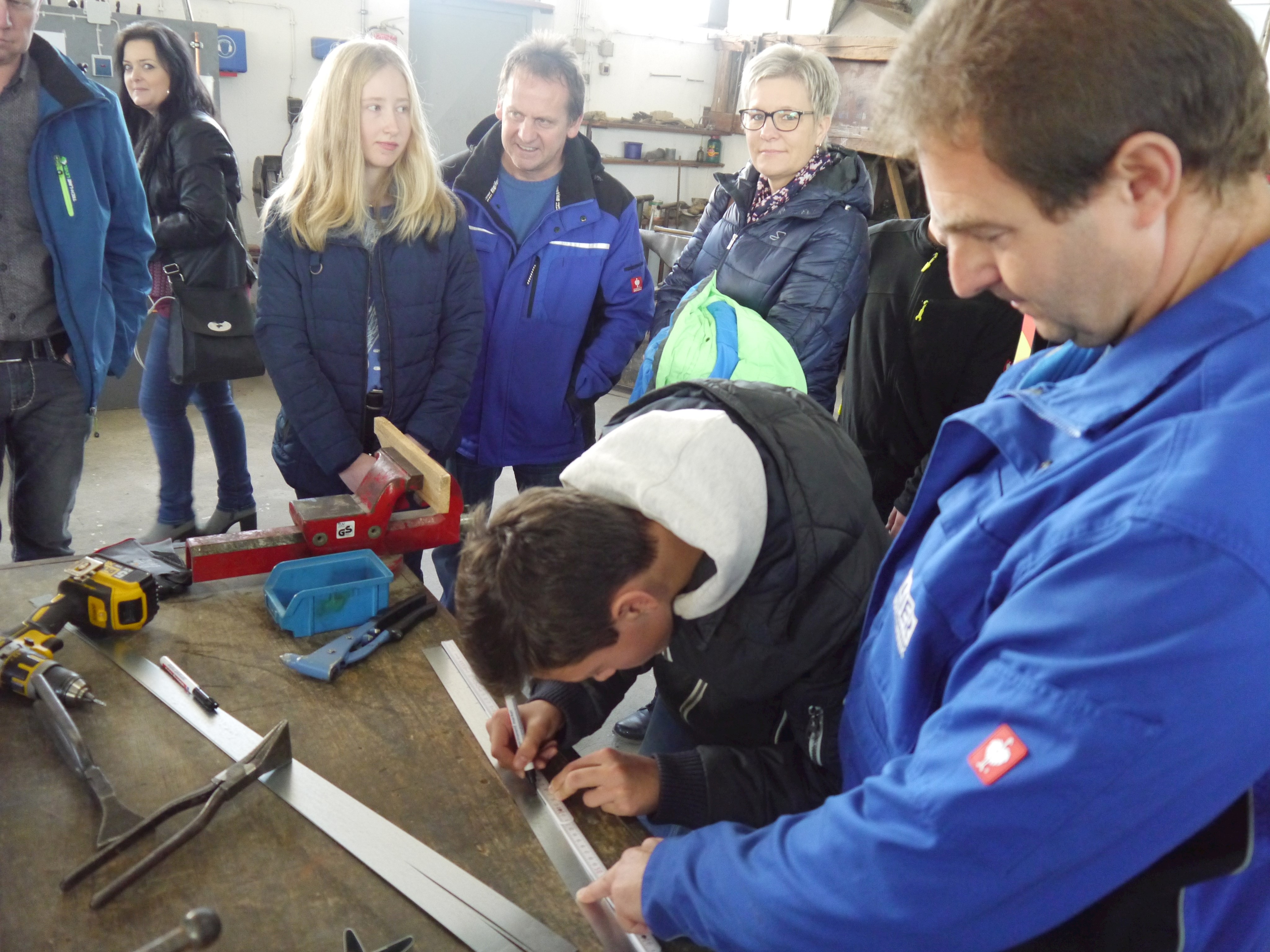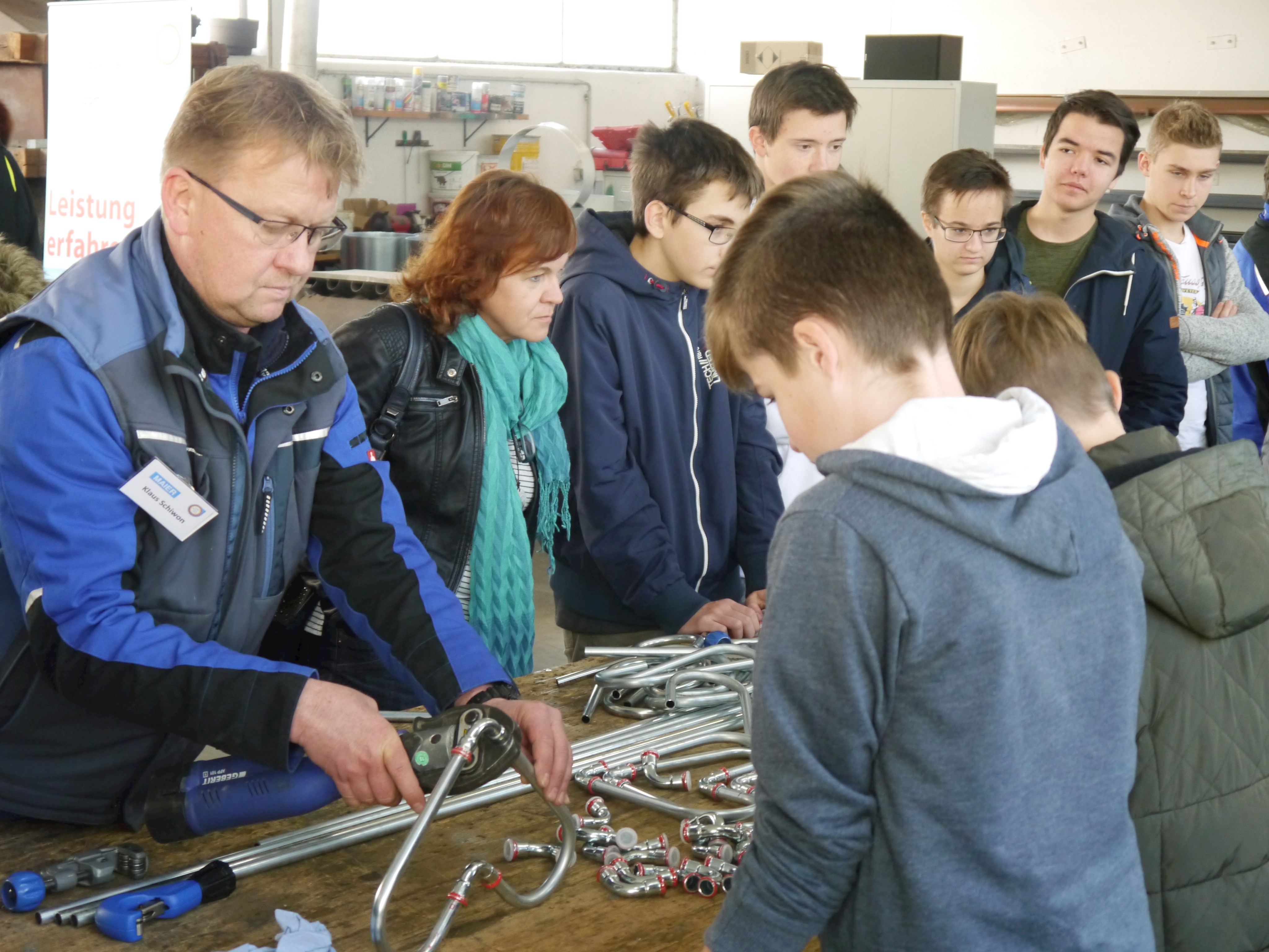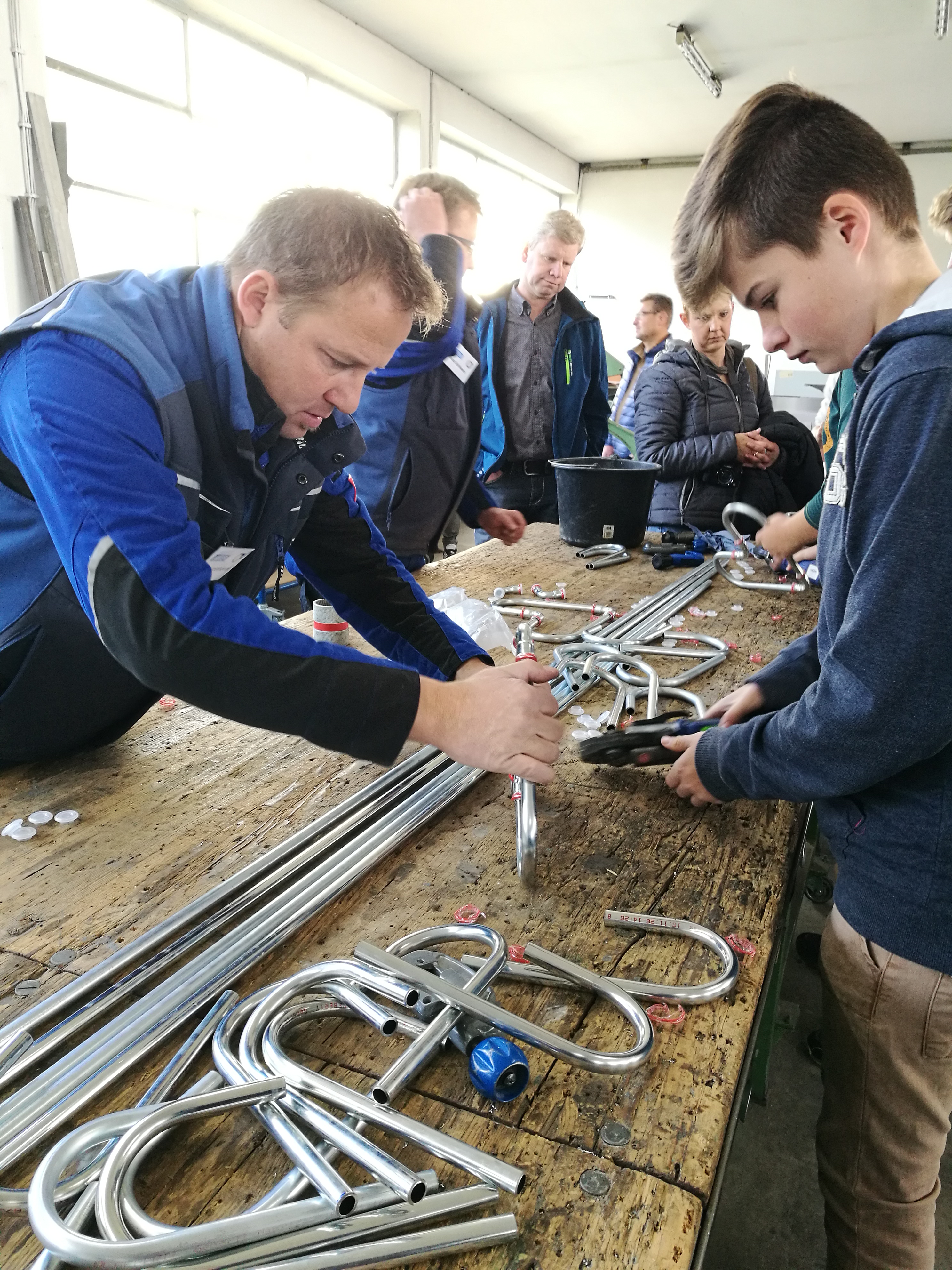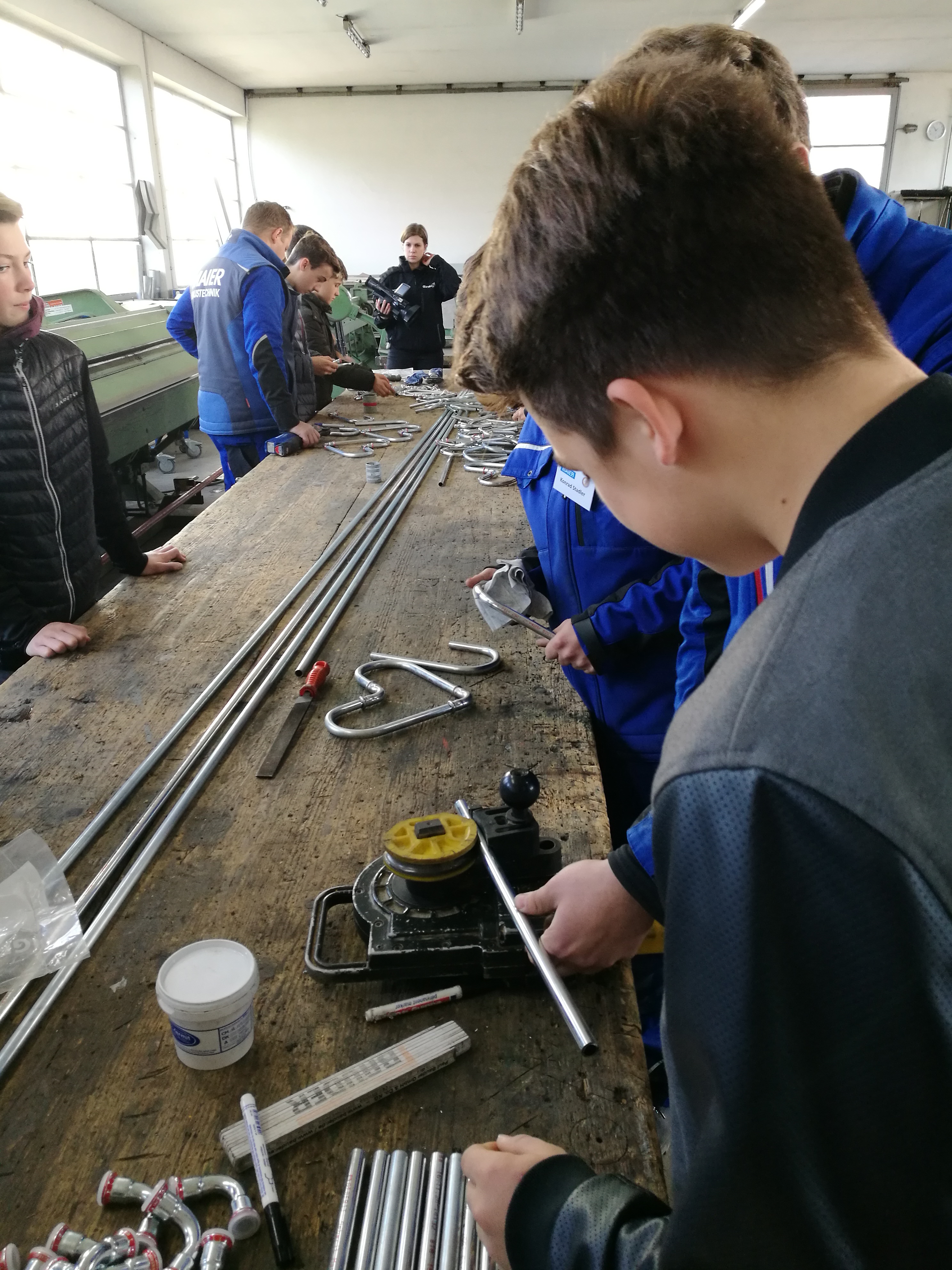 Ein absolutes Highlight war die zweite Station für die Teilnehmer: neben der Brotzeit und den Getränken wartete die Firma Maier Hautechnik mit einem Mitmach-Programm auf. So konnten die Jugendlichen und auch deren Eltern unter Anleitung der Mitarbeiter der Firma Maier Rohre und Bleche biegen, Nieten, Bohren und Pressen- sozusagen alle Fertigkeiten einer modernen Hautechnik selbst anwenden. „Wir wollen den Jugendlichen zeigen, wie abwechslungsreich unser Handwerk ist. Deshalb haben wir die Teilnehmer einfach mal selber ausprobieren lassen“, erklärt Anton Maier seine Herangehensweise. Heraus kamen Herzen und Sterne, die alle Teilnehmer mitnehmen durften. Begeistert von den Tätigkeiten in der Firma nutzten einige Teilnehmer die Chance- und vereinbarten mit dem Chef so nebenbei bereits die ersten Praktika: „Die Tätigkeiten hatten mir sehr gut gefallen, das möchte ich ganz gerne mal in einem Praktikum genauer ausprobieren. Mir hat auch ganz gut gefallen, dass die Firma fast ausschließlich in der Region arbeitet. Da müsste ich nicht weiter weg und hätte weiterhin Zeit für meine Hobbies“, so ein Teilnehmer zur Freude des Firmenbesitzers.