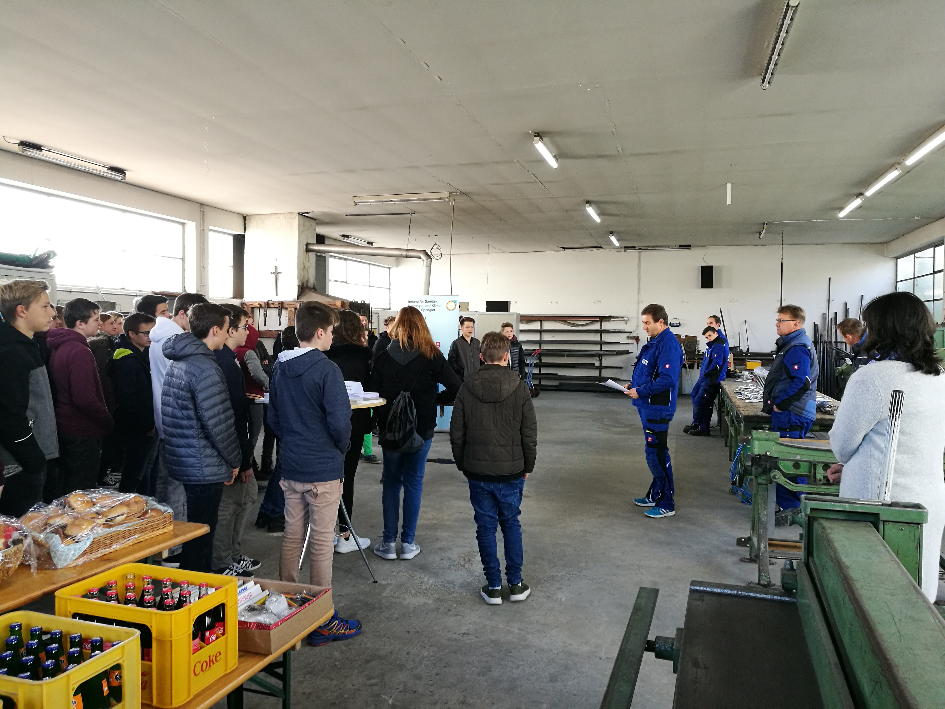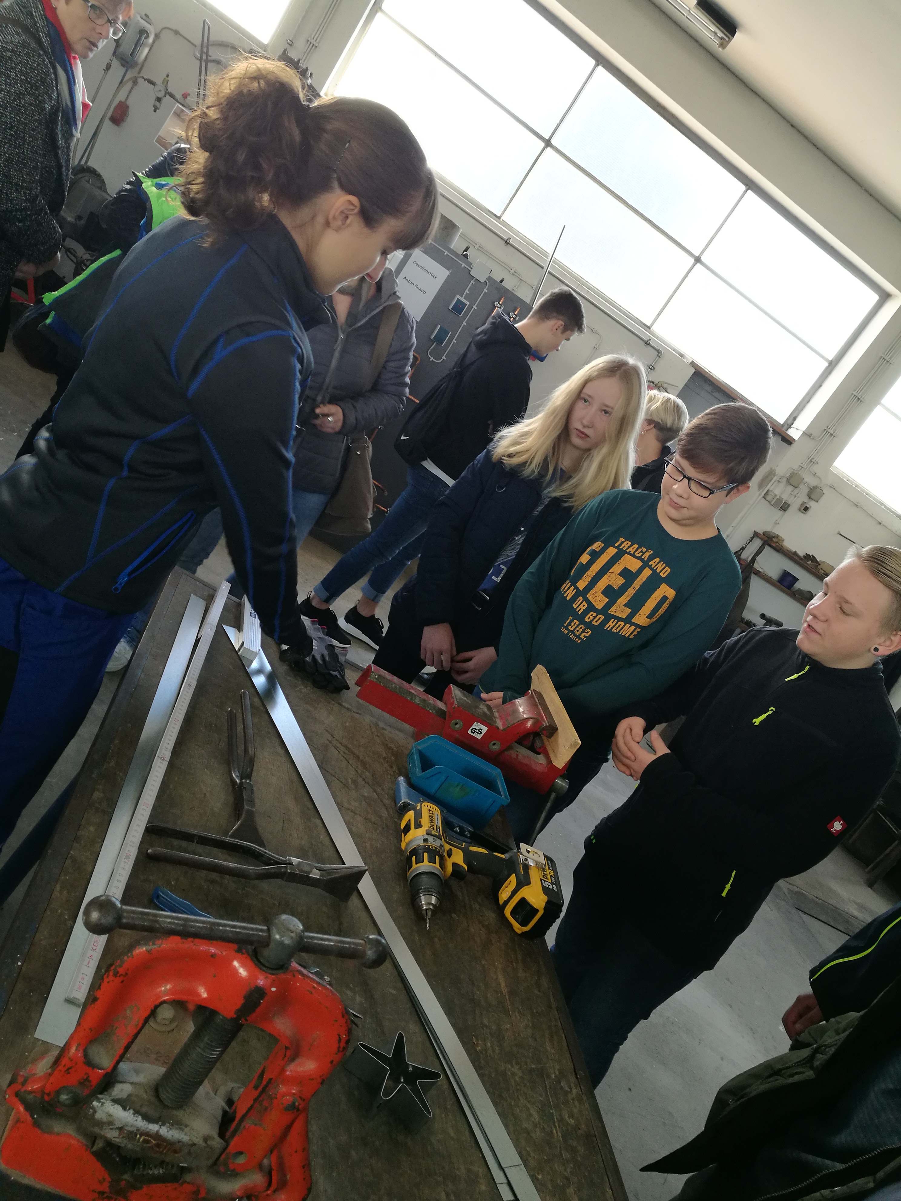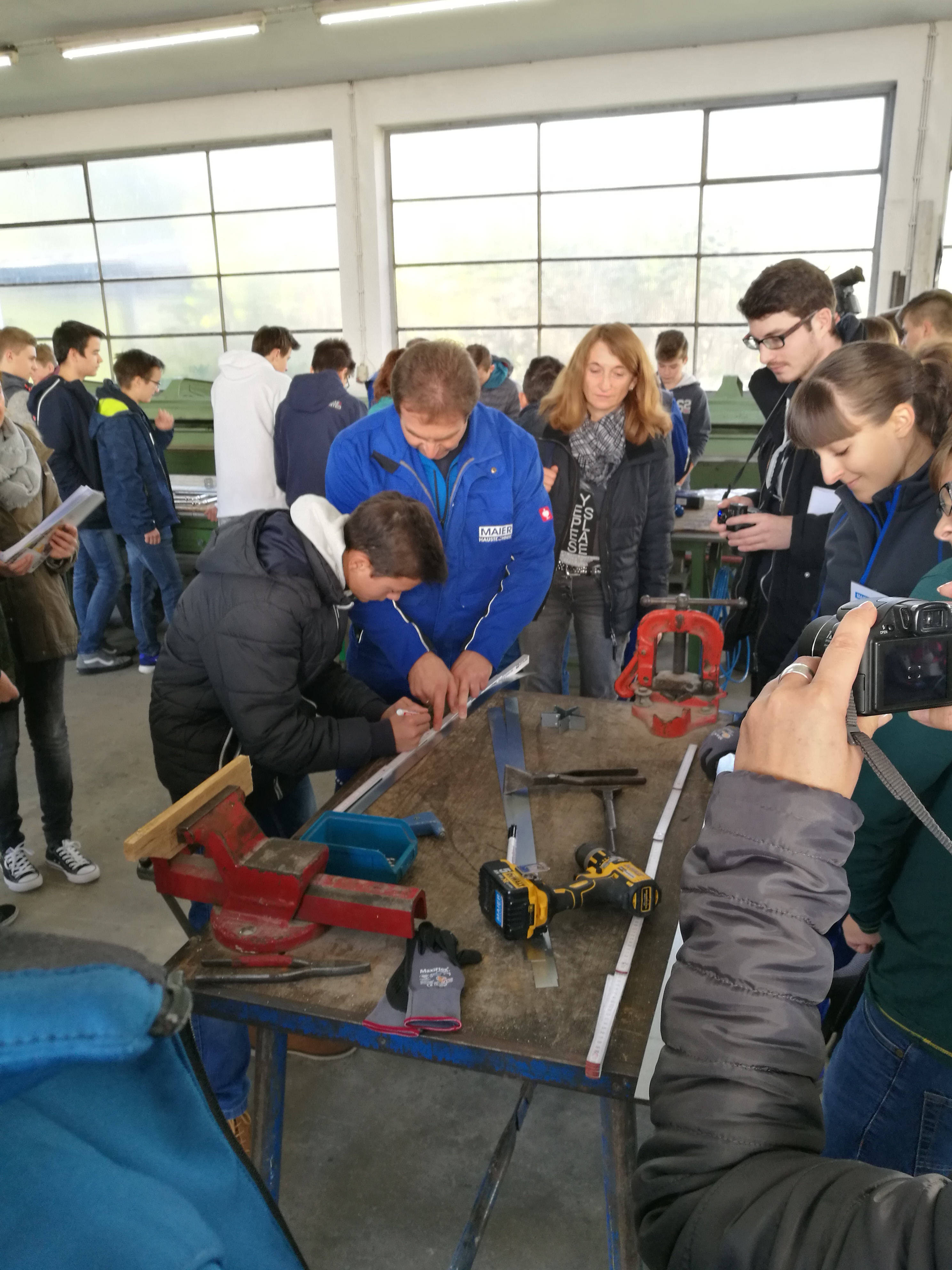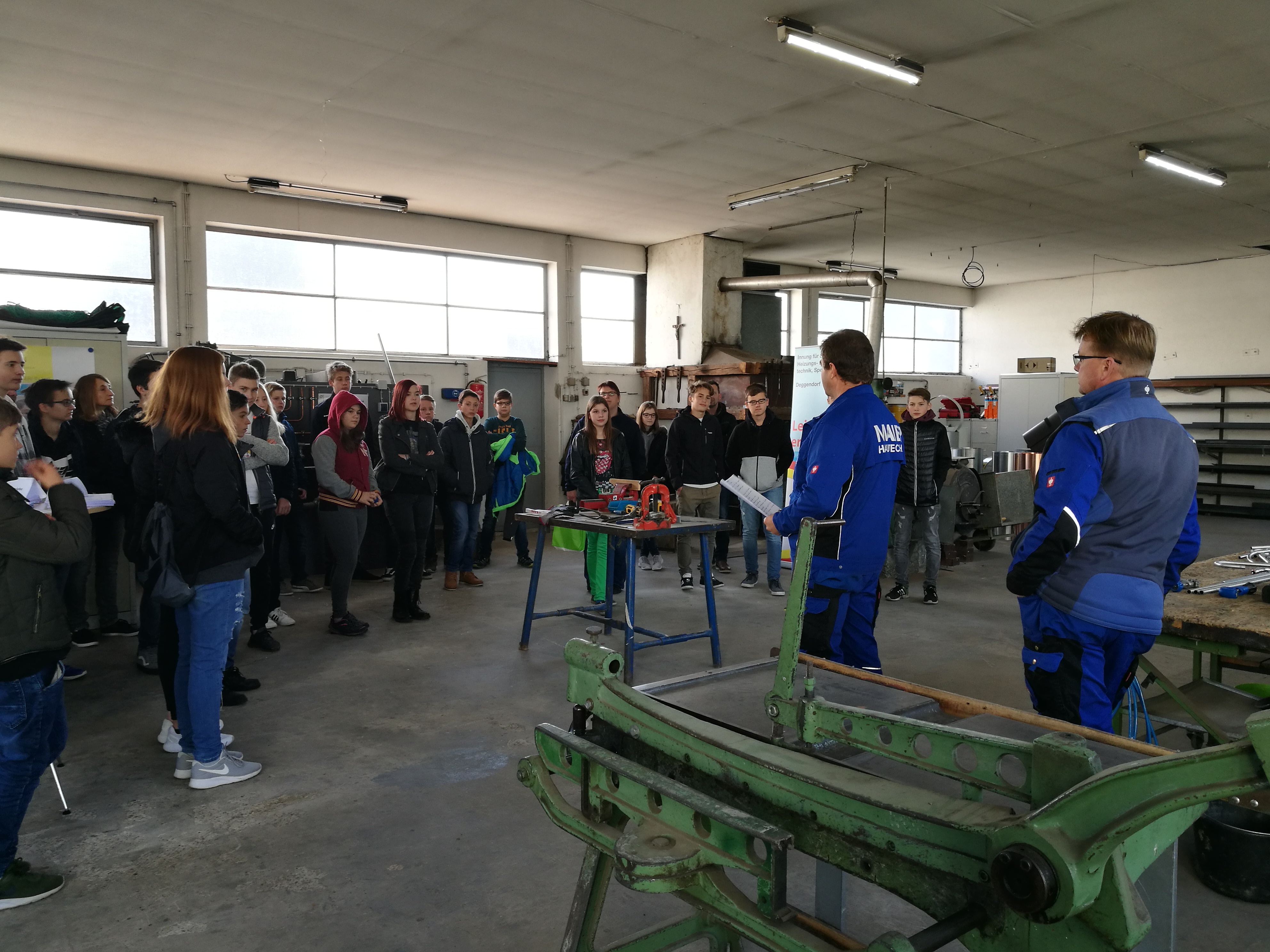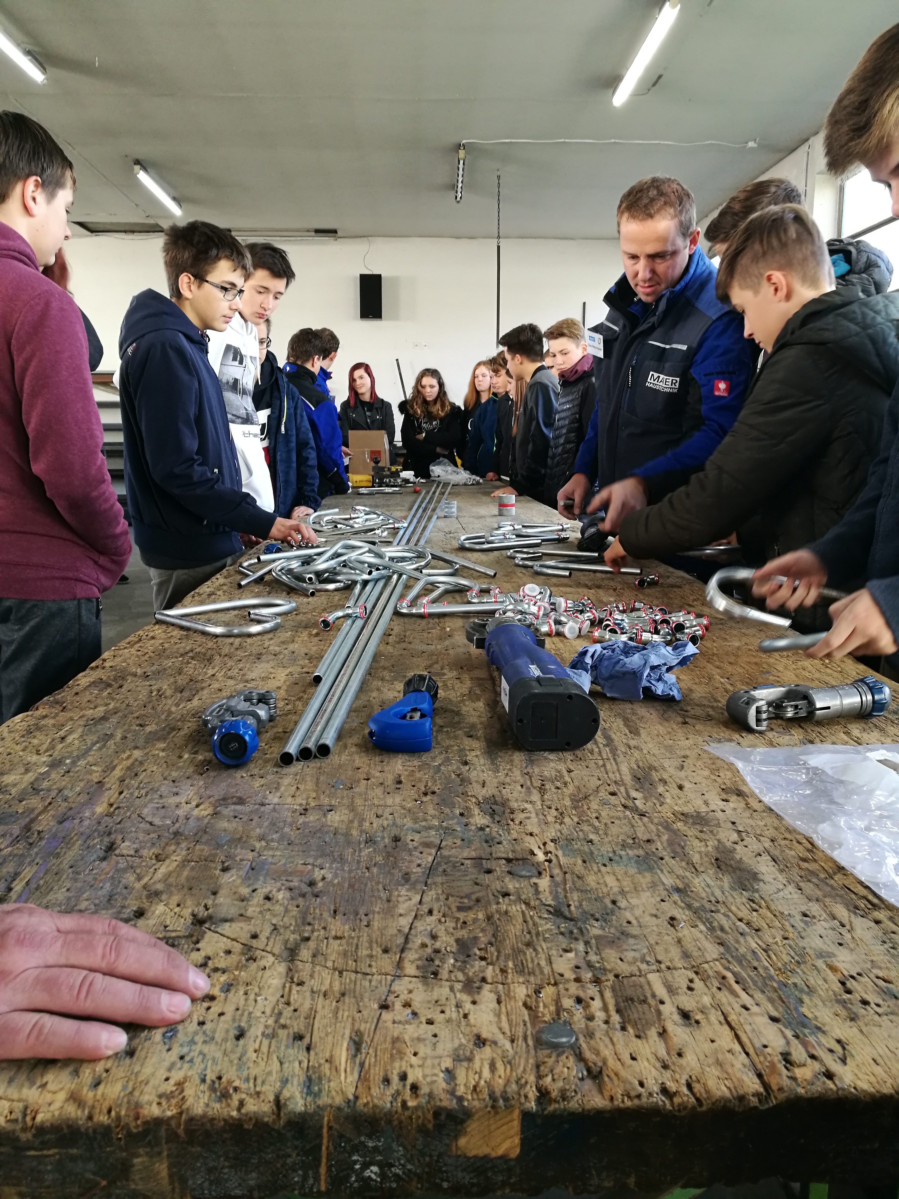 Ein absolutes Highlight war die zweite Station für die Teilnehmer: neben der Brotzeit und den Getränken wartete die Firma Maier Hautechnik mit einem Mitmach-Programm auf. So konnten die Jugendlichen und auch deren Eltern unter Anleitung der Mitarbeiter der Firma Maier Rohre und Bleche biegen, Nieten, Bohren und Pressen- sozusagen alle Fertigkeiten einer modernen Hautechnik selbst anwenden. „Wir wollen den Jugendlichen zeigen, wie abwechslungsreich unser Handwerk ist. Deshalb haben wir die Teilnehmer einfach mal selber ausprobieren lassen“, erklärt Anton Maier seine Herangehensweise. Heraus kamen Herzen und Sterne, die alle Teilnehmer mitnehmen durften. Begeistert von den Tätigkeiten in der Firma nutzten einige Teilnehmer die Chance- und vereinbarten mit dem Chef so nebenbei bereits die ersten Praktika: „Die Tätigkeiten hatten mir sehr gut gefallen, das möchte ich ganz gerne mal in einem Praktikum genauer ausprobieren. Mir hat auch ganz gut gefallen, dass die Firma fast ausschließlich in der Region arbeitet. Da müsste ich nicht weiter weg und hätte weiterhin Zeit für meine Hobbies“, so ein Teilnehmer zur Freude des Firmenbesitzers.