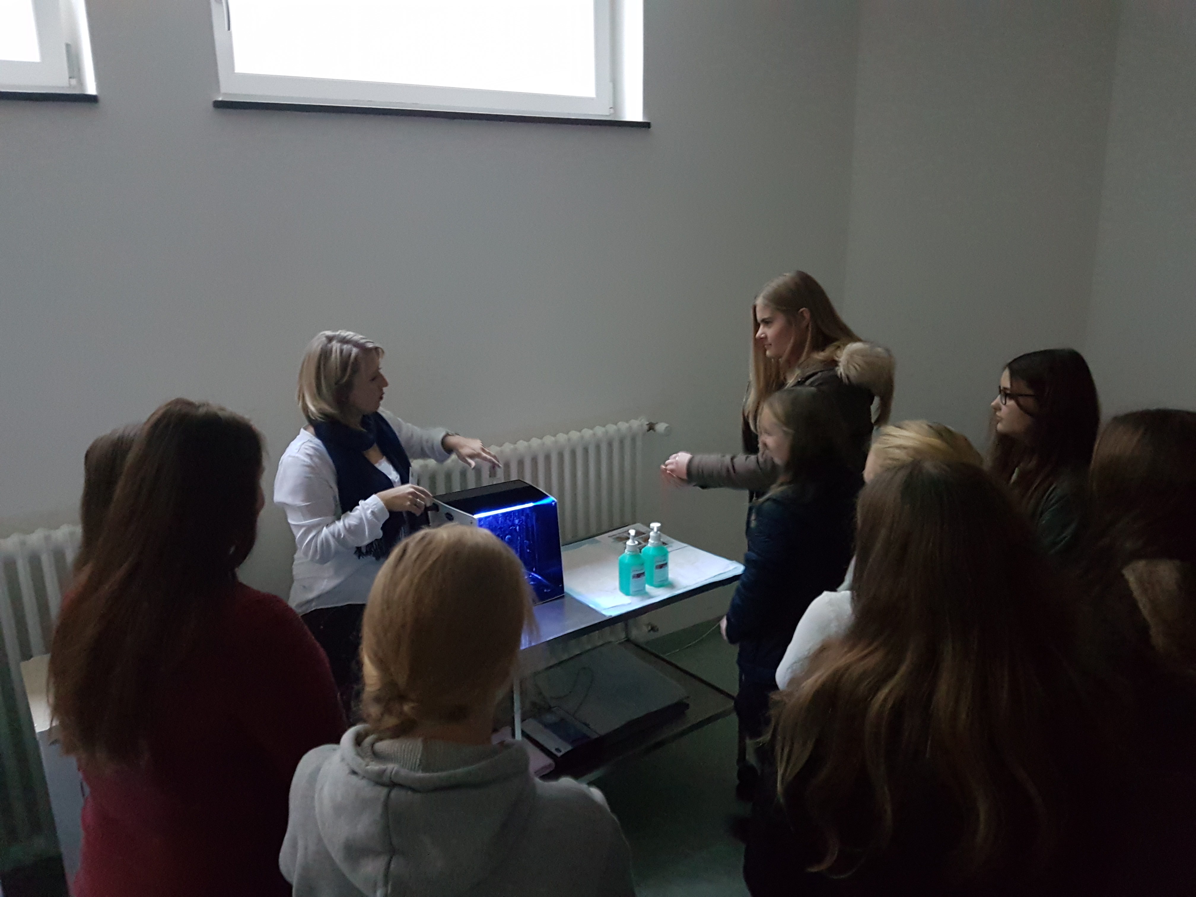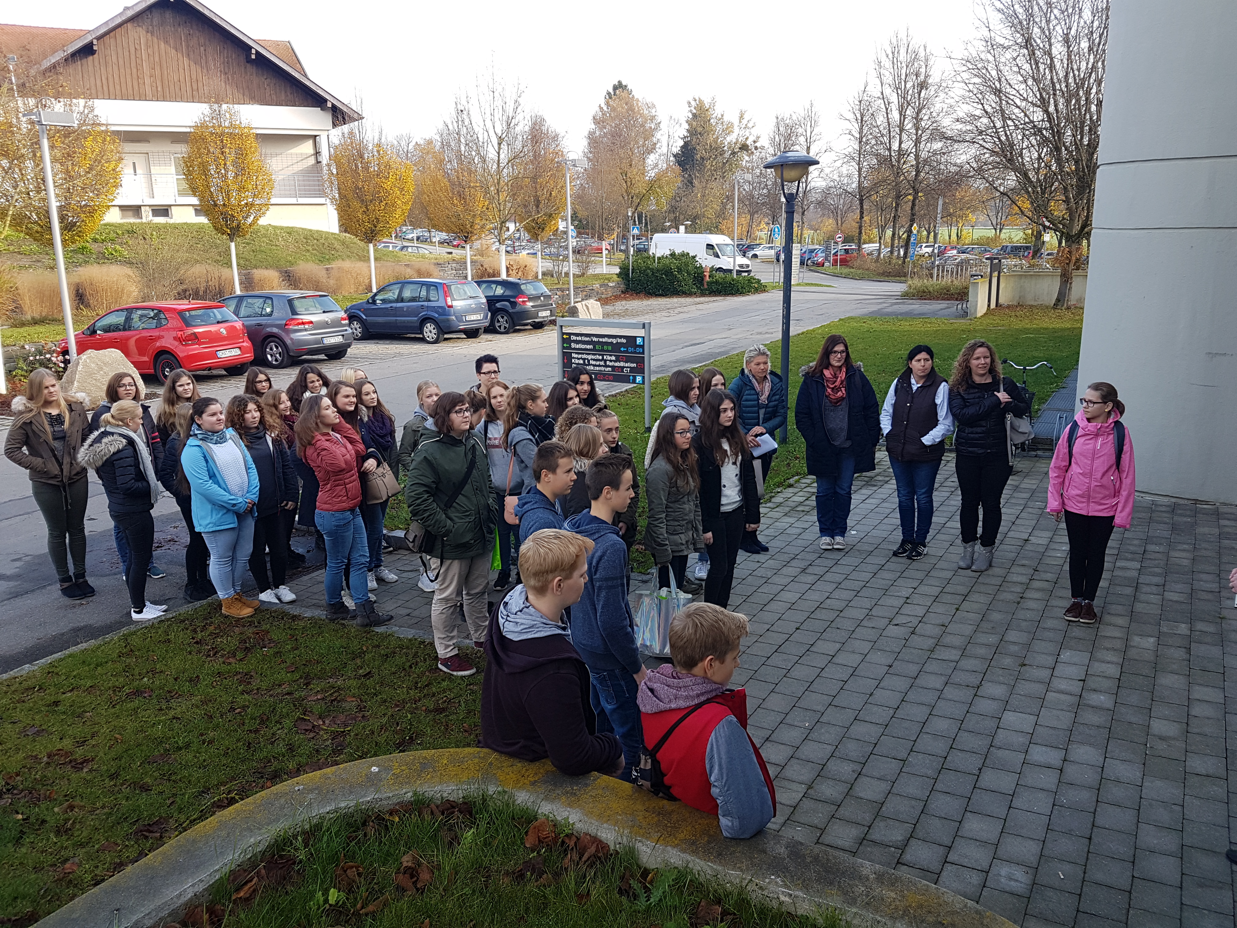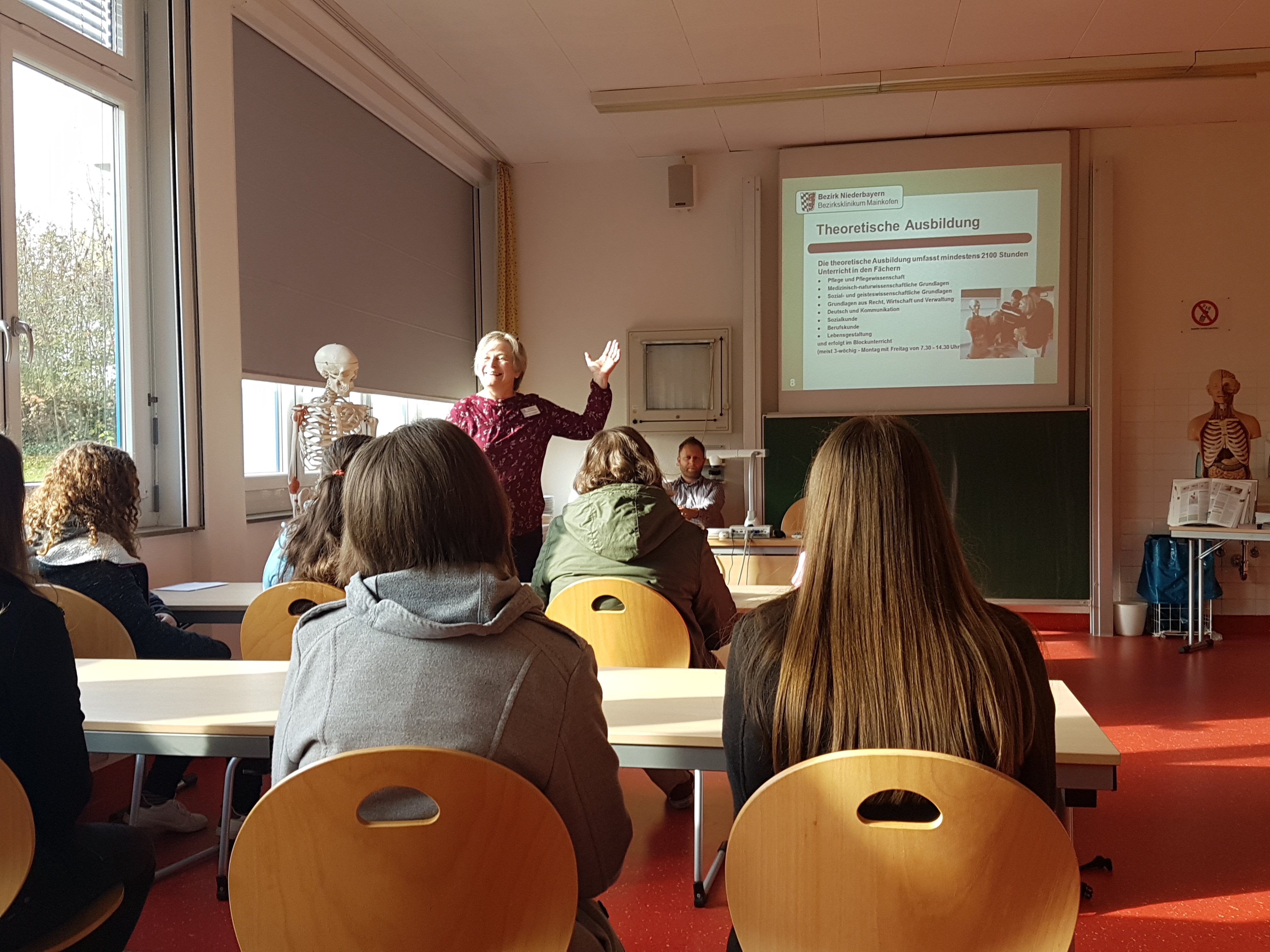 Die zweite Tour beschäftigte sich nicht mit technischen Berufen, sondern ging mehr in die Richtung "Soziales". Nachdem alle Jugendlichen und auch Eltern an den Haltestellen in Osterhofen, Langenisarhofen und Plattling eingesammelt wurden, machte sich die Gruppe auf den Weg in Bezirksklinikum in Mainkofen. Empfangen von der Stv. Schulleiterin der dortigen Krankenpflegeschule, wurden vorab die wichtigsten Informationen zum Pflegeberuf weitergegeben. Anschließend teilte sich die Gruppe in 3 Teile. Nun konnten in kleinen Gruppen verschiedene Tätigkeiten und Anwendungen im Pflegealltag erfahren werden: von einer Blindverkostung (wie fühlt man sich, wenn man jemanden hilft?) über das richtige Händewaschen (mit Kontrolle unter UV-Licht) bis hin zur Reanimation und erster Hilfe- da erkannten die Teilnehmer wie vielseitig und abwechslungsreich der Pflegeberuf ist. Frau Seeholzer verwies auf die Möglichkeit eines freiwilligen sozialen Jahres, um herauszufinden, ob der Pflegeberuf das Richtige ist.