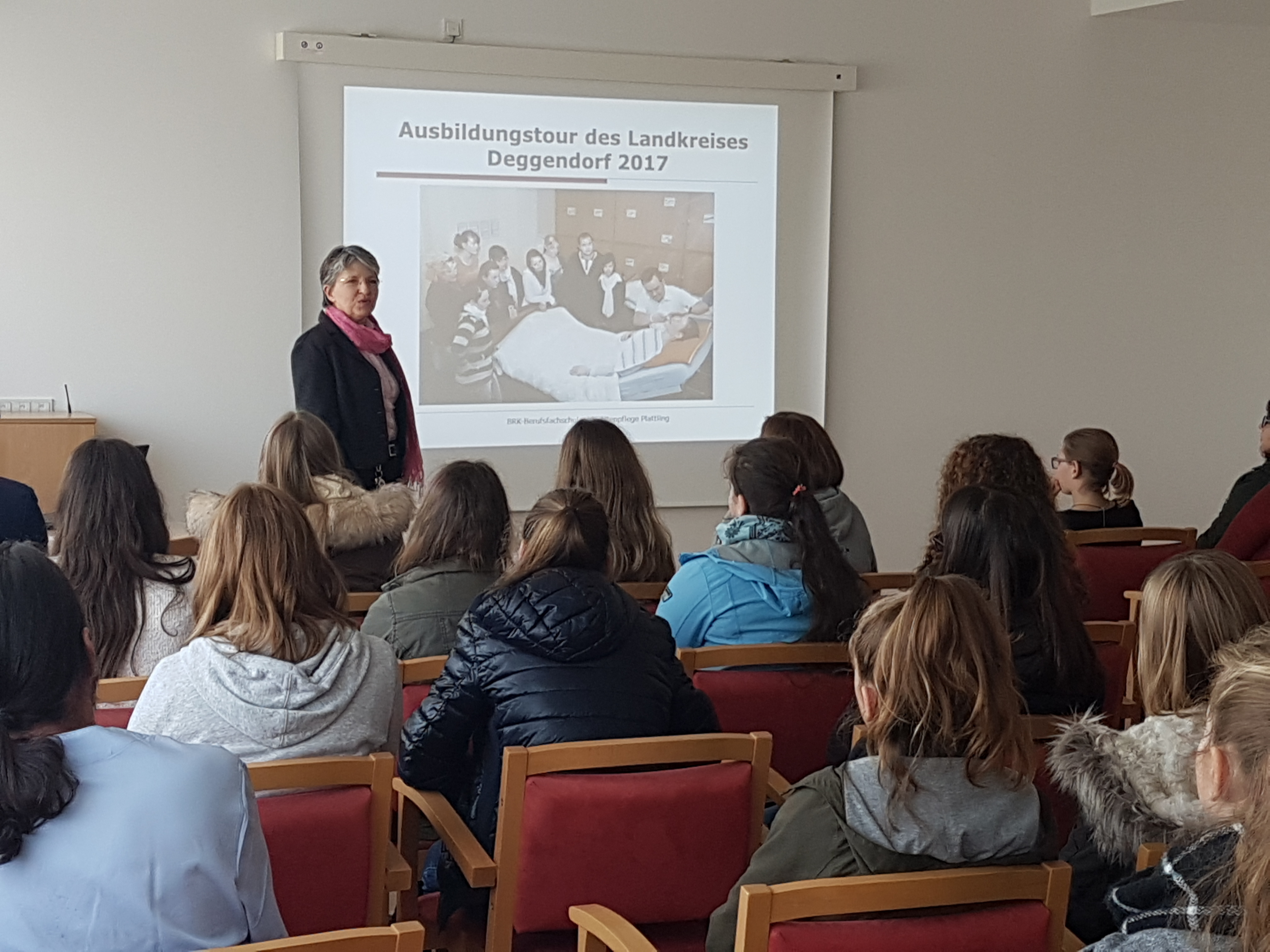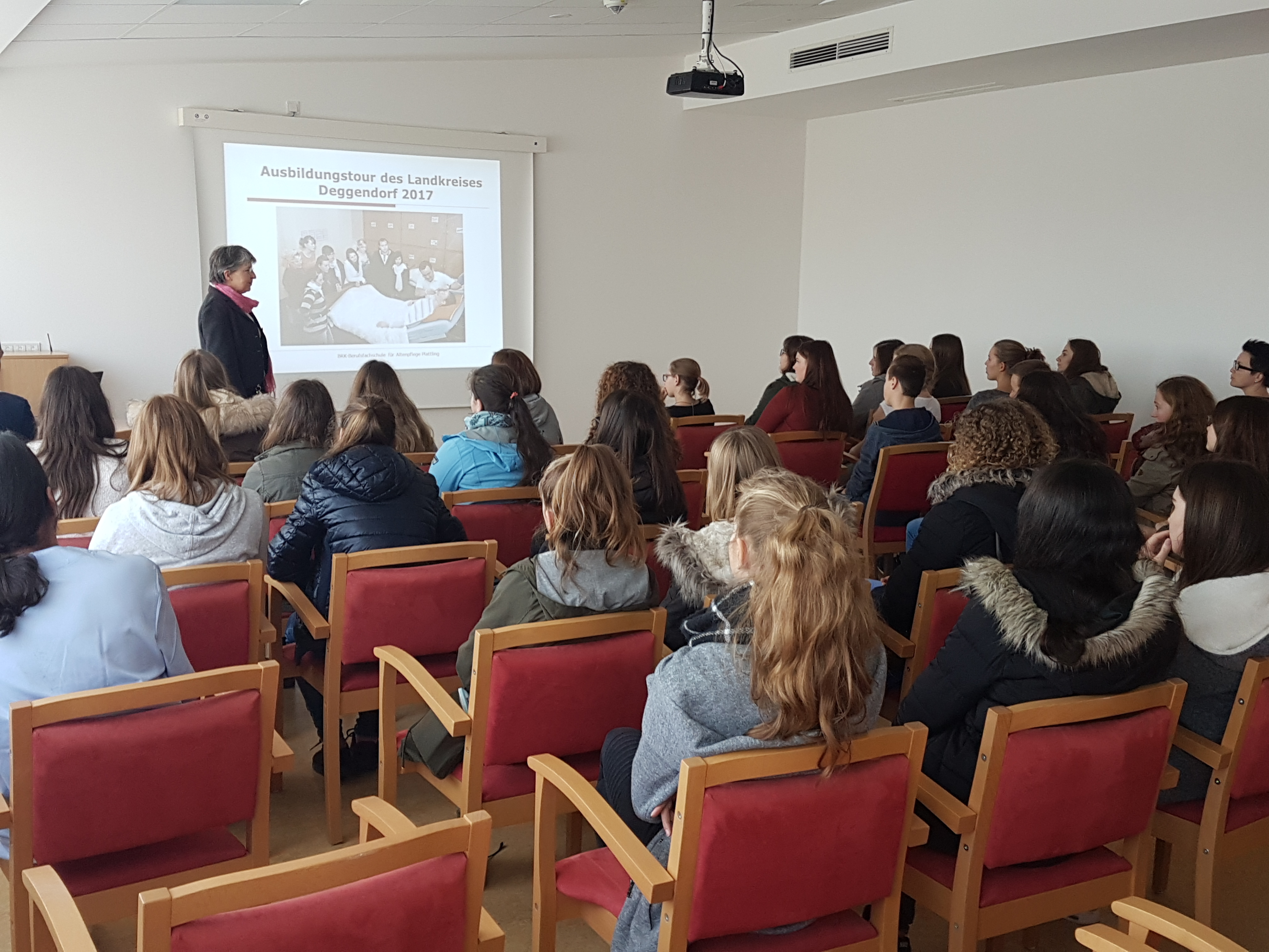 Im Isar-Park angekommen gab´s von Michael Döschl, dem Leiter der BRK-Altenheime im Kreisverband Deggendorf, einen Überblick über die Struktur des BRK in der Region und deren Altenheime. Dabei führte er auch zahlreiche Kooperationen des Altenheims mit umliegenden Einrichtungen auf: vom Kindergarten des BRK bis hin zu den Klinik-Clowns. Einen Einblick in den Alltag eines Altenpflegers gab der Stv. Pflegedienstleiter Daniel Gigl. Vom Aufstehen über die Medikamentenversorgung und Mittagessen bis hin zu Freizeitbeschäftigungen und Abendessen- der Pfleger ist in allen Tages- und Nachtzeiten gefordert. Bevor abschließend die Wohnbereiche besichtigt wurden, ging die Leiterin der Altenpflegeschule des BRK Katharina Kugler auf die Ausbildungen zum Altenpflegehelfer und Altenpfleger ein. Sie richtete ihr Augenmerk auch auf die für viele Leute sehr erfüllende Aufgabe, ältere Personen auf den letzten Lebensabschnitt zu begleiten. Zugleich führte sie die Chancen im Pflegebereich auf- egal ob als Alten- oder auch Krankenpfleger.
