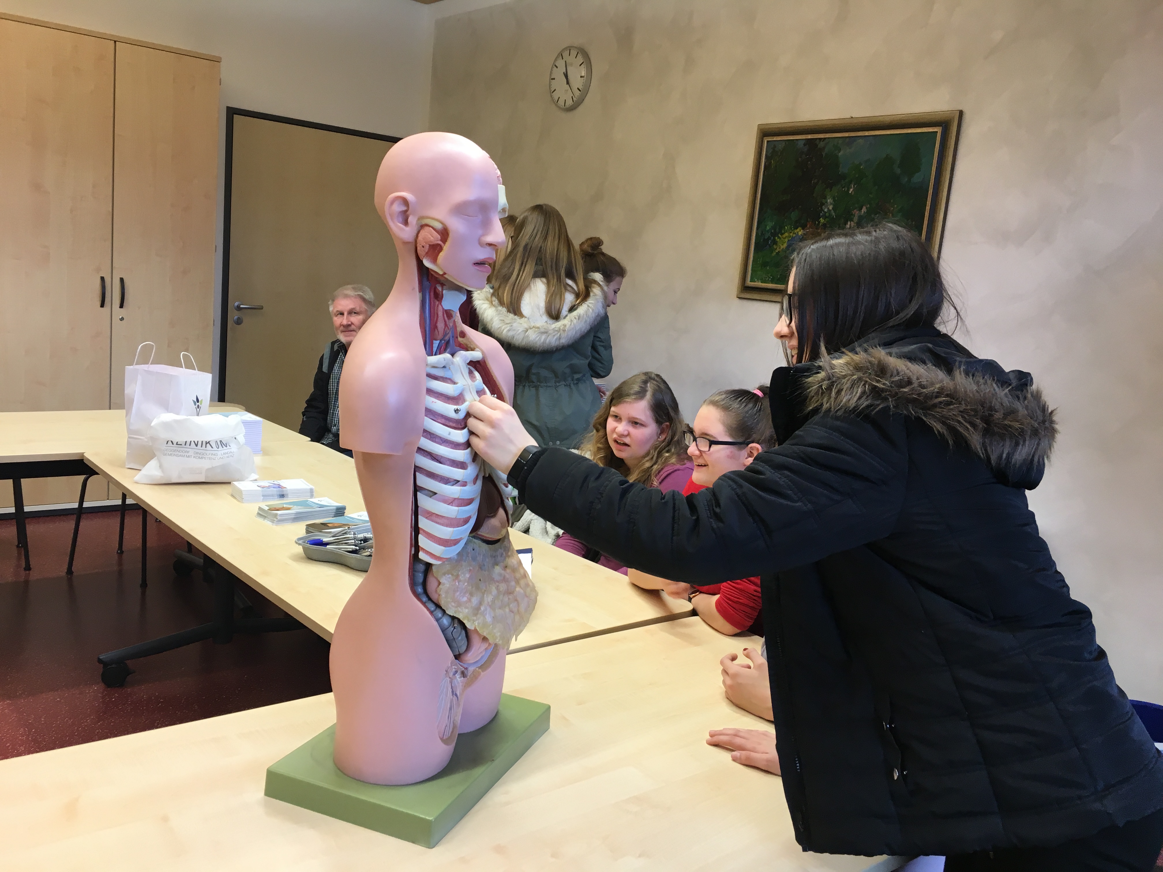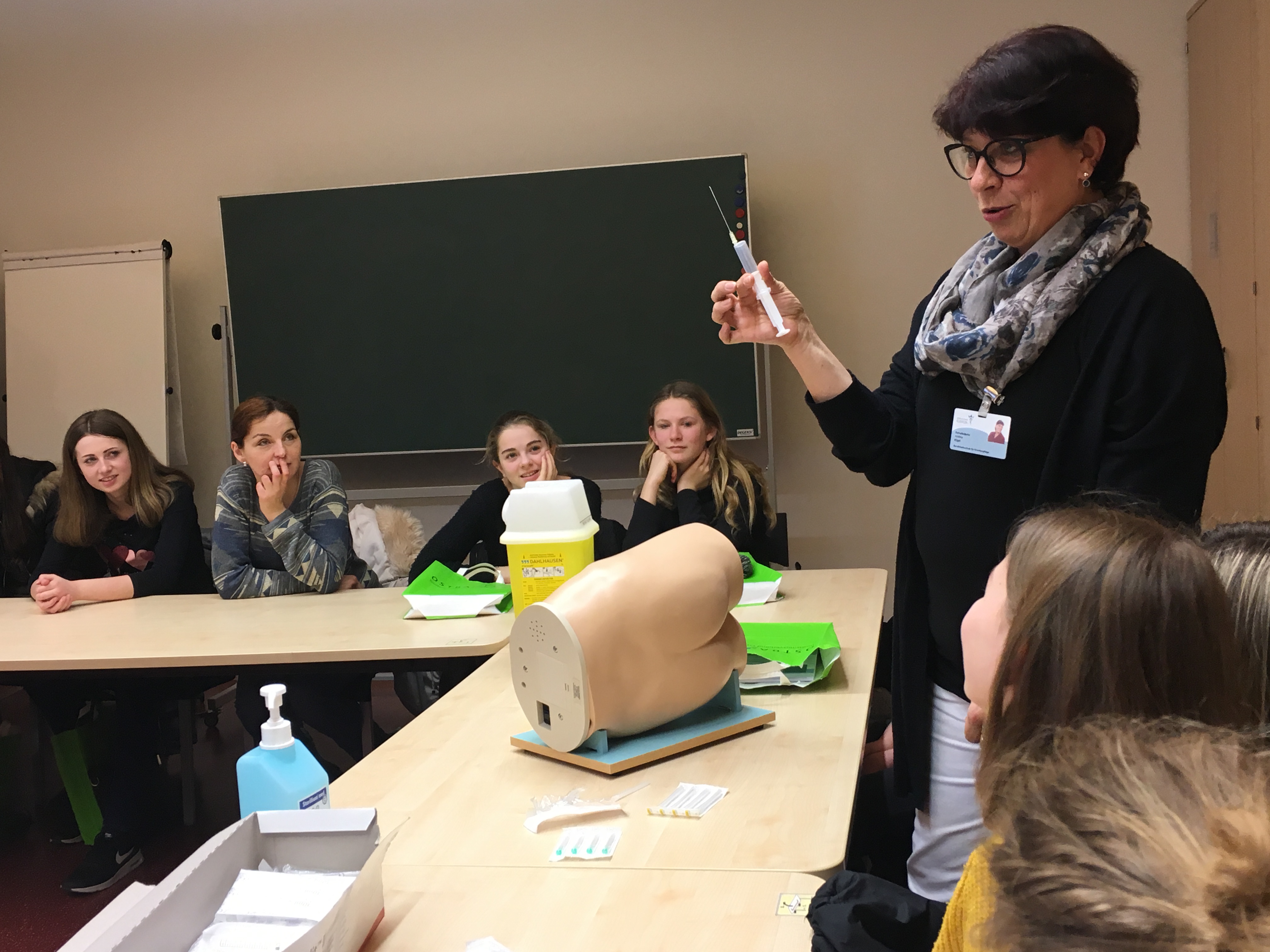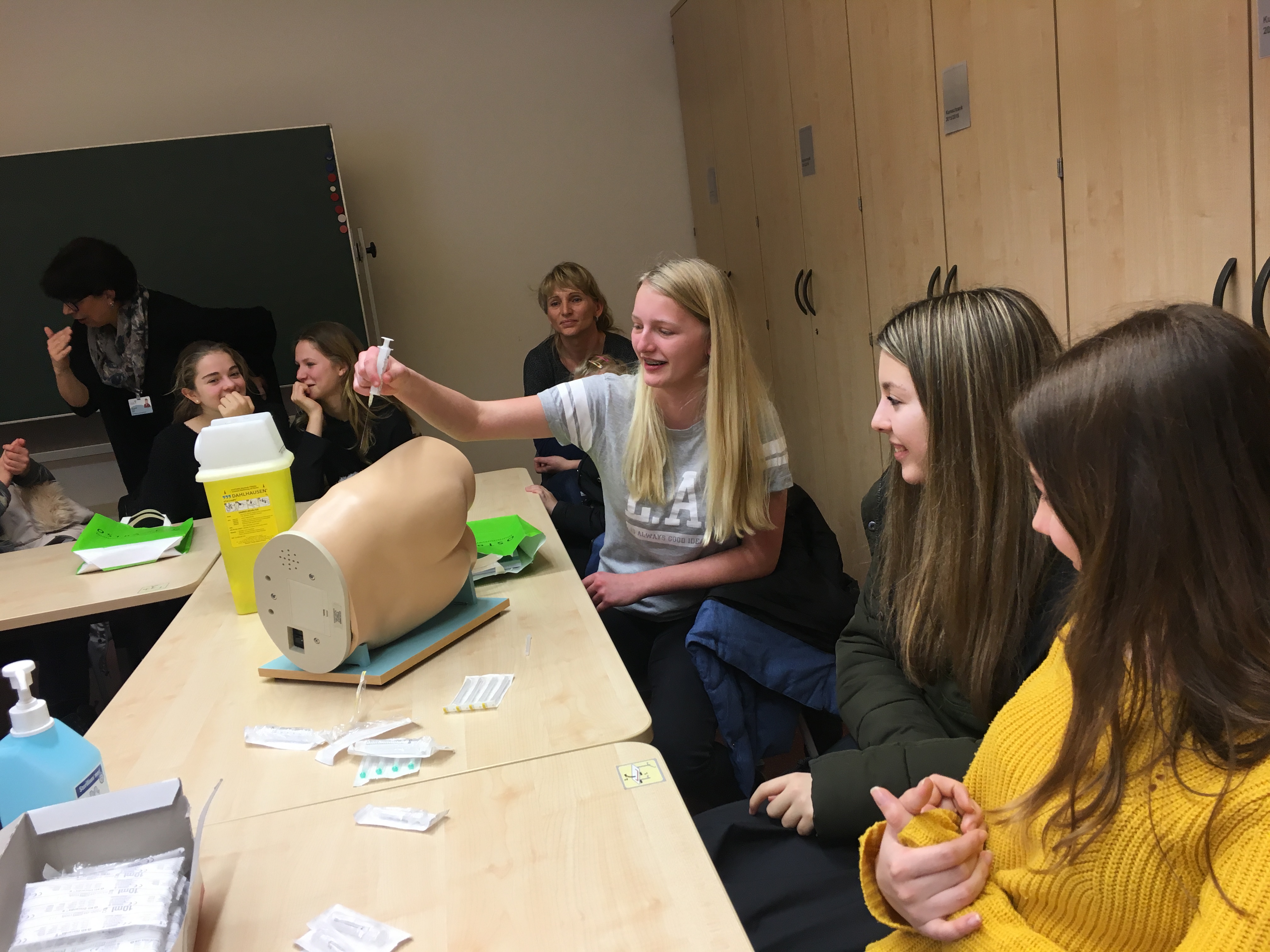 Anschließend ging es weiter zur Berufsfachschule für Krankenpflege am Donau-Isar-Klinikum Deggendorf. Am Haupteingang erwartete Andrea Klarl die aufgeschlossene Gruppe. Die Schulleiterin erklärte zunächst, welche Qualifikationen man benötigt und erläuterte den Hergang der Ausbildung genauer. Ein großes Highlight waren die praktischen Tätigkeiten. Zuerst wurde den Schülern und Eltern gezeigt, wie man seine Hände richtig desinfiziert, welche anschließend unter einem UV-Licht kontrolliert wurden. Hinterher konnten die Schüler ihre Geschicklichkeit an einer simulierten Übungspuppe unter Beweis stellen, indem sie am Unterkörper das richtige Injizieren von Spritzen probierten. Nach einer kleinen wohlverdienten Brotzeit ging die Tour weiter Richtung BRK-Seniorenheim.