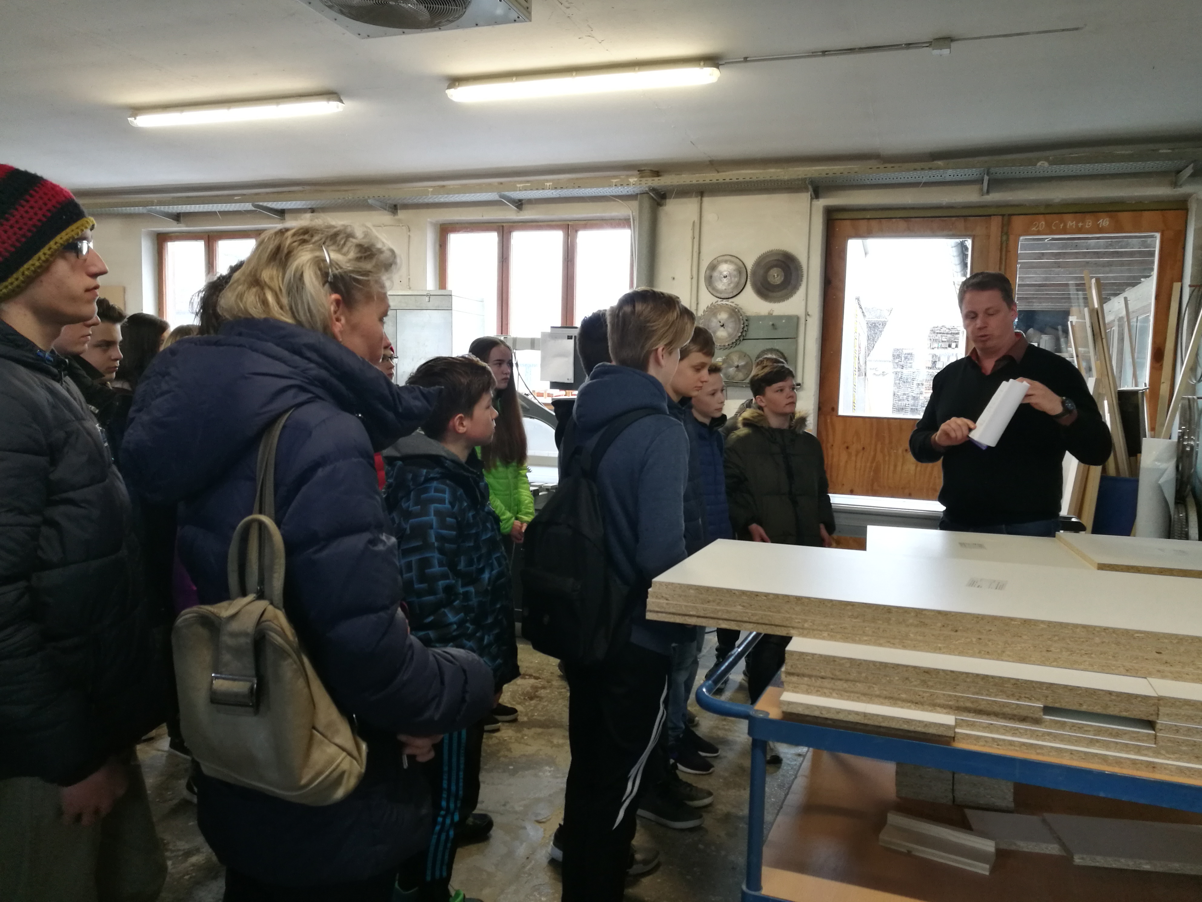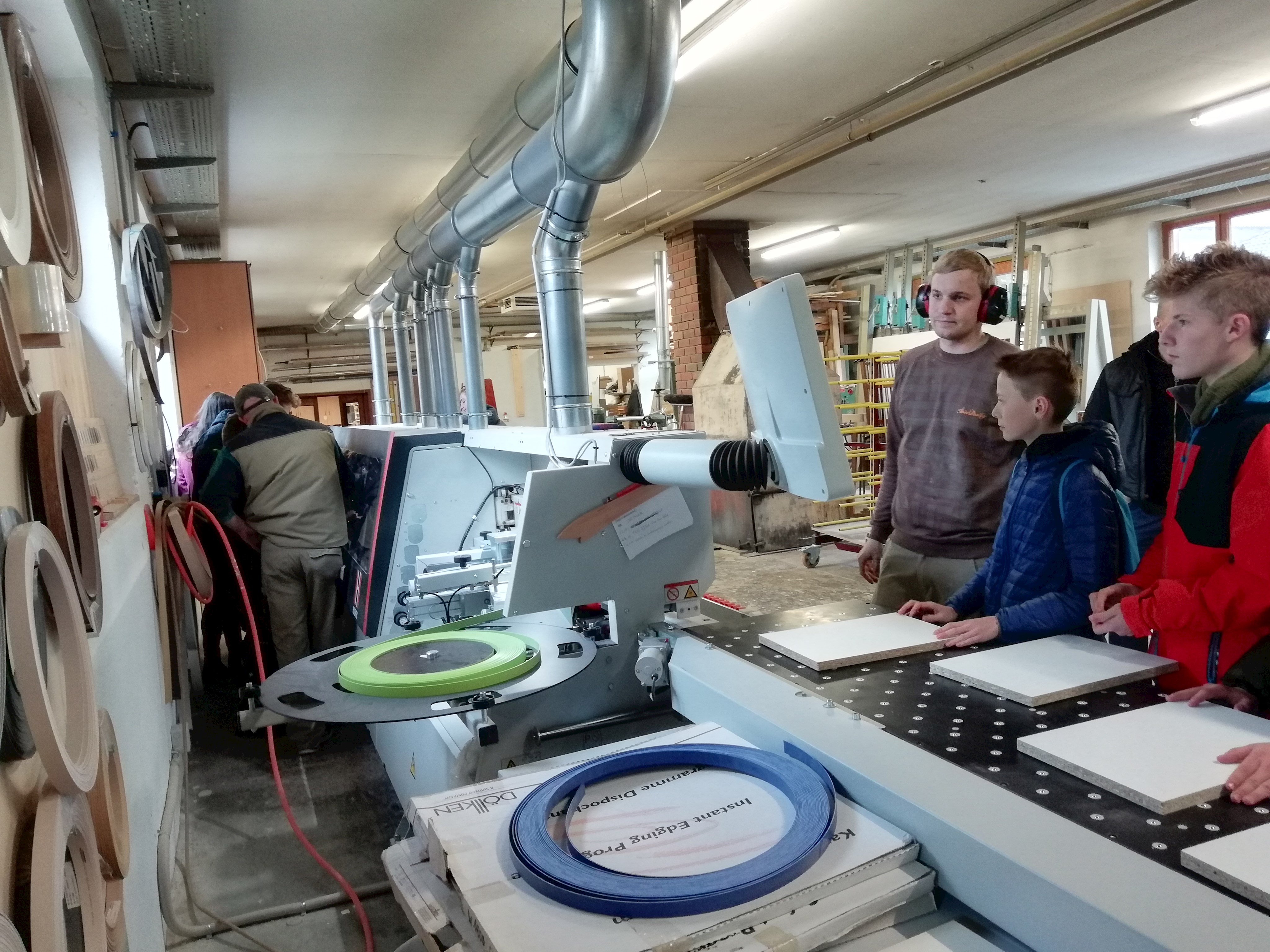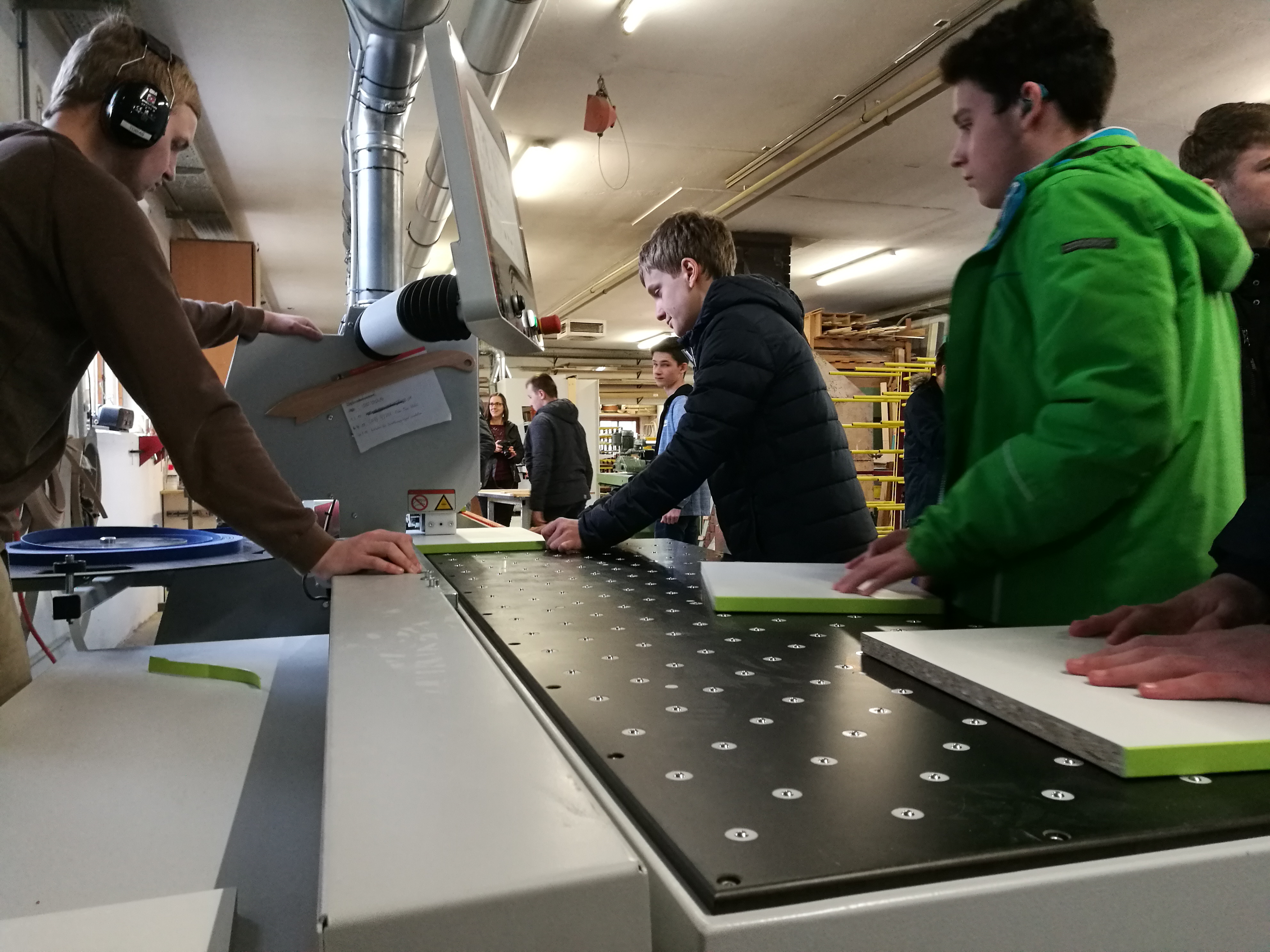 Die letzte Station von Tour 1 war die Schreinerei Endl in Winzer. Firmenchef Roland Endl zeigte anfangs auf, was es braucht um ein Schreiner zu werden. Dann zeigte er den Teilnehmern die Produktionshalle mitsamt den Maschinen. Um konkreter auf einzelne Fragen einzugehen, wurden die rund 30 Schüler in zwei Gruppen aufgeteilt. Beim Rundgang durch die Büros erkannten die Teilnehmer sehr schnell, wie umfangreich der Beruf des Schreiners ist: von Entwürfen am PC mit CAD-Programm bis hin zur großen Fräsmaschine, wo die Jugendlichen ihre eigenen Stücke, unter Aufsicht von einem Meister, fräsen konnten.