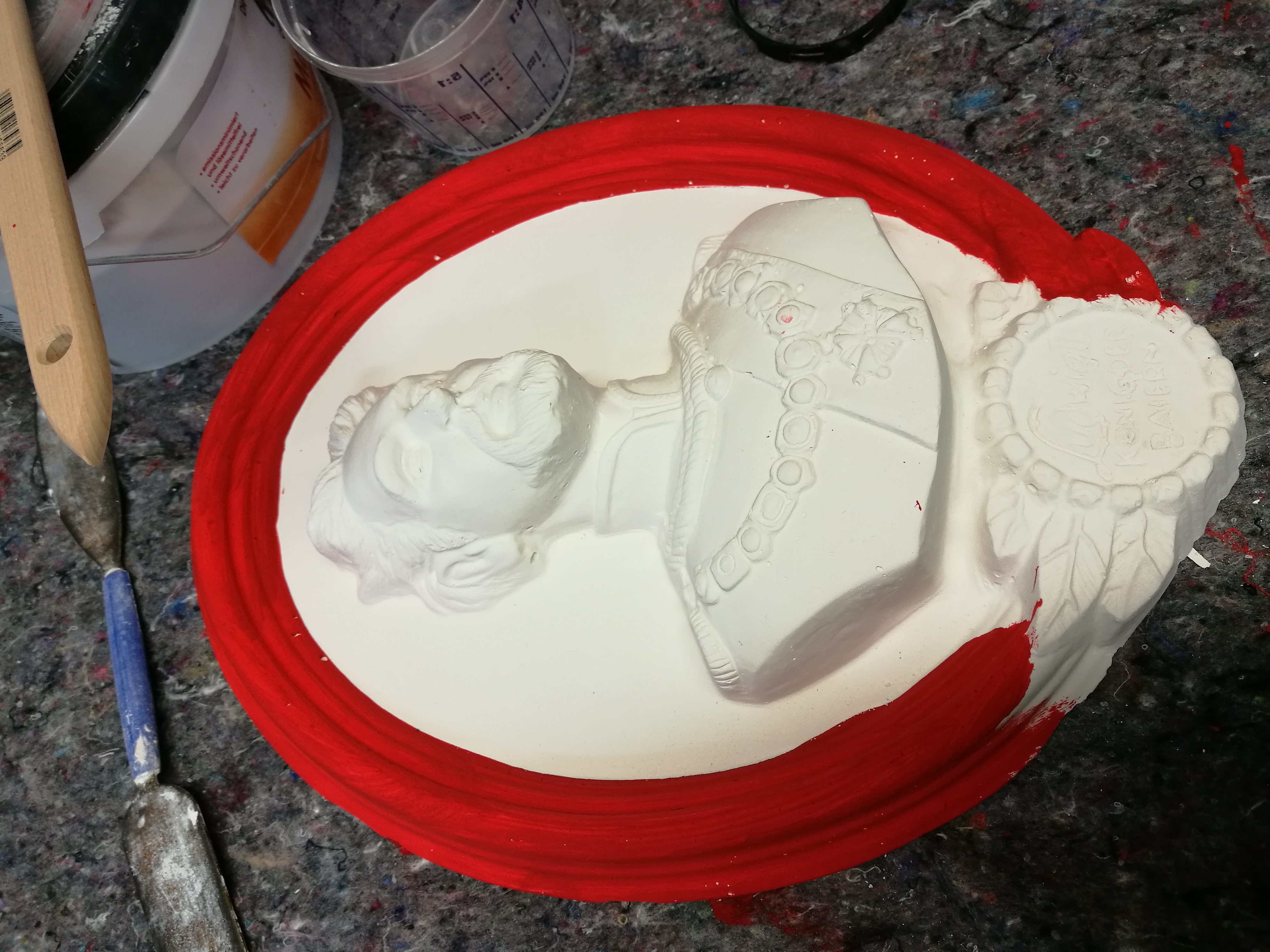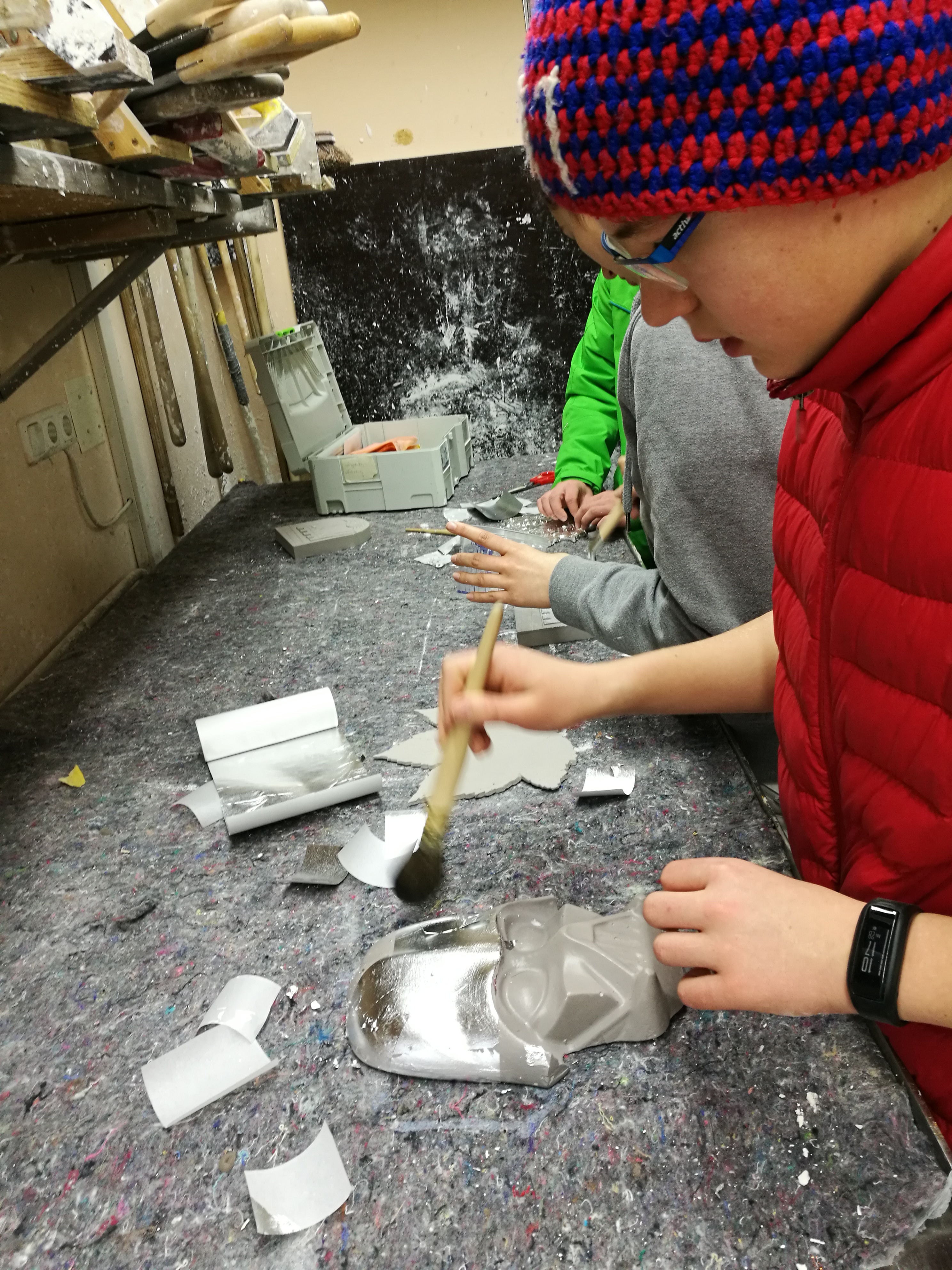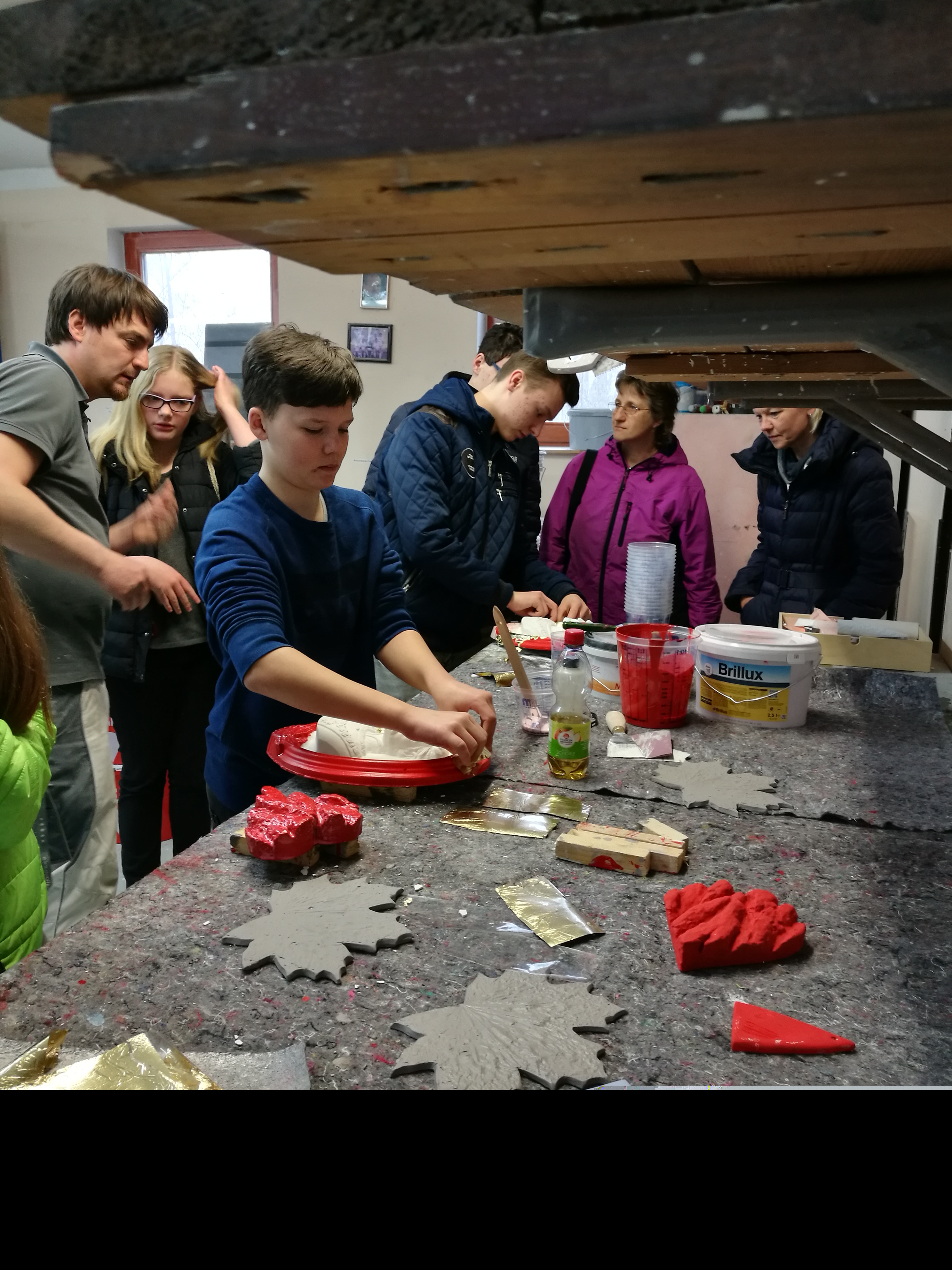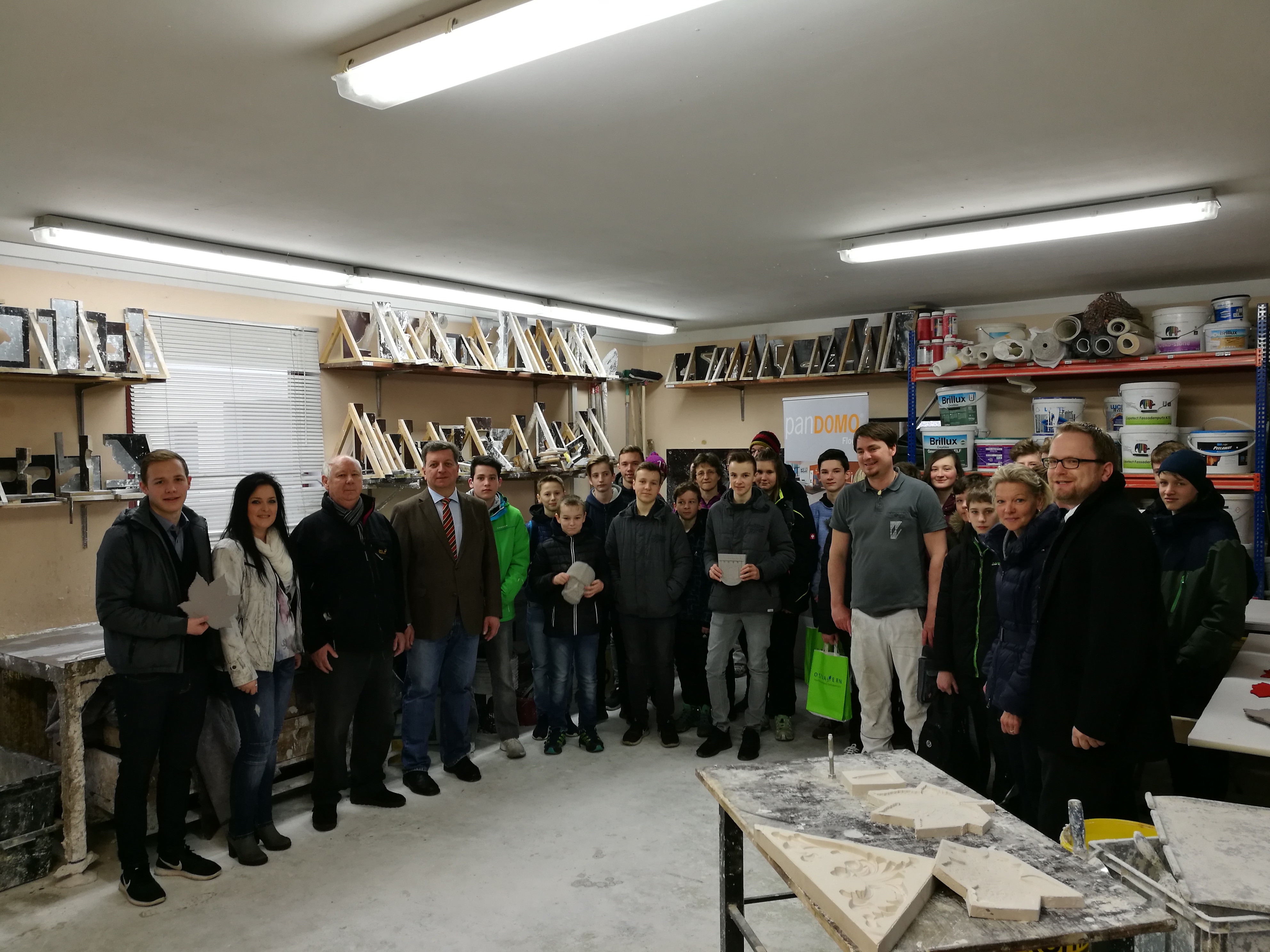 In Tour 1 wurde anschließend beim Maler und Stuckateur Wilhelm Weiß fleißig ausprobiert. Zunächst erklärte Wilhelm Weiß persönlich, welche Möglichkeiten sich heutzutage einem Maler und Stuckateur bieten und welche Tätigkeiten seine Firma ausübt. Dann zeigte er mit einem Auszubildenden wie aus Wasser und Gipspulver Stuck hergestellt wird. Weiß ist der letzte Betrieb in Ostbayern, der Stuck noch selbst herstellt. Hauptsächlich ist er damit bei der Restaurierung von alten Gebäuden wie beispielsweise Kirchen beschäftigt. Beim Versilbern und Vergolden von bereits vorbereiteten Stücken wie „König Ludwig von Bayern“, Star Wars Figur „Darth Vadar“ oder Herzen konnten die Teilnehmer ihr Geschick unter Beweis stellen.
