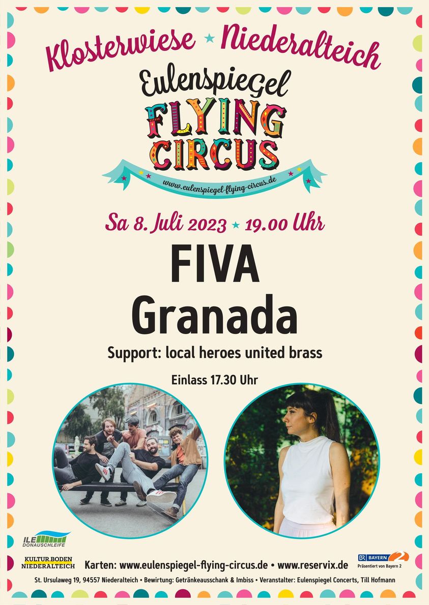 Karten gibt´s online unter https://ticketshop-infranken.reservix.de/tickets-fiva-granada-in-niederalteich-klosterwiese-am-8-7-2023/e2037468
