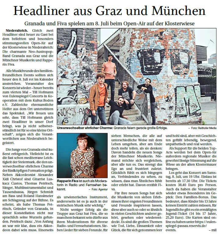 Am 8.Juli 2023 ist auf der Klosterwiese in Niederalteich wieder einiges geboten. Dazu gibt´s sogar 2 Headliner: die Neo-Austropop-Band Granada und die Münchner Rapperin Fiva!