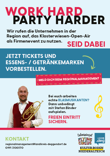 Insgesamt zum vierten Mal organisiert Till Hofmann von Eulenspiegel Concerts in Kooperation mit Kultur.Boden aus Niederalteich das Event. Und zum zweiten Mal ruft der Landkreis Deggendorf seine Firmen auf, die Plattform zu nutzen und einen schönen und kurzweiligen Abend mit den Kollegen- abseits der Arbeit- zu verbringen. "Unter dem Motto "Hart arbeiten- und genauso feiern" waren im letzten Jahr mehr als 100 Azubis der Firmen aus der Region vertreten und haben stolz ihren Ausbildungsbetrieb präsentiert. In diesem Jahr gilt das gleiche Motto: für möglichst alle Mitarbeiter!" beschreibt Landrat Bernd Sibler die Aktion.
