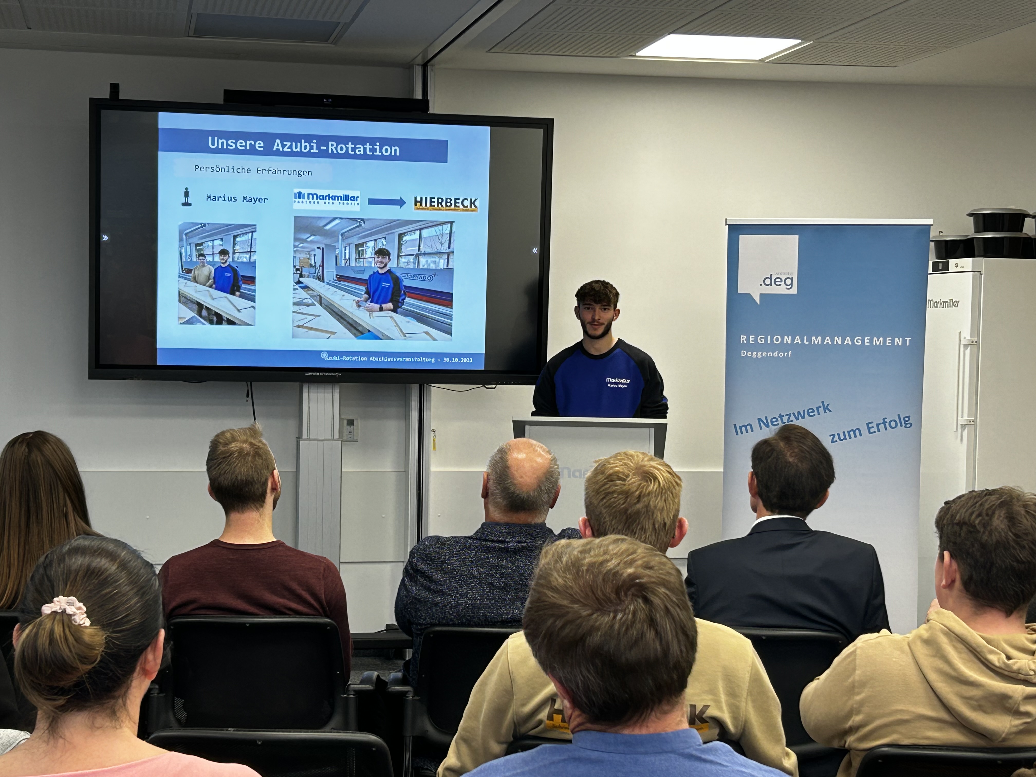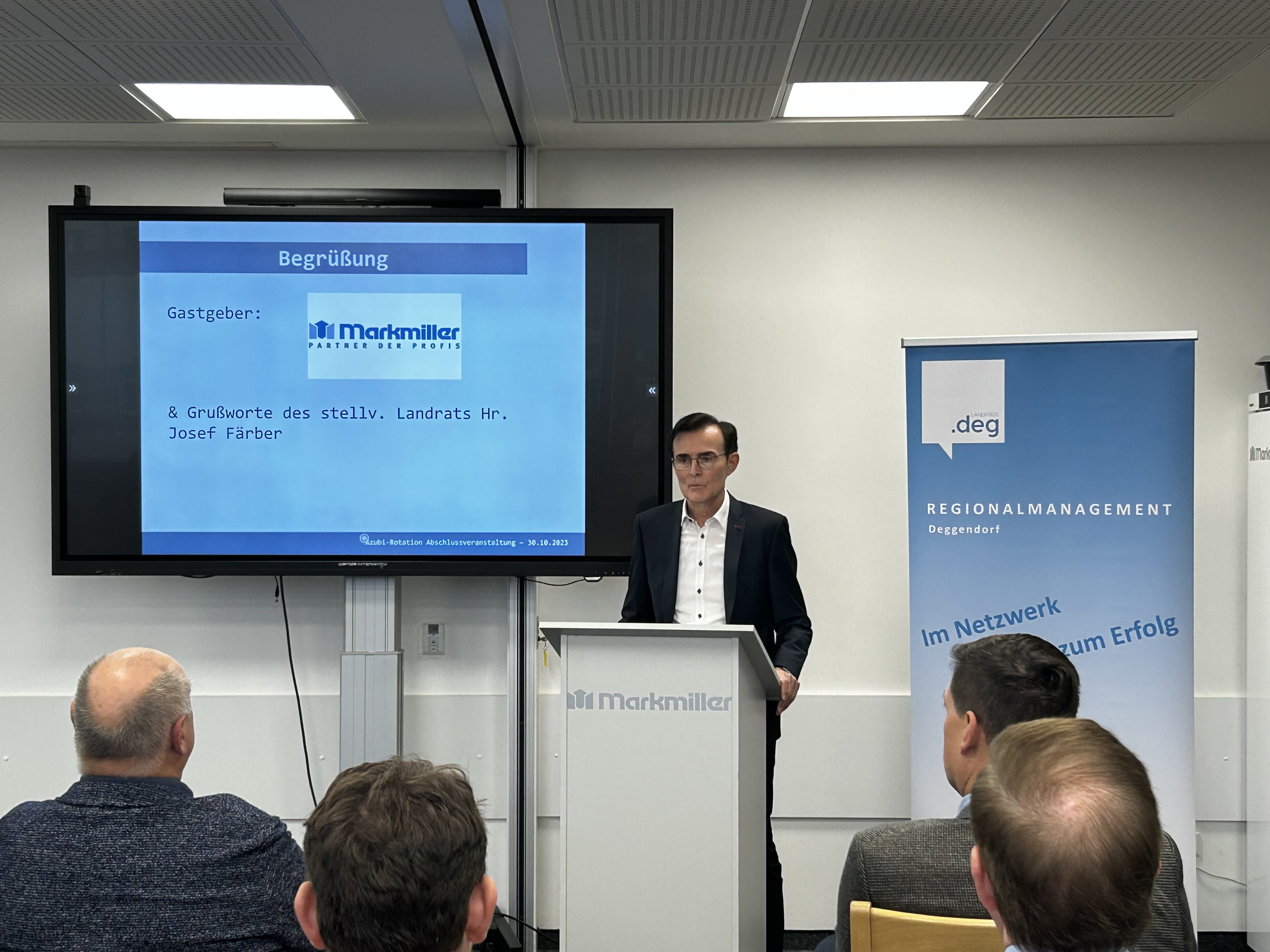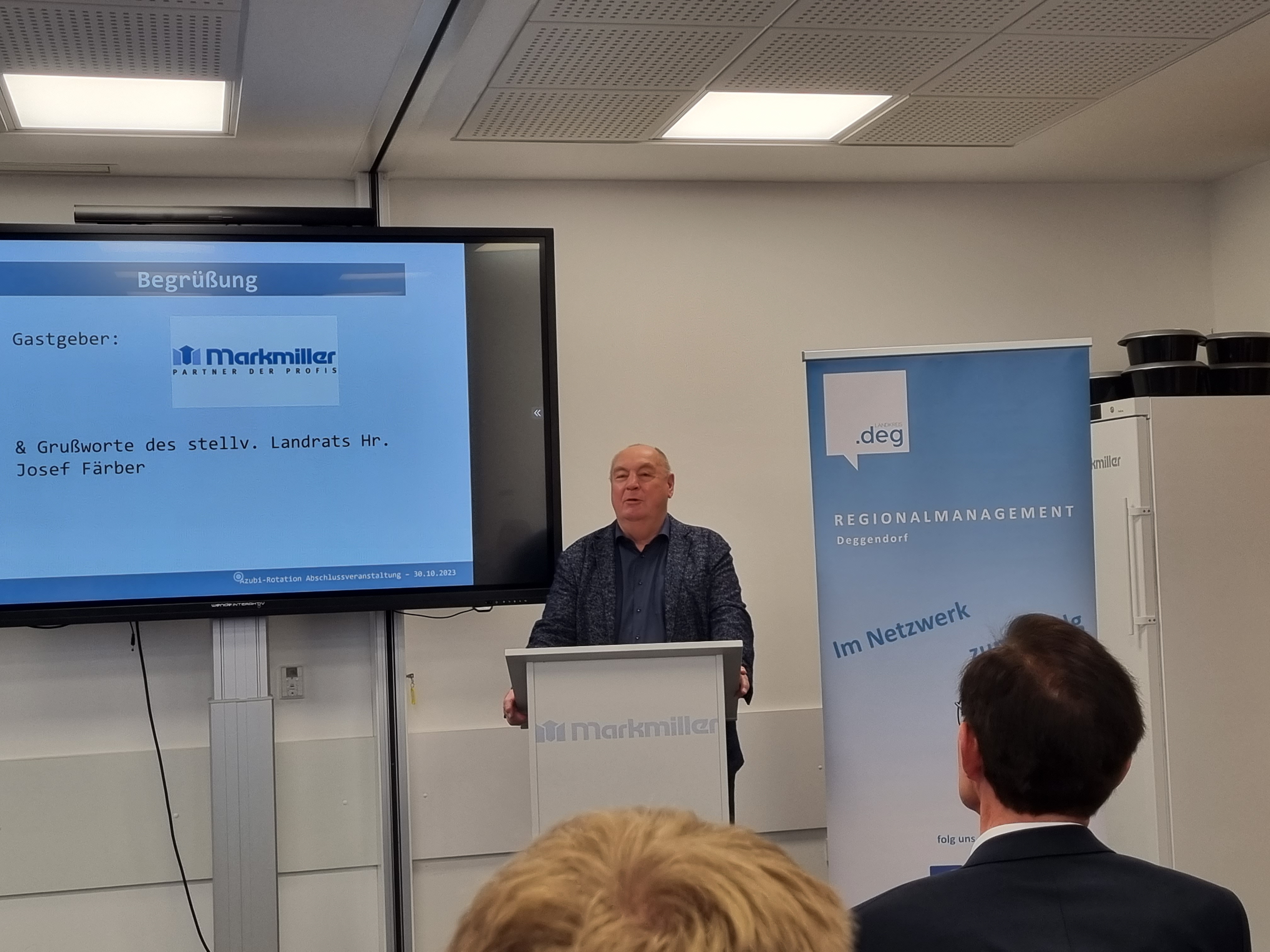 Neben Vertretern der beteiligten Betriebe und den Azubis war der stellvertretende Deggendorfer Landrat Josef Färber zu Gast. Nach den Grußworten von Herrn Tändler im Namen von Markmiller äußerte sich Färber beeindruckt über das große Engagement aller Beteiligten an dem Projekt. Ohne die Offenheit der Firmen, an der Azubi-Rotation teilzunehmen, wäre das Projekt aber erst gar nicht möglich gewesen, betonte er.