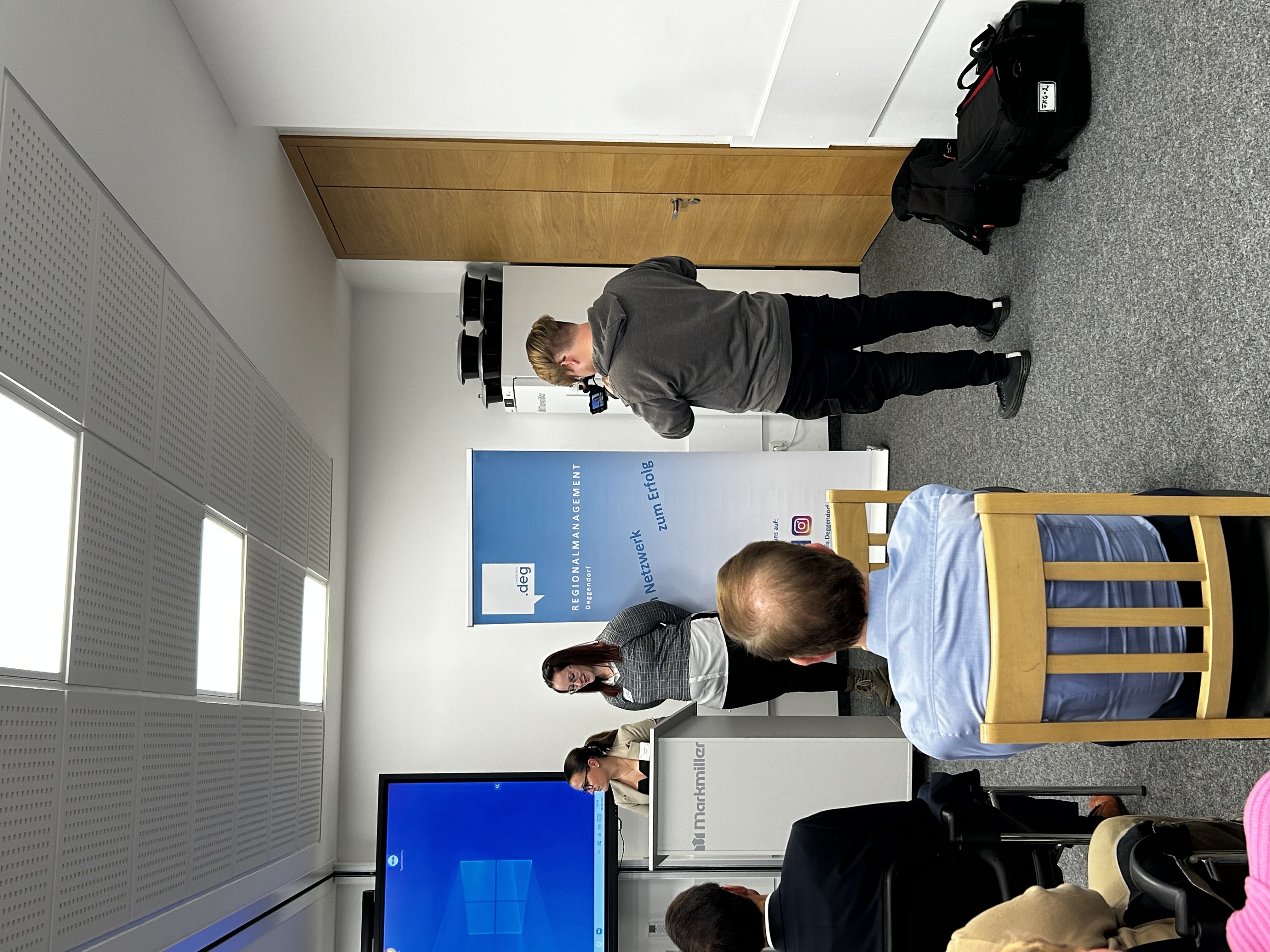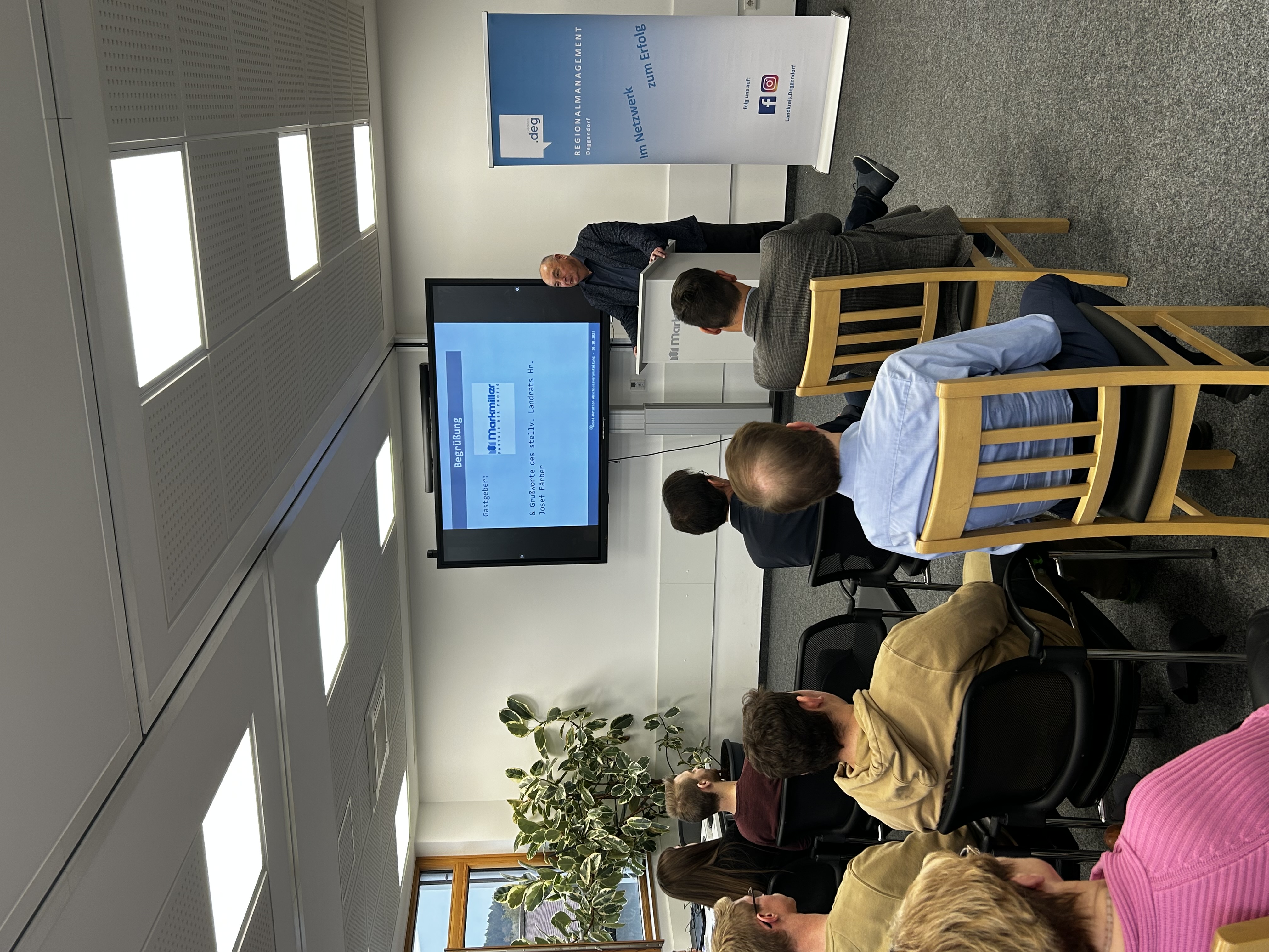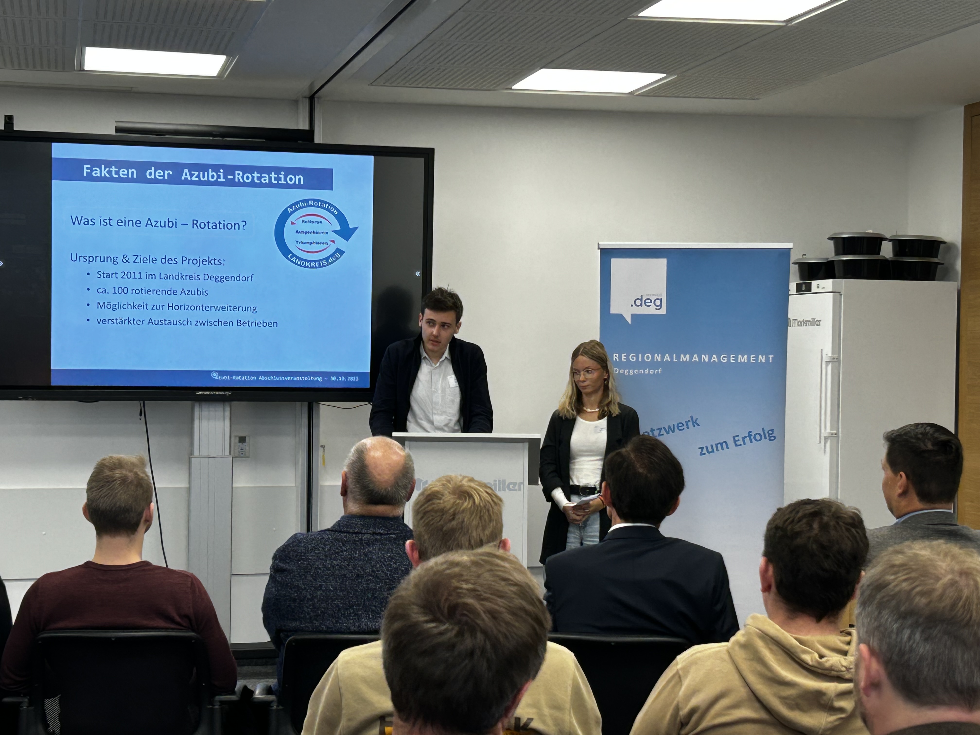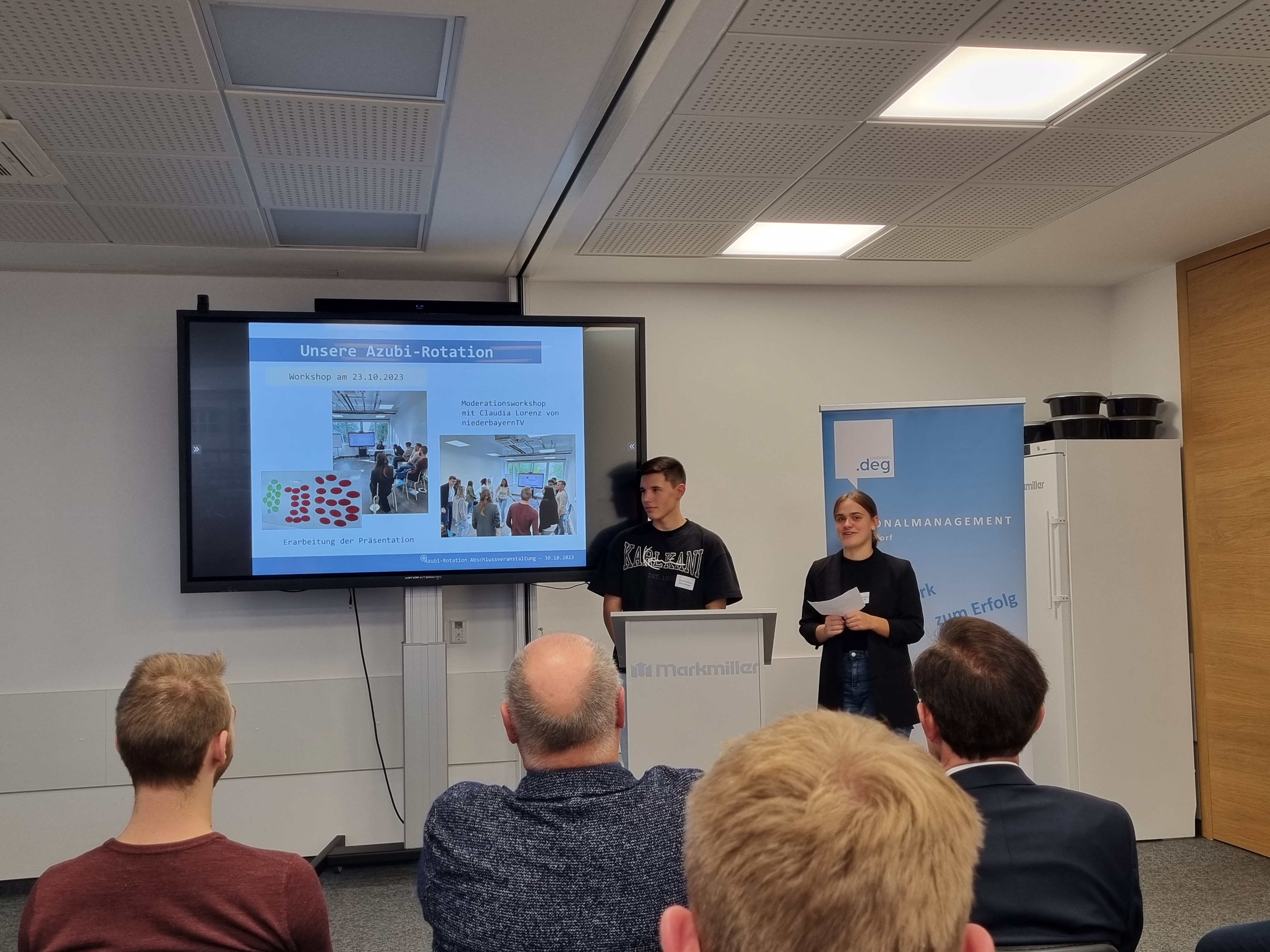 Die Präsentation der rotierten Azubis wurde von allen Anwesenden mit viel Beifall gelobt. Die Folien und ihr Aufbau haben die Azubis eine Woche zuvor in einem Workshop des Regionalmanagements am ITC I in Deggendorf gemeinsam entworfen und gestaltet. Durch die Nähe zu niederbayernTV am ITC-Campus war es für Claudia Lorenz, Moderatorin bei niederbayernTV, nur ein Katzensprung, als sie den Nachmittag mit den Azubis übernahm und mit ihnen den Auftritt und die Folienvorstellung einübte.