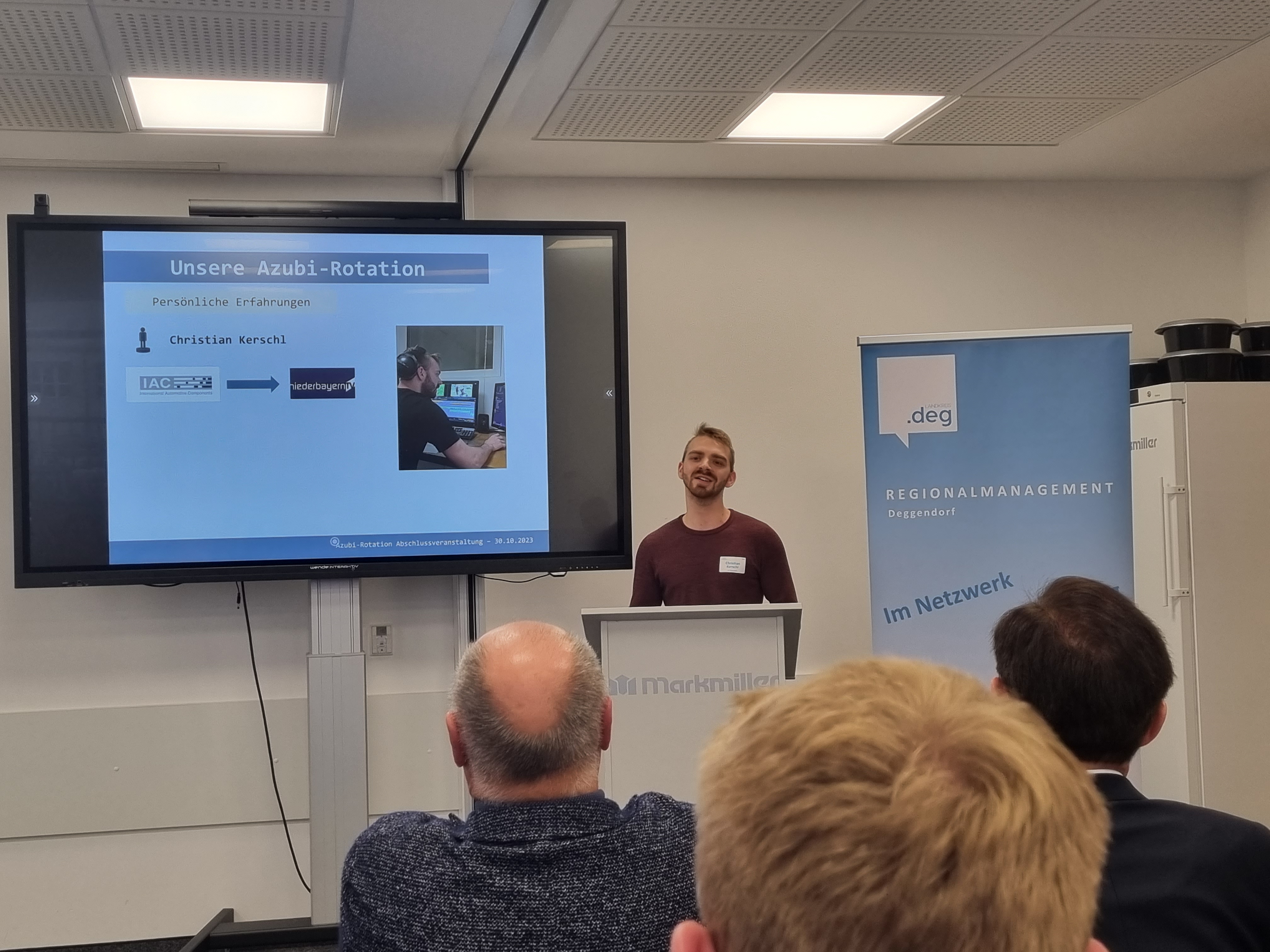 Im Mittelpunkt des Abends standen jedoch die Auszubildenden selbst und ihre Erfahrungsberichte. Sie präsentierten eindrucksvoll den Werdegang des Projekts seit seiner Gründung im Jahr 2011 bis zum Ende dieser diesjährigen Rotation. Dabei sorgte vor allem ein Videoclip von niederbayernTV für Begeisterung: Christian Duschl hatte als rotierender Azubi der IAC Group in Plattling eine Woche lang bei niederbayernTV Einblicke in deren Redaktion in Deggendorf erhalten und berichtete nun davon. Seine gesammelten Kenntnisse im Videoschnitt konnte er direkt bei Kundenanfragen nutzen, indem er die Erklärvideos passgenau auf deren Fragen zuschneiden konnte – ein echter Mehrwert für seinen Ausbildungsbetrieb.