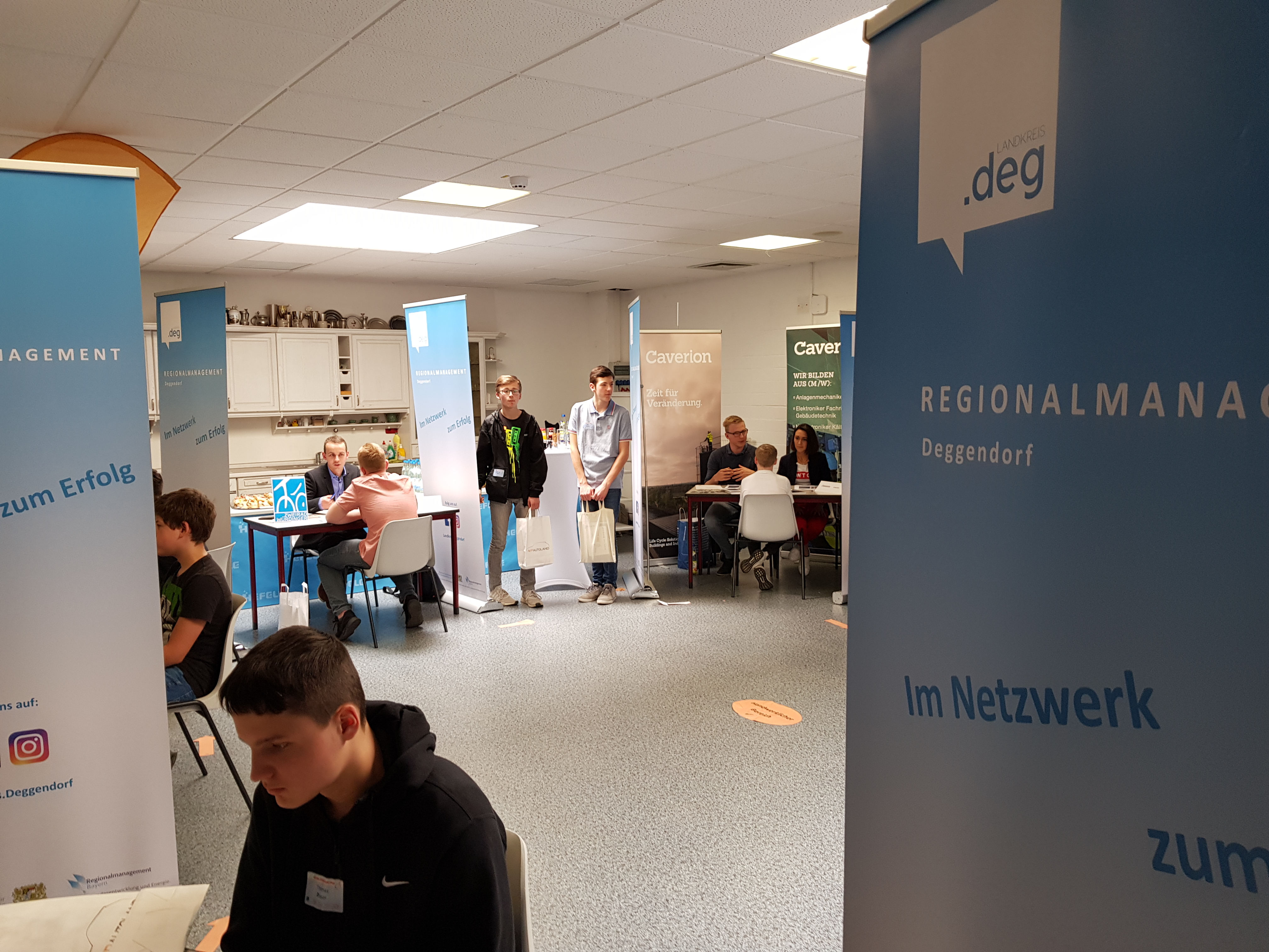 Die Firmen hatten die Möglichkeit sich und ihr Ausbildungsangebot zu präsentieren und erste Kontakte zu möglichen Azubis auszunehmen. Dies wurde rege genutzt. So waren sowohl bei den kaufmännischen Ausbildungsberufen 8 Firmen und bei den technischen und handwerklichen Ausbildungsberufen 9 Firmen am Start. Viele Schüler lernten so Firmen kennen, die sie bisher nicht auf dem Schirm hatten. So kamen plötzlich Ausbildungsberufe in Betracht, die sie vorher nicht kannten. Zur Berufsberatung stand die Agentur für Arbeit zur Verfügung. Nach ca. 1 ½ Stunden und ein paar Zusagen von Praktika später, wurde bei einem Buffet die Aktion nochmal besprochen- wobei es von allen Seiten viel positives Feedback gab.