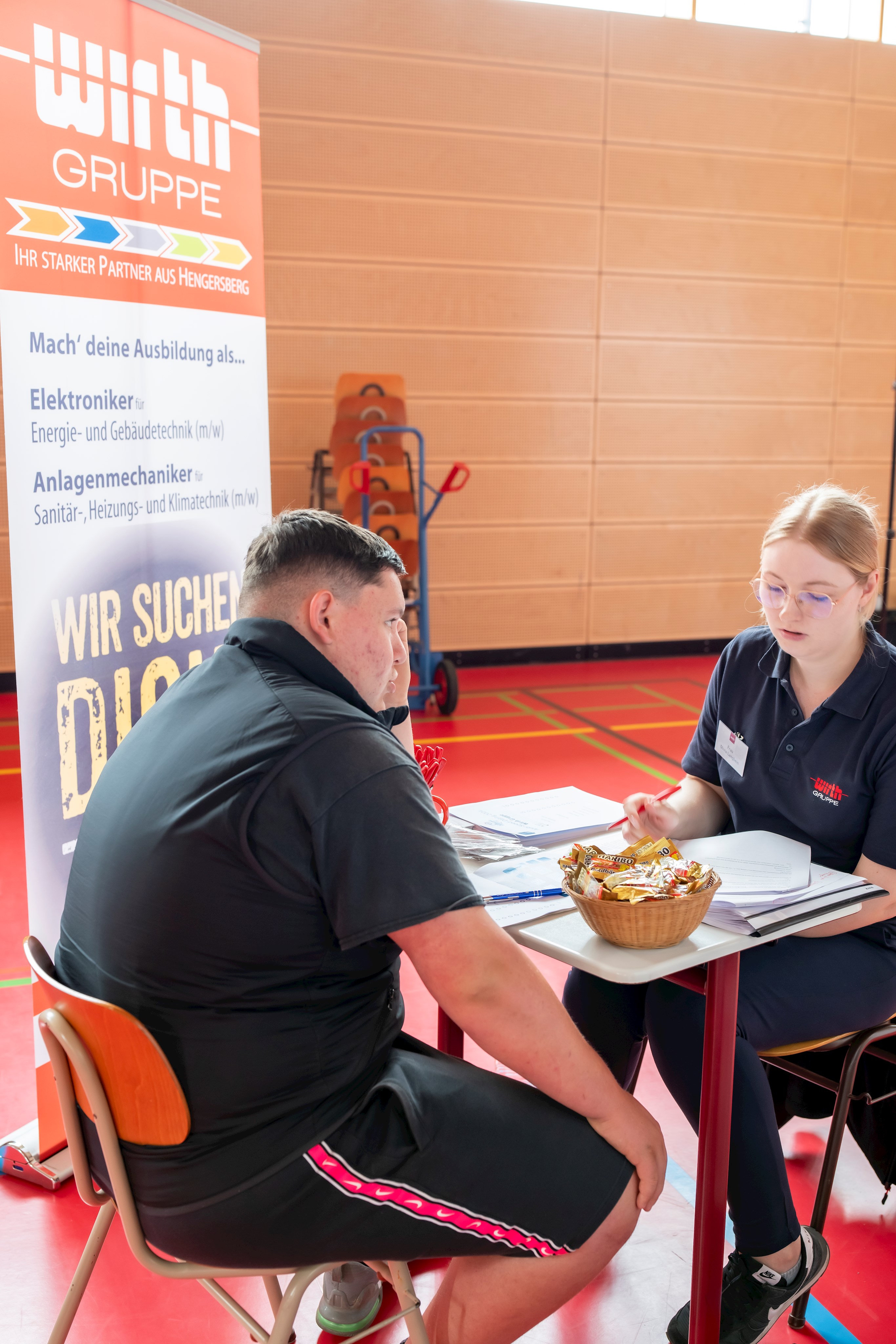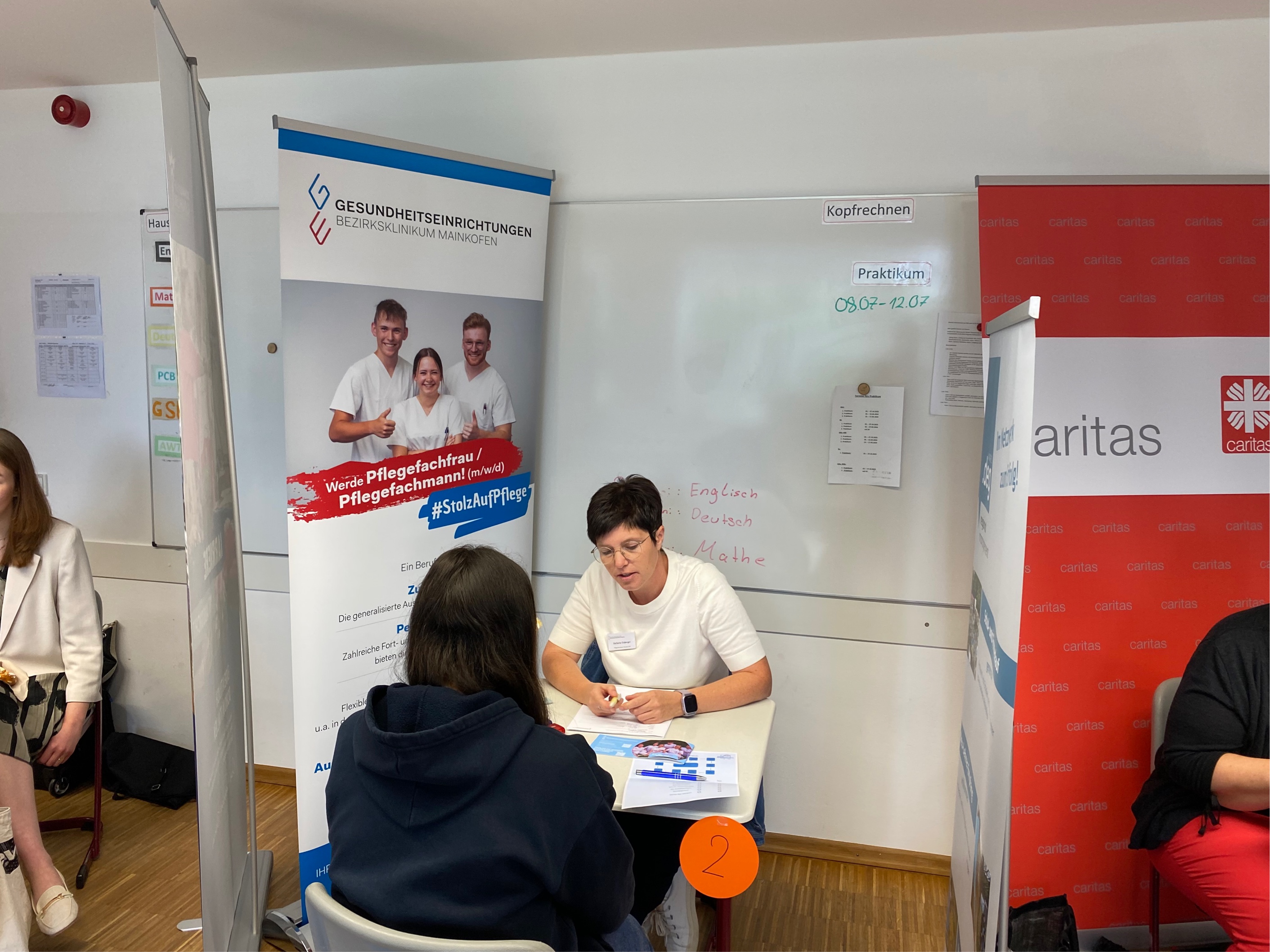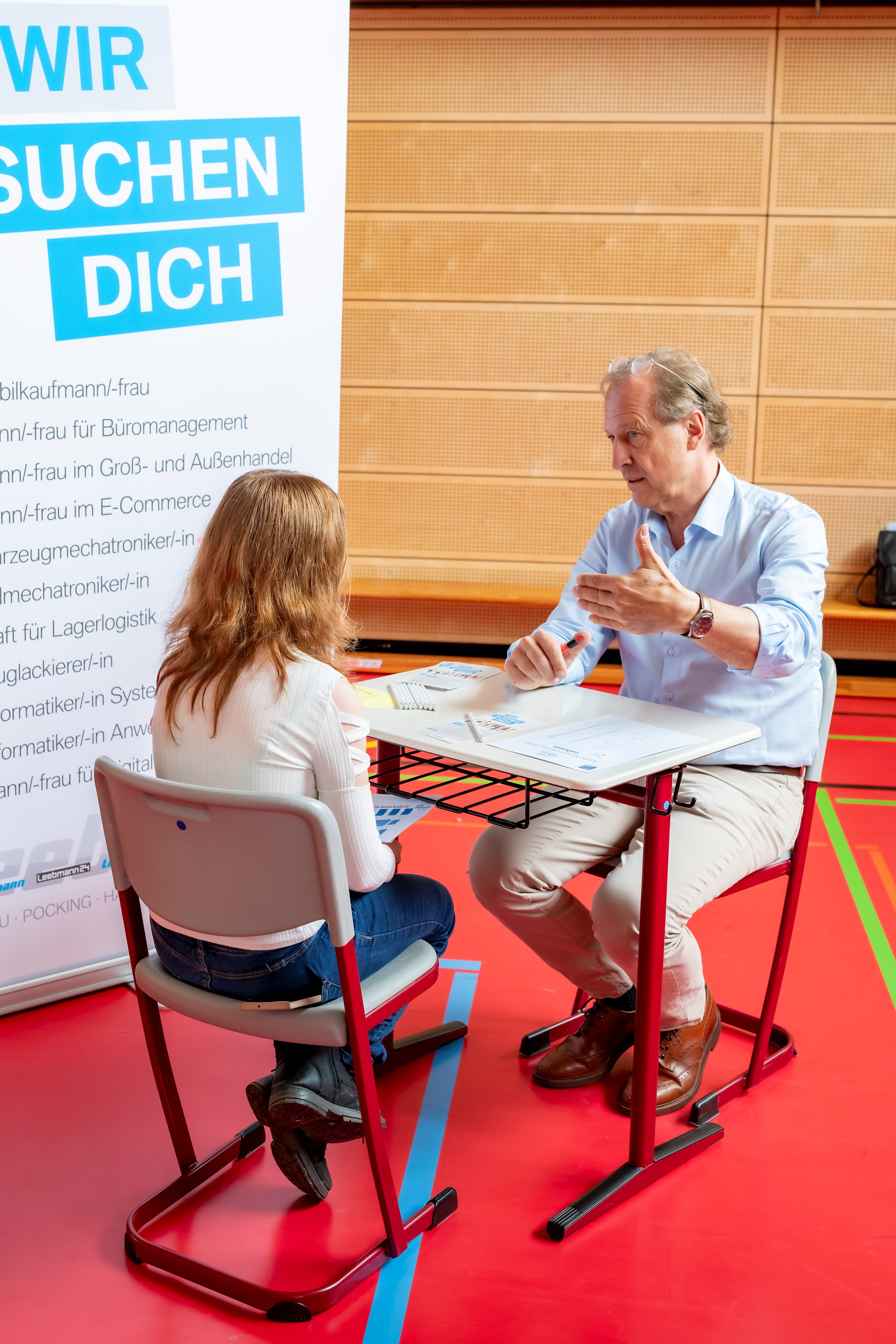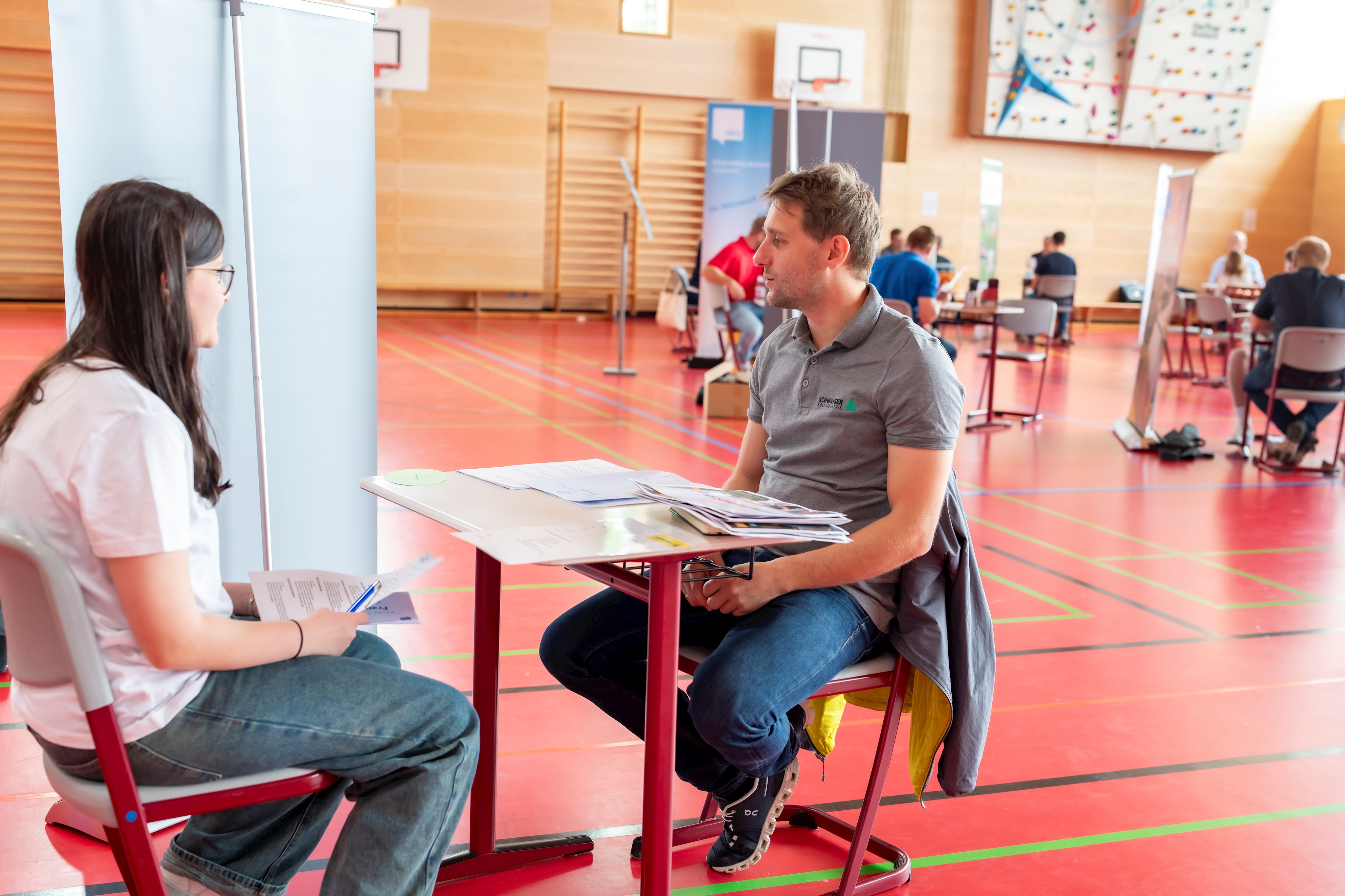 Erstmals fand am 4. Juli 2024 ein „Azubi-Speed-Dating“ an der Mittelschule Hengersberg statt. Insgesamt 67 Schüler der Vorabschlussklassen hatten die Möglichkeit, sich in 8-Minuten-Gesprächen aus den 64 Ständen ihre Wunsch-Ausbildungs-Firma auszusuchen.