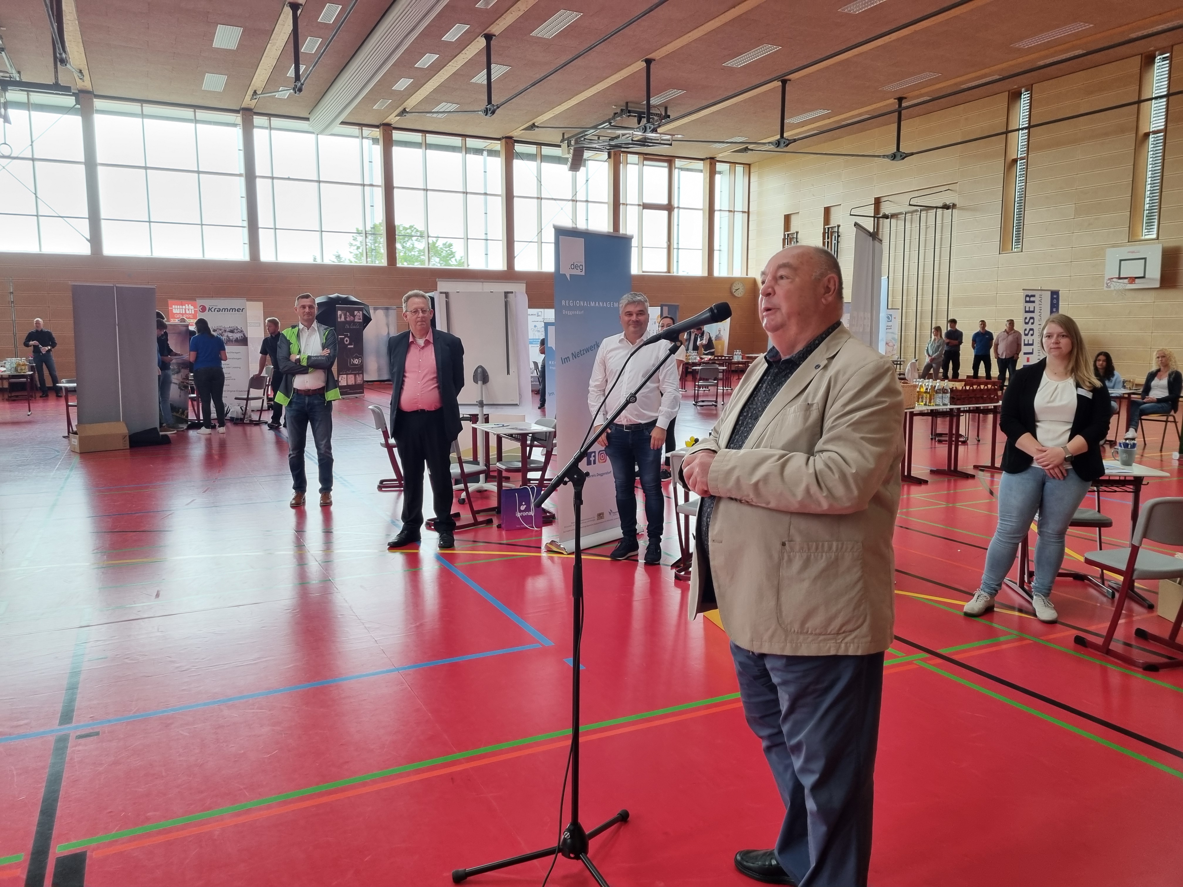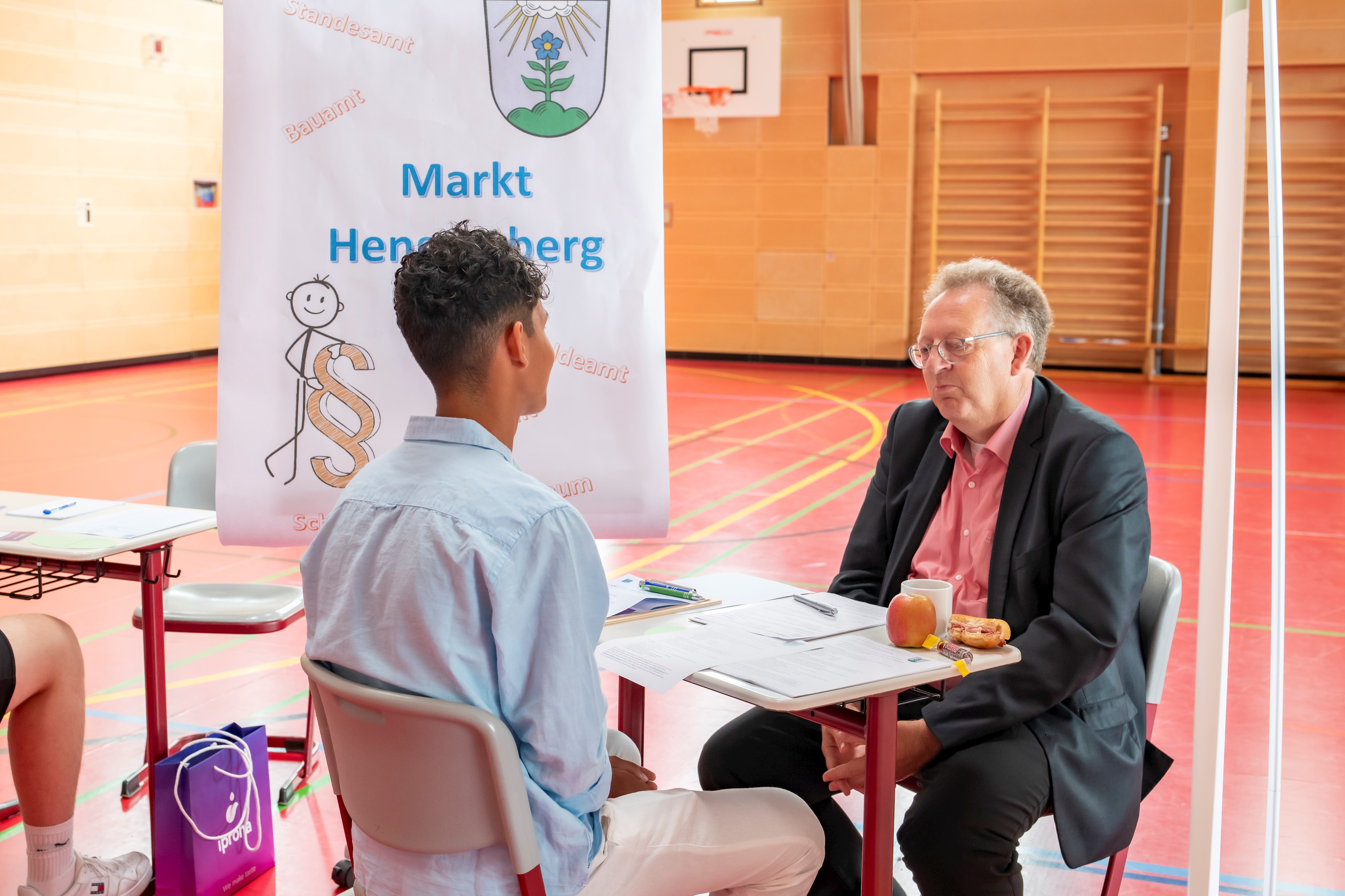Schon bei der Begrüßung zeigte Schulleiter Günter Geiger große Vorfreude auf das, was da kommt: „Die Kinder wurden im Unterricht gut vorbereitet. Sie sind für ihr erstes Vorstellungsgespräch sicher bestens gewappnet. Das ist ein großer Gewinn für sie.“ Dies freute auch Stv. Landrat Josef Färber, der den Jugendlichen vor allem einen Rat mit auf den Weg gab: „Nutzt diese Chance, in wenigen Stunden mit so vielen Ausbildungsfirmen in Kontakt treten zu können. Bleibt Euch bei den Gesprächen treu- ihr müsst Euch nicht verstellen. Ihr seid alle gut und bei den Firmen begehrt.“ Darauf verwies in seiner Begrüßung auch Bürgermeister Christian Mayer, der als Vertreter des Marktes auch gleich selbst eine Station bediente.