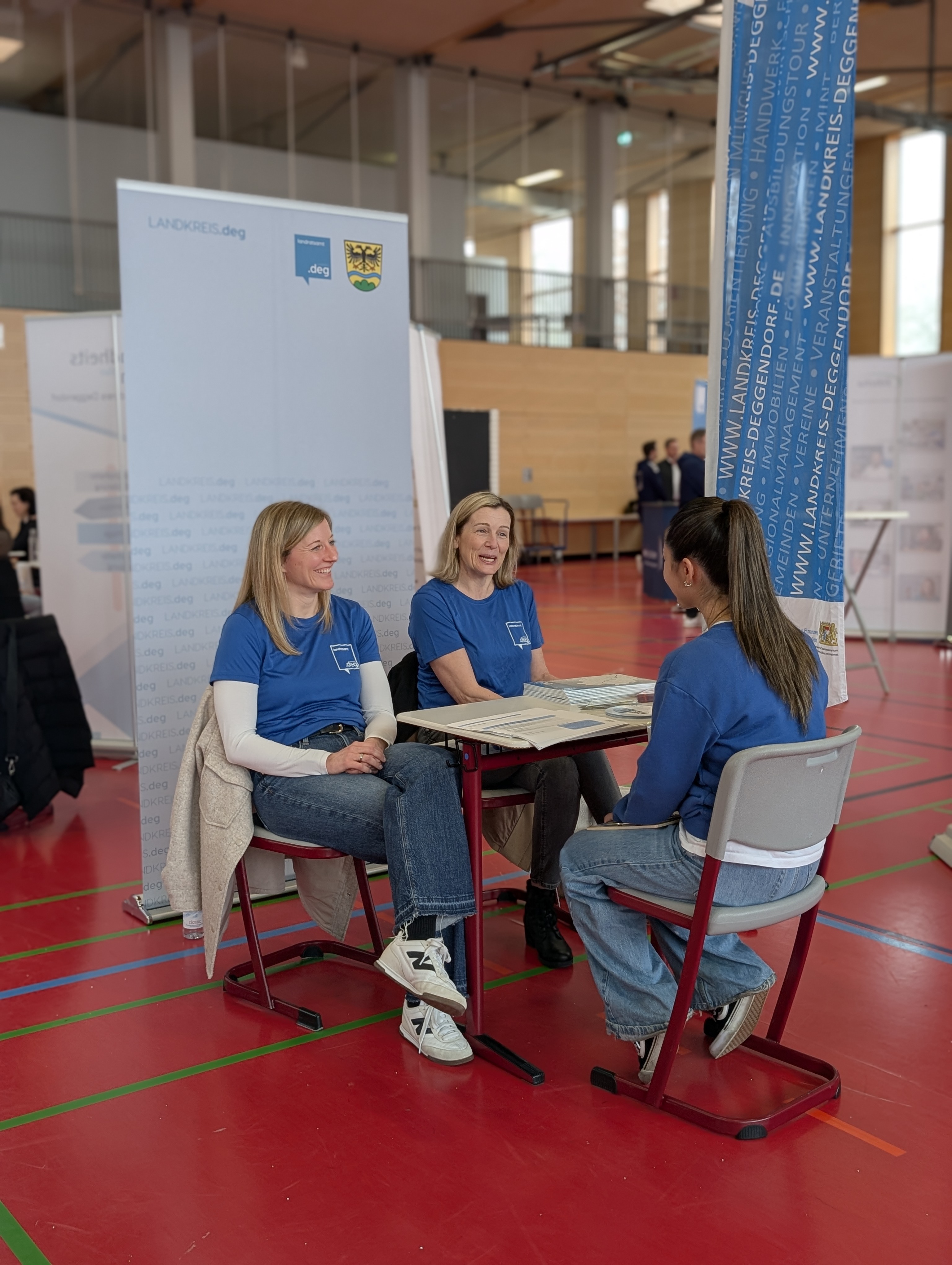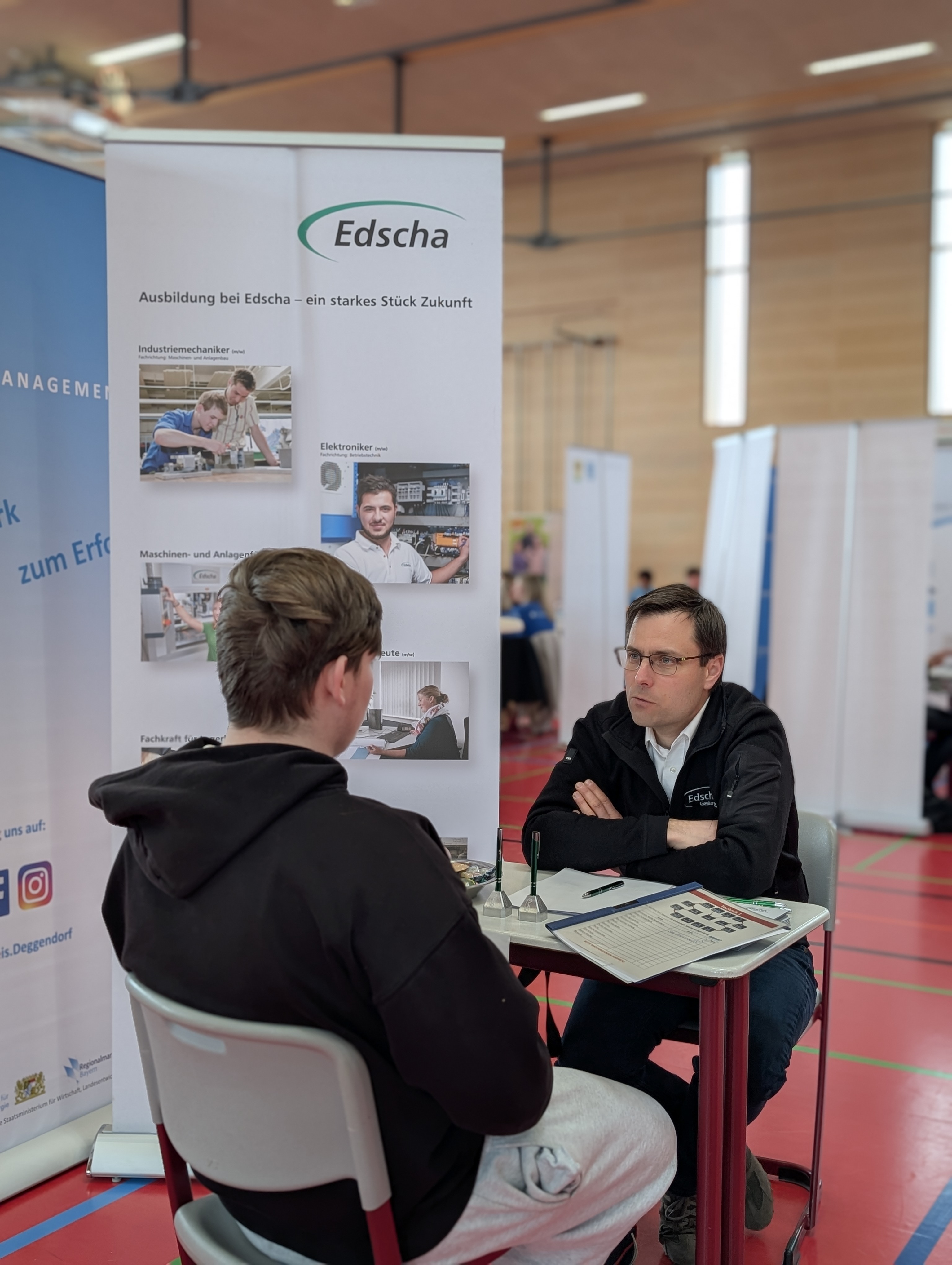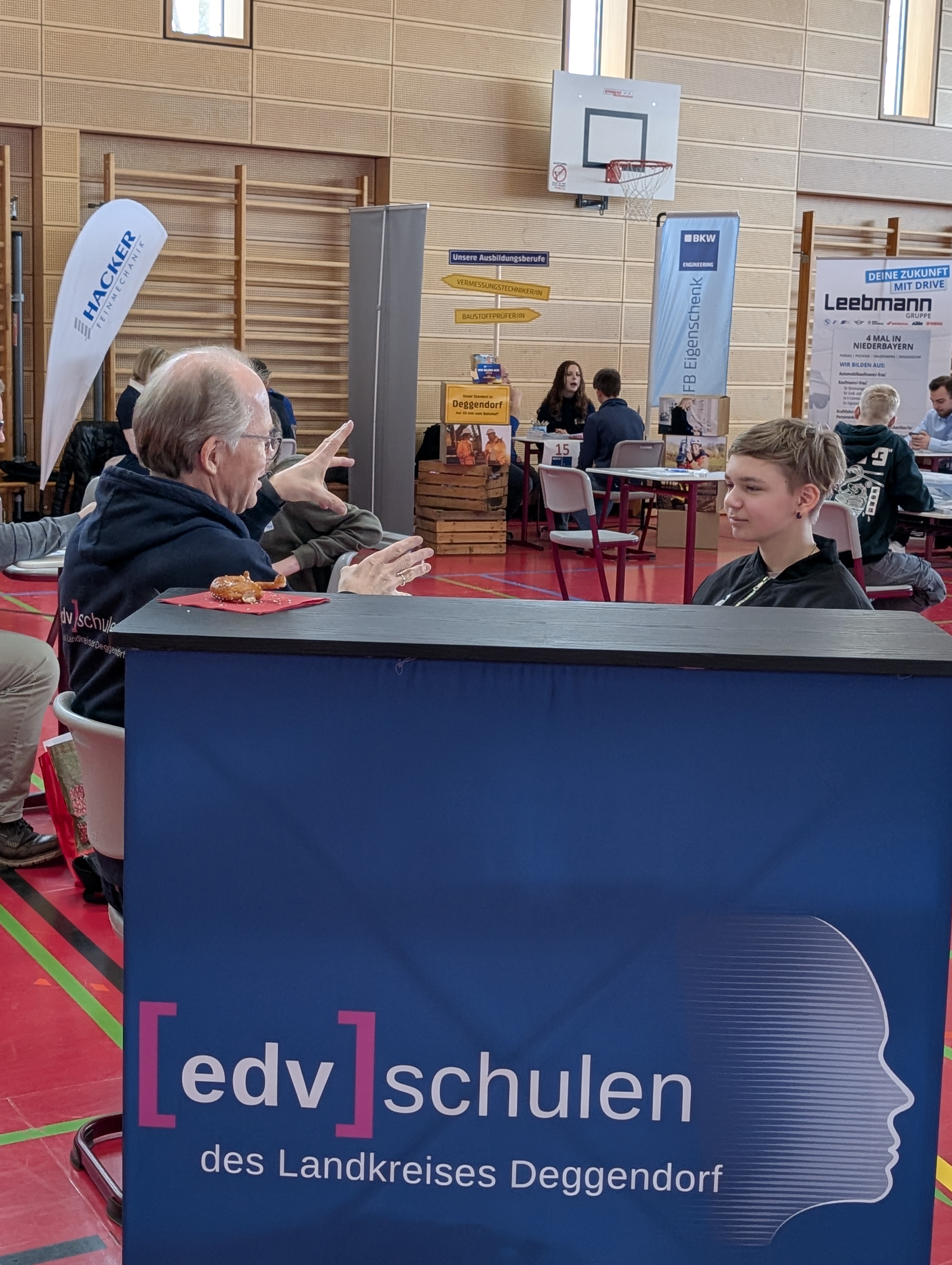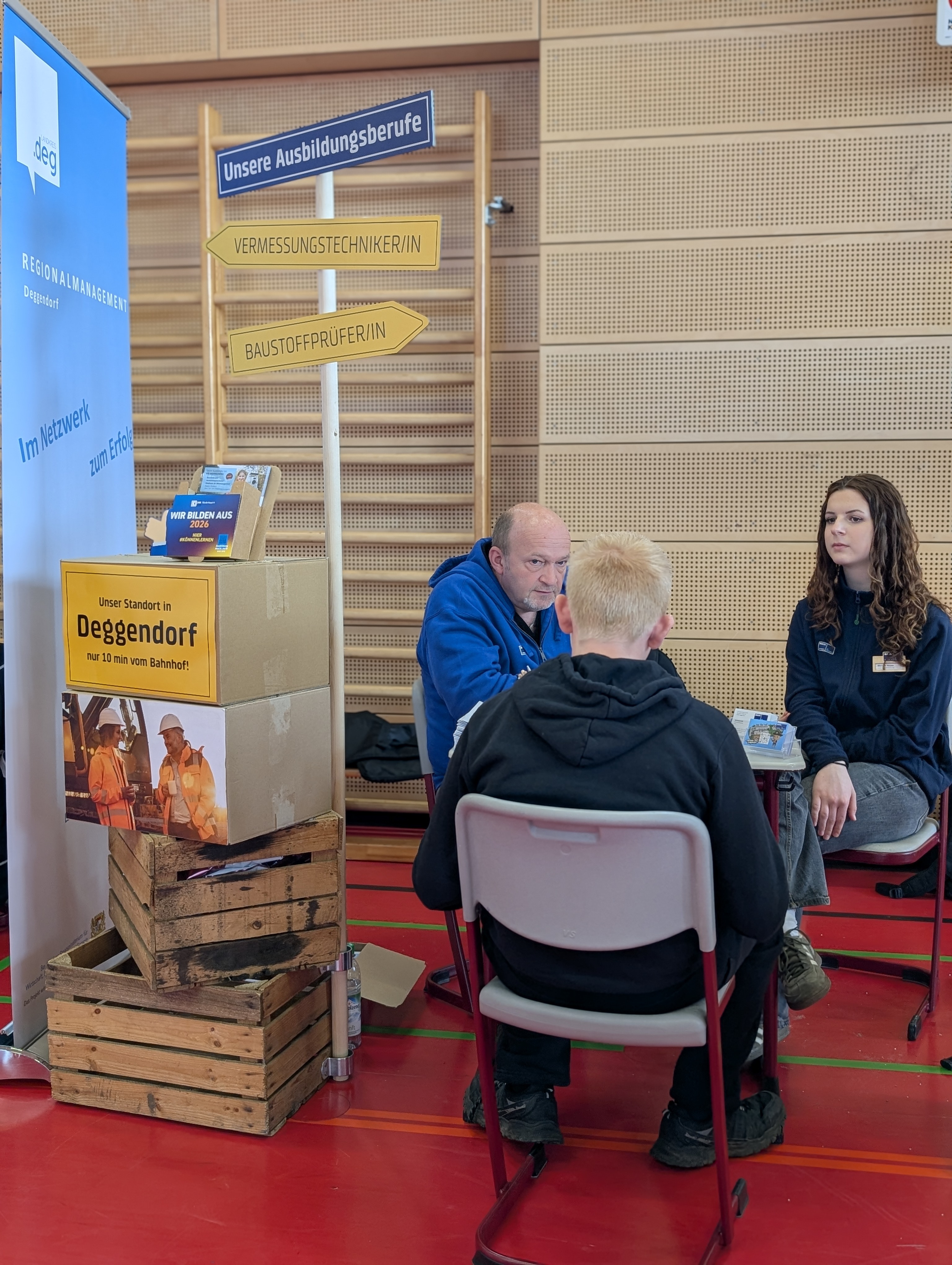 Die Mittelschule Hengersberg unterstützte die Organisation des Tages mit großem Engagement. Schülerinnen und Schüler halfen beim Auf- und Abbau der Stände und kümmerten sich um die Verpflegung der teilnehmenden Betriebe. Bereits im Vorfeld wurden die Jugendlichen durch das Regionalmanagement intensiv auf die Gespräche vorbereitet. Dabei standen Themen wie Auftreten, Gesprächsführung und gezielte Fragestellungen im Mittelpunkt. Während viele zu Beginn noch etwas zurückhaltend waren, gewannen sie im Laufe des Vormittags zunehmend an Sicherheit und Selbstbewusstsein.