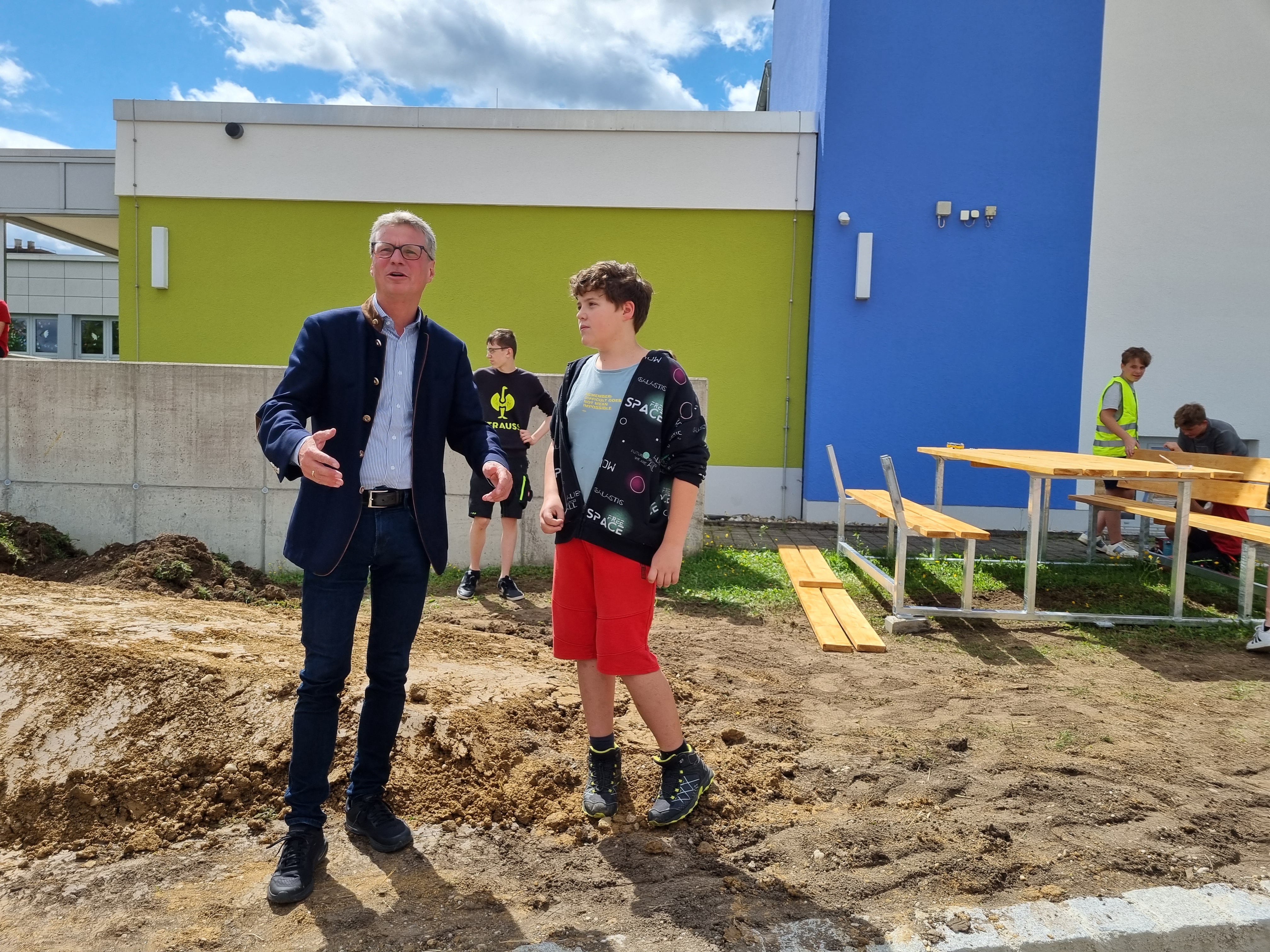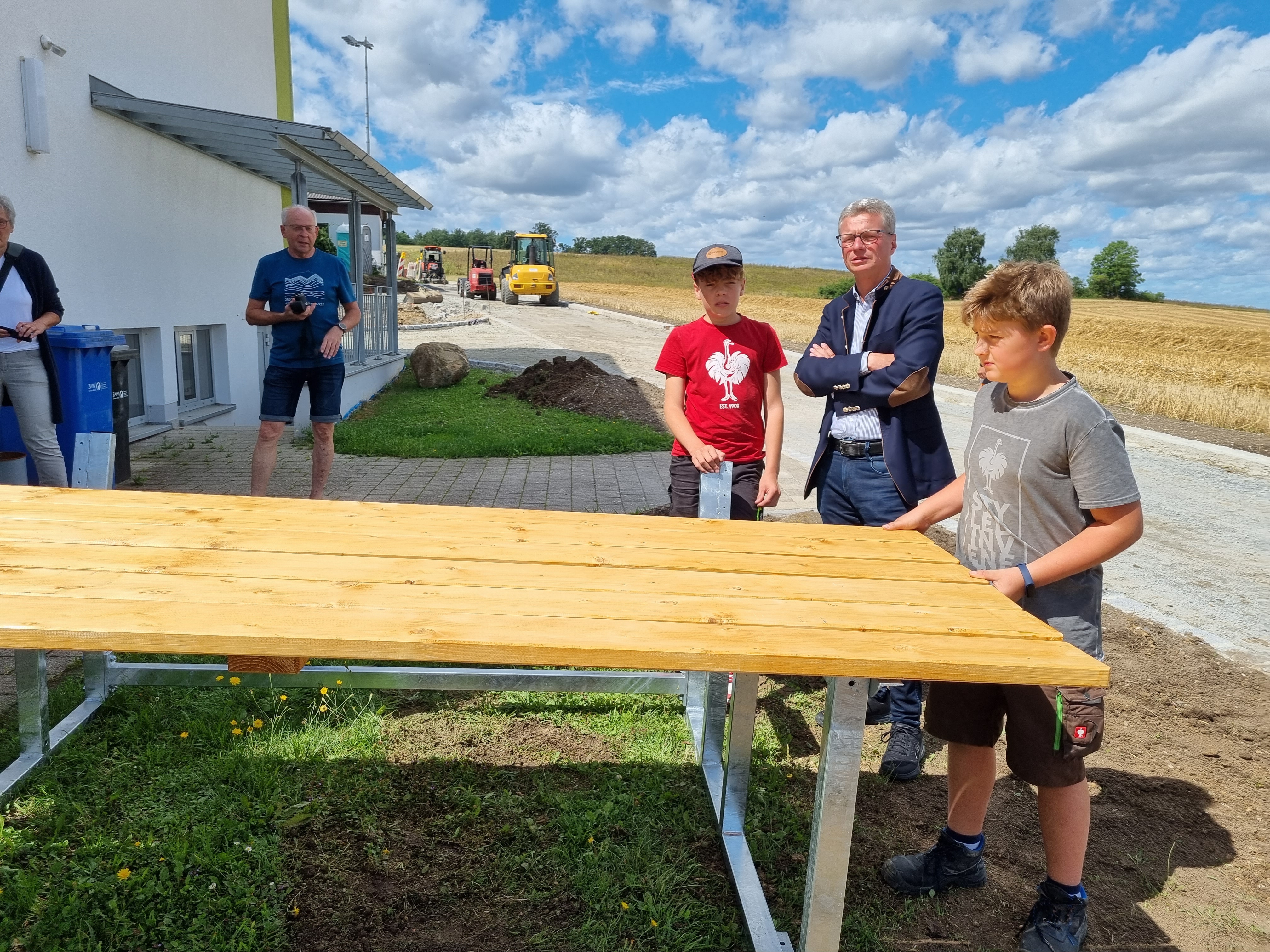 Am dritten Tag war`s dann so weit: gegen Mittag wurde unter Beobachtung mehrerer Ehrengäste die Bank samt Tisch fertiggestellt und am vom Bürgermeister gewünschten Ort platziert. Sowohl Bürgermeister Eigner als auch Landrat Bernd Sibler sowie Christiane Niedermeier als Vertreterin des Arbeitskreises SchuleWirtschaft Deggendorf und Aline Preußler vom Kreisjugendring betonten in ihren kurzen Ansprachen die tolle Zusammenarbeit vieler Partner bei der Organisation. Vor allem aber bekamen die Teilnehmer ein großes Lob für ihr Engagement und die Zusammenarbeit in den Gruppen.