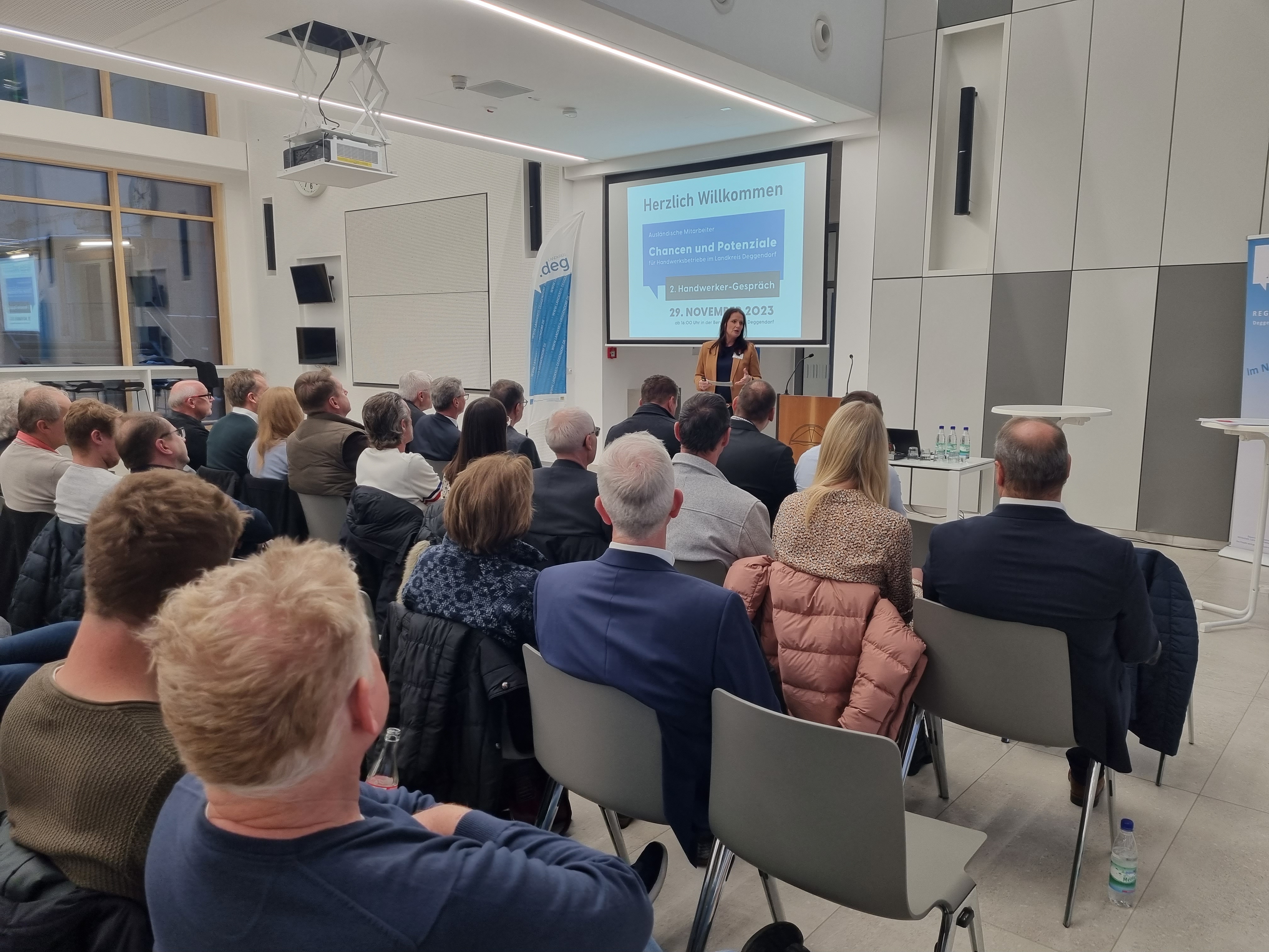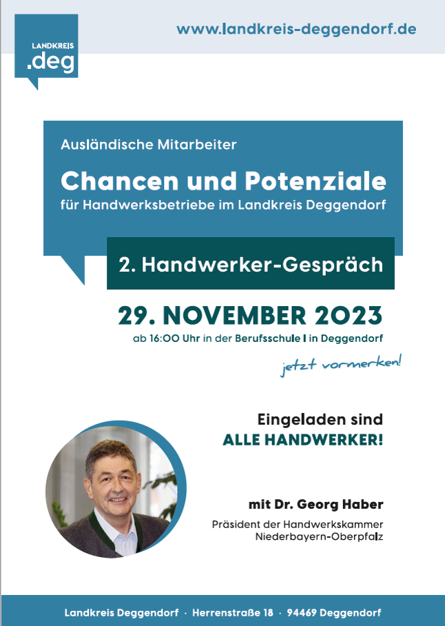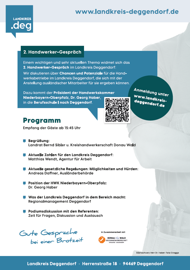 „Uns ist der Austausch sehr wichtig- damit können wir die Wege kurzhalten und effizienter arbeiten. Das Handwerker-Gespräch ist eine dieser Austauschplattformen. Und das Thema ausländische Mitarbeiter beschäftigt unsere Gesellschaft und auch die Handwerker aktuell sehr stark“, betont Landrat Bernd Sibler bei der Begrüßung. Zu dem Thema durfte der Landrat neben Franz Niemeier als Vertreter der Kreishandwerkerschaft Donau-Wald, Matthias Wendt von der Agentur für Arbeit Deggendorf und Andreas Daffner von der Ausländerbehörde als ganz besonderen Gast den Präsidenten der Handwerkskammer Niederbayern-Oberpfalz, Dr. Georg Haber, begrüßen. Durch die Veranstaltung führte als Moderatorin Simone Heigl.