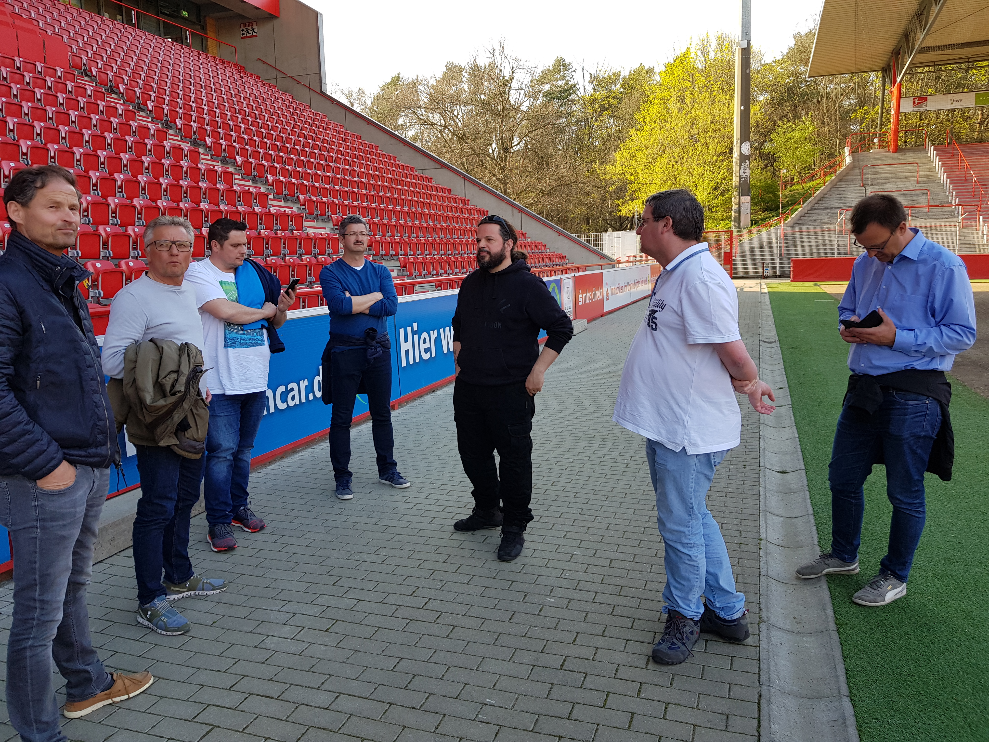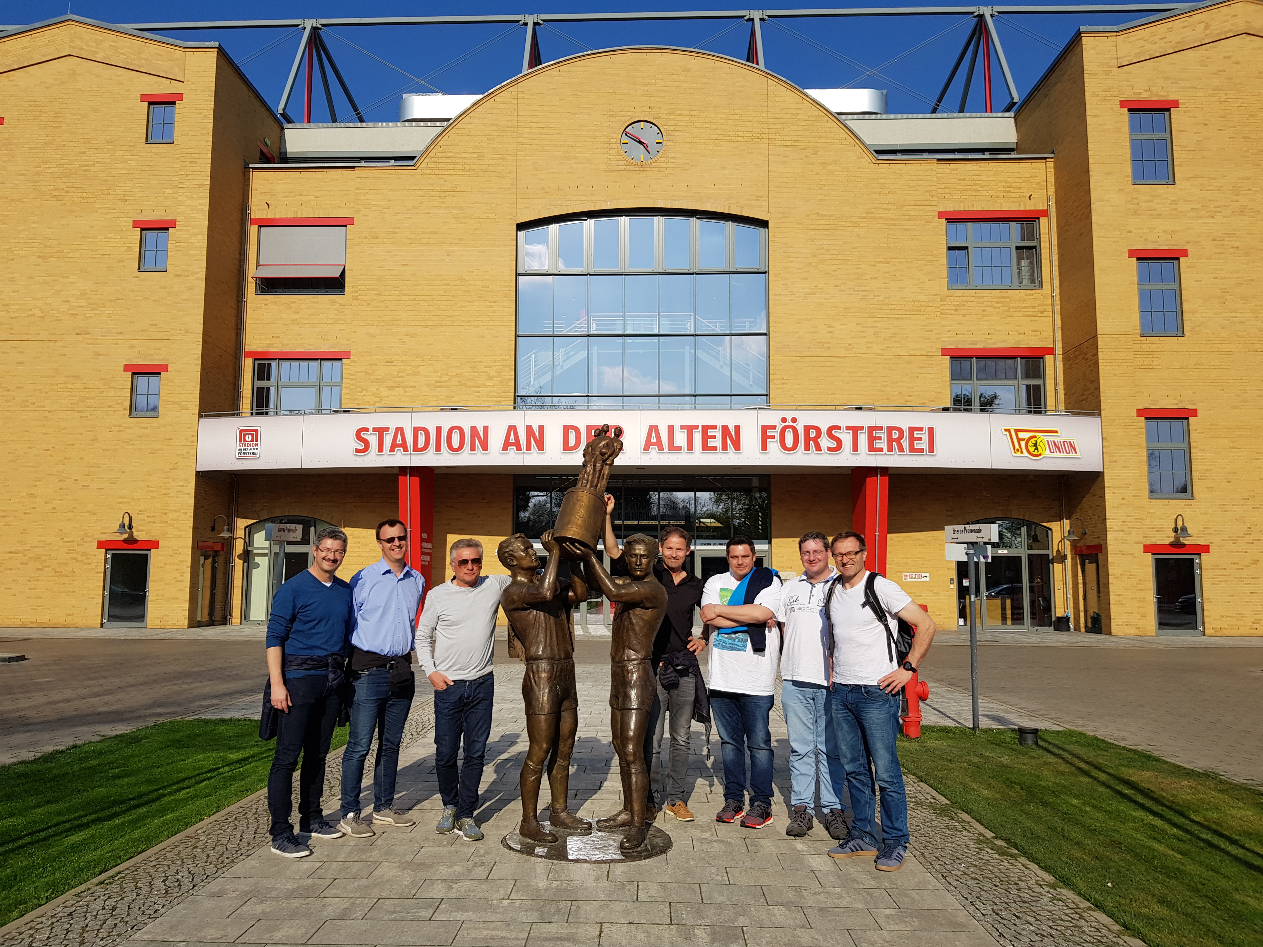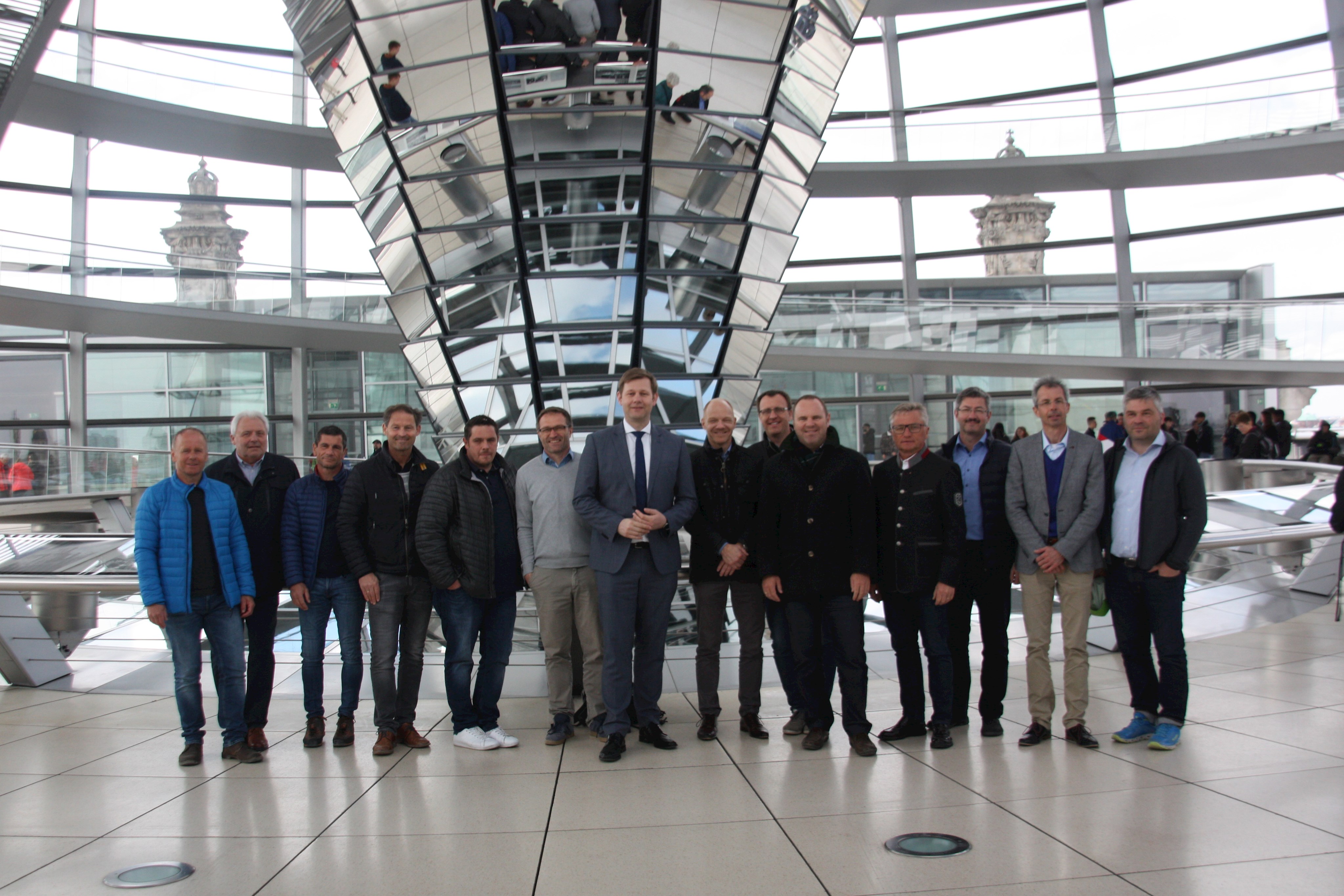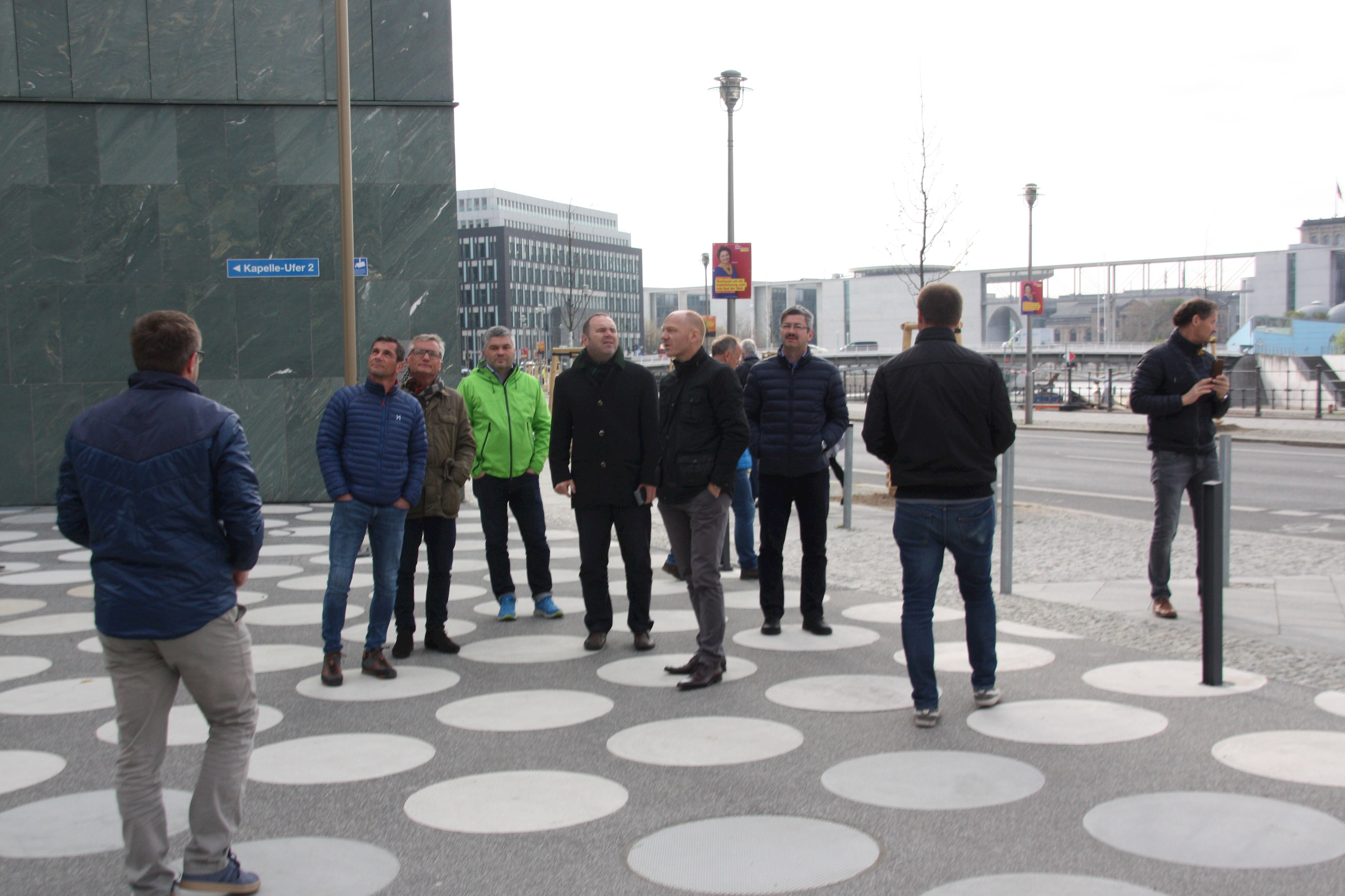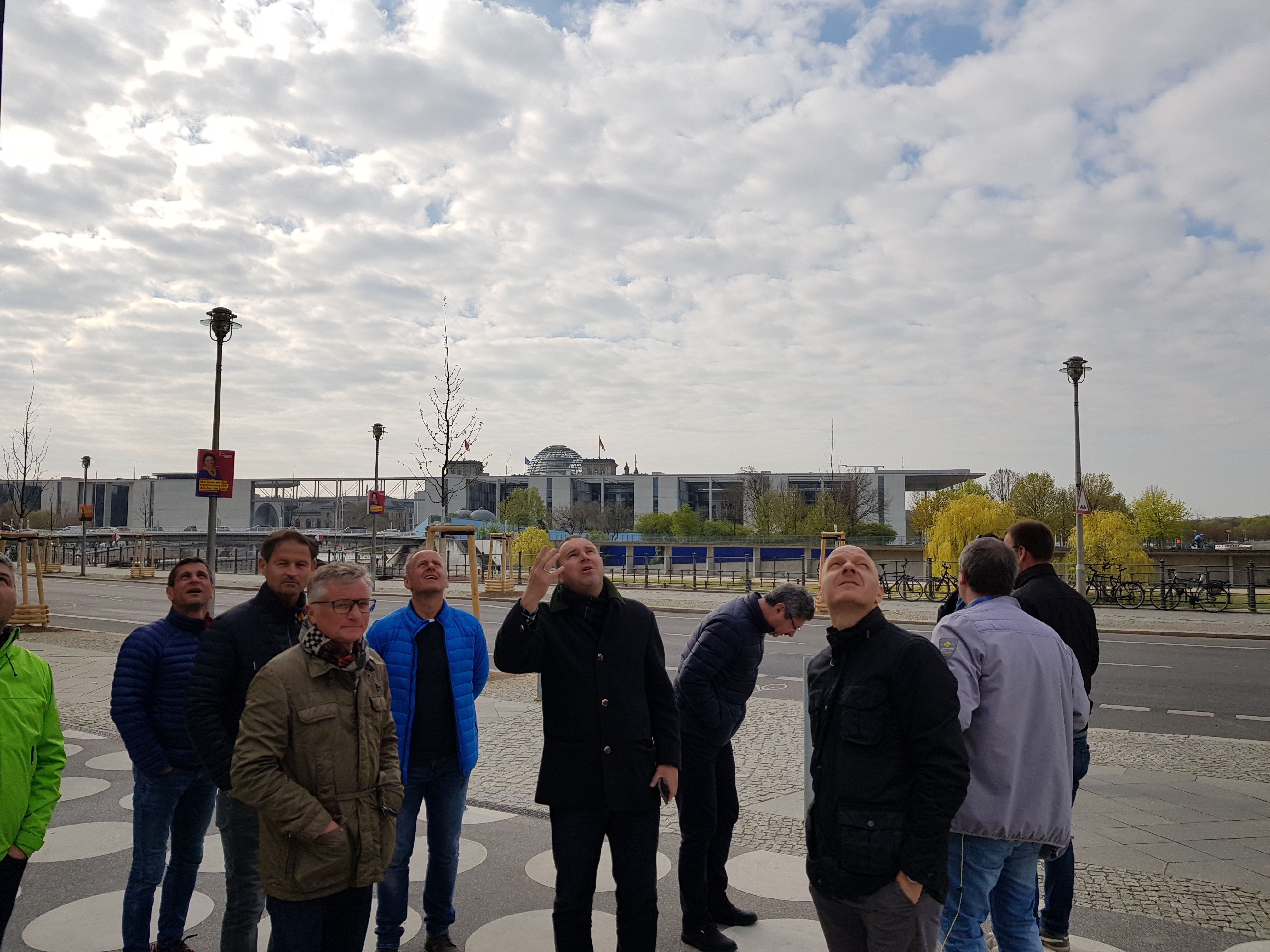 Das Landkreis-Team konnte beim Auswärtsspiel insgesamt auf 16 Unternehmer, Politiker und Leute aus der Verwaltung zurückgreifen. Abgerundet wurde der Trip nach Berlin mit einer Besichtigung der „Alten Försterei“ (der Spielstätte von Union Berlin) und einer Führung durch den Reichstag. Dort konnte das Team bei der Fragestunde an die Kanzlerin teilnehmen und tolle Eindrücke gewinnen. Zudem stand die Besichtigung einer Baustelle im Zentrum von Berlin auf dem Programm: die Firma STREICHER saniert direkt gegenüber dem Reichstag das Ufer des Humboldt-Hafens. Eine Baustelle, die durch mehrere Faktoren beeinflusst wird: so laufen über dem Humboldt-Hafen beispielsweise die Gleise des Hauptbahnhofs, was die Arbeitshöhe und die Auswahl der Baumaschinen ziemlich einschränkt und für die Arbeiter eine echte Herausforderung darstellt.