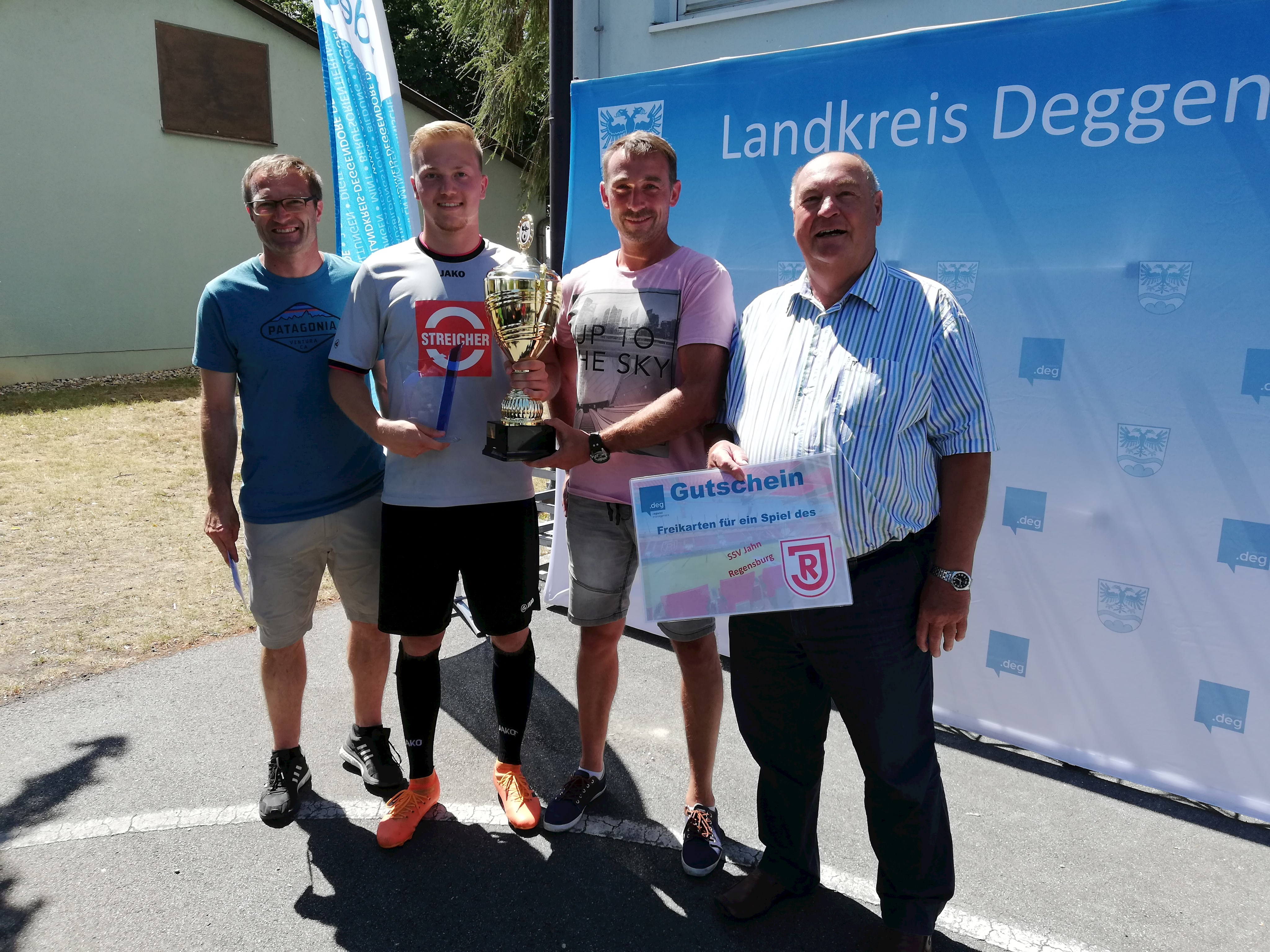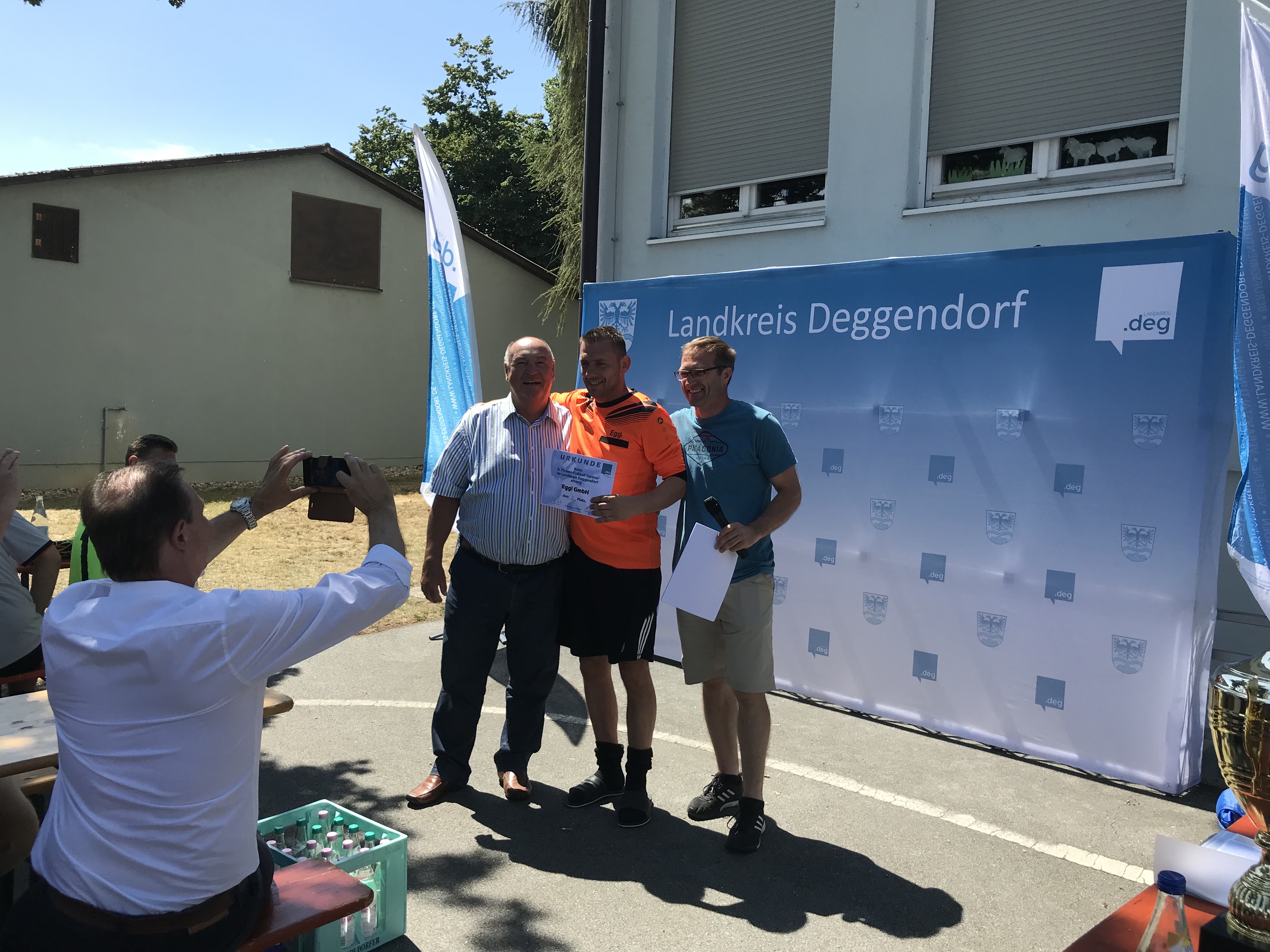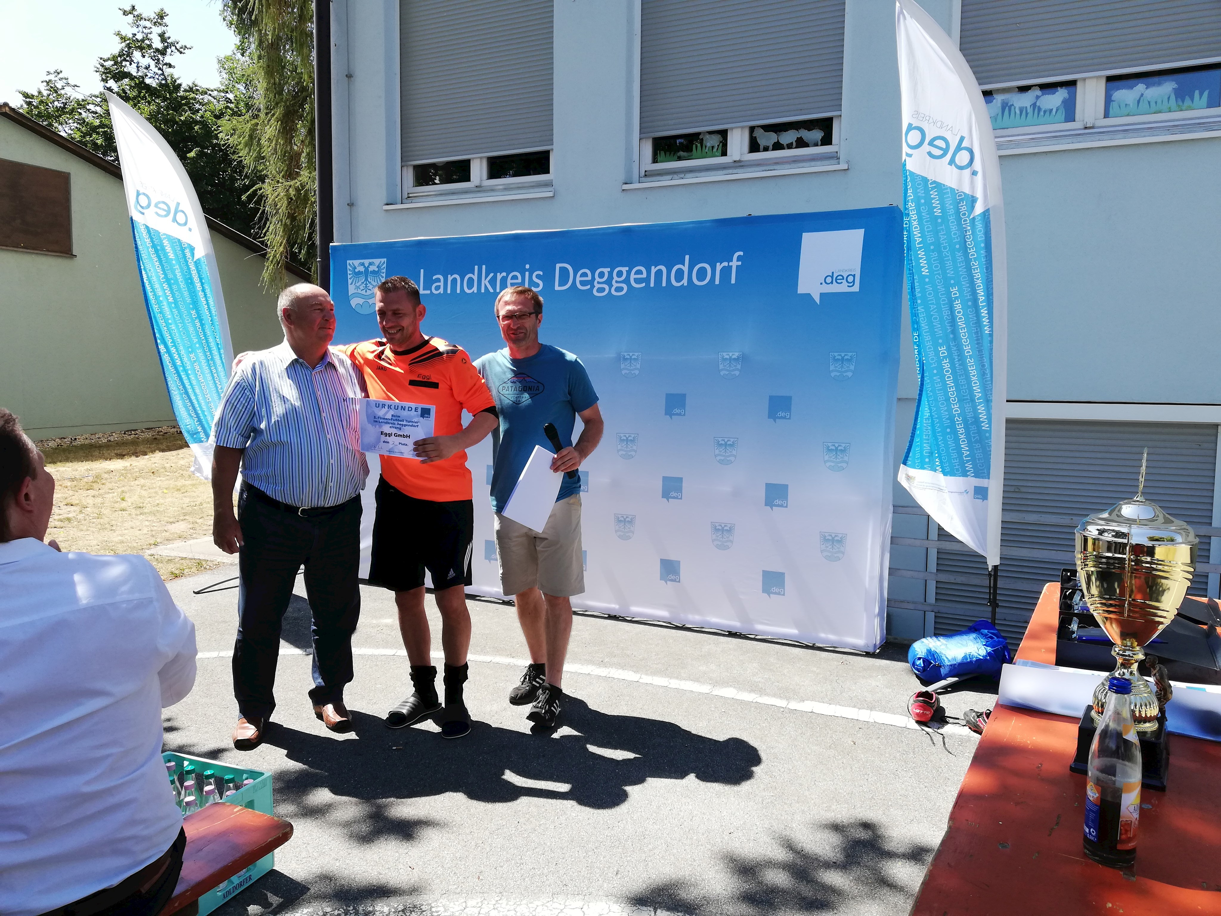 Bei der anschließenden Preisübergabe erhielt jeder Teilnehmer eine Urkunde. Der Zweitplatzierte, die Firma Zitec, erhielt zudem einen Gutschein zum Besuch eines Heimspiels des klassenhöchsten Vereins in Niederbayern, dem SV Schalding-Heining. Der neue Meister erhielt aus den Händen des Vorgängers den goldenen Wanderpokal- mit der Ankündigung, dass sich Dobler den im nächsten Jahr wieder holen wird. Zudem gab´s für den Sieger Eintrittskarten für ein Spiel des SSV Jahn Regensburg.