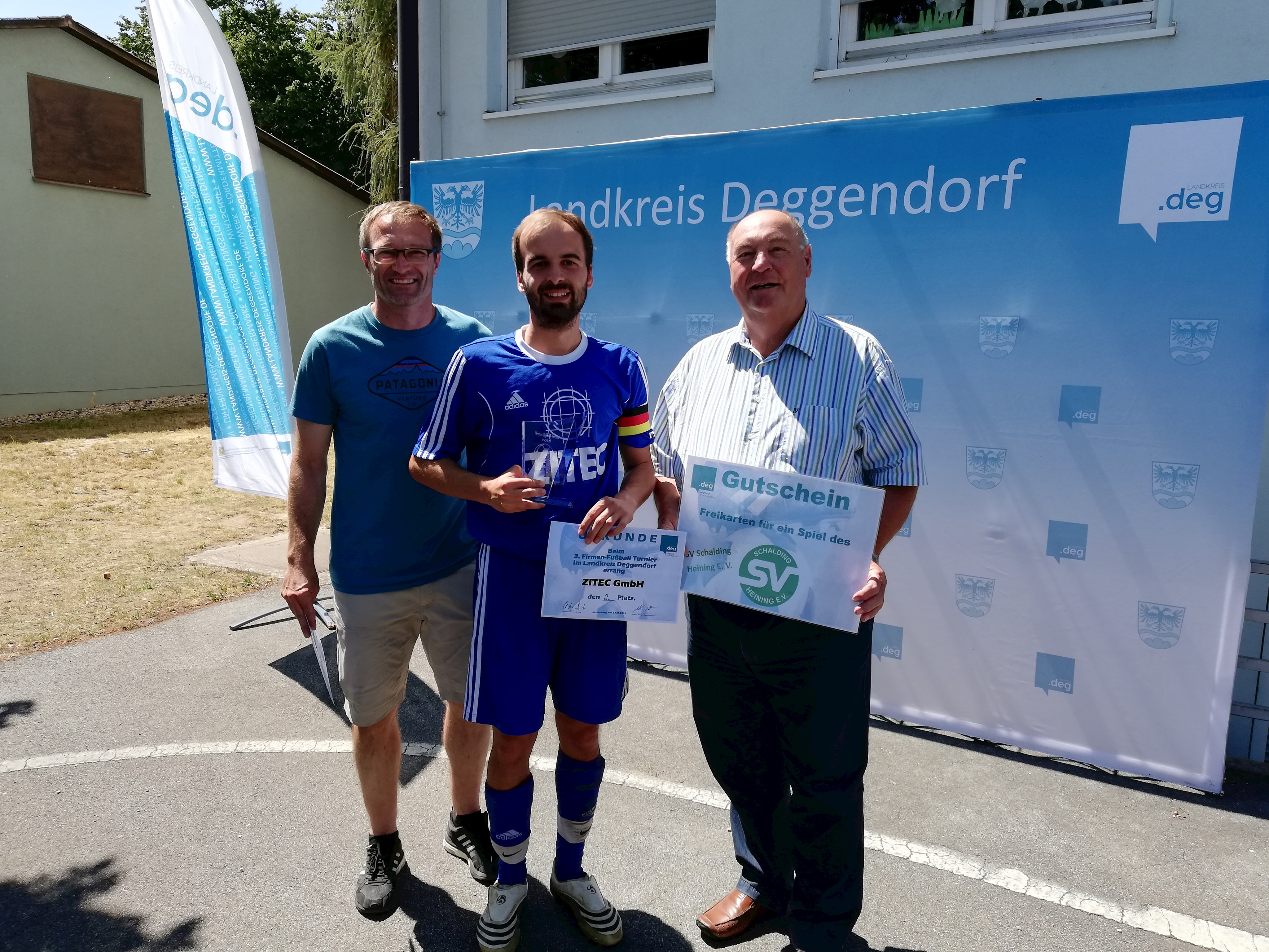 Auch 2 Sonderpreise wurden verliehen: den Titel als Torschützenkönig sicherte sich Joseph Schmidt von STREICHER. Der Titel als bester Fanclub ging in diesem Jahr an die Firma b-plus aus Deggendorf. b-plus erhält für das nächste Firmenfest eine Attraktion im Wert von 500€.