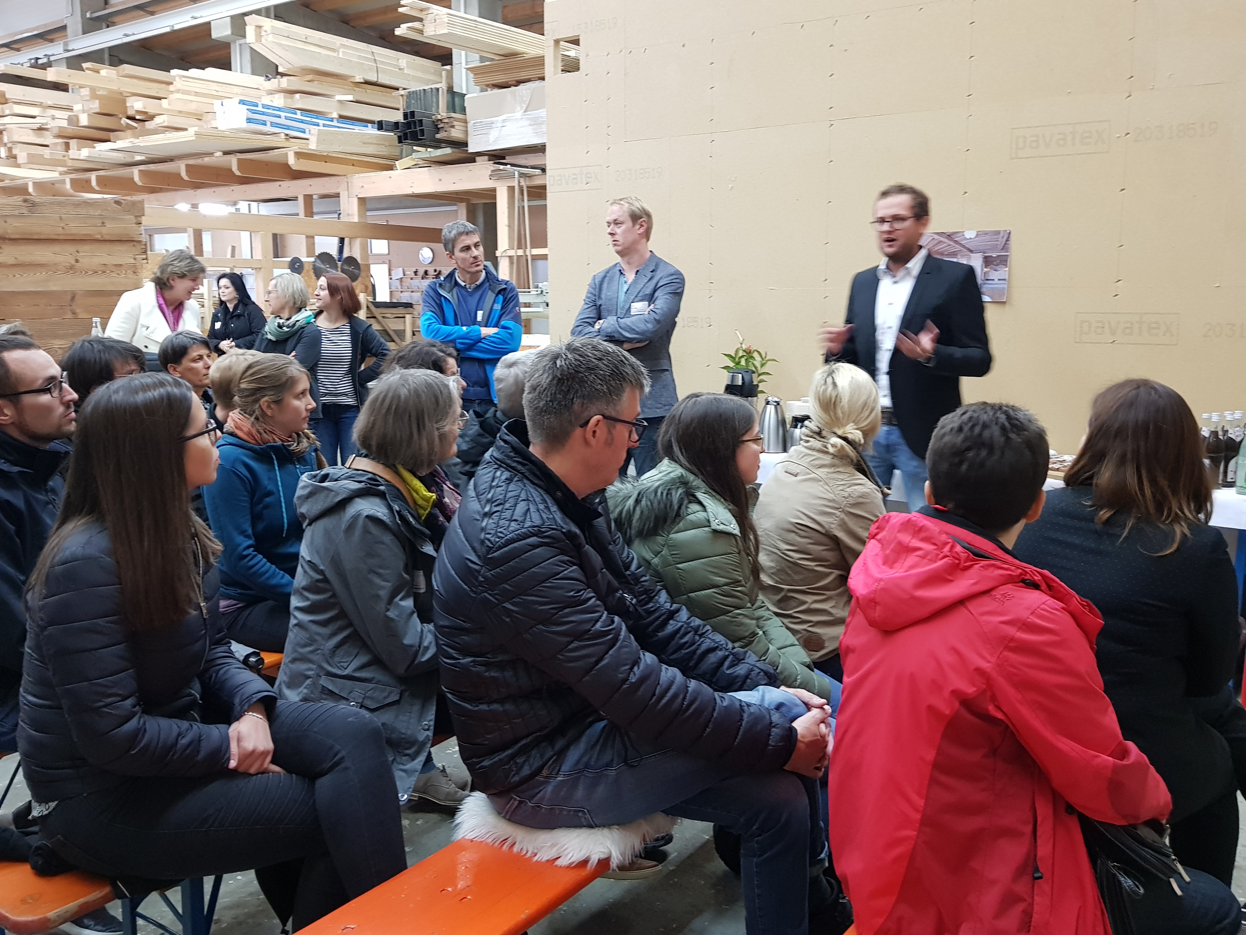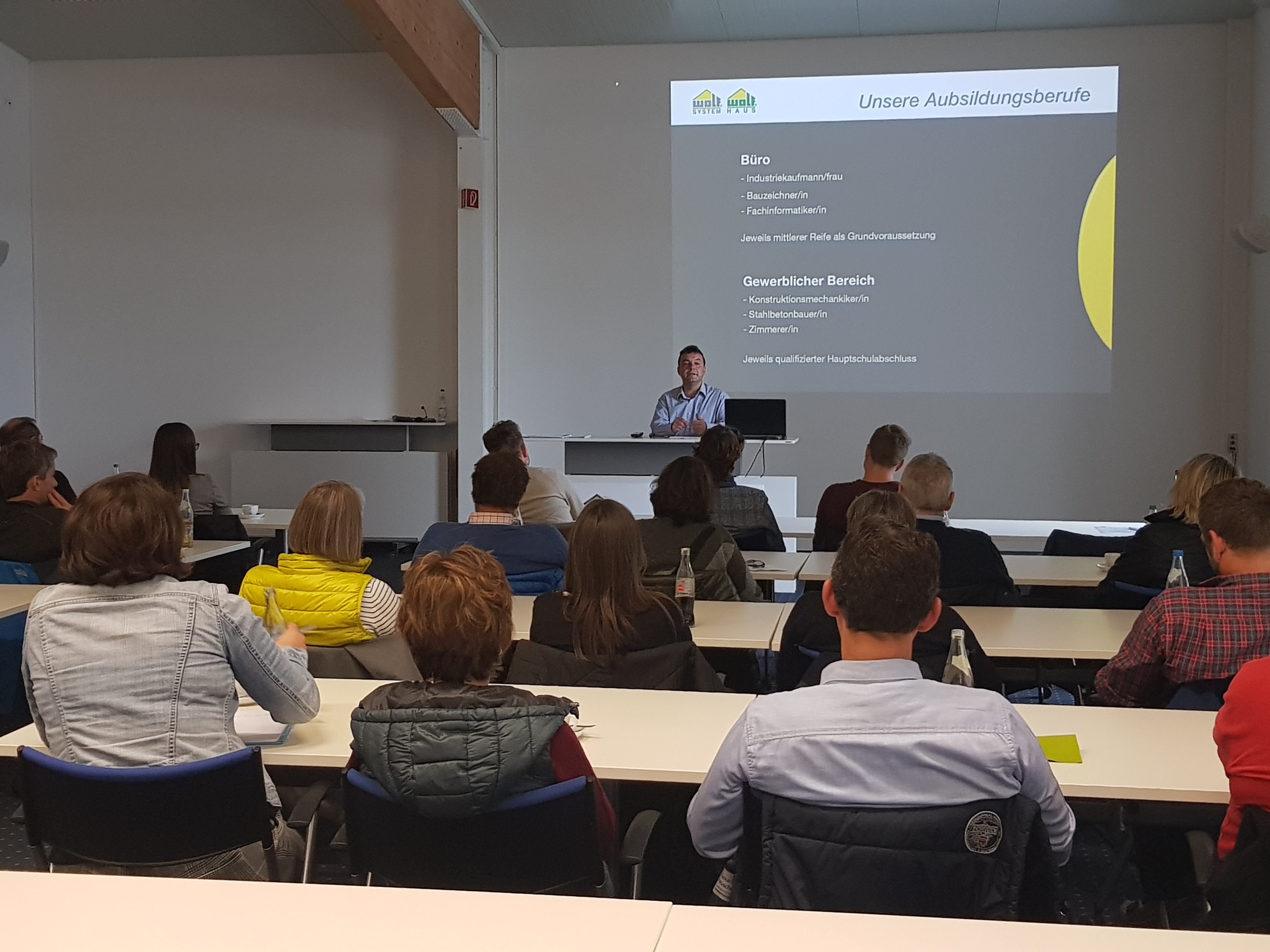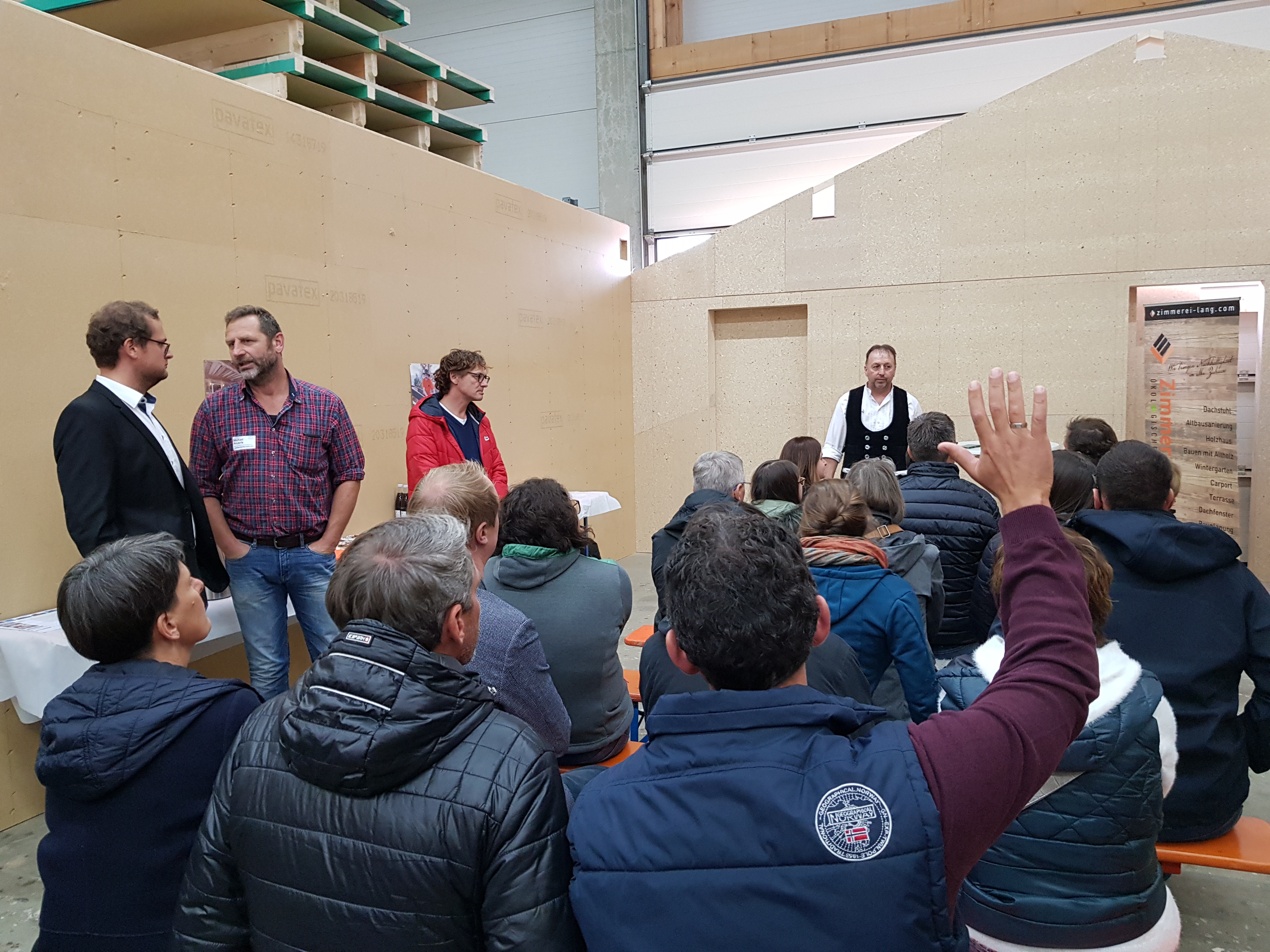 Bei den Ausführungen von Georg Wenzl und der anschließenden Diskussion wurden viele Aspekte der Ausbildung, des Studiums und vor allem den persönlichen Voraussetzungen der Jugendlichen für die Baubranche besprochen. Georg Wenzl zeigte Entwicklungen in der Baubranche auf und stellte fest: „Die Baubranche hat sich in den letzten Jahrzehnten grundlegend geändert. Ein Großteil der Arbeiten geschieht im Trockenen- sei es die Planung am Computer oder auch die Fertigung. Unsere Teams bereiten alles soweit vor, dass ein Haus in 2 Tagen steht.“ So entwickelte sich ein sehr informativer und ehrlicher Austausch, der bei der anschließenden Betriebsführung praktisch veranschaulicht wurde.