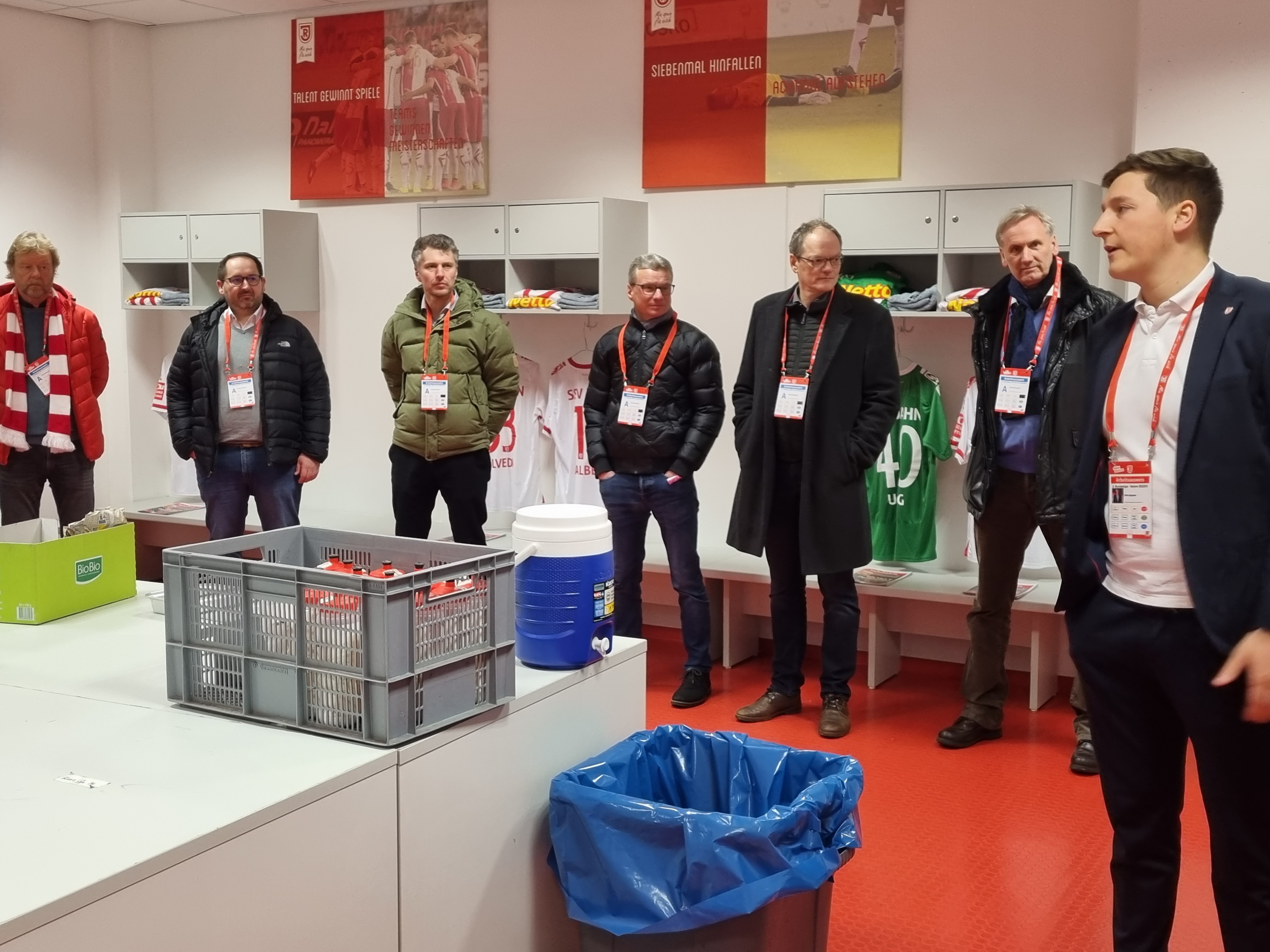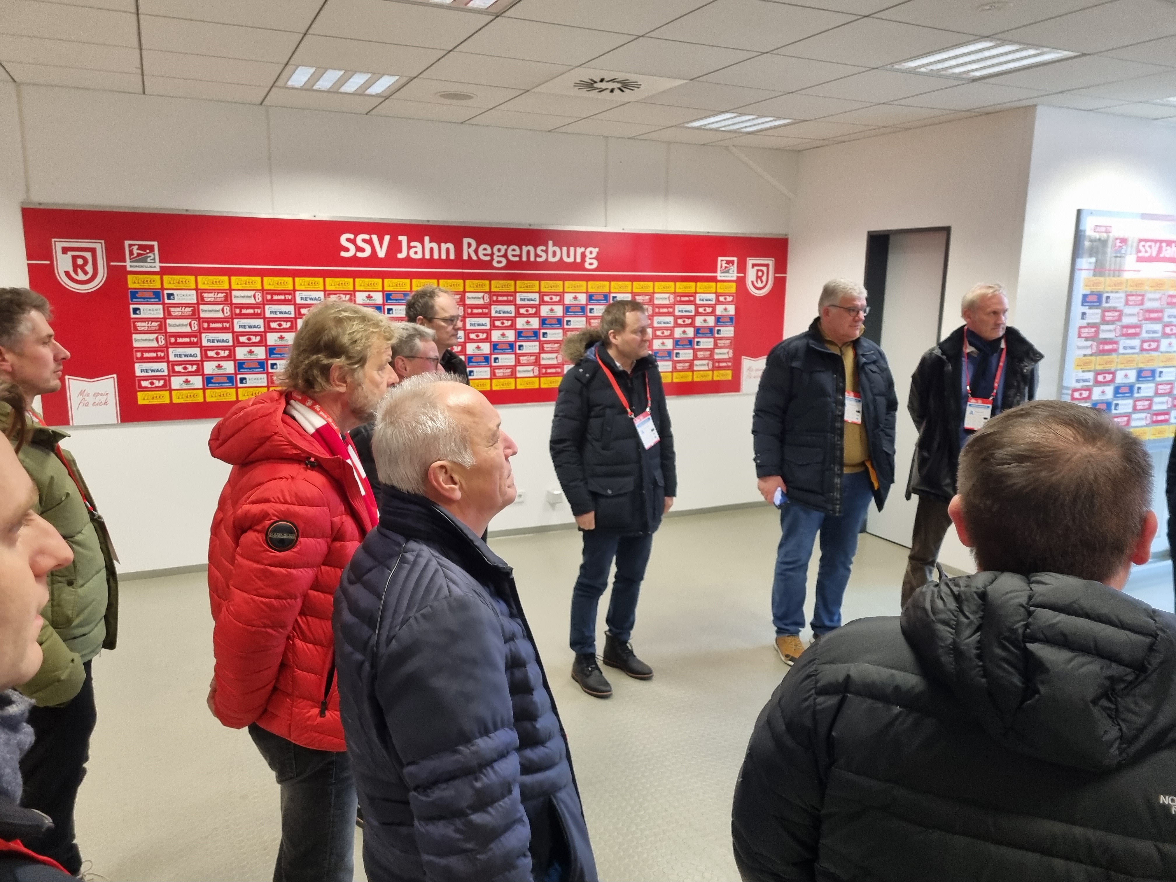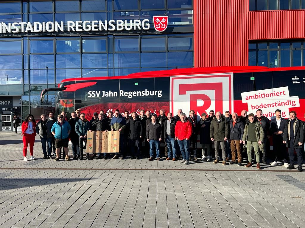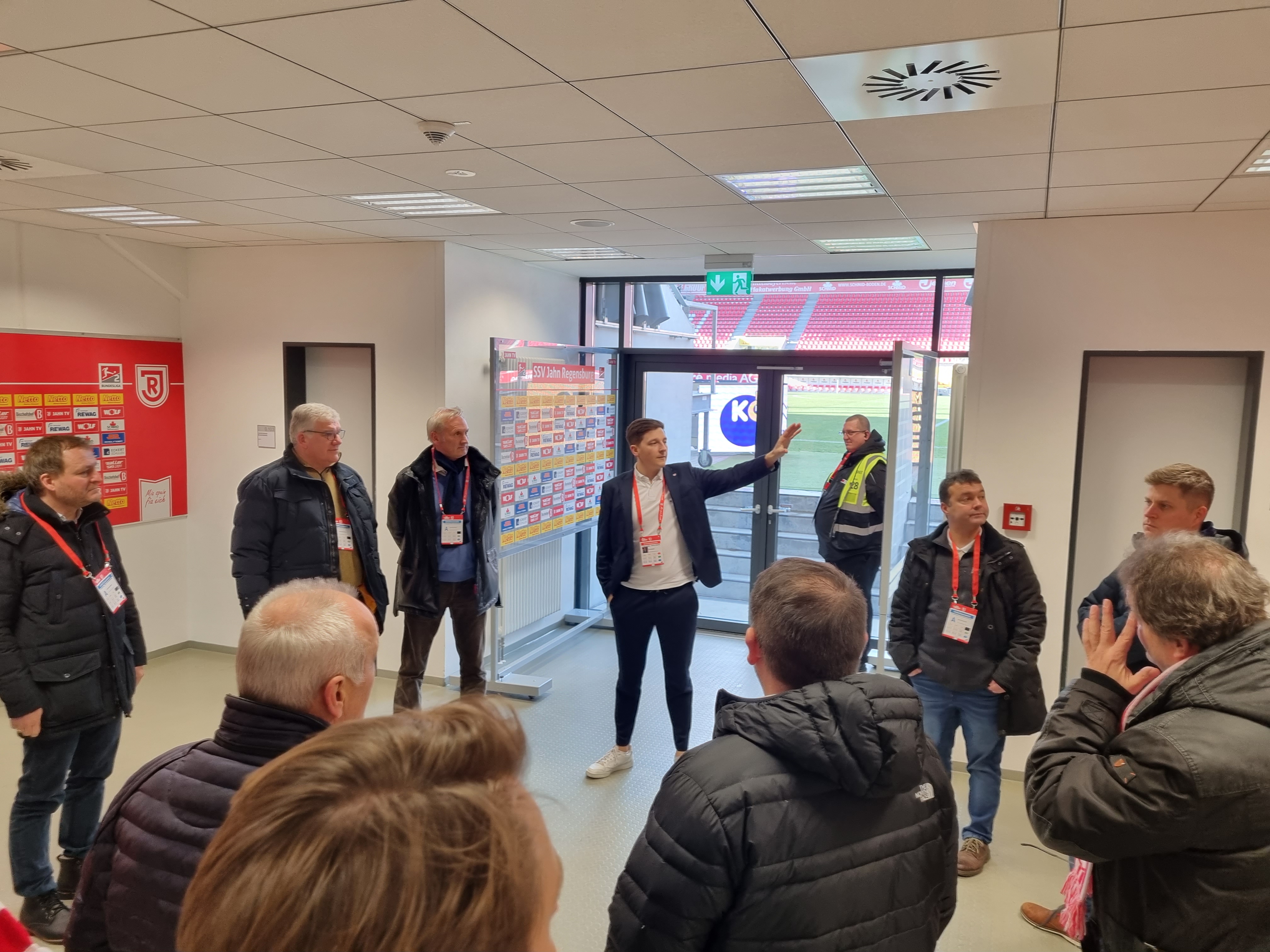 Abgeholt wurden die Unternehmer im neuen Mannschafts-Bus des SSV Jahn Regensburg. Landrat Bernd Sibler freute sich bei der Begrüßung über die große Resonanz auf die Aktion- alle Plätze waren belegt. In Regensburg angekommen wurde erst das Jahn-Stadion vorgestellt. Aufgeteilt in zwei Gruppen inspizierten die Unternehmer zunächst das Stadion. Vom VIP-Bereich über den Raum für die Pressekonferenzen bis hin zum Fußballplatz und in die Jahn-Kabine durften die Teilnehmer schauen.