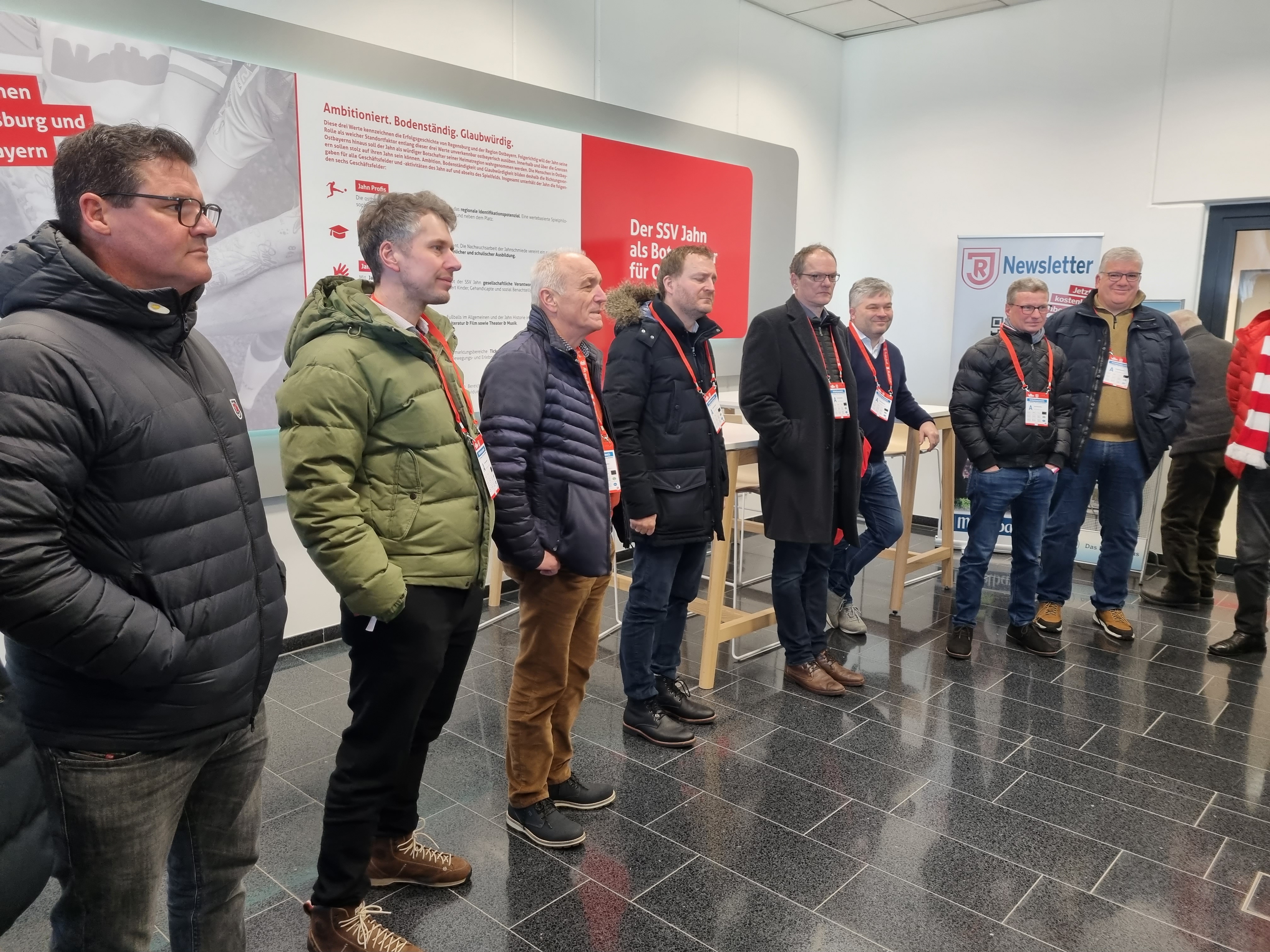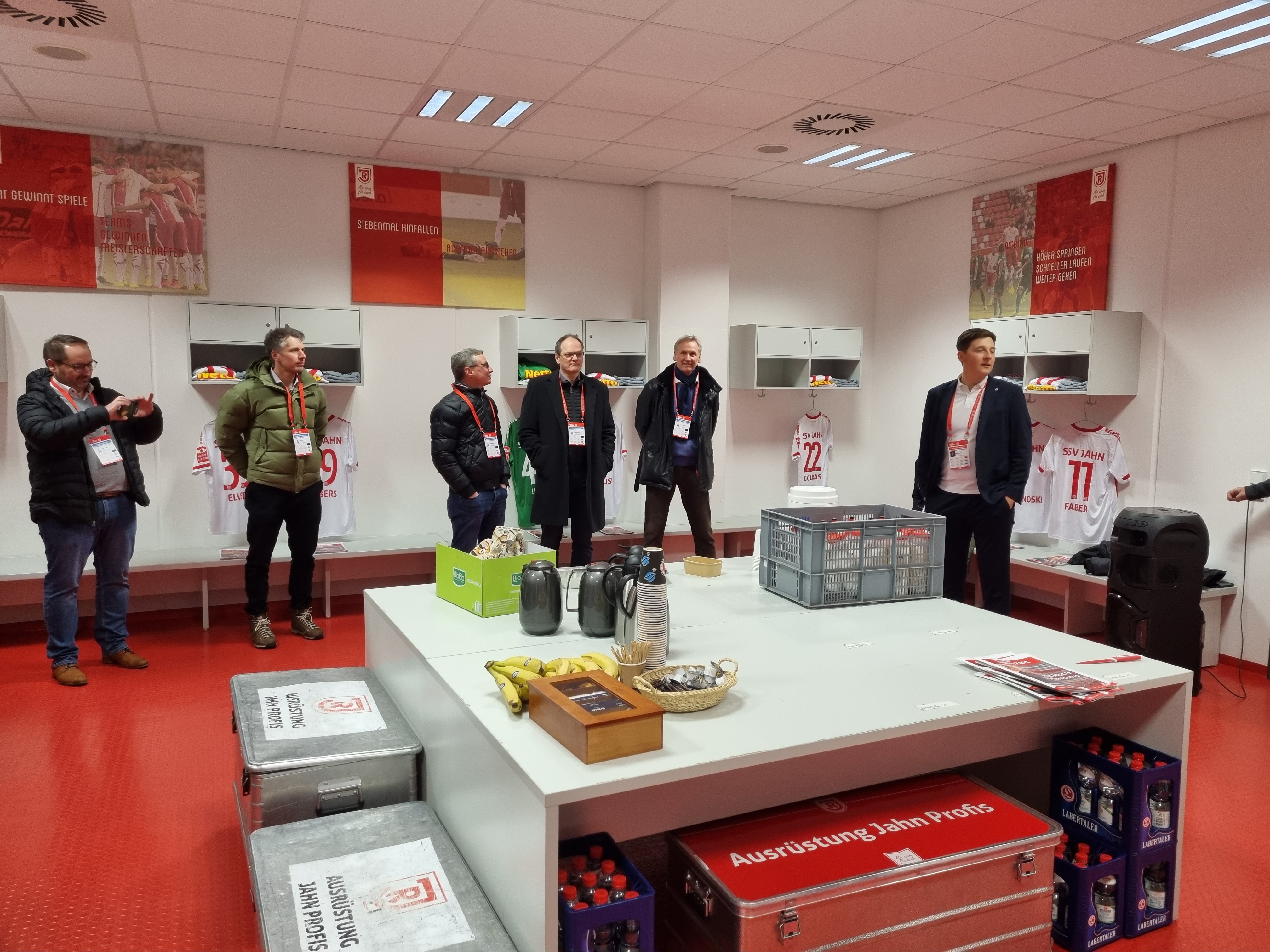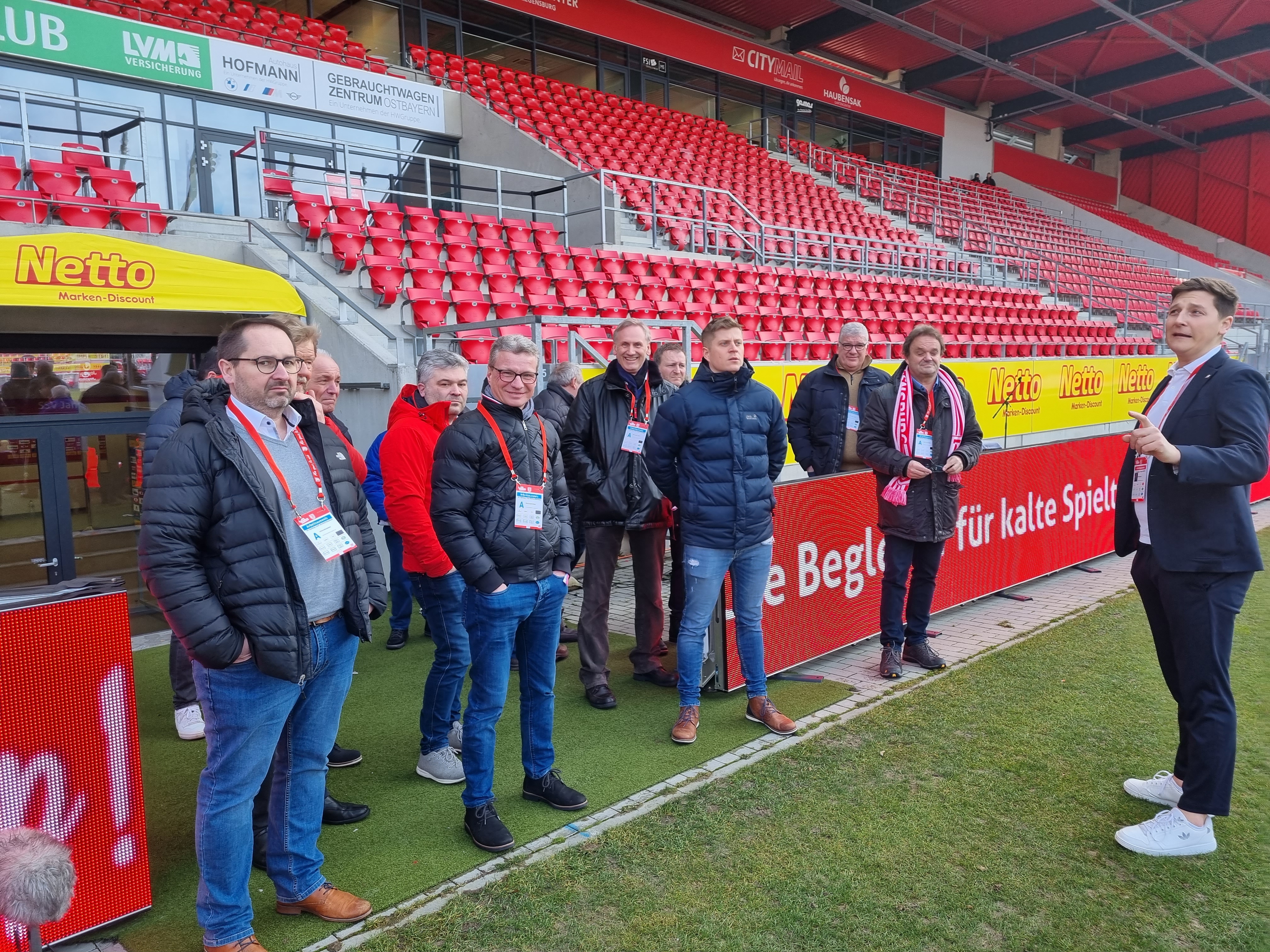 Abgeholt wurden die Unternehmer im neuen Mannschafts-Bus des SSV Jahn Regensburg. Landrat Bernd Sibler freute sich bei der Begrüßung über die große Resonanz auf die Aktion- alle Plätze waren belegt. In Regensburg angekommen wurde erst das Jahn-Stadion vorgestellt. Aufgeteilt in zwei Gruppen inspizierten die Unternehmer zunächst das Stadion. Vom VIP-Bereich über den Raum für die Pressekonferenzen bis hin zum Fußballplatz und in die Jahn-Kabine durften die Teilnehmer schauen.