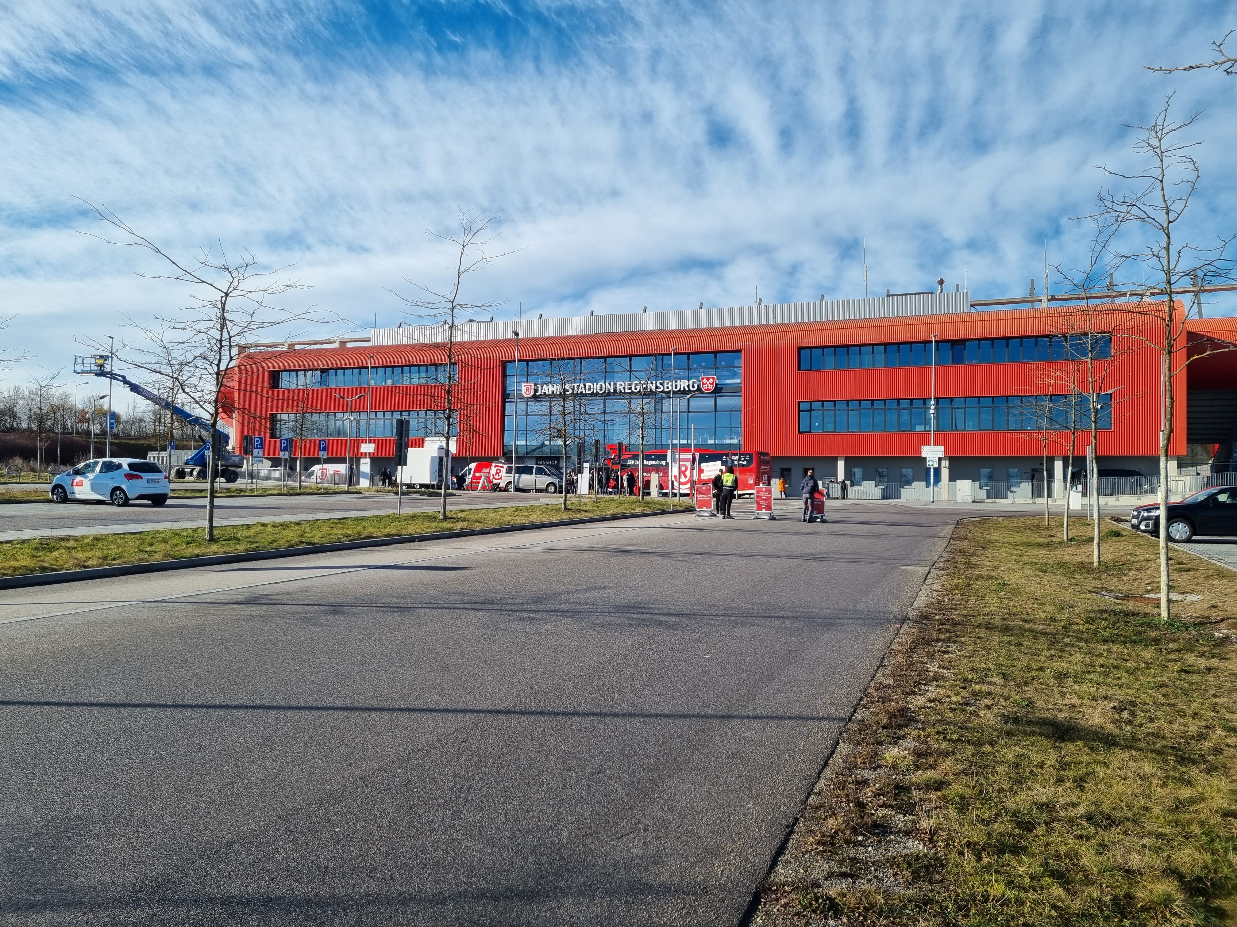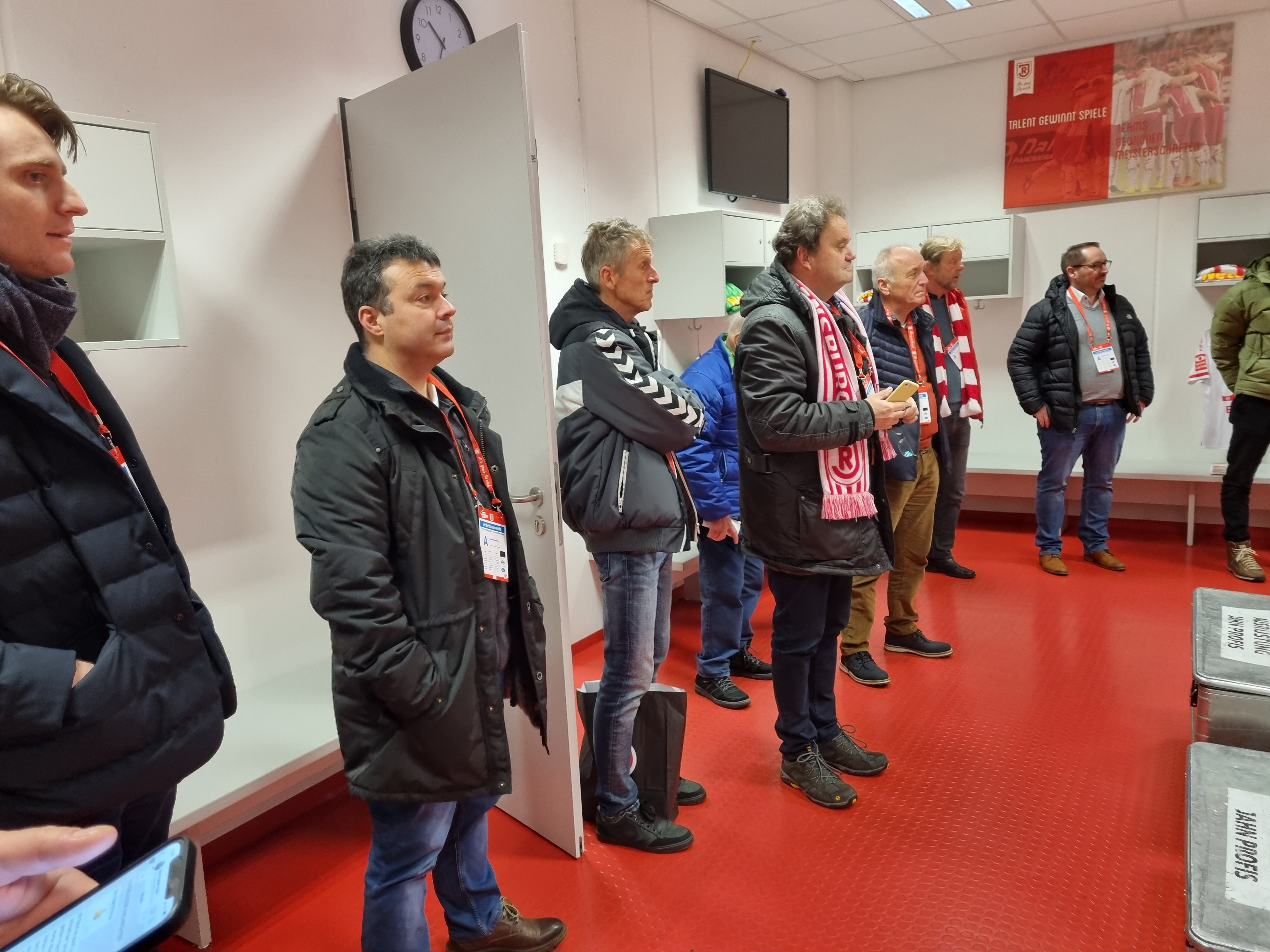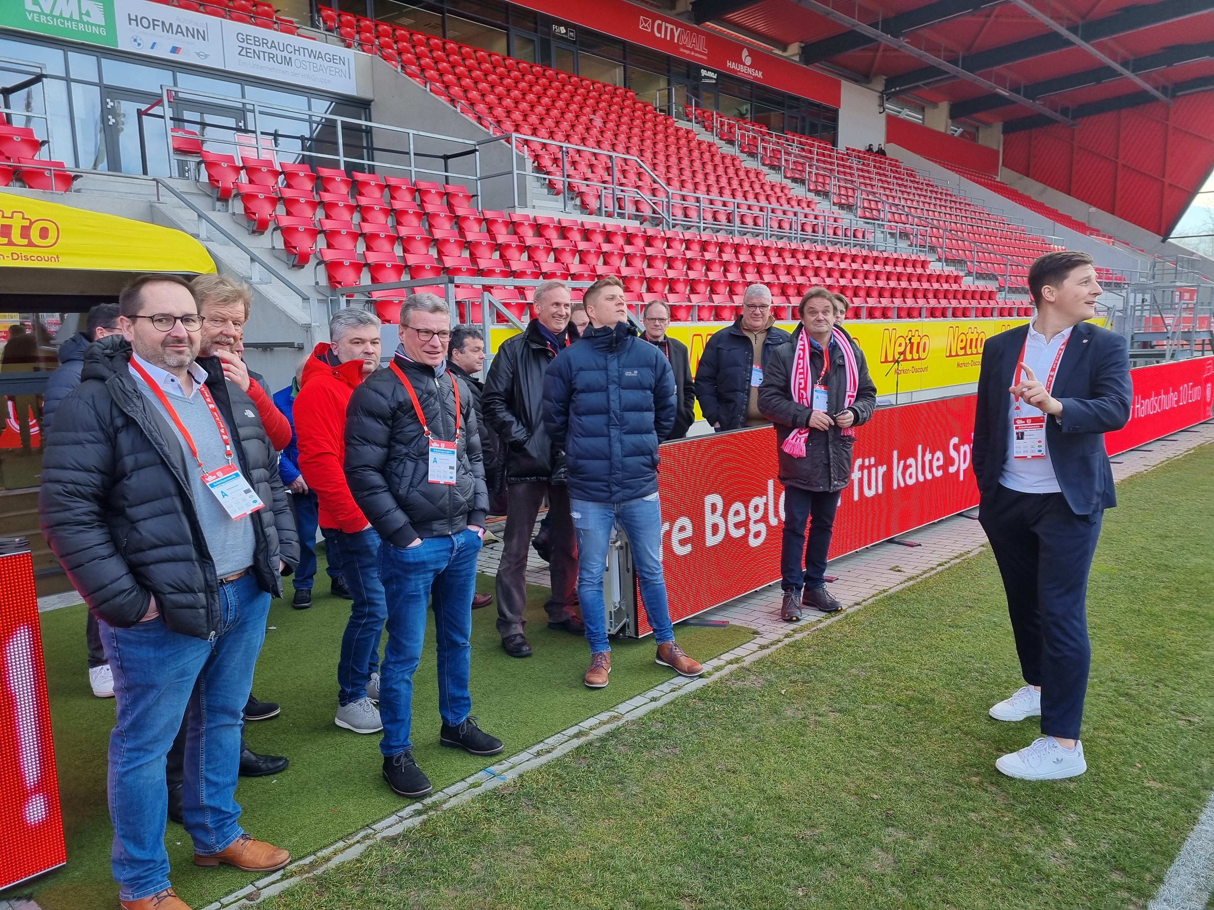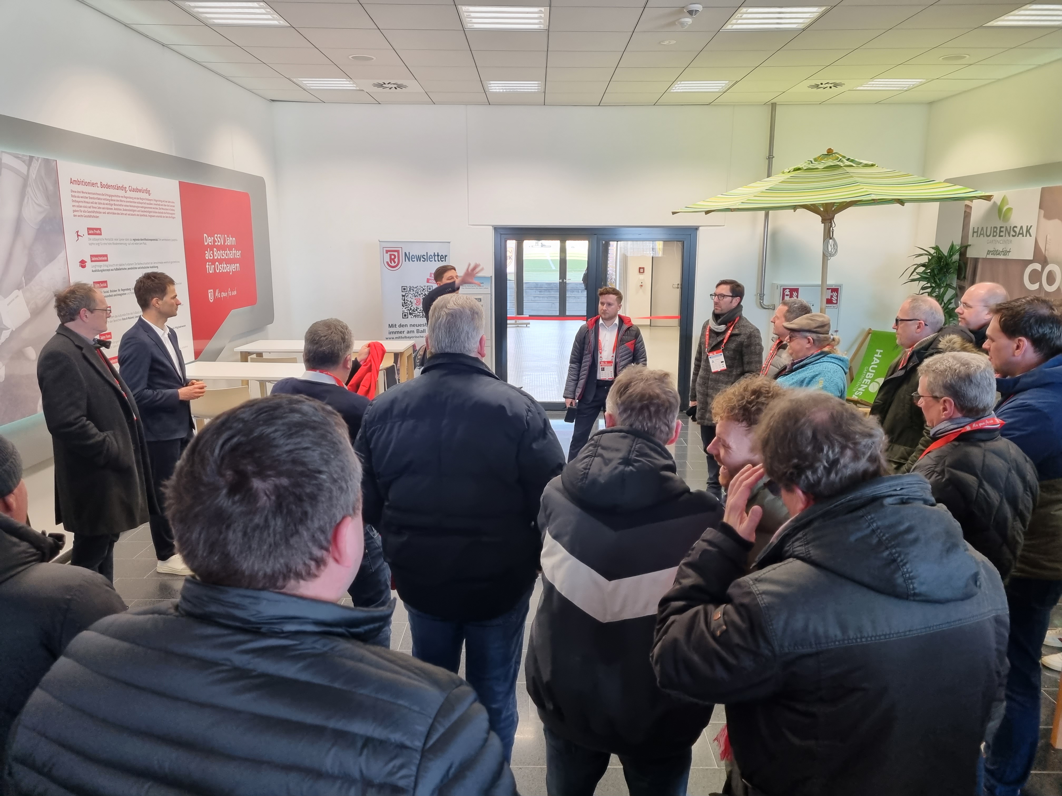 Abgeholt wurden die Unternehmer im neuen Mannschafts-Bus des SSV Jahn Regensburg. Landrat Bernd Sibler freute sich bei der Begrüßung über die große Resonanz auf die Aktion- alle Plätze waren belegt. In Regensburg angekommen wurde erst das Jahn-Stadion vorgestellt. Aufgeteilt in zwei Gruppen inspizierten die Unternehmer zunächst das Stadion. Vom VIP-Bereich über den Raum für die Pressekonferenzen bis hin zum Fußballplatz und in die Jahn-Kabine durften die Teilnehmer schauen.
