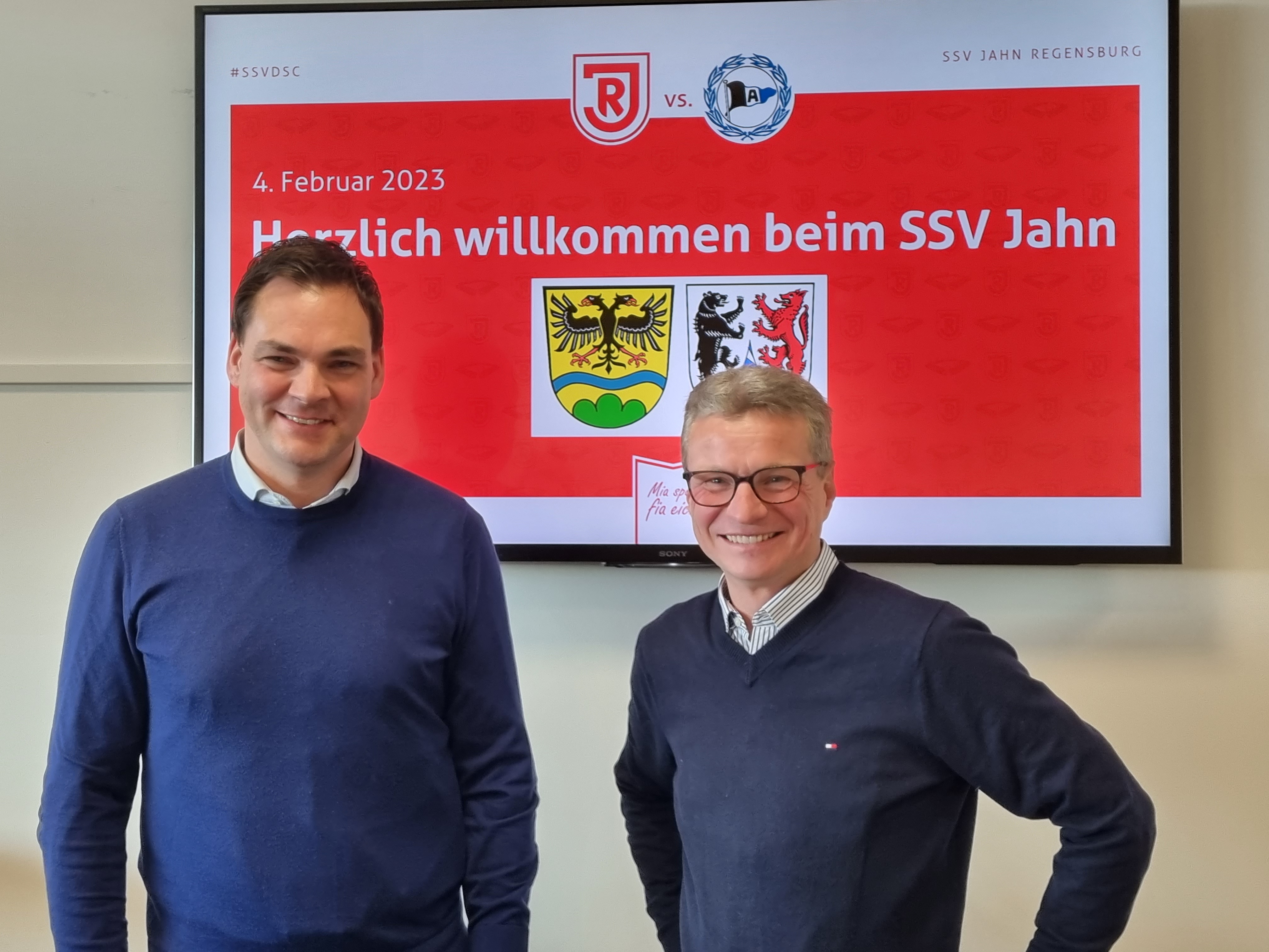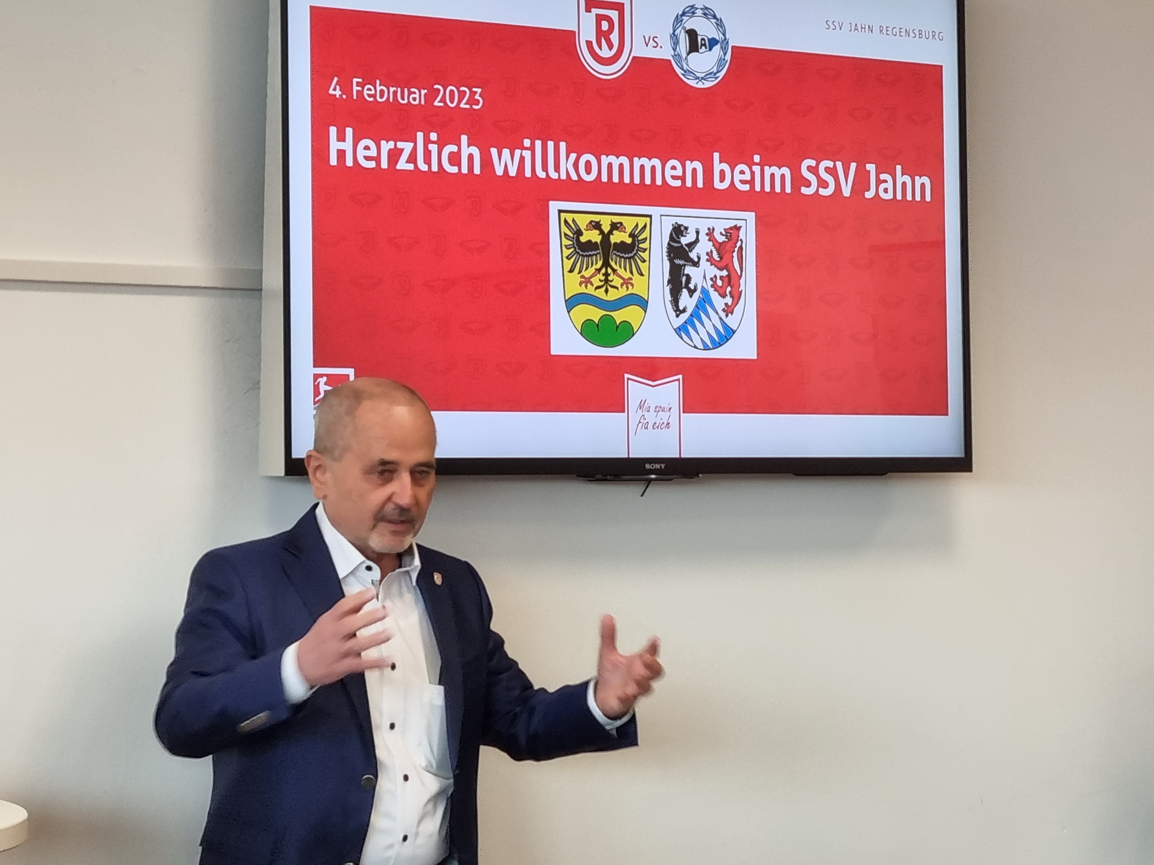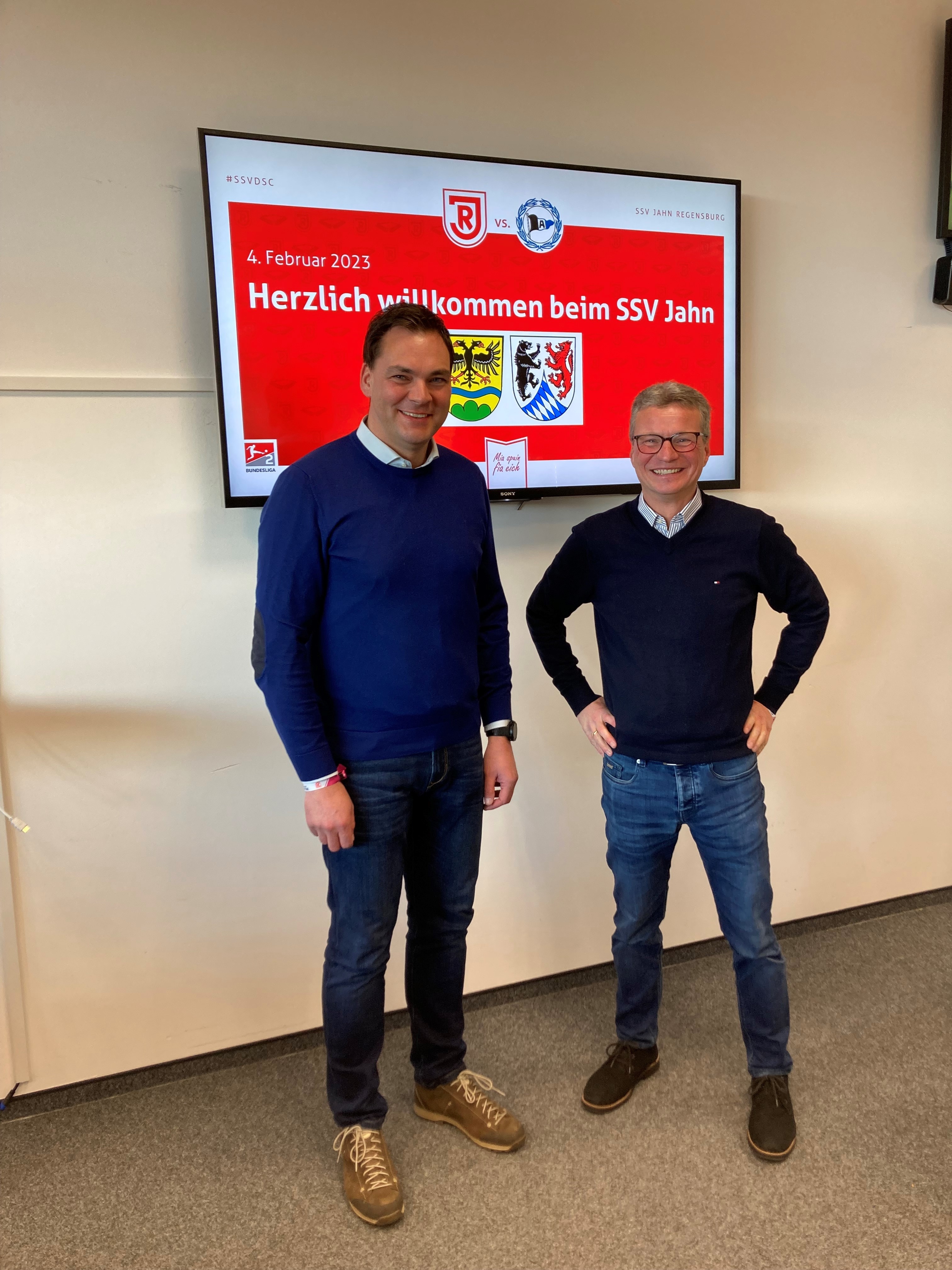 Beim anschließenden Empfang durch den Vorstandsvorsitzenden Hans Rothammer und dem Geschäftsführer des SSV Jahn, Philipp Hausner, erfuhren die Anwesenden viele interessante Aspekte rund um den Profifußball in Regensburg. Die Leiterin der Vermarktung Geschäftskunden, Simone Piller, blickte in ihrem Vortrag auf 50 Jahre Sportsponsoring zurück. Von der ersten Trikotwerbung bis hin zu den aktuellen Möglichkeiten beim SSV Jahn. „Der SSV Jahn Regensburg bietet den Unternehmen sehr viele Möglichkeiten, sich zu präsentieren. Uns ist es wichtig zu zeigen, dass es verschiedene Ansätze des Marketings gibt. Da konnten wir uns sehr viele Anregungen holen- auch für die Umsetzung bei den Vereinen oder den Kultureinrichtungen im Landkreis“, weist Landrat Bernd Sibler auf die Übertragung der Ansätze auf die lokalen Gegebenheiten hin.