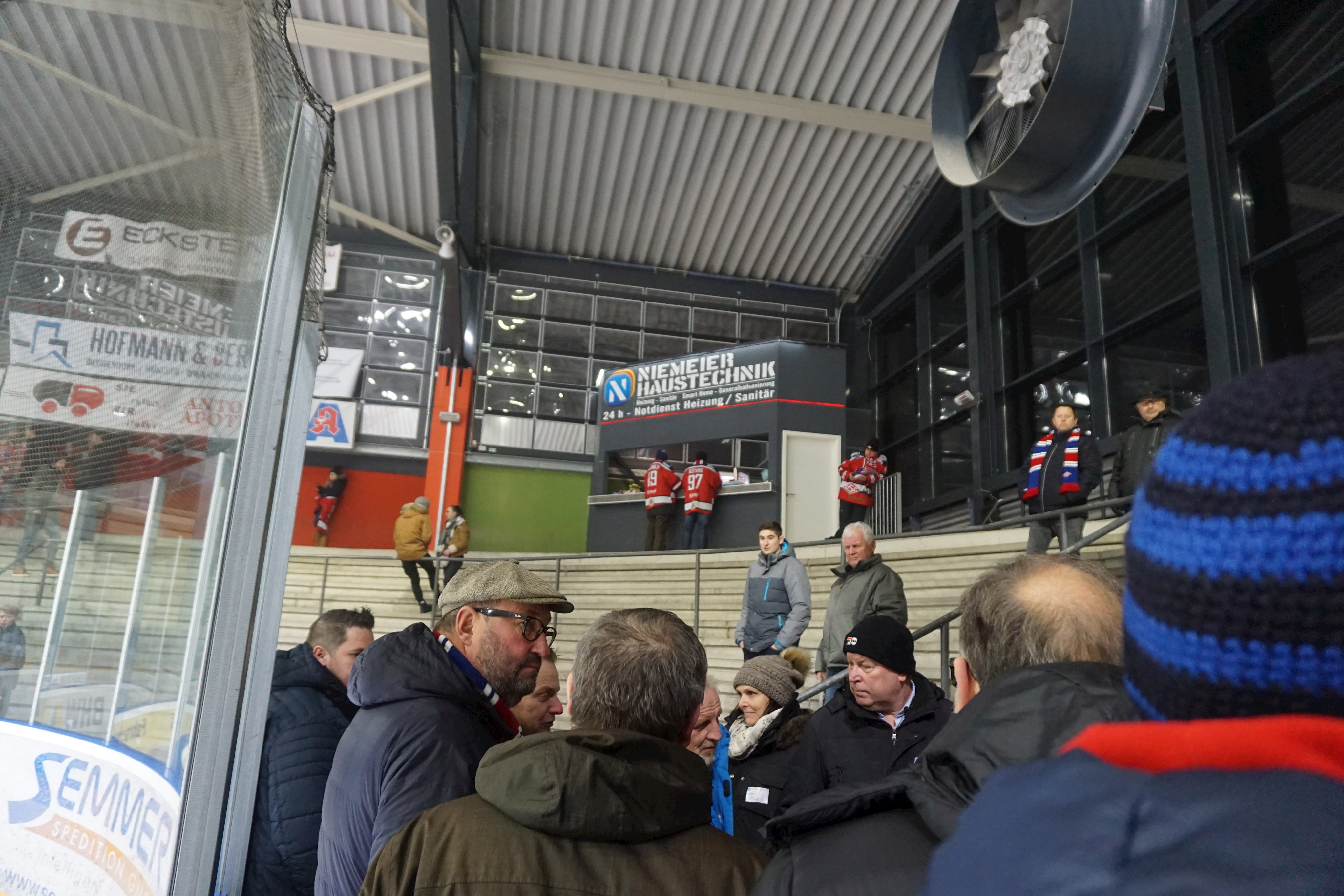 Ziel der gemeinsamen Aktion beider Landkreise ist es, die Unternehmen besser zu vernetzen, um mögliche Synergien zu nutzen. Dabei steht neben dem Netzwerken vor allem das Thema „Fachkräftesicherung“ im Fokus. Beim Besuch im Eisstadion an der Trat wurden den mehr als 70 Unternehmern die Möglichkeiten und Wirkungen rund um Sport, Profisport und Vereinen präsentiert.
