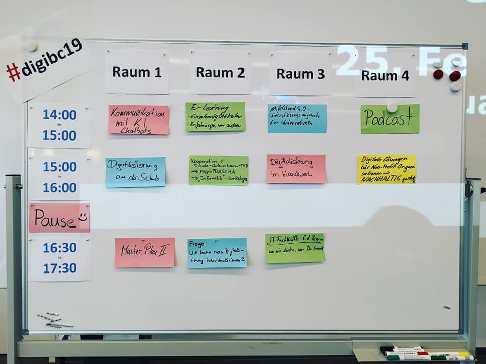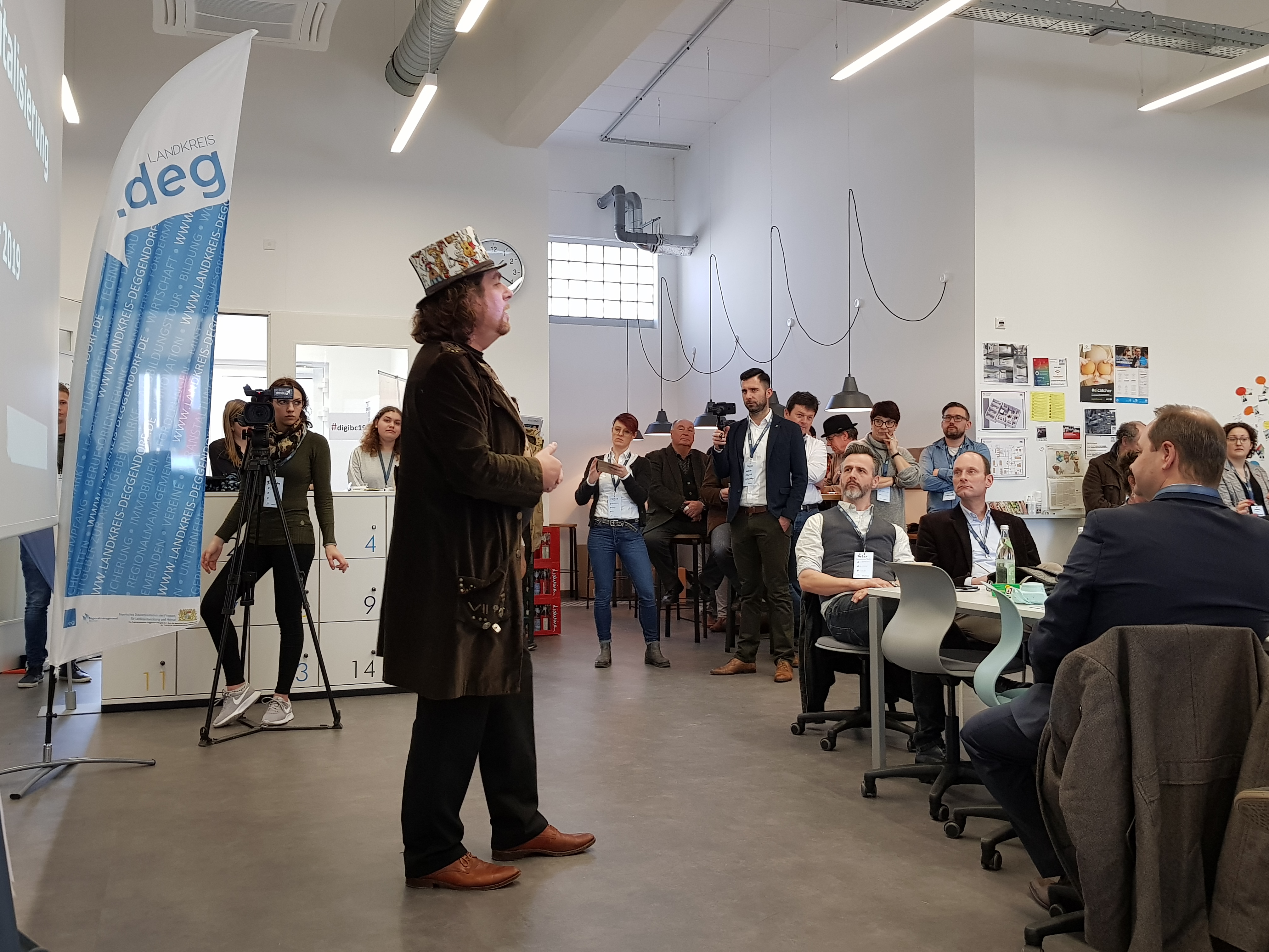 Nach einer kurzen Begrüßung durch Stv. Landrat Josef Färber und einer kleinen Vorstellungsrunde, ging man zu den sog. Pitches über. Jede(r) Teilnehmende konnte seinen Vorschlag für eine Session vorstellen. Anschließend wurde unter den Teilnehmern abgefragt, ob dies von Interesse ist. Am Schluss einigte man sich auf 11 Sessions mit den unterschiedlichsten Themenbereichen entschieden. So z.B. wurde in einem Raum über Podcasts gesprochen, während sich die Teilnehmer/-innen nebenan über künstliche Intelligenz oder Digitalisierung in Schulen austauschten. Jeder durfte selbst entscheiden, welche Sessions er besucht. Ein BarCamp ist somit vielfältig und bietet unzählige Möglichkeiten. Es sind verschiedene Meinungen erlaubt, die Gäste stammen aus den unterschiedlichsten Organisationen und alle möglichen Altersklassen sind vertreten. So nahmen beispielsweise sowohl Geschäftsführer von Firmen aus der Region als auch Schüler/-innen der Realschule Schöllnach an der Veranstaltung teil. Zwischendurch hat Christopher, der Hofzauberer, die Gäste mit mehreren unterhaltsamen Tricks verzaubert und für gute Stimmung in den Pausen gesorgt. Außerdem wurden die Gäste mit köstlichen Snacks versorgt. Im Anschluss an die letzten Sessions zog Dr. Markus Reimer ein kurzes Fazit und machte auf die Möglichkeiten aber auch die Gefahren der Digitalisierung aufmerksam. Als Abschluss der gelungenen Veranstaltung konnten sich alle bei Pizza und Bier weiter austauschen und den Tag ausklingen lassen.