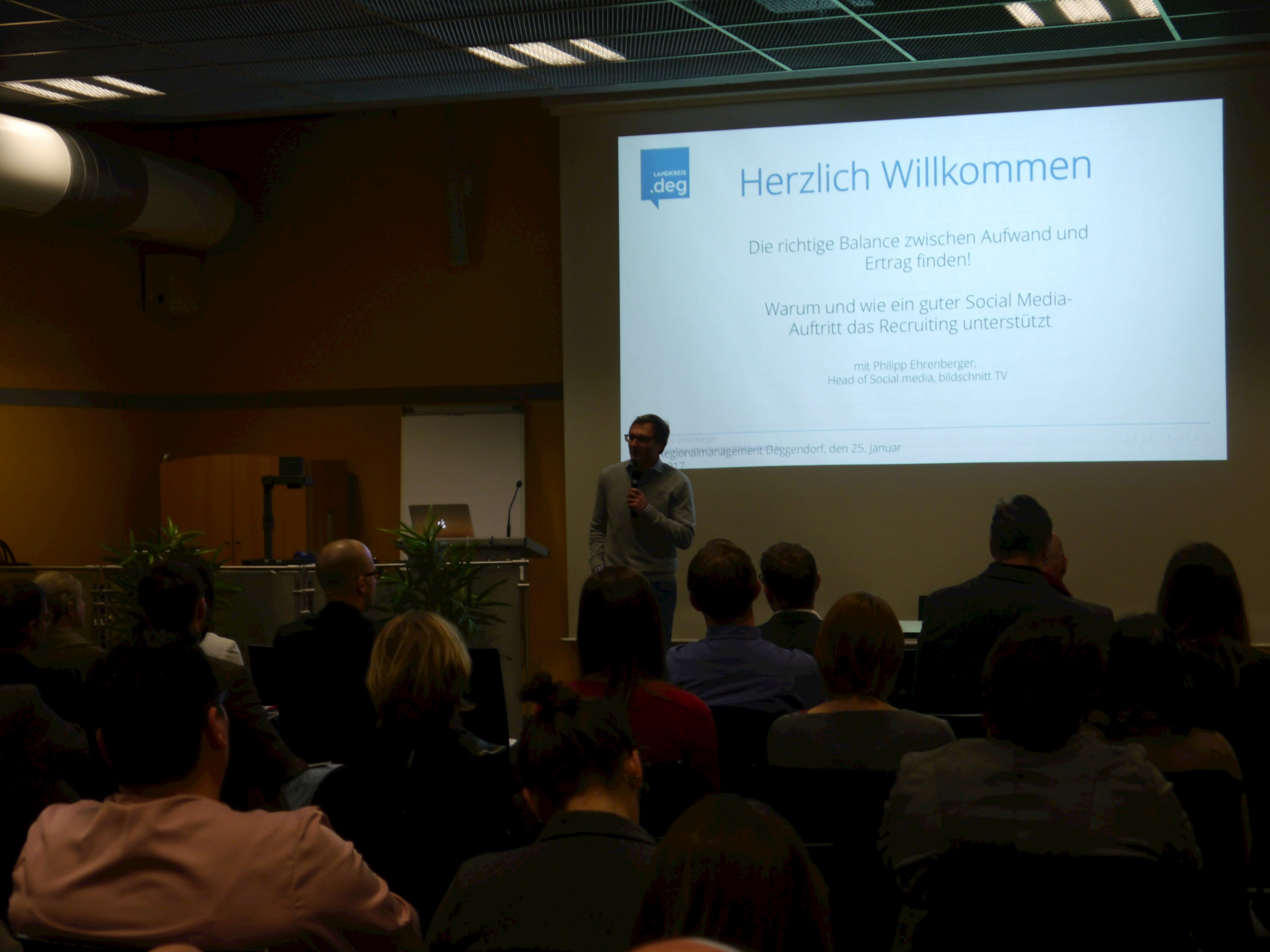 Philipp Ehrenberger, Head of Social Media bei bildschnittTV, beantwortete den knapp 90 Teilnehmern bei der Veranstaltung im Rahmen der Vortragsreihe „Vom Arbeitgeber zur ArbeitgeberMARKE“ des Regionalmanagements Deggendorf diese Fragen gewohnt kompetent. Überrascht waren viele Teilnehmer, welche Reichweiten die einzelnen Kanäle haben, wie viele in der Region und welche Altersgruppen die Plattformen nutzen und auch, wie konzentriert ich Meldungen verschicken kann. Beispielsweise kann ich die Zielgruppe auf Facebook auf 25 Personen eingrenzen. „Man muss die Leute dort abholen, wo sie sind. In den sozialen Medien halten sich insbesondere junge Leute im erwerbsfähigen Alter sehr häufig auf. Alleine Facebook nutzen in der Region ca. 45.000 Leute. Deshalb spielen diese Medien auch bei der Fachkräftesicherung und –gewinnung eine immer größere Rolle“, so Philipp Ehrenberger. Insbesondere ging er zu Beginn auf die „Marke“ ein: „Man muss sein Unternehmen und seine Ziele klar definiert haben, um in den sozialen Medien erfolgreich sein zu können. Ohne eine gewisse Marke, ohne eine bestimmte Ausrichtung der Aktivitäten funktioniert das Spiel nicht!“