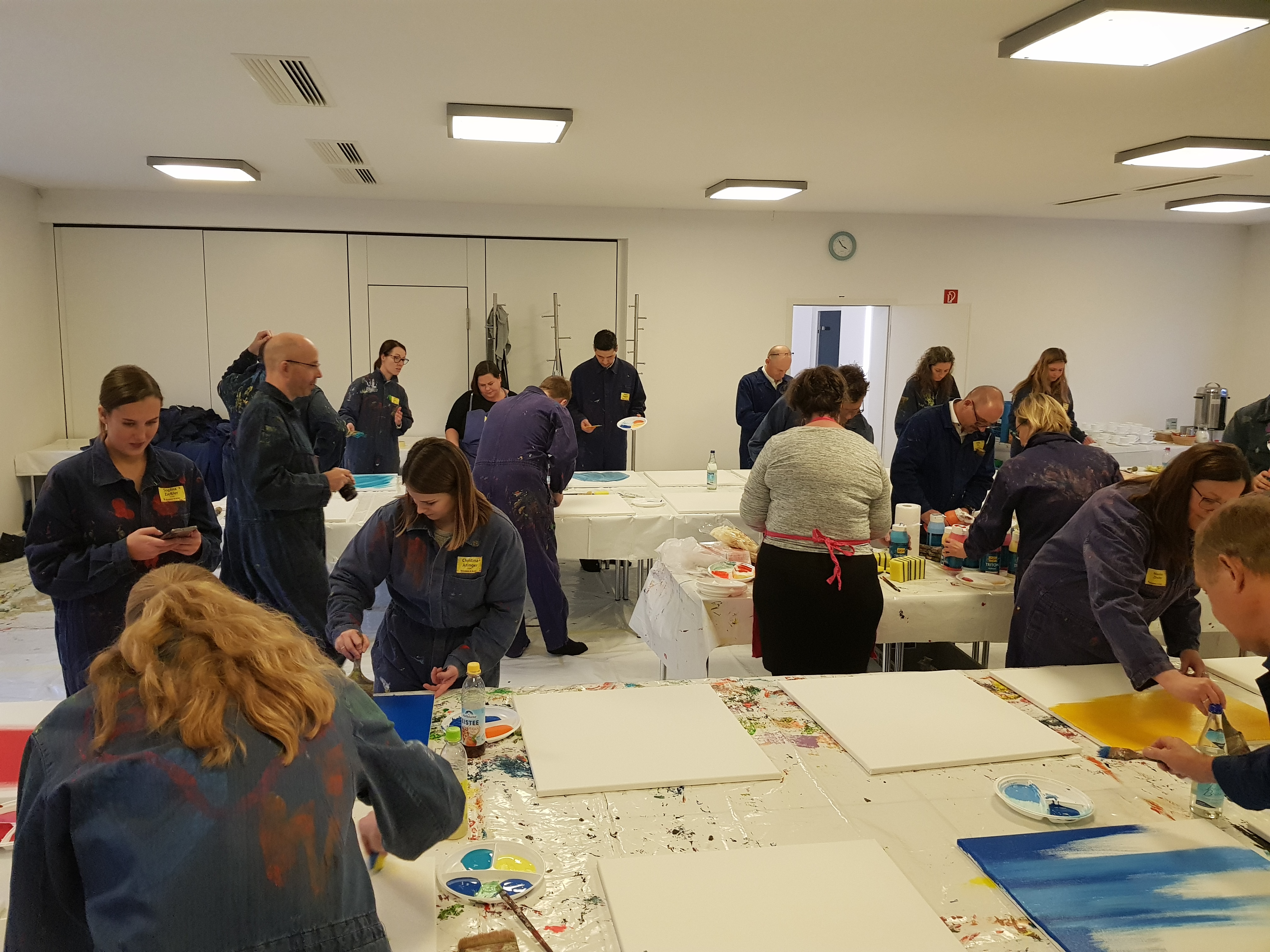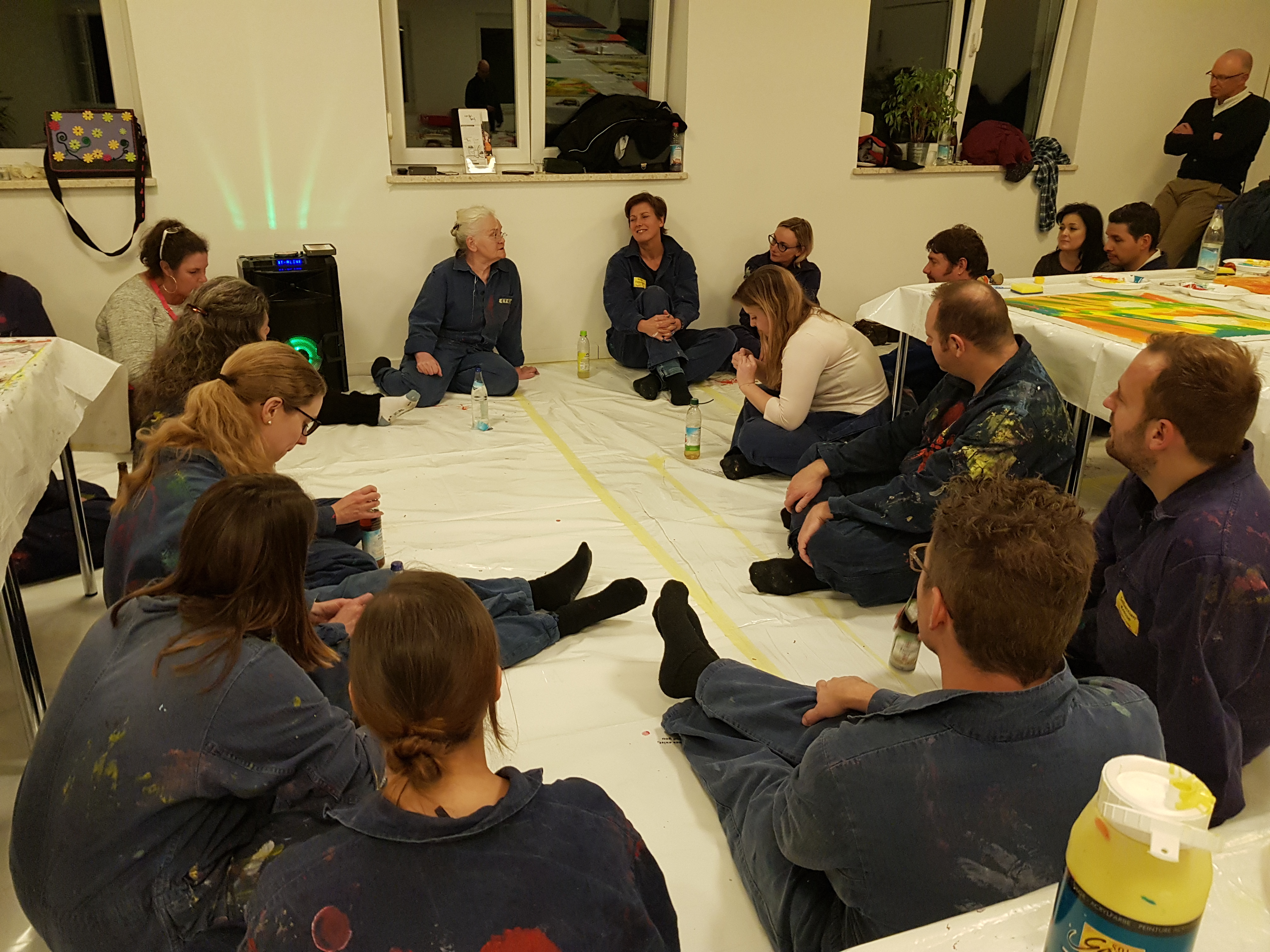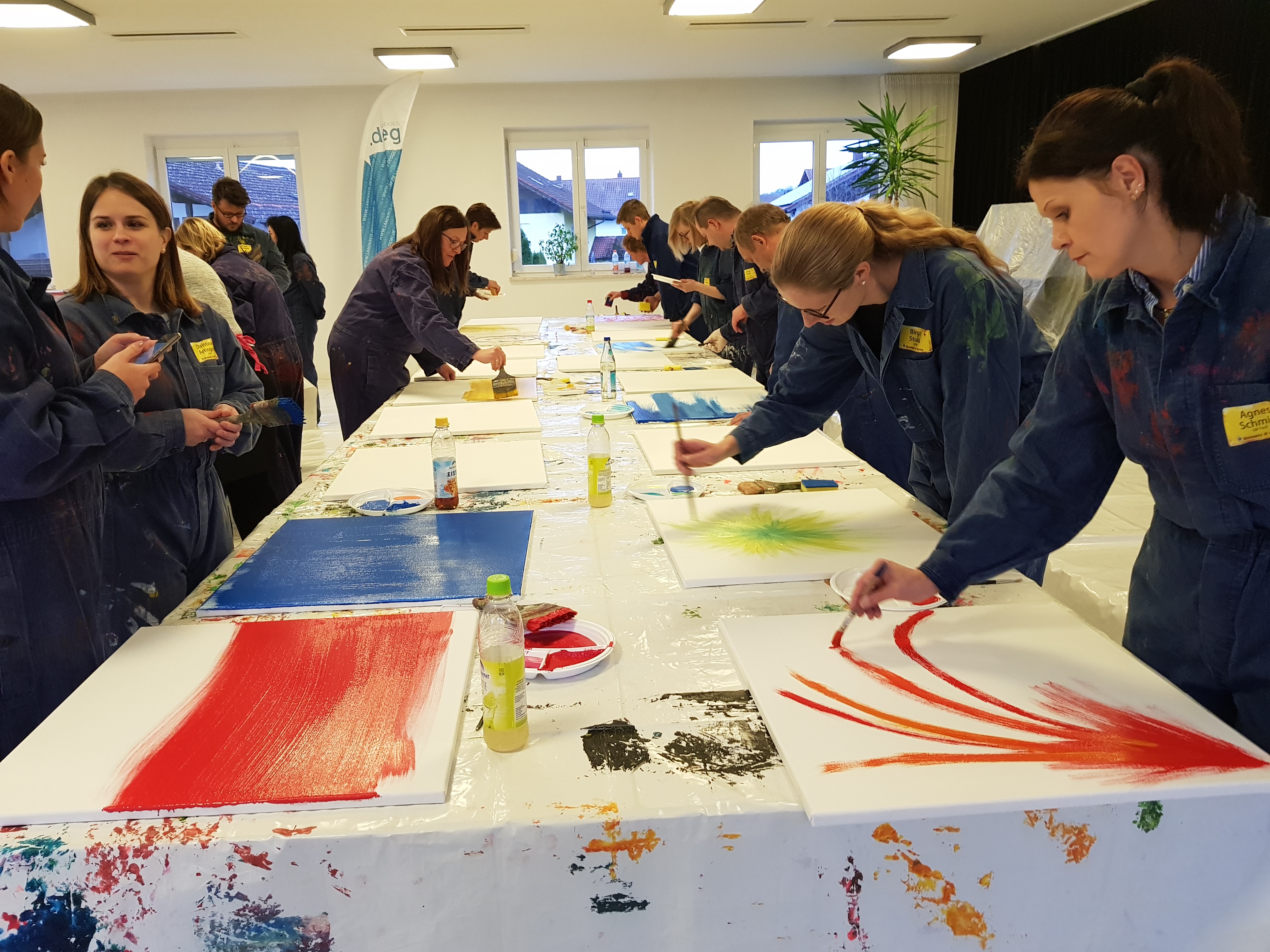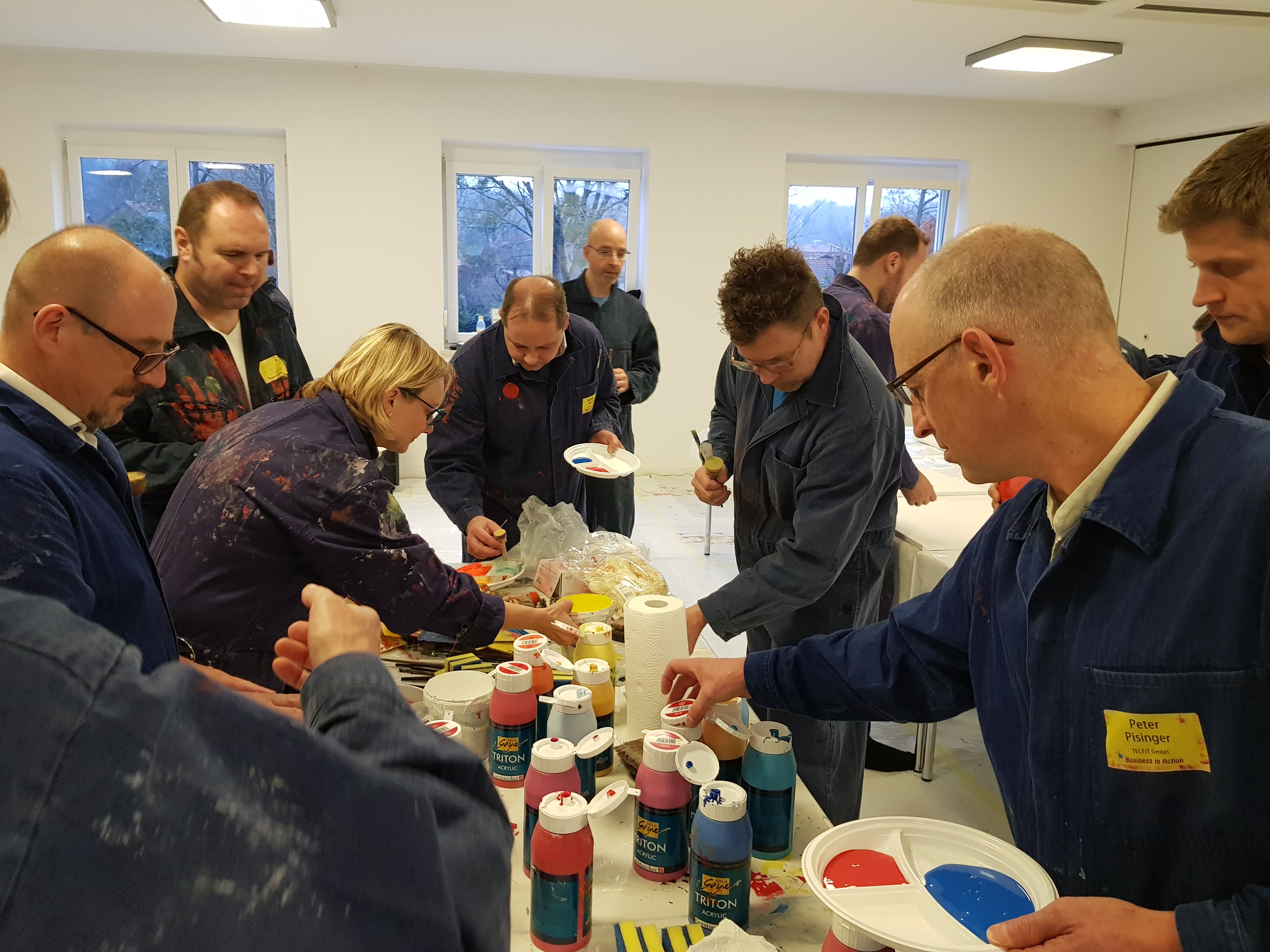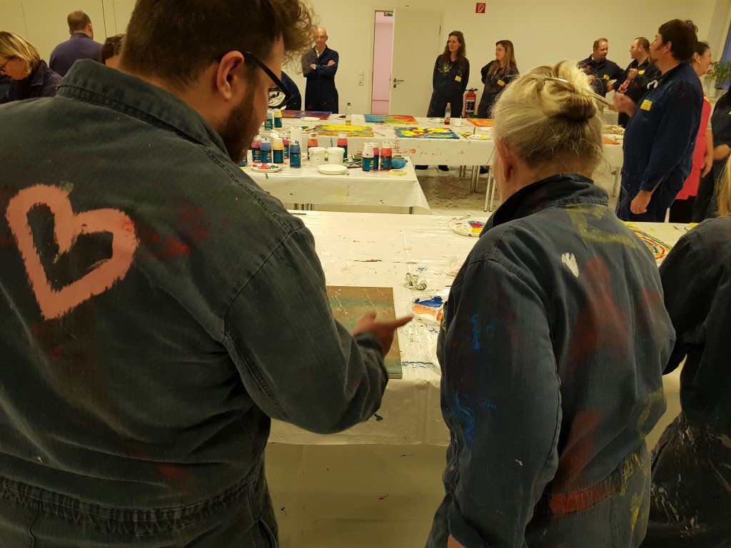 Bevor es an Pinsel und Farbe ging, erläuterte Etelka Kovacs-Koller zunächst wie wichtig Authentizität für Unternehmer, Unternehmen und Mitarbeiter ist. Sie ersetzte dabei „Authentizität“ mit dem Wort „Rechtschaffenheit“, da es ihr insbesondere auch um Werte, Vertrauen und in Folge um Identifikation geht. „Freiheit heißt nicht, dass man alles machen kann wozu man Lust hat. Freiheit geht nur auf Grundlage von Werten- bestenfalls von gleichen Werten aller Menschen. So kann man gegenseitiges Vertrauen aufbauen. Die Malerei an diesem Nachmittag dient dazu, sich selbst besser kennenzulernen. Dies ist die Grundlage für die eigene Rechtschaffenheit.“