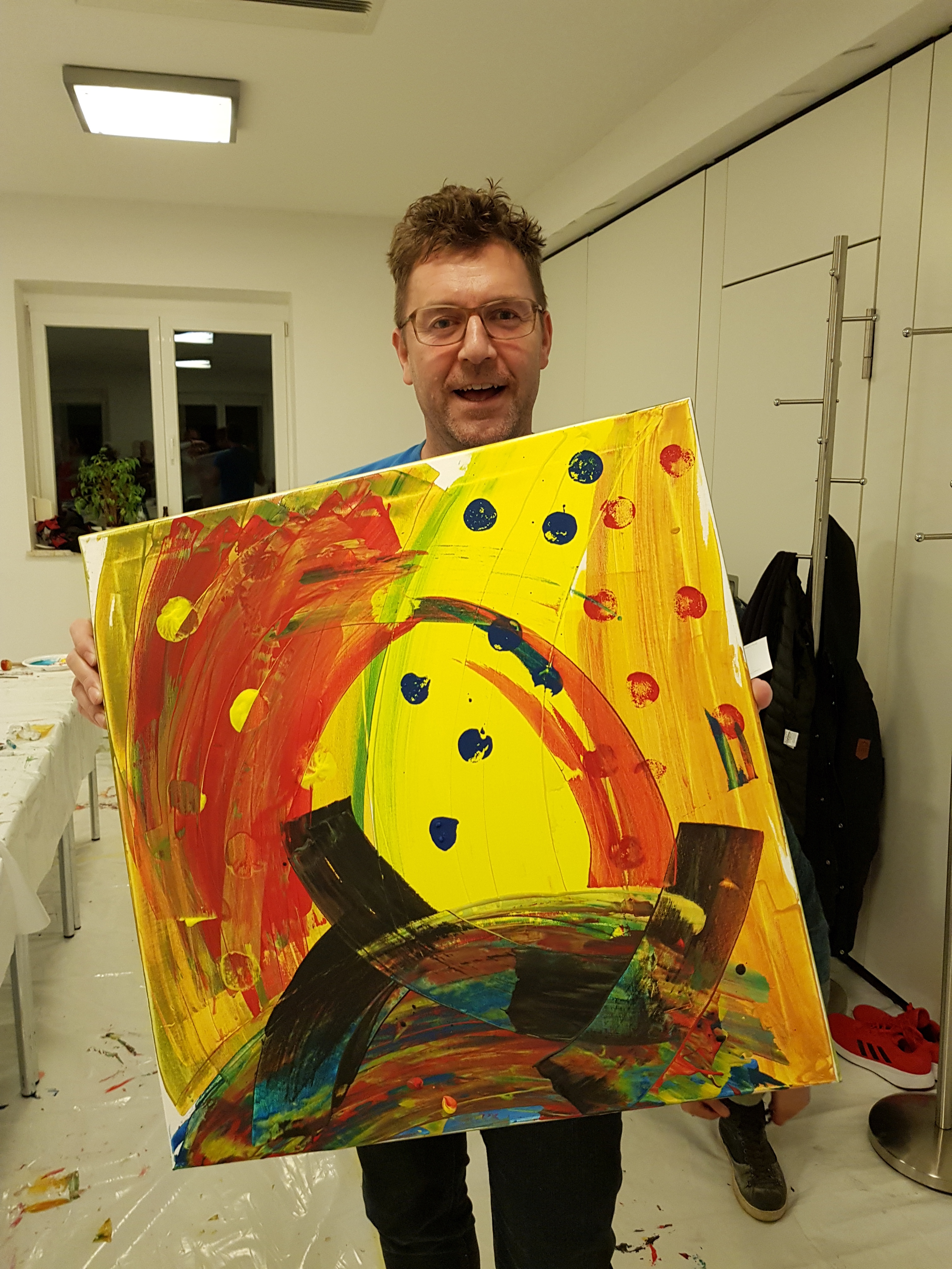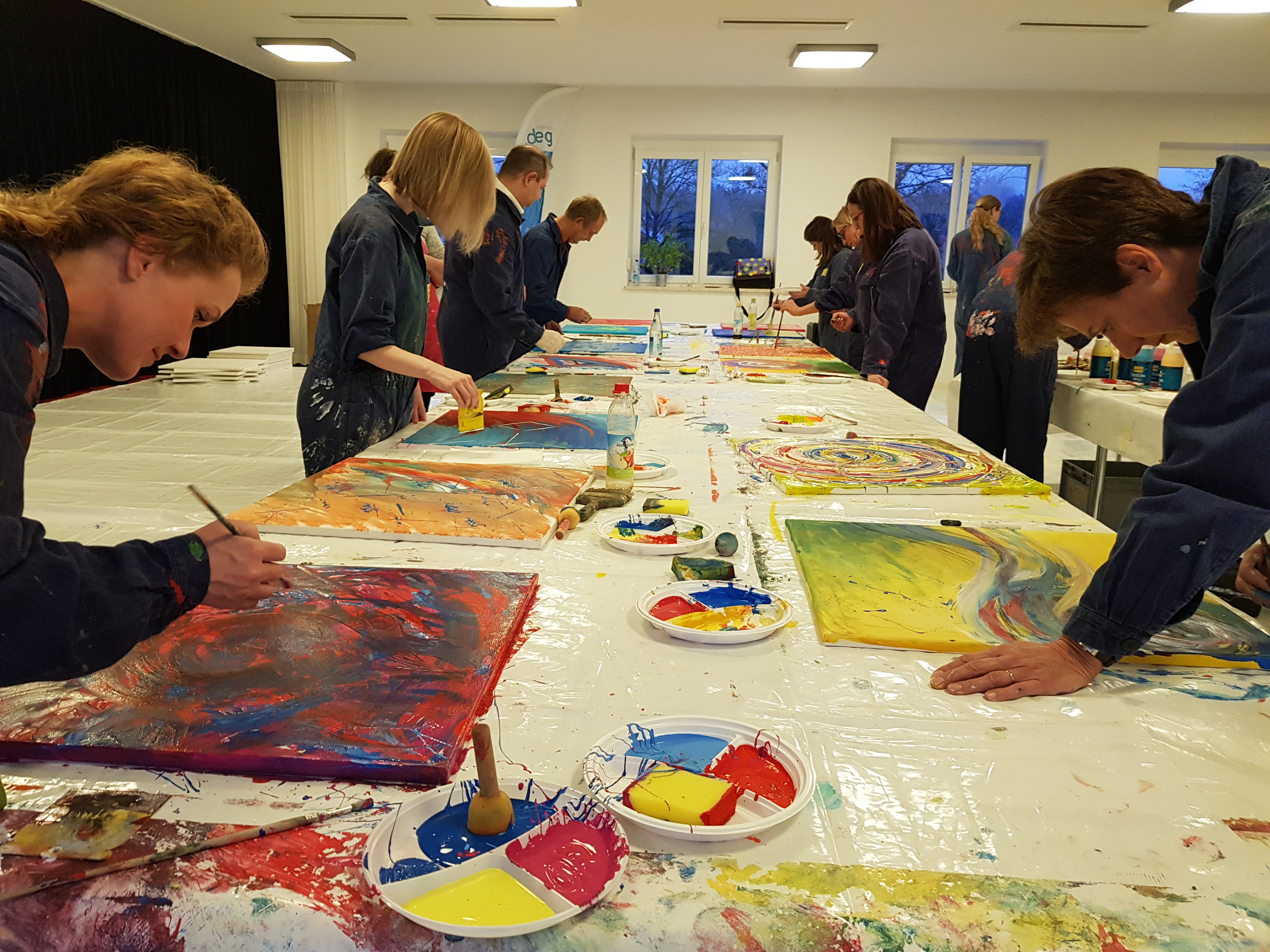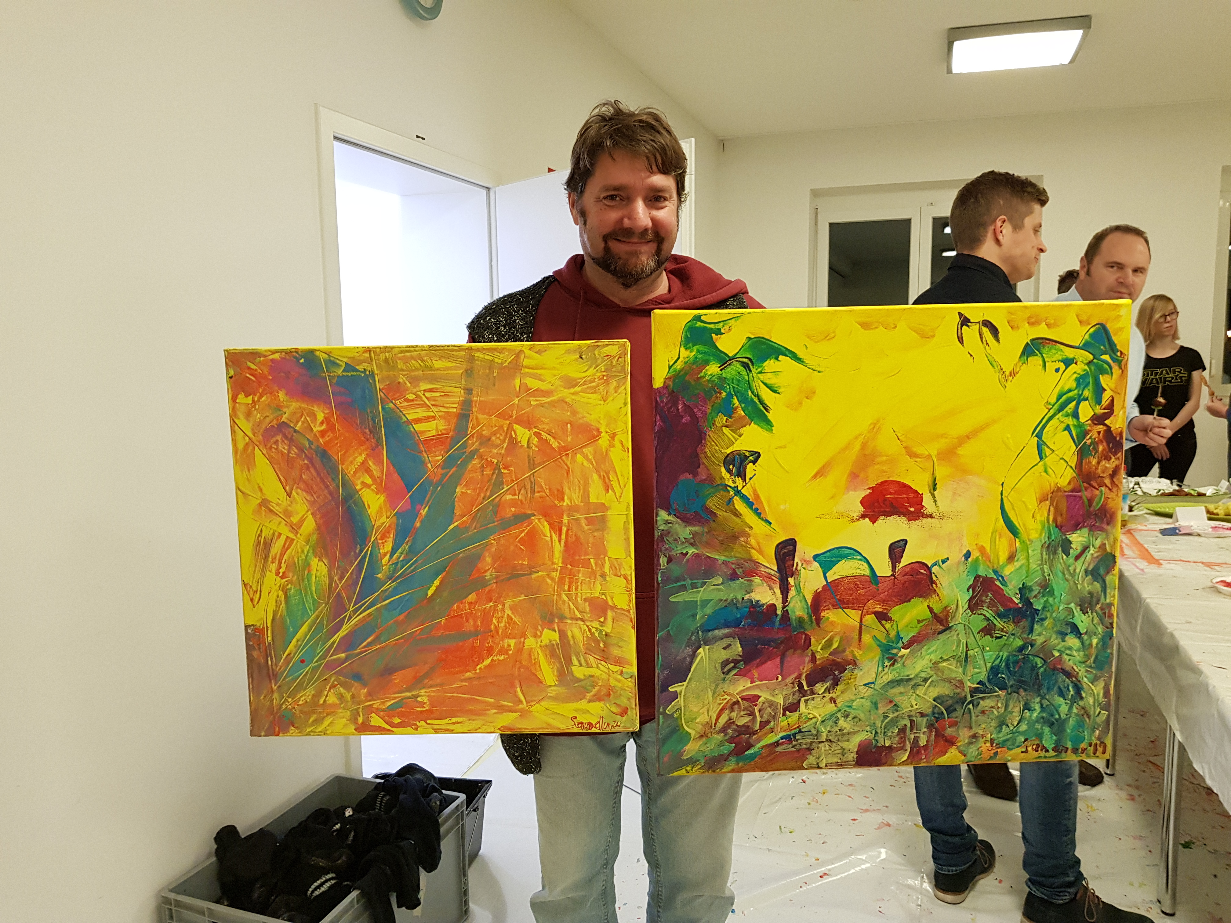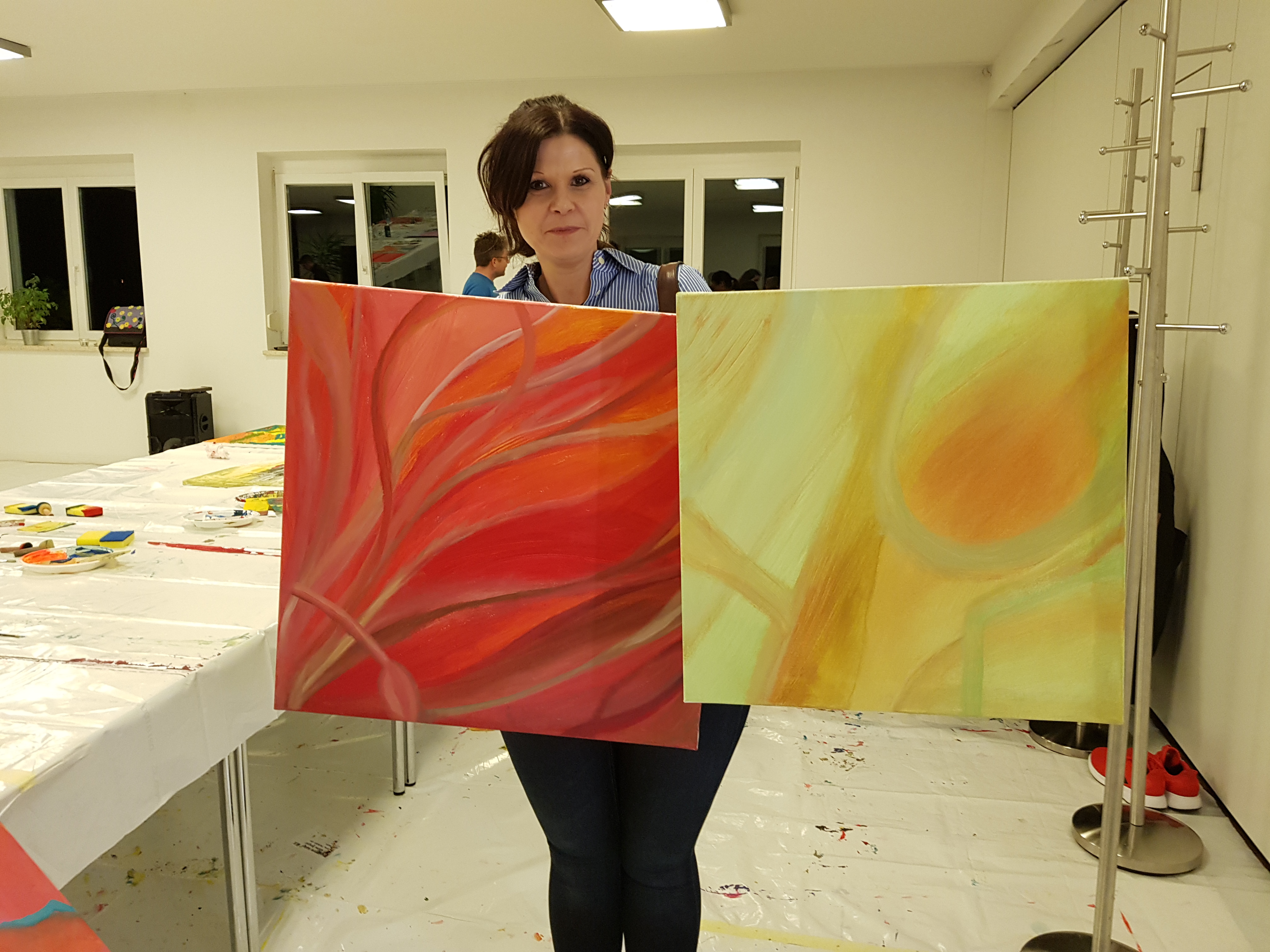 Anschließend machten sich die Teilnehmer an die Arbeit. Jeder konnte sein eigenes Bild schaffen. Ohne Vorgabe, mit allen möglichen Farben und Malerutensilien. So entstanden bereits nach kurzer Zeit richtige Meisterwerke. Dabei gab Etelka Kovacs-Koller immer wieder kleine Tipps und ging individuell auf die Bilder und die Person ein. „Selbst Leute, die von sich behaupten nicht kreativ zu sein, erfahren hier, dass sie alle notwendigen Fähigkeiten haben. Es entsteht immer etwas Besonderes. Genauso ist es im Leben, im Unternehmen. Wir haben alle Fähigkeiten- müssen sie oft nur entdecken, fördern und ab und zu auch einfordern!“, gab Etelka Kovacs-Koller den Teilnehmern mit auf den Weg. Und wenn man das Glänzen in den Augen der Unternehmer sah- sowohl beim Malen als auch beim Betrachten des fertigen Werkes- konnte man erkennen, dass es jeden viel Spaß bereitete sich selbst besser kennenzulernen und jeder für sich etwas mitnehmen konnte.