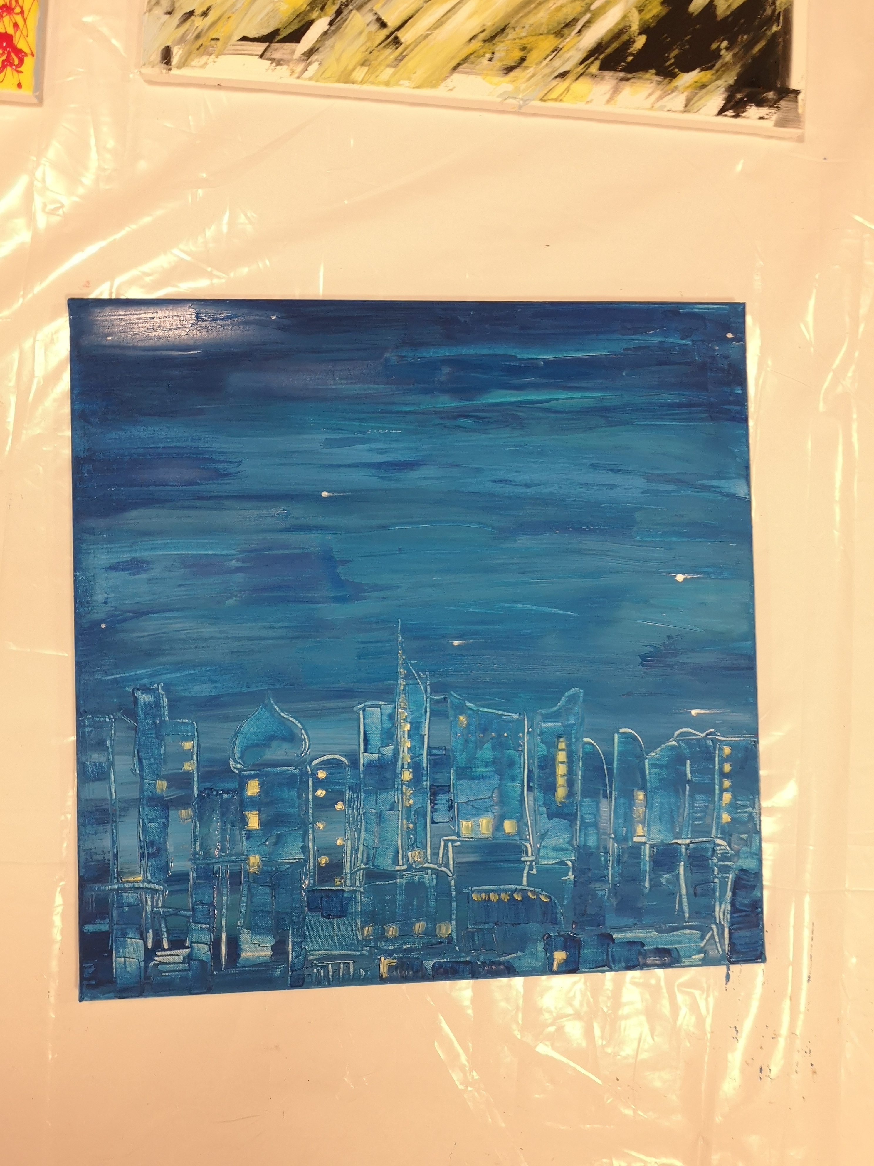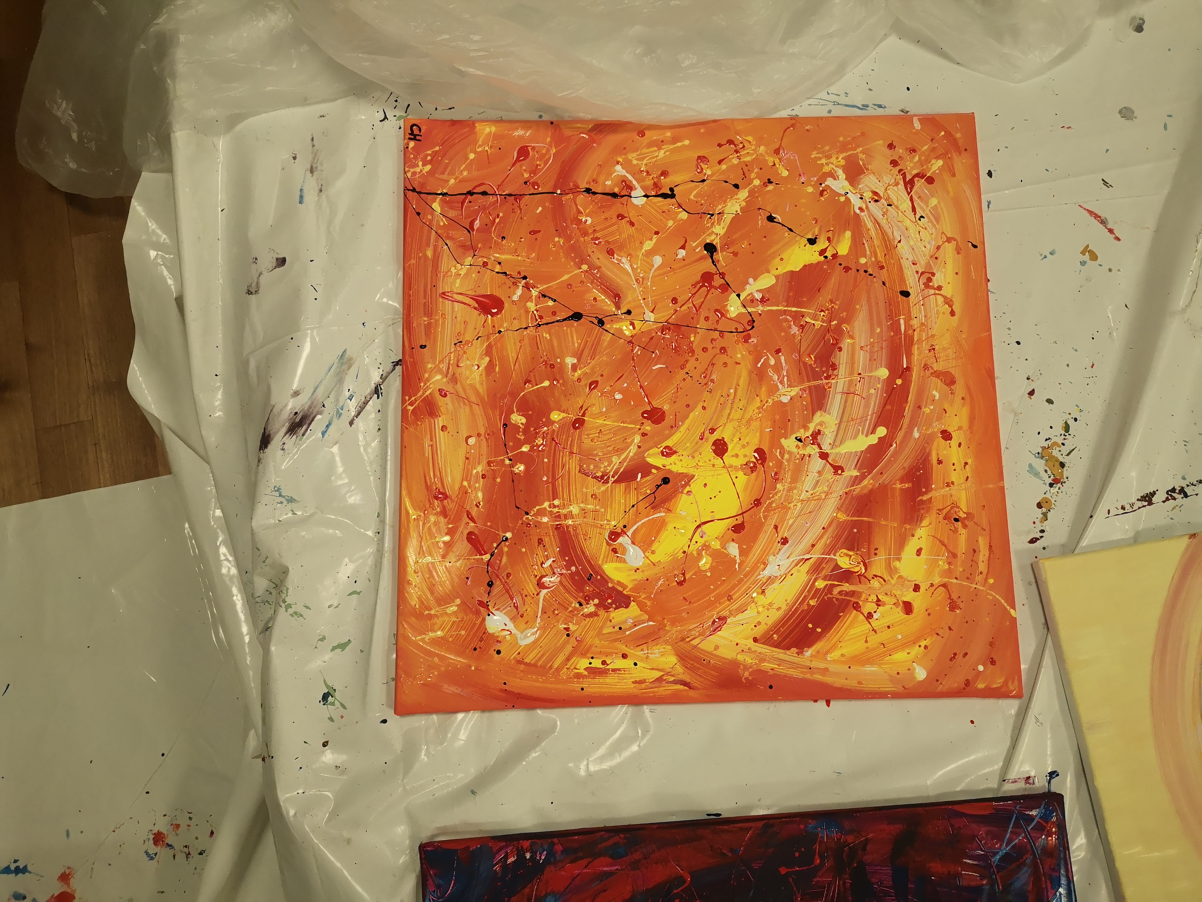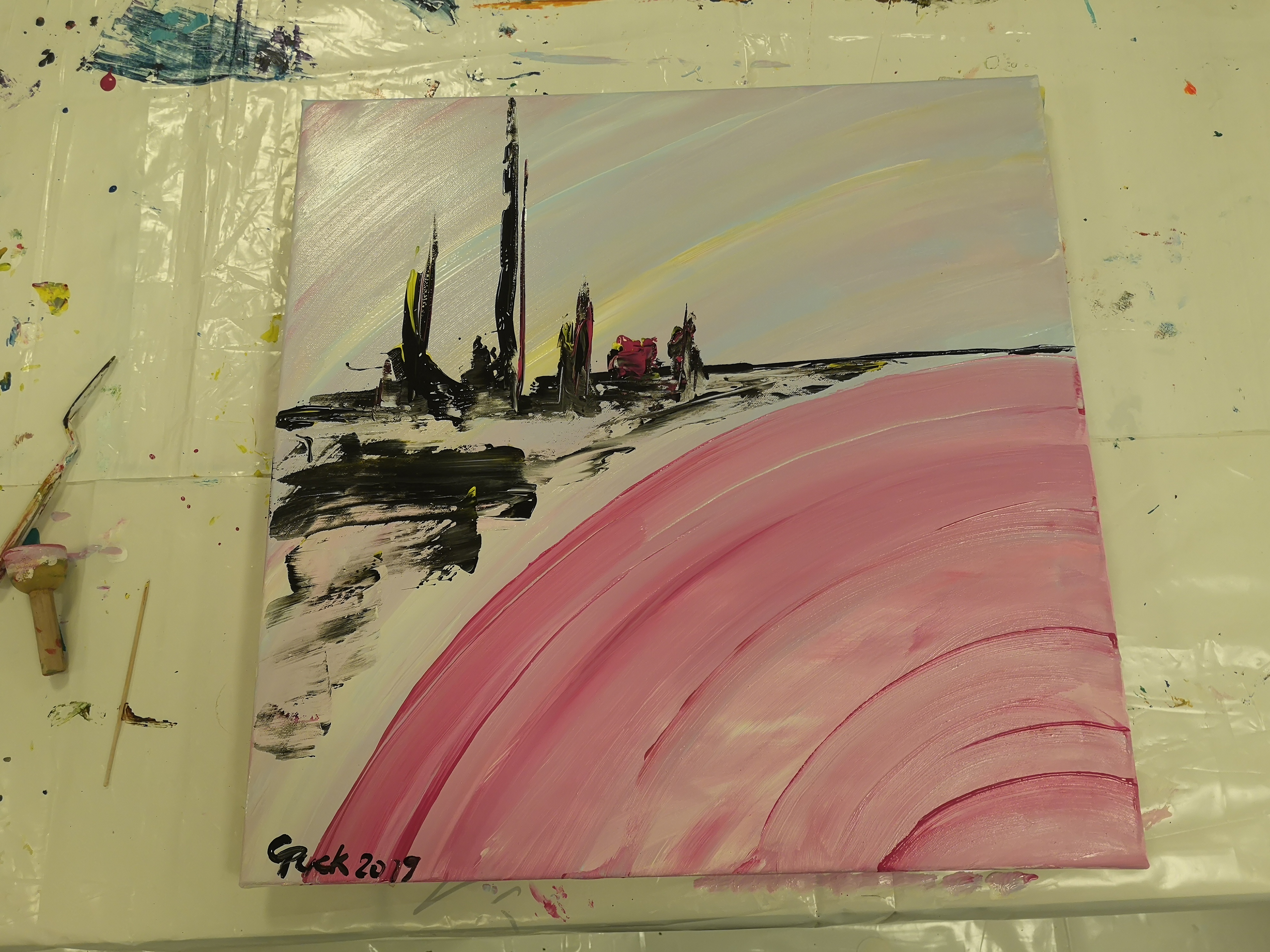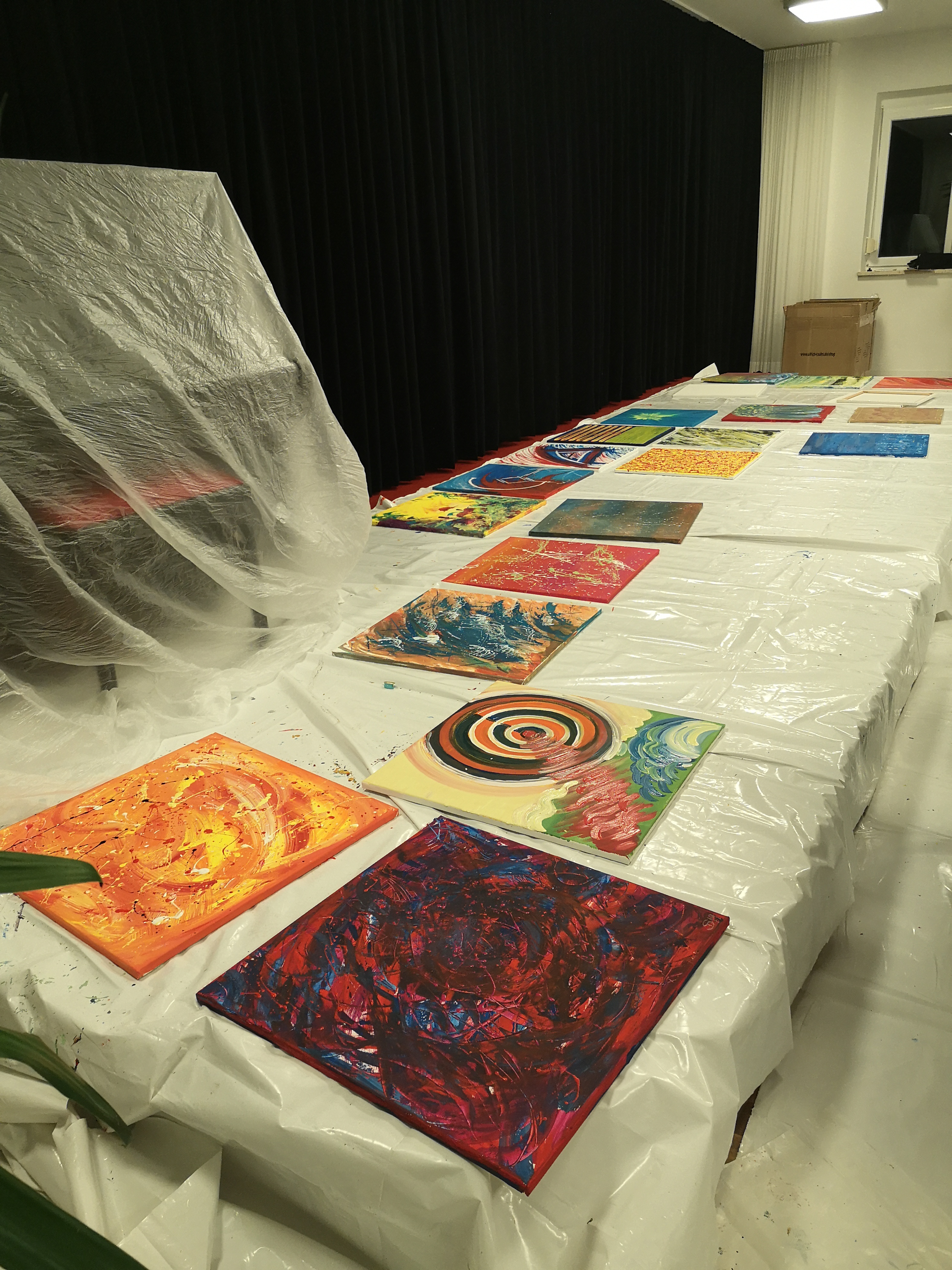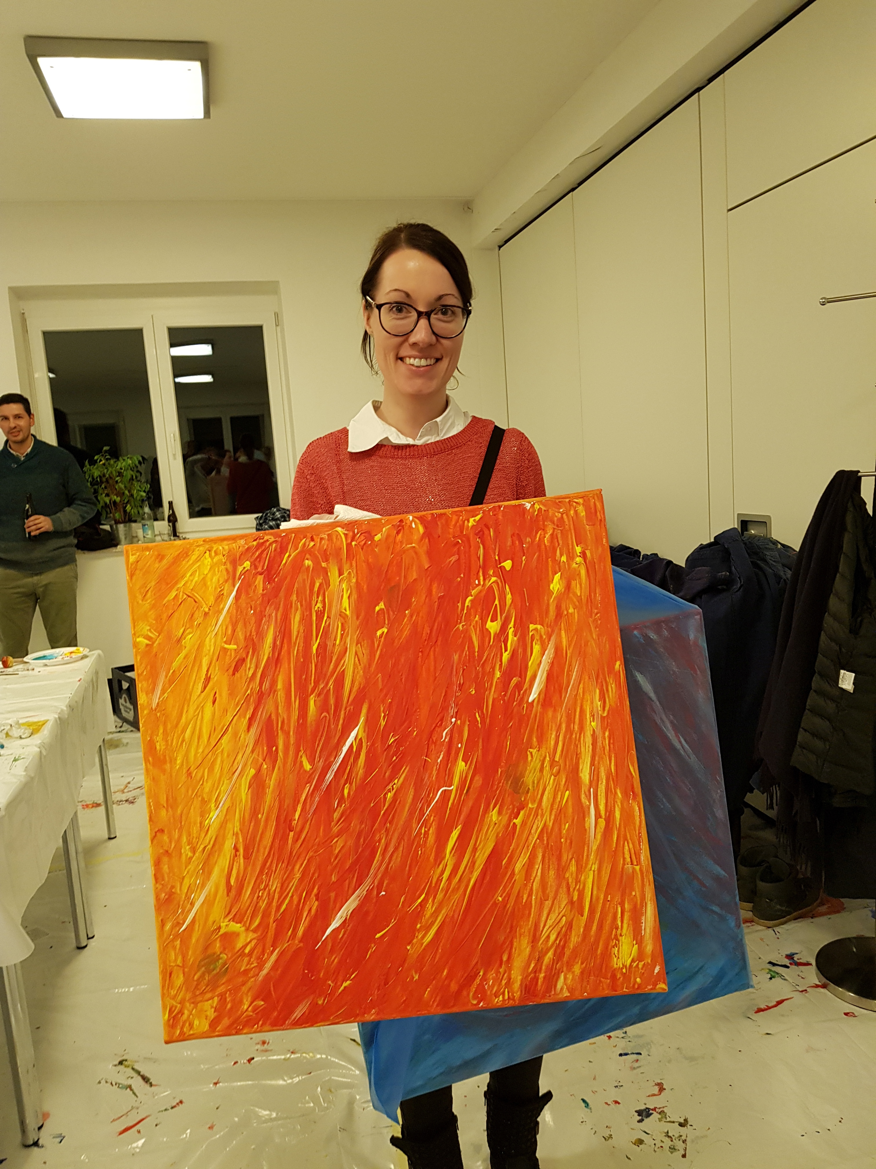 Anschließend machten sich die Teilnehmer an die Arbeit. Jeder konnte sein eigenes Bild schaffen. Ohne Vorgabe, mit allen möglichen Farben und Malerutensilien. So entstanden bereits nach kurzer Zeit richtige Meisterwerke. Dabei gab Etelka Kovacs-Koller immer wieder kleine Tipps und ging individuell auf die Bilder und die Person ein. „Selbst Leute, die von sich behaupten nicht kreativ zu sein, erfahren hier, dass sie alle notwendigen Fähigkeiten haben. Es entsteht immer etwas Besonderes. Genauso ist es im Leben, im Unternehmen. Wir haben alle Fähigkeiten- müssen sie oft nur entdecken, fördern und ab und zu auch einfordern!“, gab Etelka Kovacs-Koller den Teilnehmern mit auf den Weg. Und wenn man das Glänzen in den Augen der Unternehmer sah- sowohl beim Malen als auch beim Betrachten des fertigen Werkes- konnte man erkennen, dass es jeden viel Spaß bereitete sich selbst besser kennenzulernen und jeder für sich etwas mitnehmen konnte.