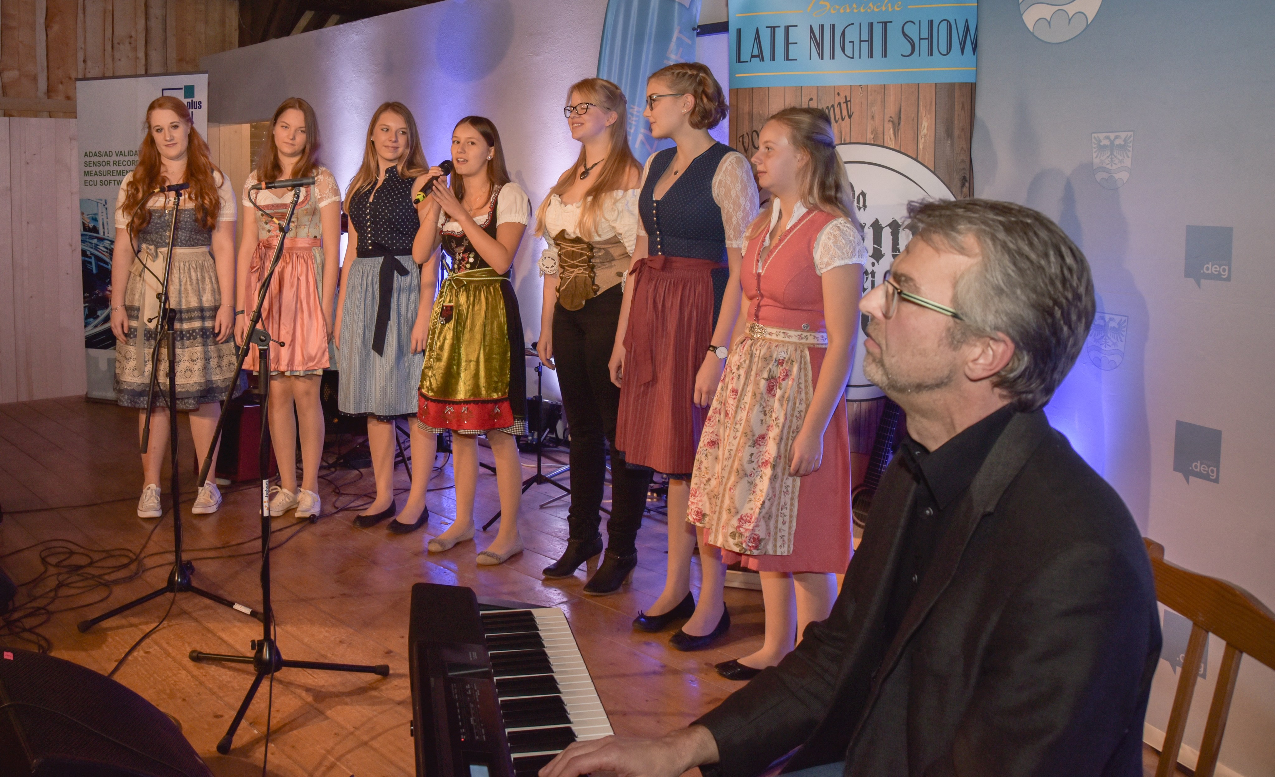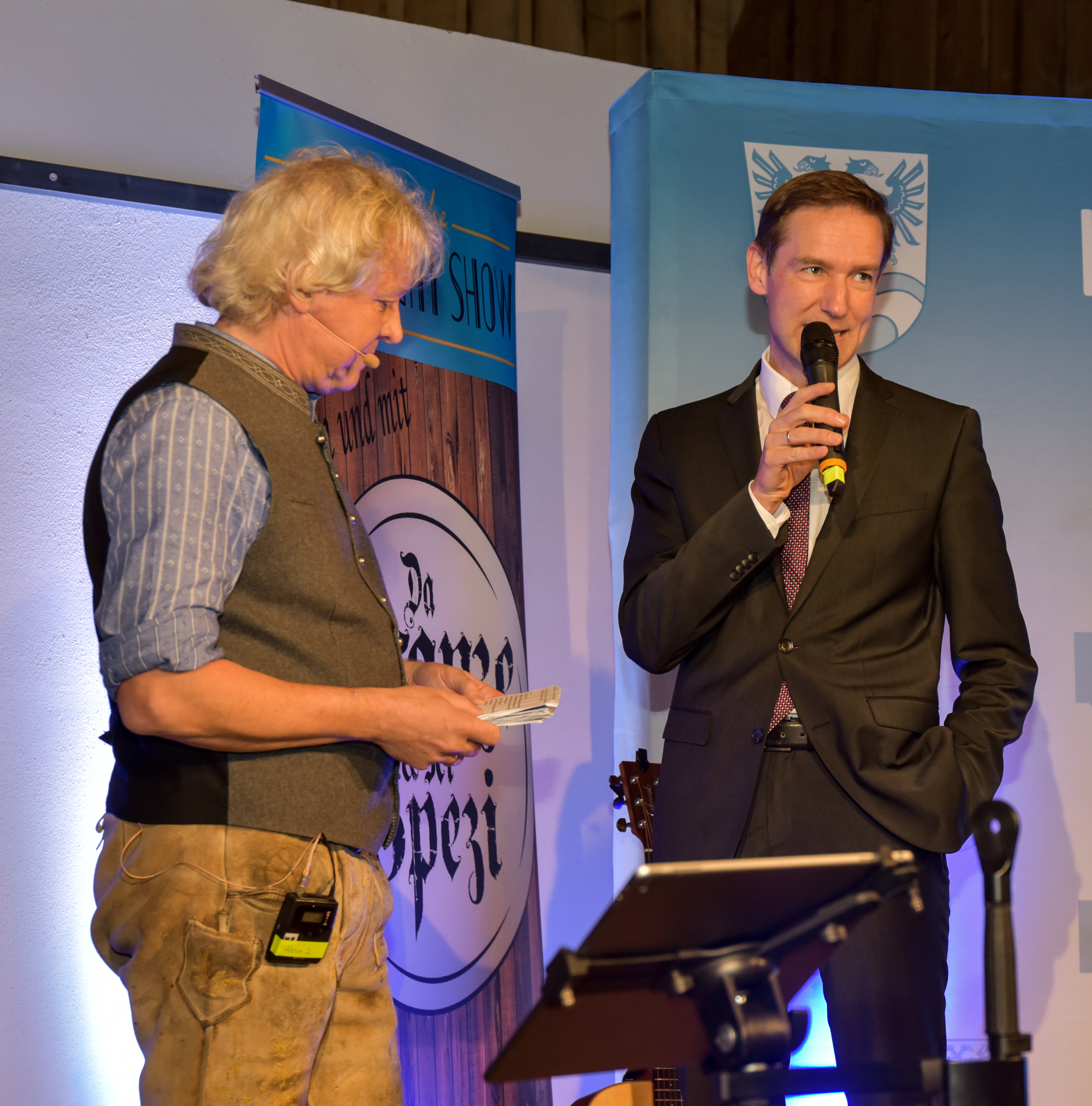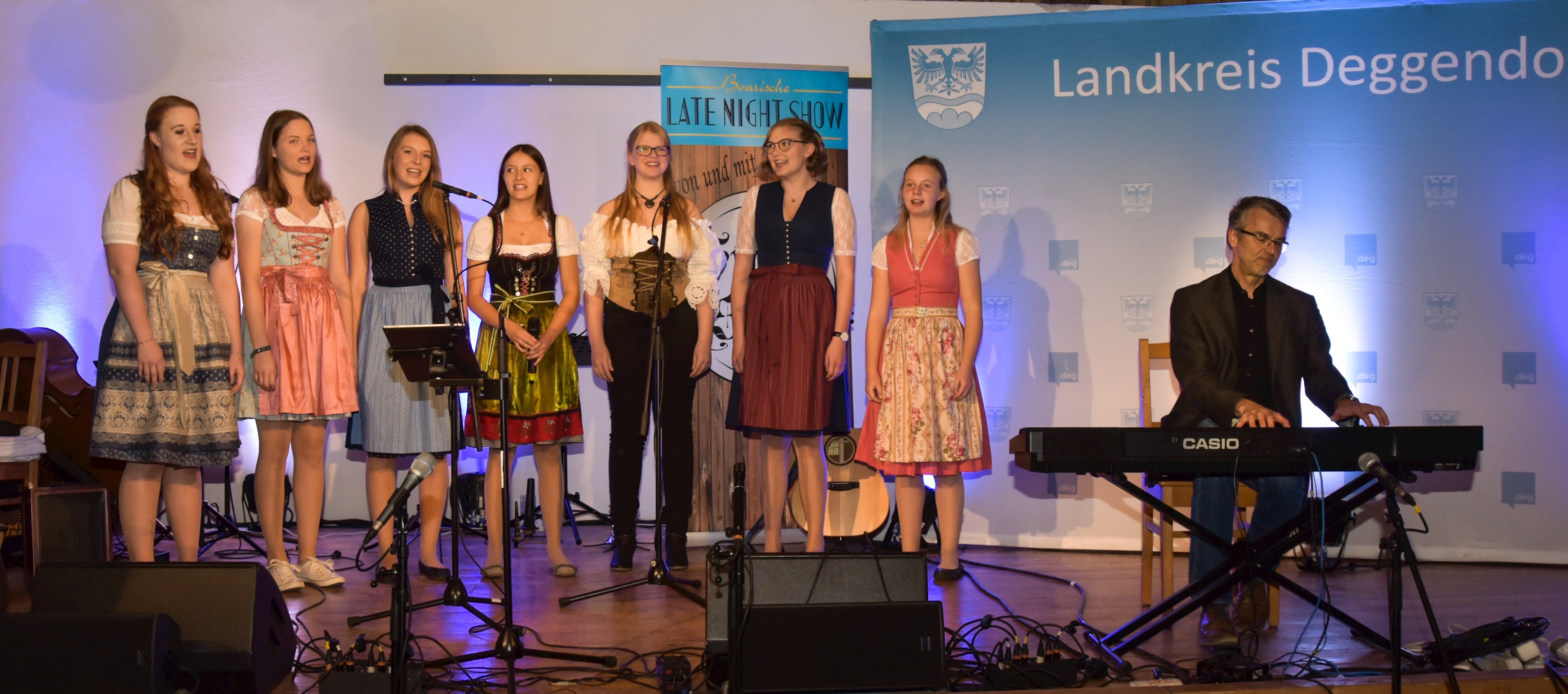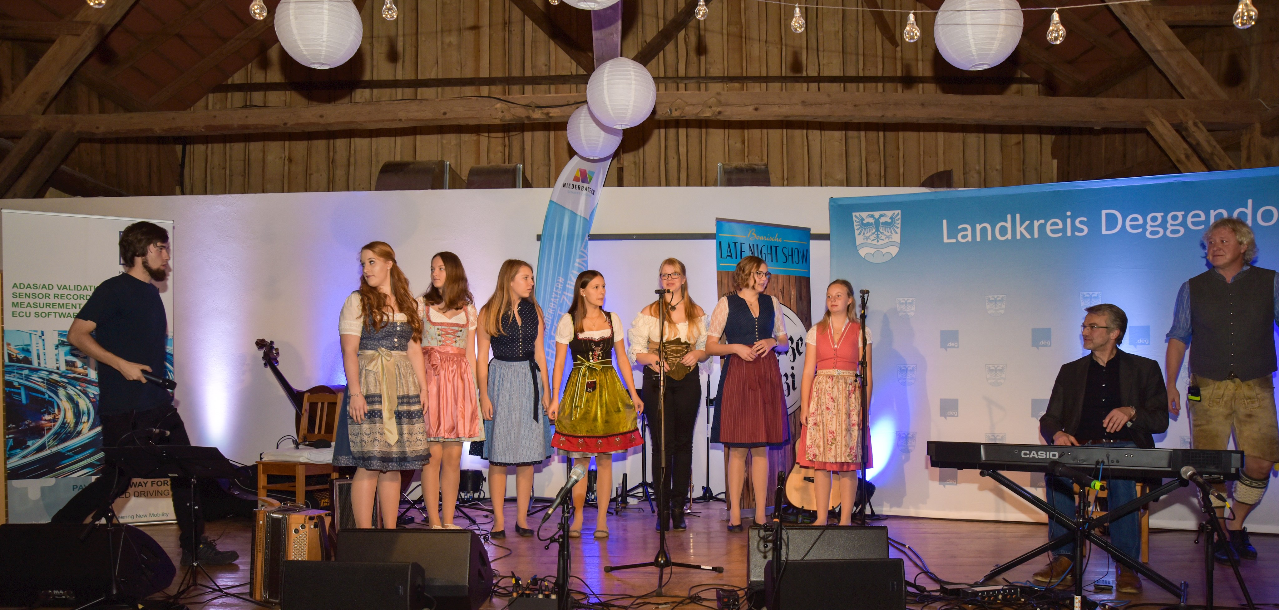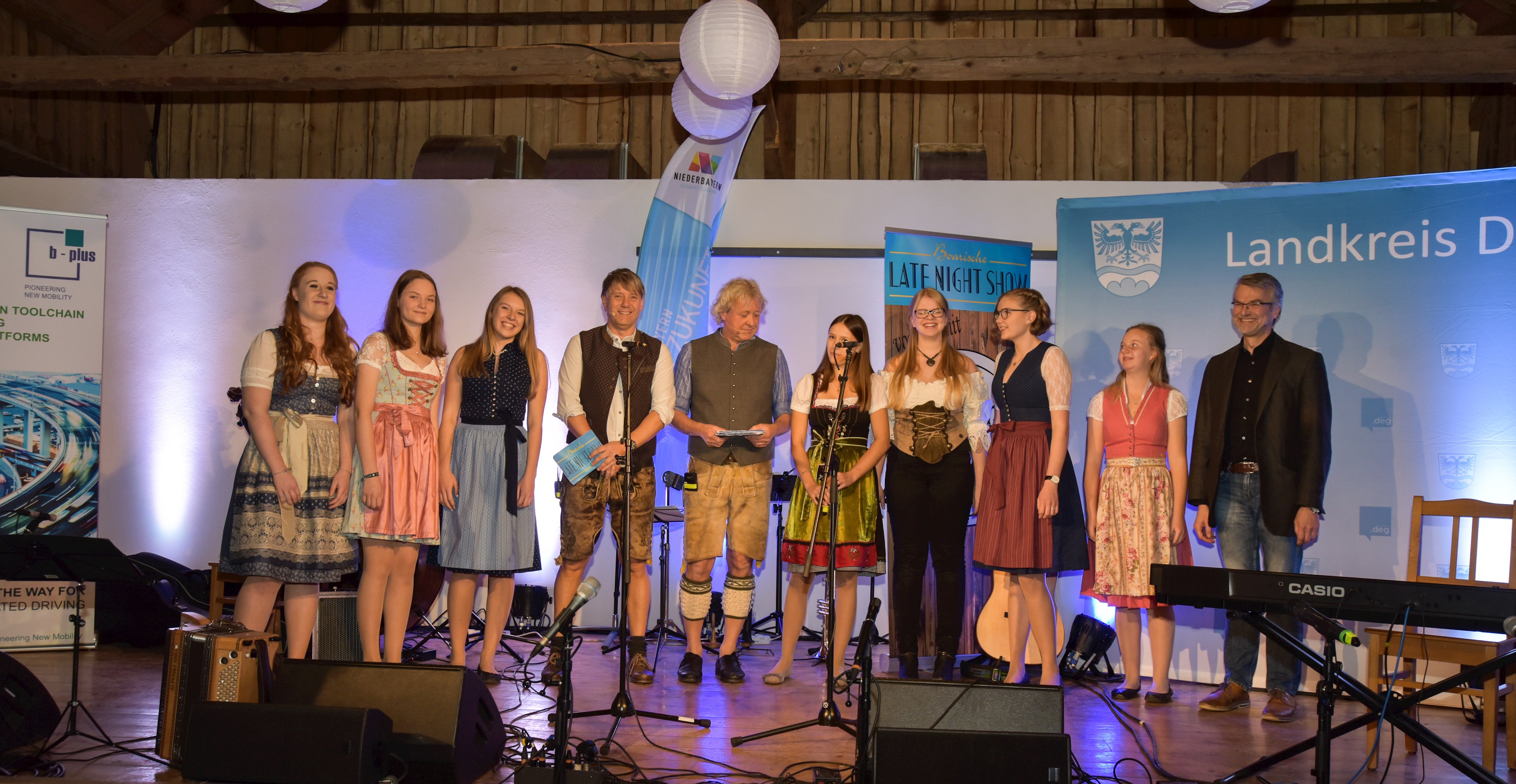 Durch das Programm führte das Duo Franz Moosauer und Adrian Kreuzer alias „Da Franze und sei Spezi“. Sie sorgten mit witzigen Kommentaren und eigenen Liedern von Beginn an für eine angenehme Stimmung im Stadl. Einer Abordnung des Chors vom St.-Gotthard-Gymnasium Niederalteich mit Lehrer Bernhard Falk war nach der Begrüßung der erste Act vorbehalten: mit „Segh i as Deggendorfer Land“, dem Gewinner-Lied des vom Regionalmanagement ausgeschriebenen „Landkreissongs“. Dabei „malten“ die 7 Sängerinnen für die Gäste gesanglich wunderbare Bilder vom Landkreis Deggendorf: der Blick schweift vom Dreitannenriegel ins Tal. Mit seinen wunderbaren Städten, Gemeinden, Kirchtürmen, der Donau, der Isar und den Klöstern. Ihr Lehrer Bernhard Falk stellte anschließend solo unter Beweis, welch herausragender Musiker er ist. Bei seinen 3 vorgetragenen Liedern zeigte er sehr humorvoll und wortkreativ Alltagsszenen mit Katzen, einen Skoda Fabia und der Liebe.