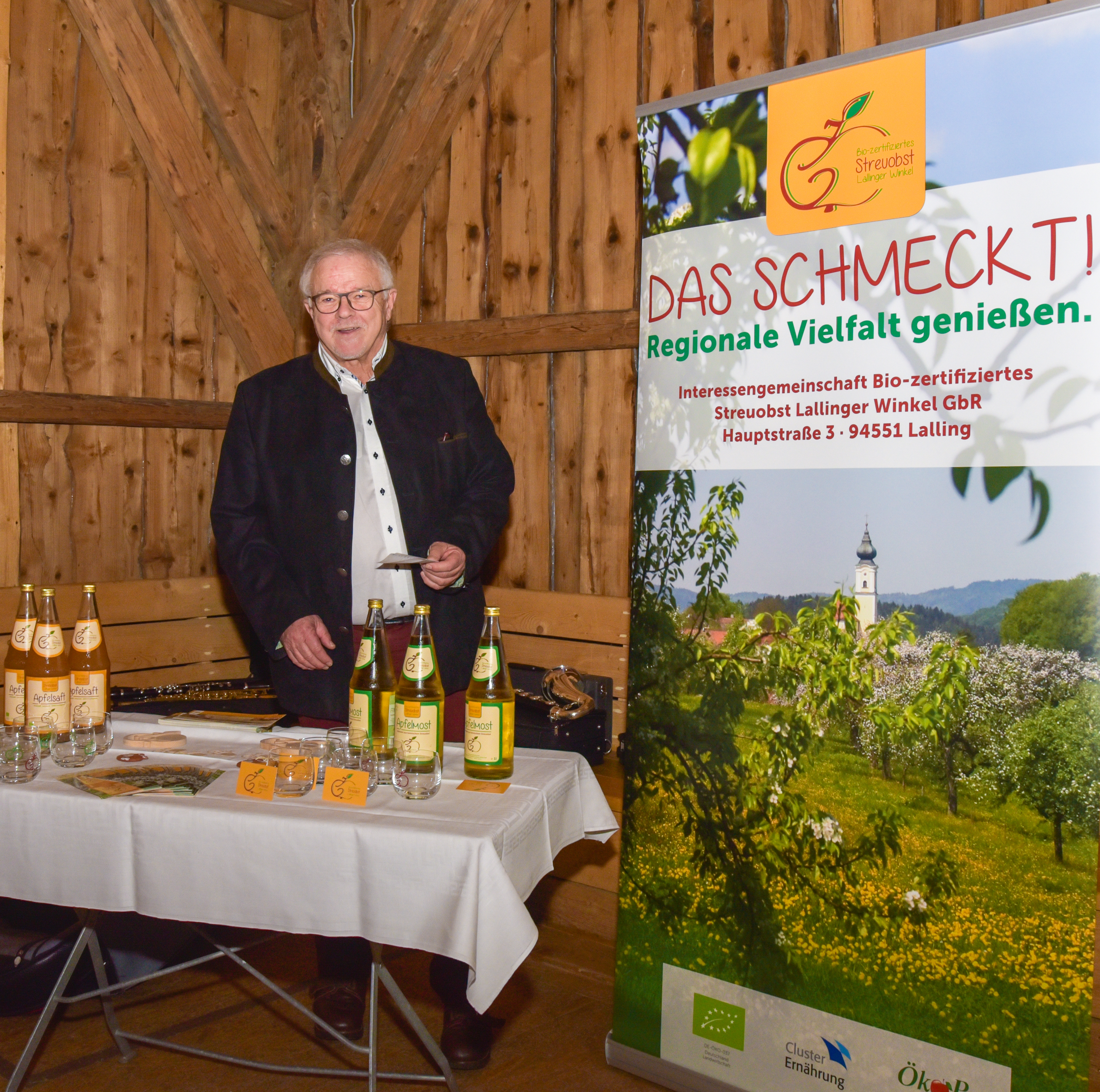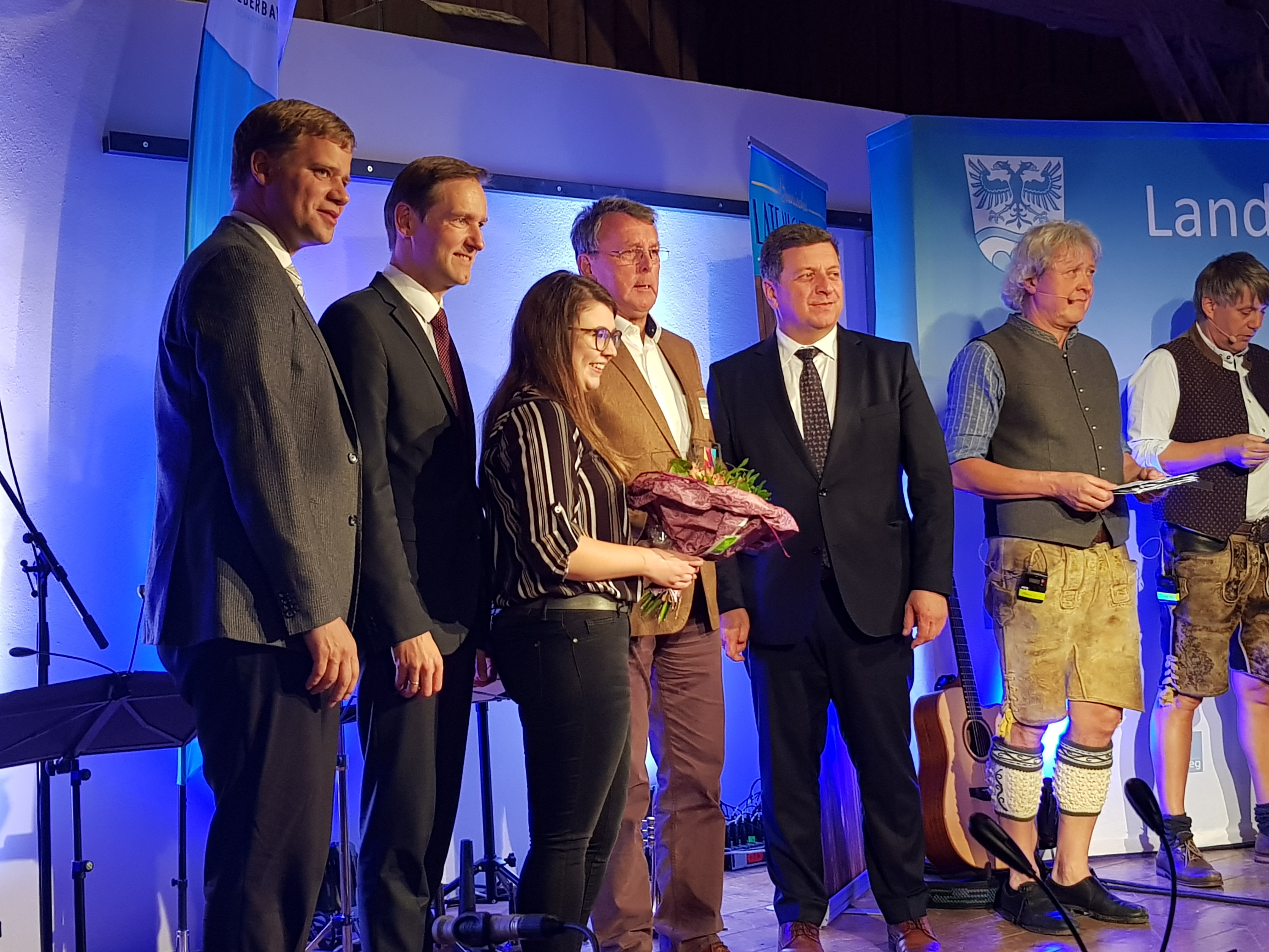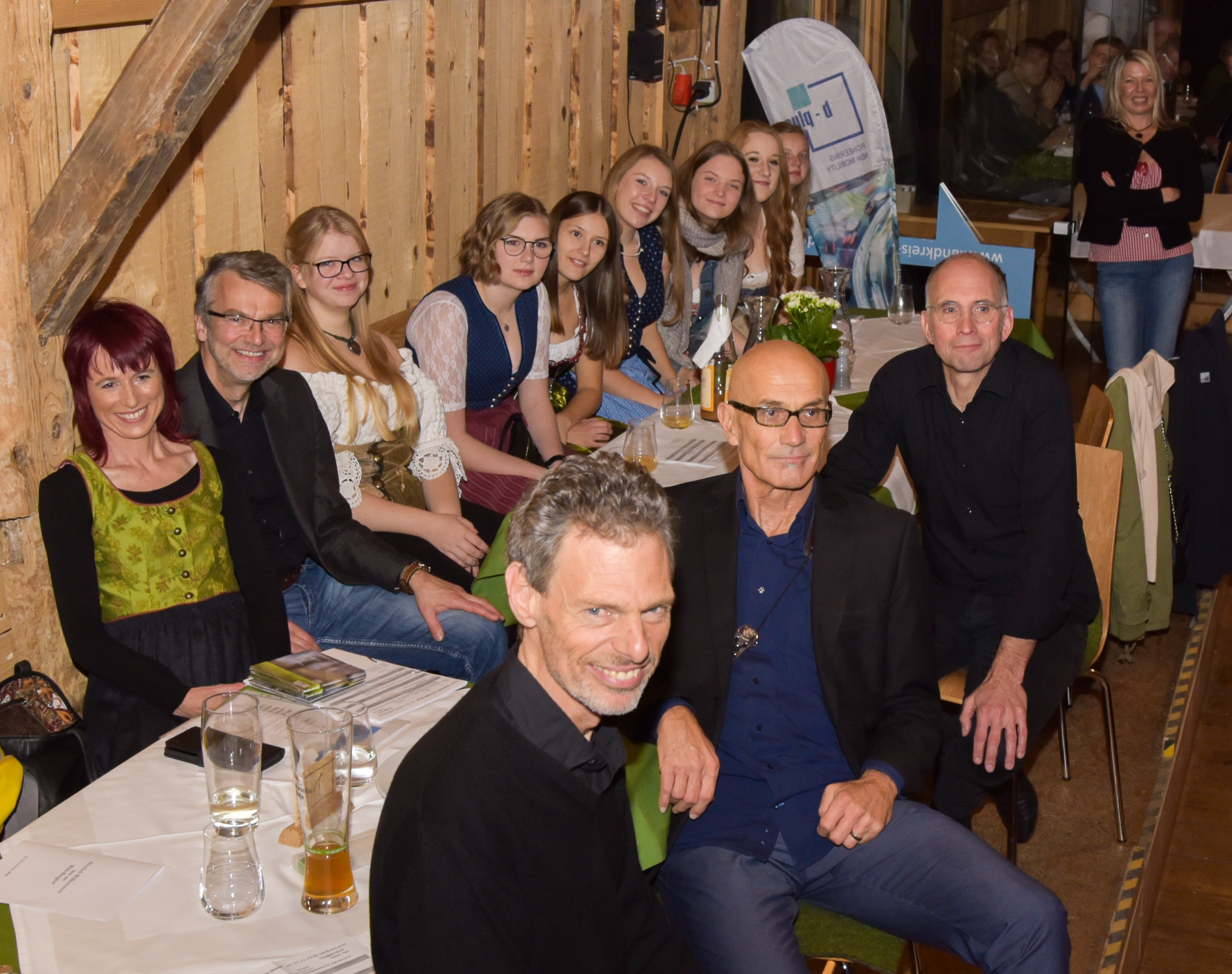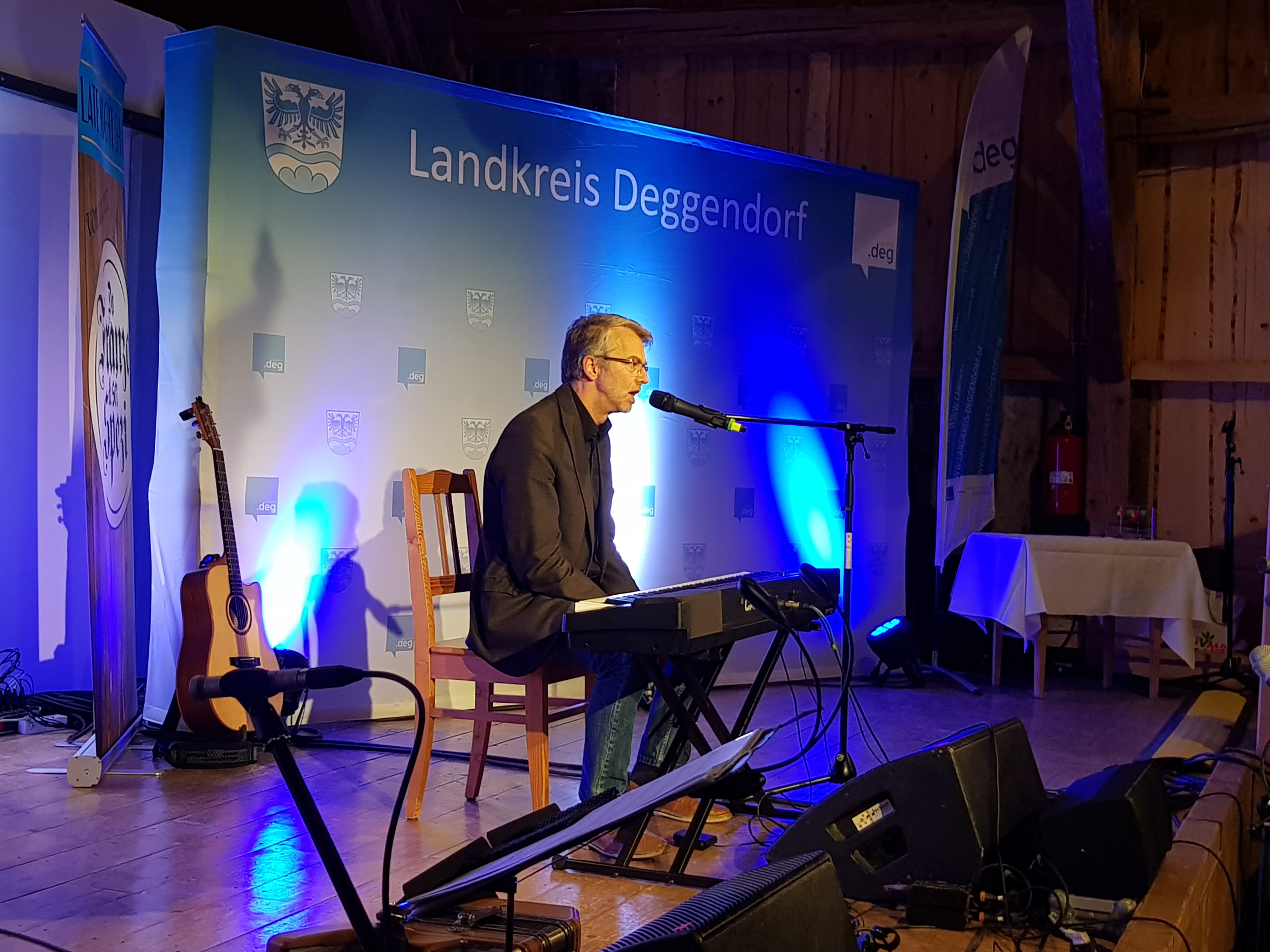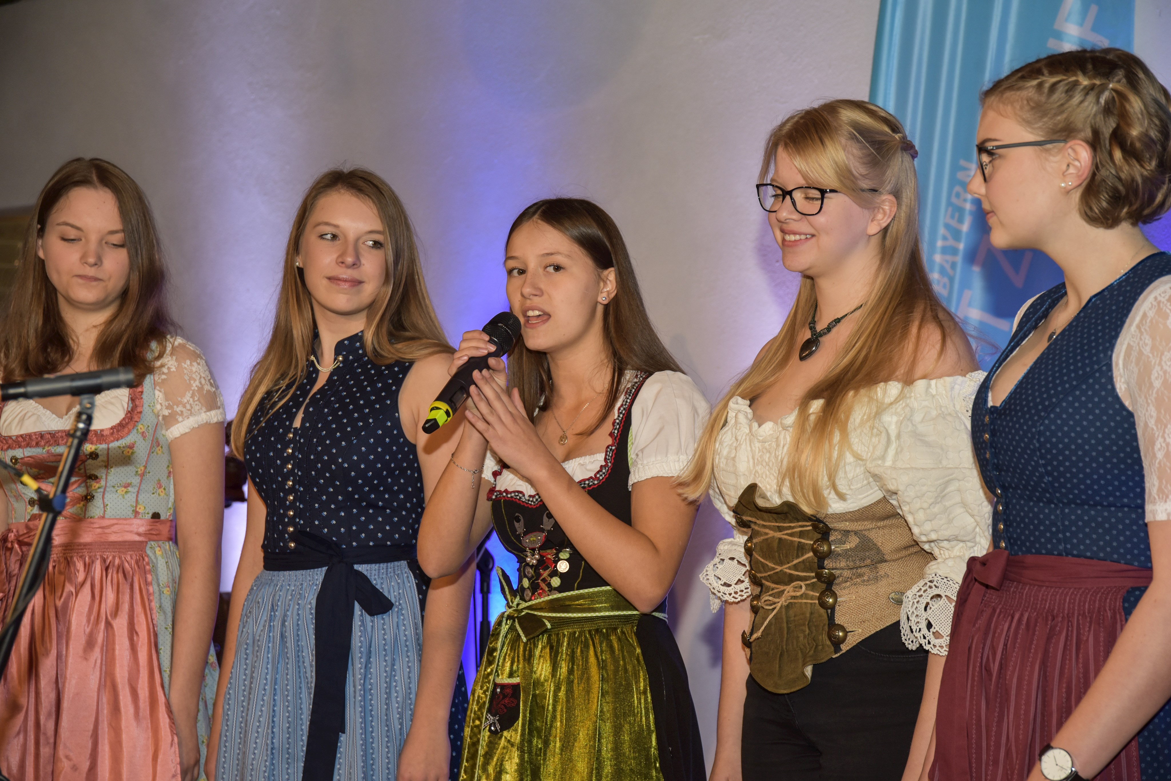 Durch das Programm führte das Duo Franz Moosauer und Adrian Kreuzer alias „Da Franze und sei Spezi“. Sie sorgten mit witzigen Kommentaren und eigenen Liedern von Beginn an für eine angenehme Stimmung im Stadl. Einer Abordnung des Chors vom St.-Gotthard-Gymnasium Niederalteich mit Lehrer Bernhard Falk war nach der Begrüßung der erste Act vorbehalten: mit „Segh i as Deggendorfer Land“, dem Gewinner-Lied des vom Regionalmanagement ausgeschriebenen „Landkreissongs“. Dabei „malten“ die 7 Sängerinnen für die Gäste gesanglich wunderbare Bilder vom Landkreis Deggendorf: der Blick schweift vom Dreitannenriegel ins Tal. Mit seinen wunderbaren Städten, Gemeinden, Kirchtürmen, der Donau, der Isar und den Klöstern. Ihr Lehrer Bernhard Falk stellte anschließend solo unter Beweis, welch herausragender Musiker er ist. Bei seinen 3 vorgetragenen Liedern zeigte er sehr humorvoll und wortkreativ Alltagsszenen mit Katzen, einen Skoda Fabia und der Liebe.