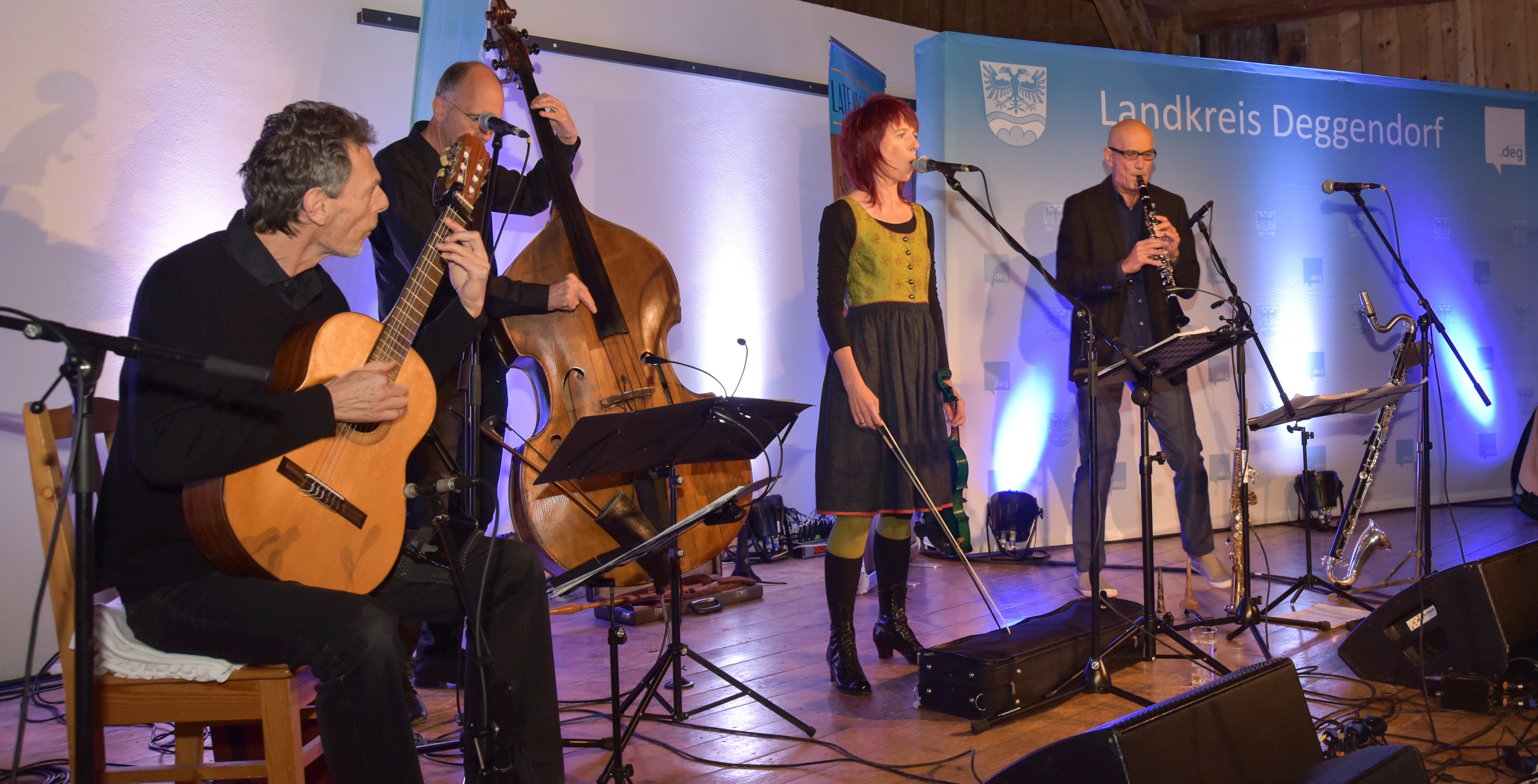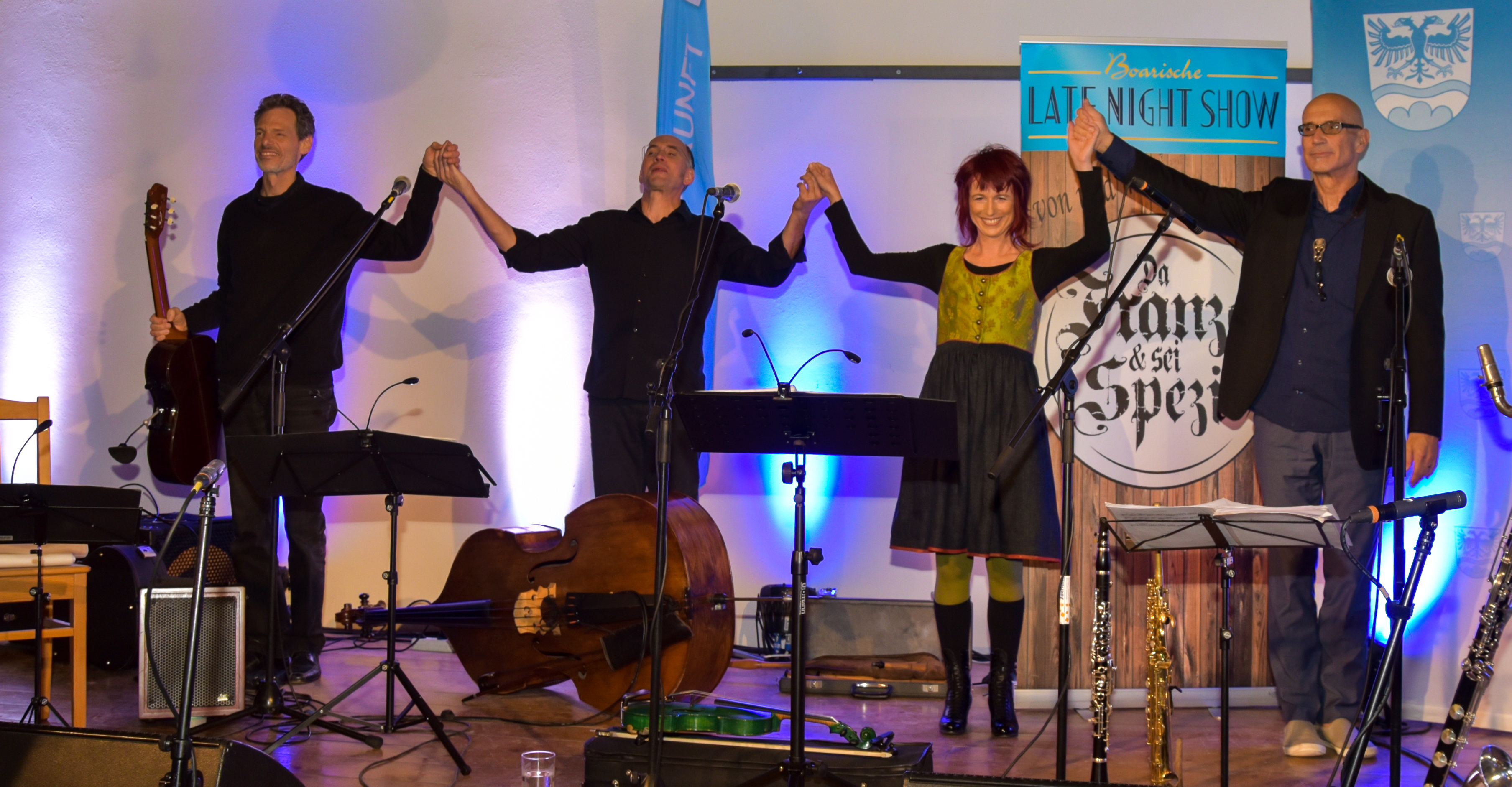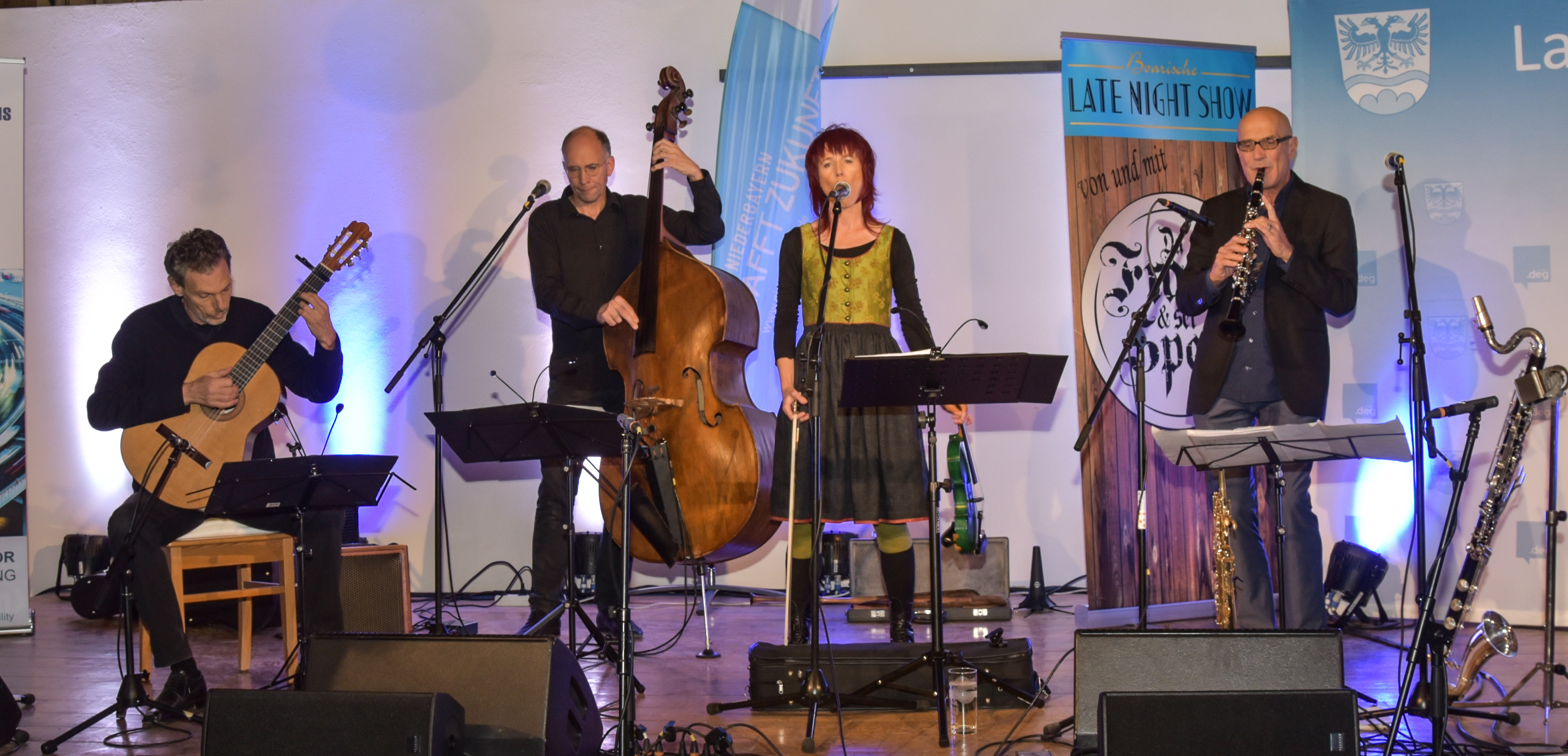 Zum Abschluss des Ehrenabends wartete auf die Gäste das absolute Highlight: die aus Hengersberg stammende Monika Drasch präsentierte mit ihrer Band (Norbert Nagel, Christian Gruber, Alex Haas) ihr aktuelles Programm „Auf der böhmischen Grenz“. Von den Eigenkompositionen von Heimatliedern mit sozialkritischen und gefühlsintensiven Inhalten, waren die Gäste fasziniert und überrascht zugleich. Die exzellenten Musiker begeisterten durch Virtuosität und musikantische Spielfreude – und schnell ist klar, dass sie nicht alle aus der Volksmusik kommen. Da vereinen sich Dreiklangseligkeit, klassische Kammermusik und Jazz. So entstanden überraschende und spannungsvolle Momente: Eine höchst musikalisch in Szene gesetzte Grenzbegehung. Und Monika Drasch gab mit ihrer Bühnenpräsenz den Ton an. Im Austausch mit den Moderatoren wurde schnell klar, dass man sich kennt: so wurde neben den musikalischen Gesprächen auch über gemeinsame Schulzeiten gesprochen- mit allerhand Anekdoten.