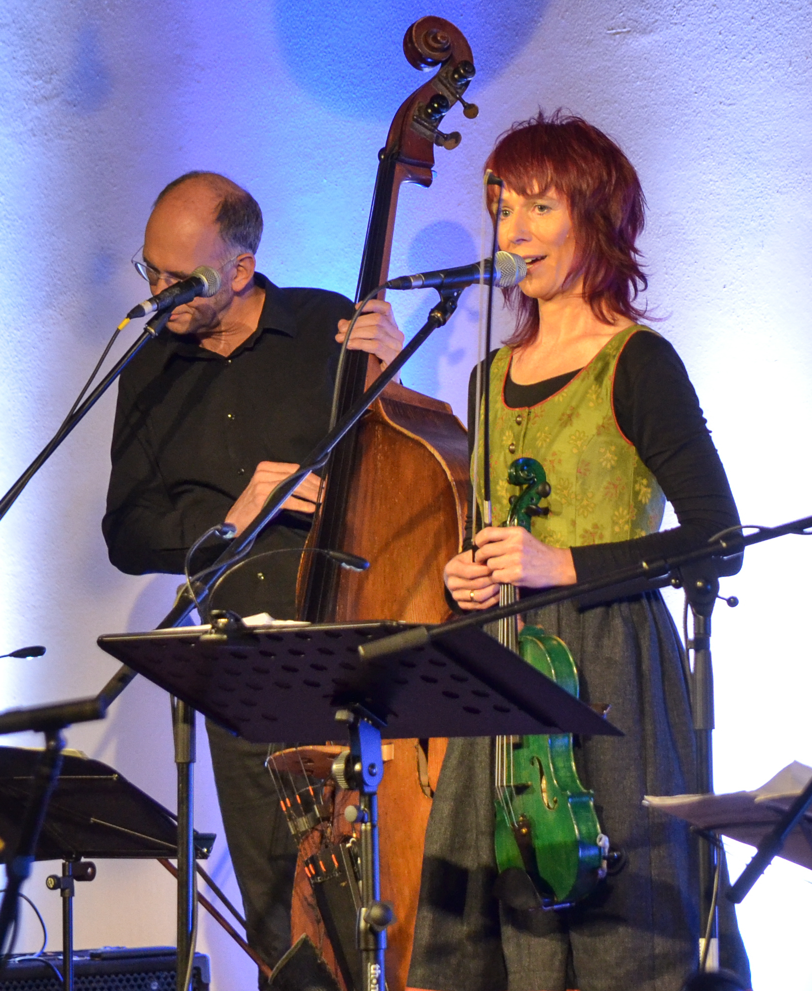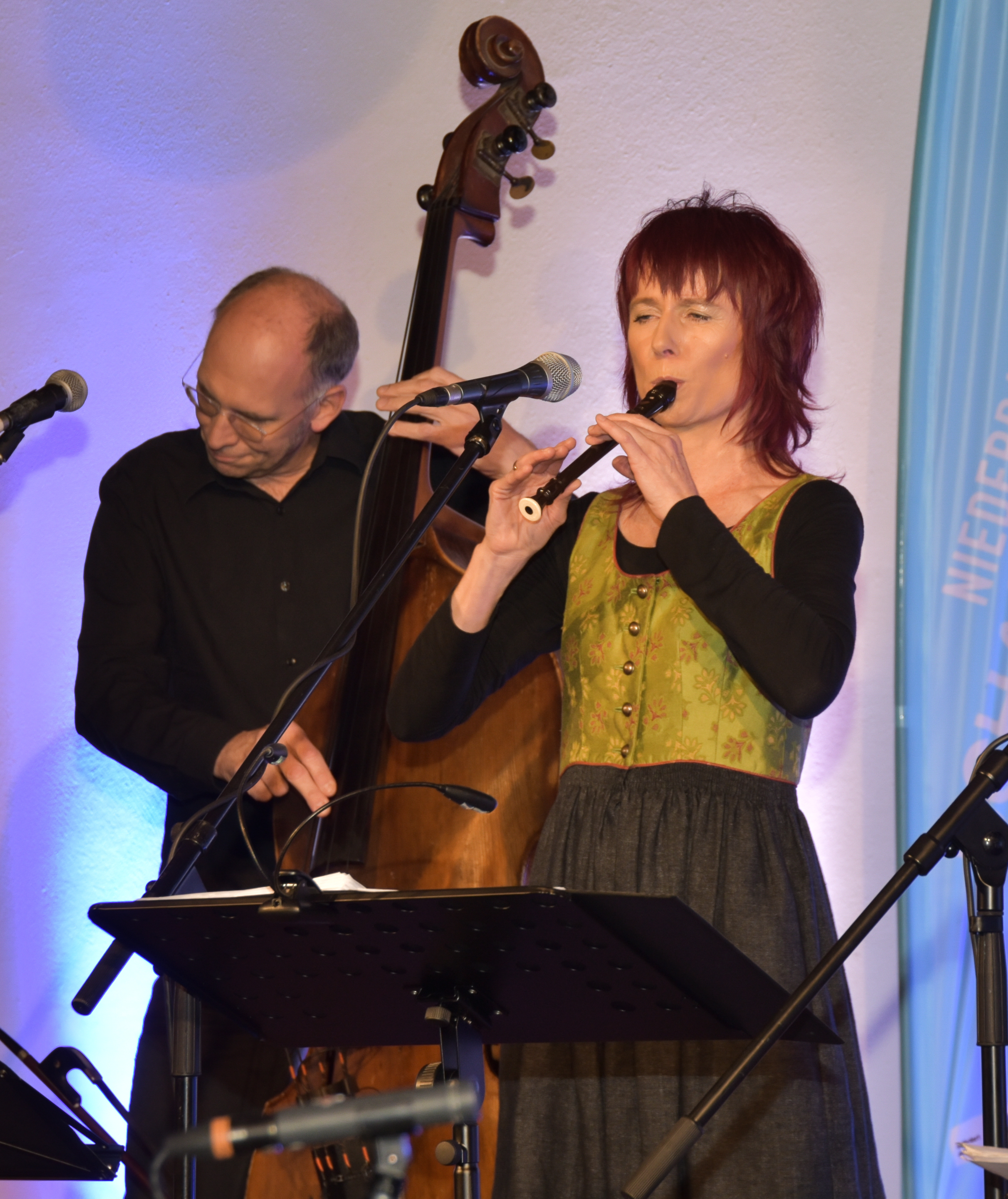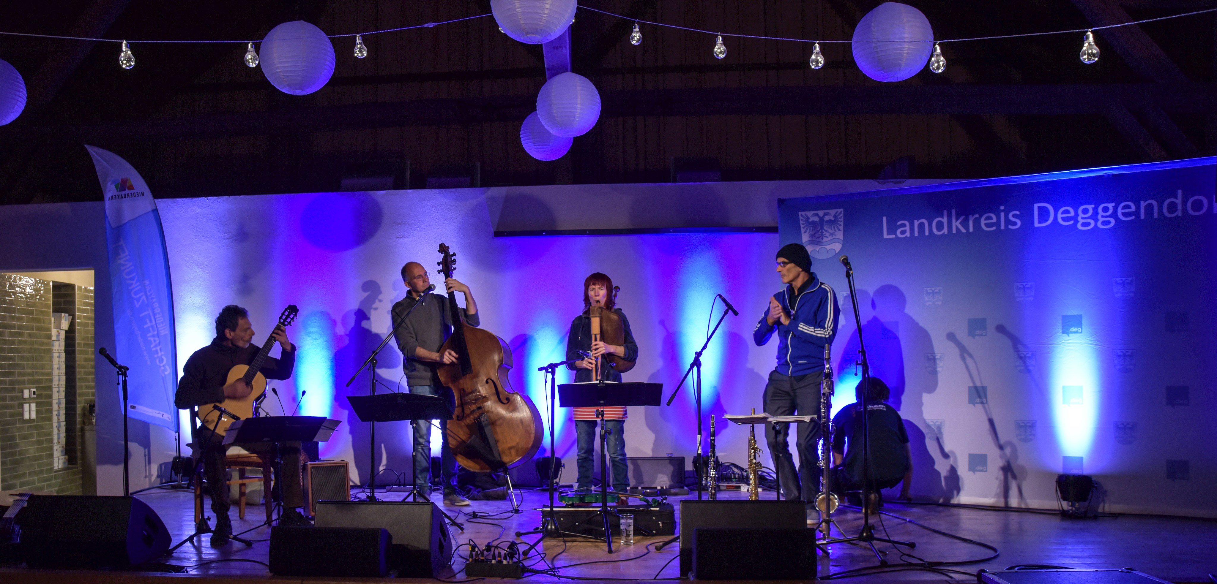 Zum Abschluss des Ehrenabends wartete auf die Gäste das absolute Highlight: die aus Hengersberg stammende Monika Drasch präsentierte mit ihrer Band (Norbert Nagel, Christian Gruber, Alex Haas) ihr aktuelles Programm „Auf der böhmischen Grenz“. Von den Eigenkompositionen von Heimatliedern mit sozialkritischen und gefühlsintensiven Inhalten, waren die Gäste fasziniert und überrascht zugleich. Die exzellenten Musiker begeisterten durch Virtuosität und musikantische Spielfreude – und schnell ist klar, dass sie nicht alle aus der Volksmusik kommen. Da vereinen sich Dreiklangseligkeit, klassische Kammermusik und Jazz. So entstanden überraschende und spannungsvolle Momente: Eine höchst musikalisch in Szene gesetzte Grenzbegehung. Und Monika Drasch gab mit ihrer Bühnenpräsenz den Ton an. Im Austausch mit den Moderatoren wurde schnell klar, dass man sich kennt: so wurde neben den musikalischen Gesprächen auch über gemeinsame Schulzeiten gesprochen- mit allerhand Anekdoten.