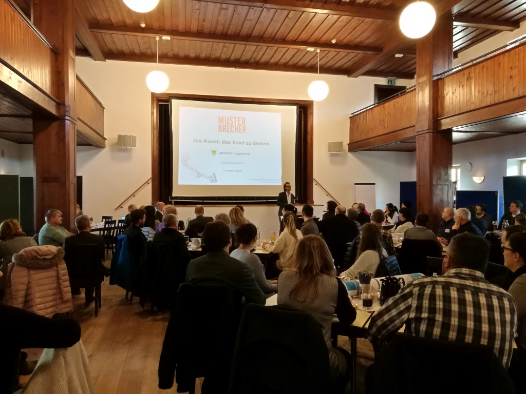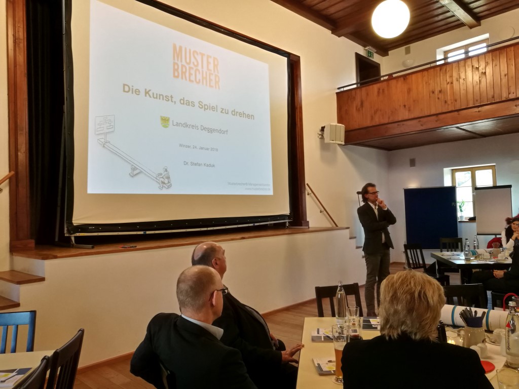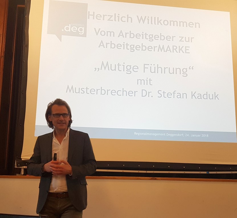 Im Rahmen der Vortragsreihe „Vom Arbeitgeber zur ArbeitgeberMARKE“ des Regionalmanagements Deggendorf kam „Musterbrecher“ Dr. Stefan Kaduk aus München mit dem Thema „Mutige Führung“ nach Winzer. Im „Gasthof zur Post“ lieferte der Managementberater jede Menge Denkanstöße und animierte die Zuhörer dazu, vermeintlich bewährte Muster auch mal zu brechen. Kaduk ist bei großen DAX-Firmen aber auch in etlichen KMUs tätig. So demonstrierte er gekonnt an unterschiedlichen Praxisbeispielen, wie Muster brechen aussehen kann- branchenunabhängig und für Firmen aller Größen.