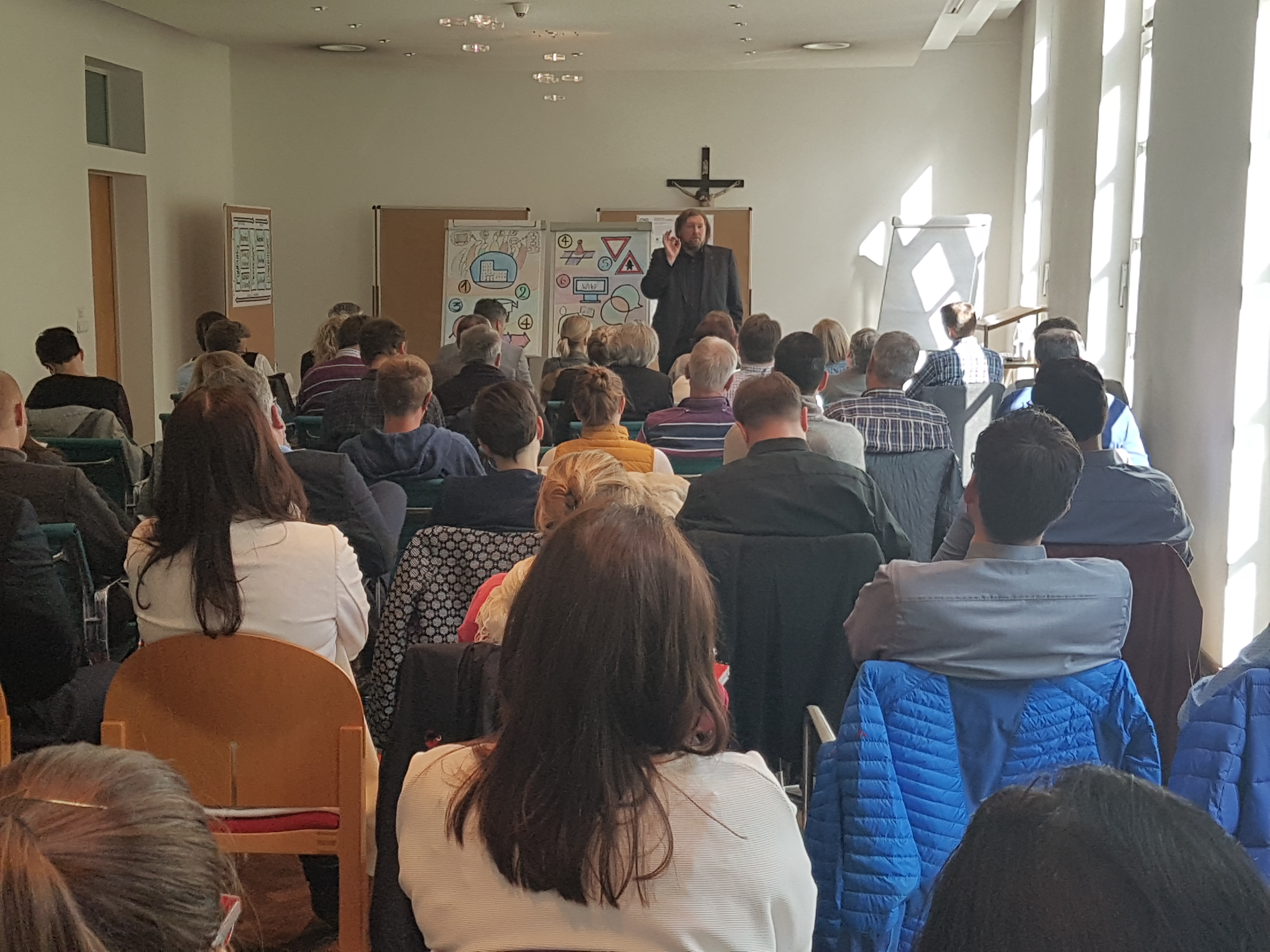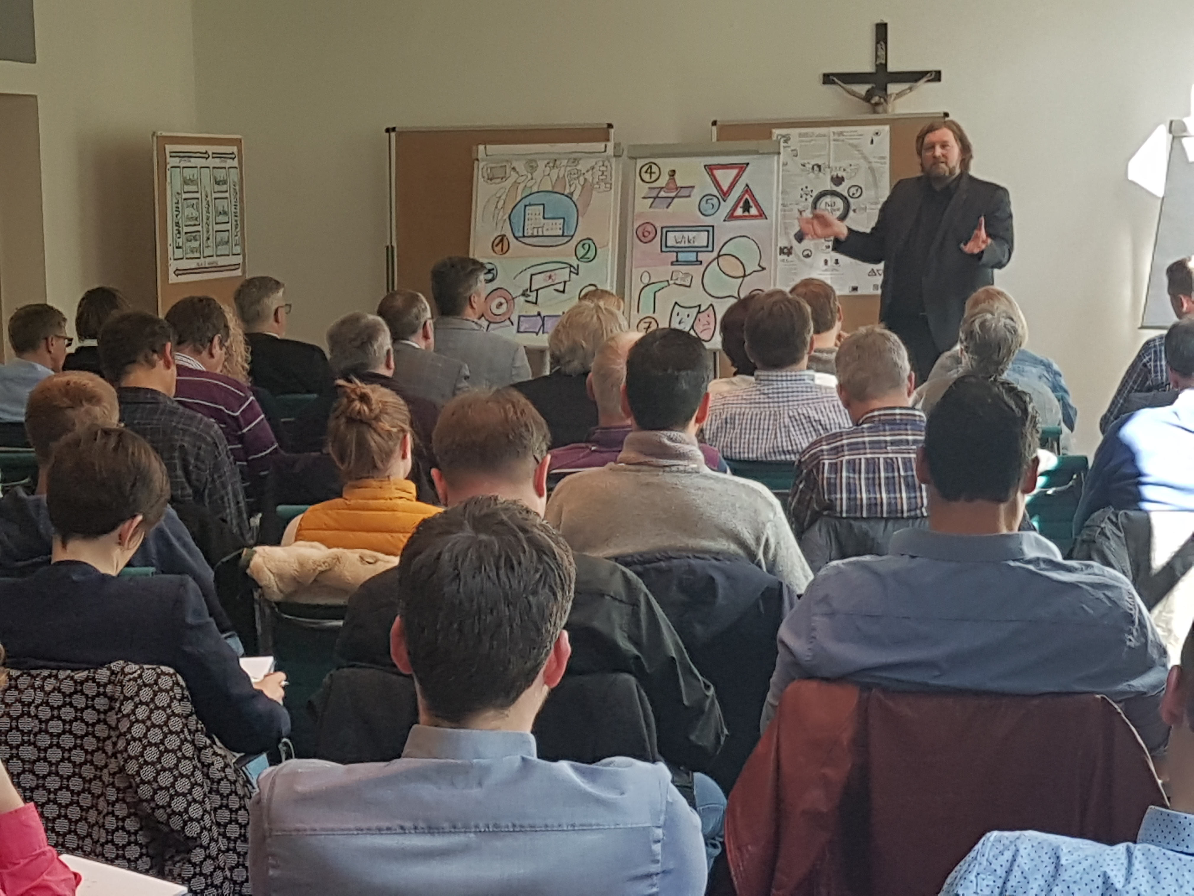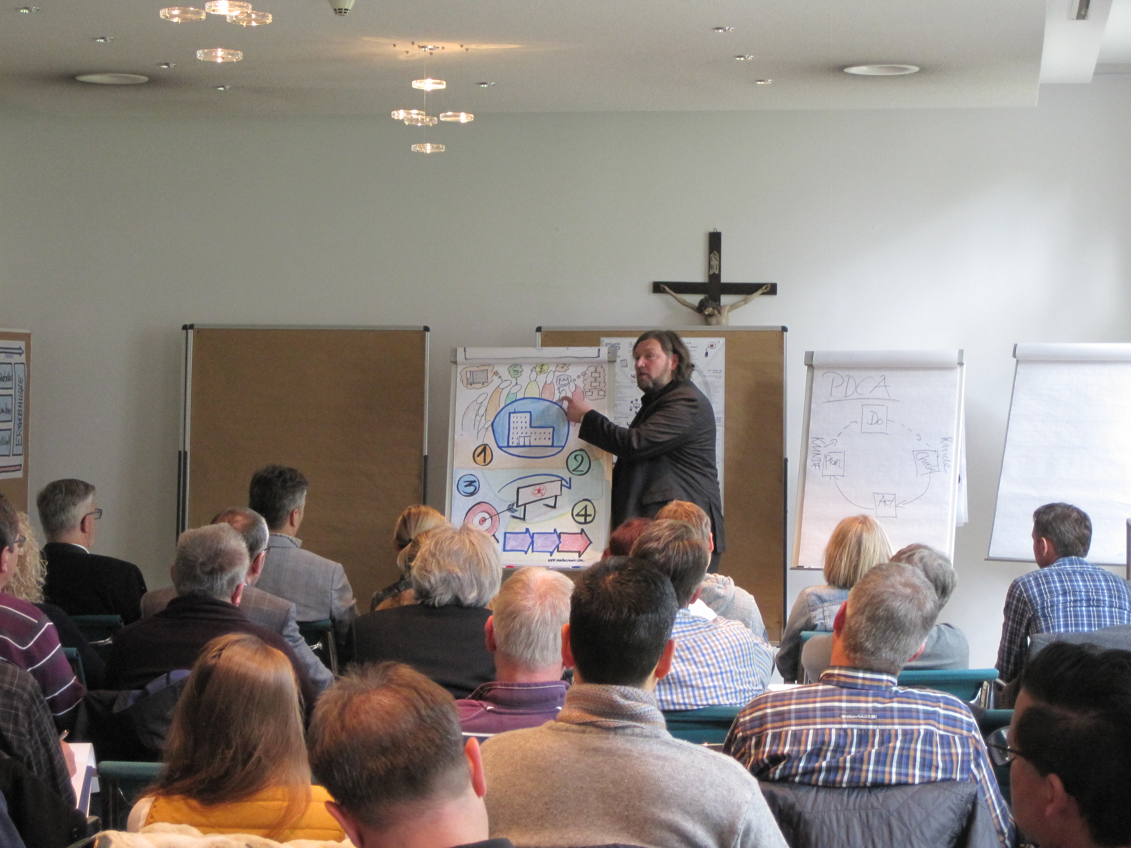 Sehr schnell stellte sich heraus, dass Dr. Markus Reimer beim Qualitätsmanagement ein absoluter Experte ist. Mit viel Wissen, anschaulichen Beispielen und jeder Menge Humor erläuterte er die wichtigsten Aspekte eines funktionierenden Qualitätsmanagements und brachte seine Erfahrungen aus seiner Tätigkeit als Auditor ein. Entlang den Anforderungen der ISO-Zertifizierung 2015 ging er auf alle Faktoren ein: von der Ausrichtung und den Zielen des Unternehmens über das Umfeld, die Risiken bis zur erforderlichen Erfolgskontrolle und der Prozessanalyse. Gespickt mit Anekdoten aus bisherigen Zertifizierungen stellte Reimer die einzelnen Bestandteile und deren Wichtigkeit sehr anschaulich dar. Zum Schluss kam er dann zum entscheidenden Faktor: dem Chef! „Steht dieser nicht hinter dem System des Qualitätsmanagements, kann´s auch nicht funktionieren“, stellte Reimer fest. „Egal, wen er als Vertreter einsetzt: interessiert´s den Chef persönlich nicht, macht es keinen Sinn.“