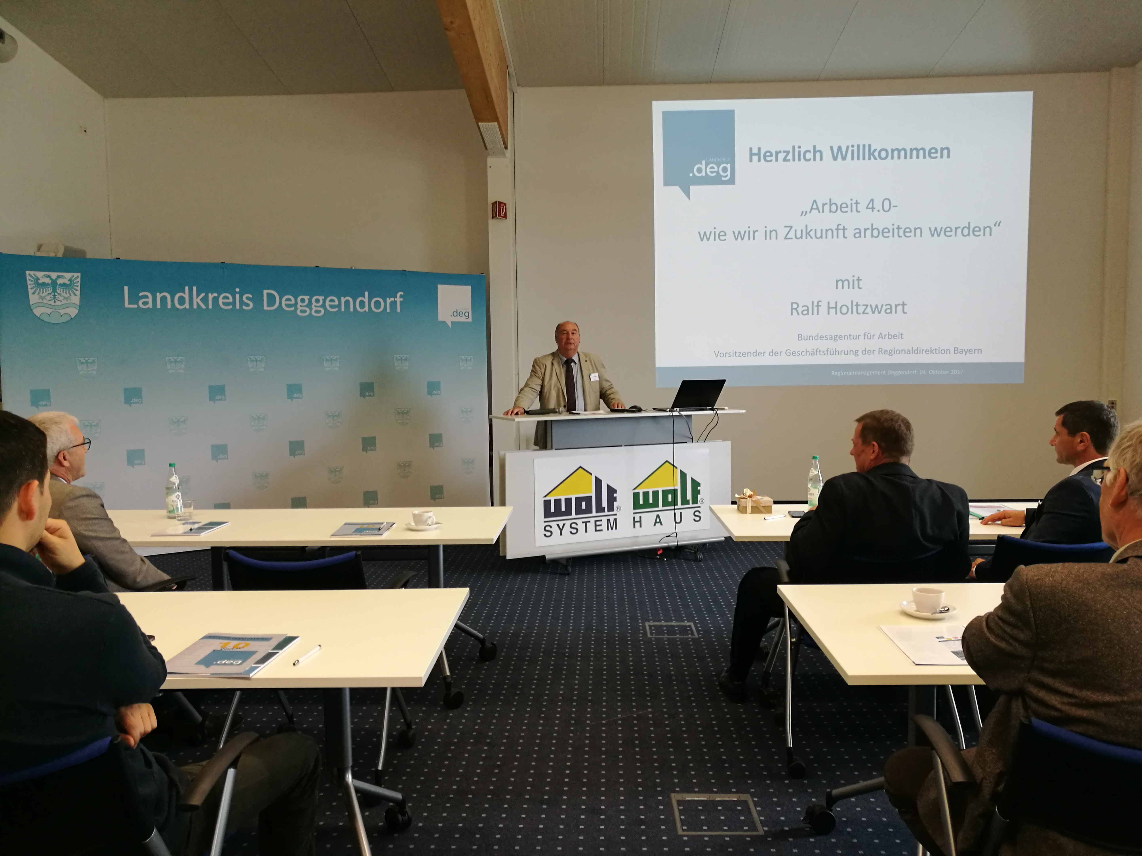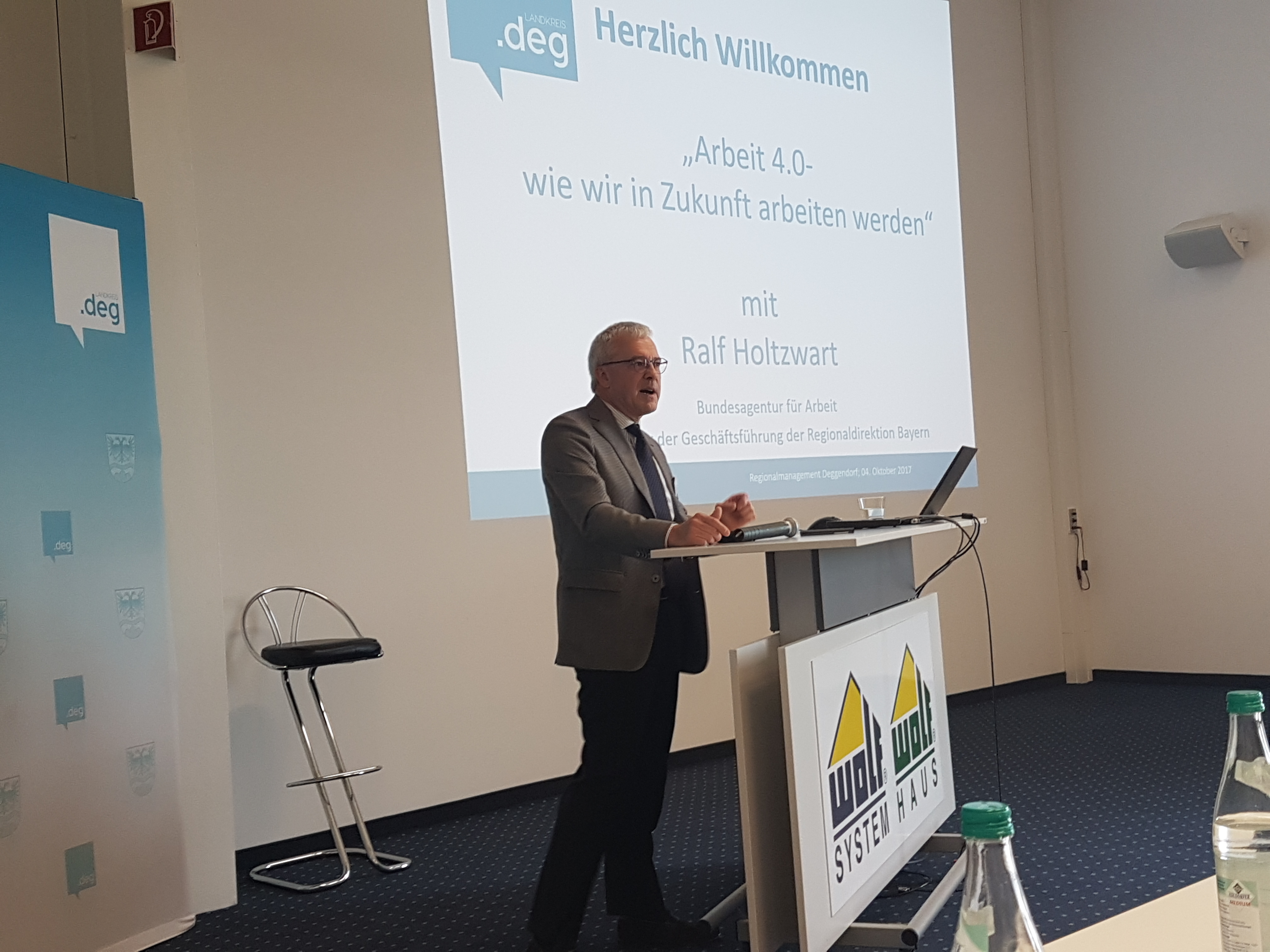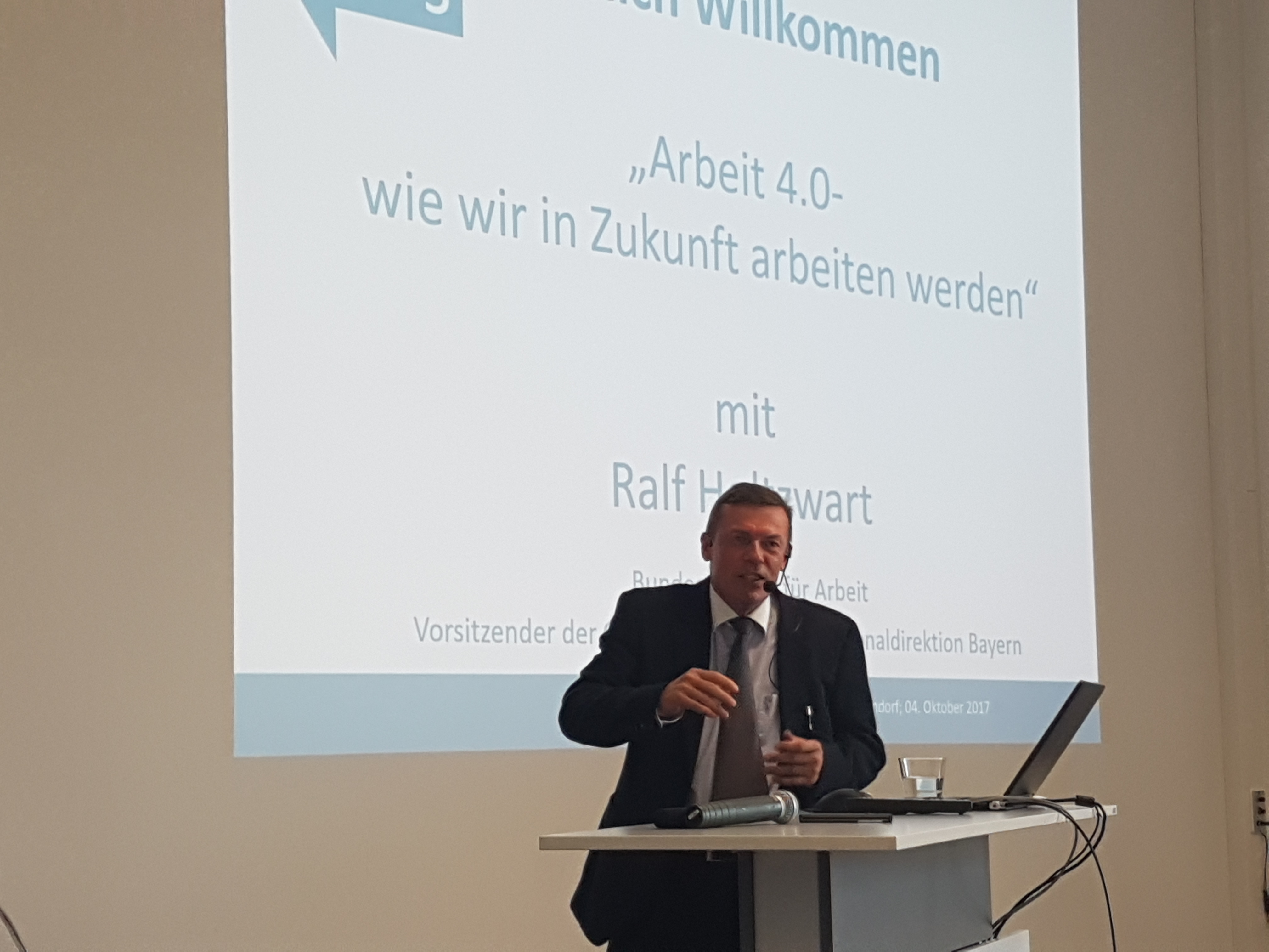Zum Auftakt der 2. Staffel der Vortragsreihe "Vom Arbeitgeber zur ArbeitgeberMARKE" konnte das Regionalmanagement keinen Geringeren verpflichten als Ralf Holtzwart, den Vorsitzenden der Geschäftsführung der Agentur für Arbeit Bayern. In seinem kurzweiligen und praxisnahen Vortrag lieferte er viele Fakten und Ansichten über die zukünftige Art der Arbeit. Zugleich gab er den Unternehmern einige Tipps und Anregungen mit auf dem Weg, um auch in Zukunft erfolgreich wirtschaften zu können. Einen Schwerpunkt legte Holtzwart dabei auf die Veränderungen durch die Digitalisierung- er verwies sowohl auf die Herausforderungen als aber auch auf die vielen Vorteile und Chancen. Diese müssen die Unternehmer wahrnehmen! "Jeder Unternehmer muss sich fragen: wie kann ich mein Produkt durch die Digitalisierung besser machen? Die größten Fehler werden gemacht, wenn es einer Wirtschaft gut geht. Uns geht´s schon sehr lange sehr gut. Deshalb müssen wir sehr gut aufpassen, nicht genau jetzt entscheidende Fehler zu machen", so Holtzwart zusammenfassend. Neben den Produkten ging Holtzwart auch auf den Arbeitsmarkt ein. So lasse sich kein Beruf durch die Digitalisierung komplett ersetzen. Aber viele Berufe werden sich in Zukunft sehr stark verändern. Als Schlüssel sah er hier die hochwertige Ausbildung: "Statistiken zeigen, dass je höher der Ausbildungsgrad sich die Berufe nicht so einfach ersetzen lassen. Deshalb müssen wir schauen, dass wir in Sachen Ausbildung und Weiterqualifikation möglichst viele Leute erreichen. Da müssen auch die Unternehmer aktiver werden", nennt Holtzwart den zukünftigen Weg.